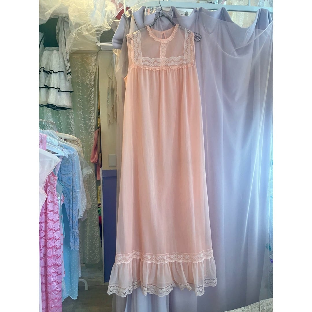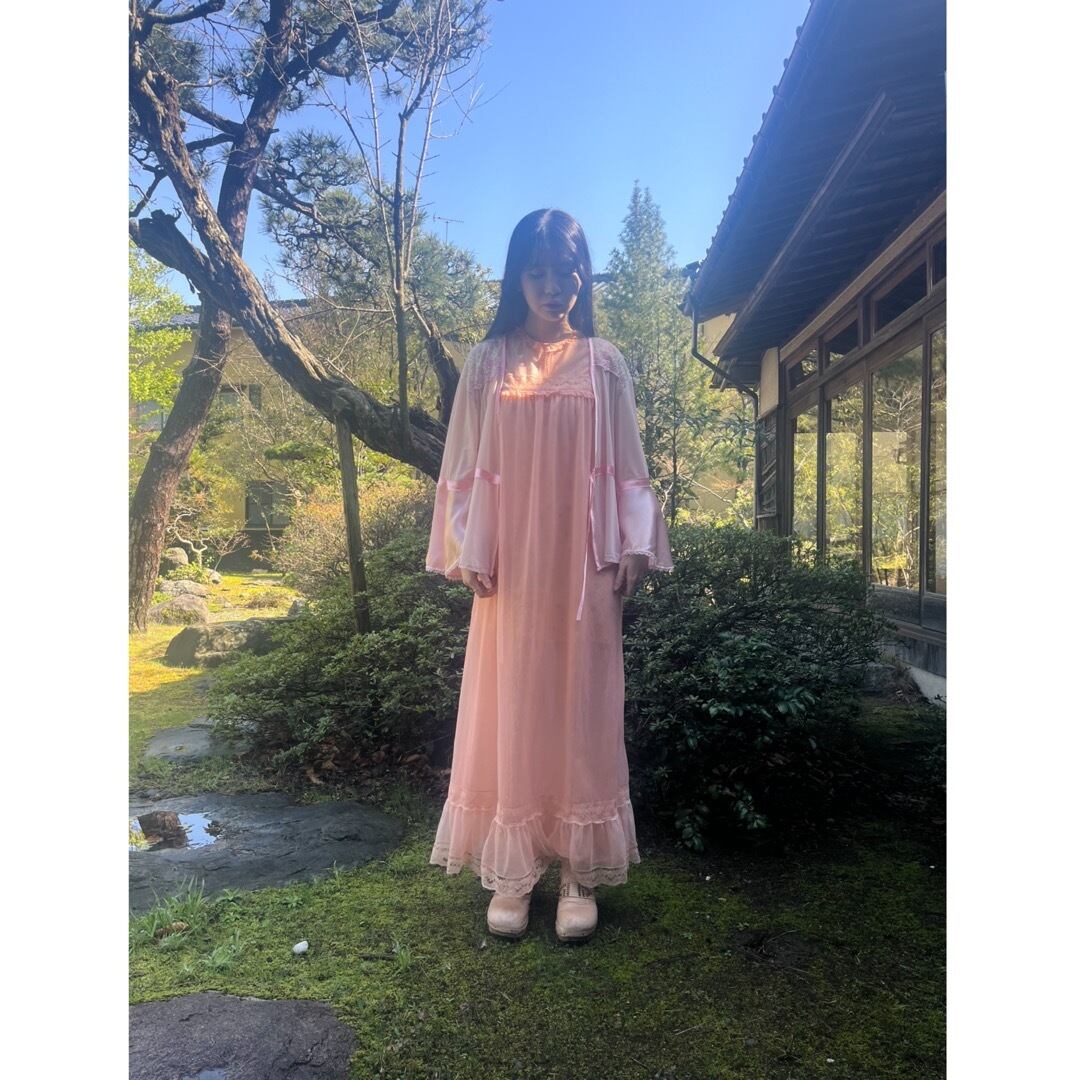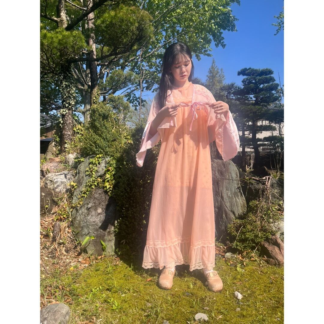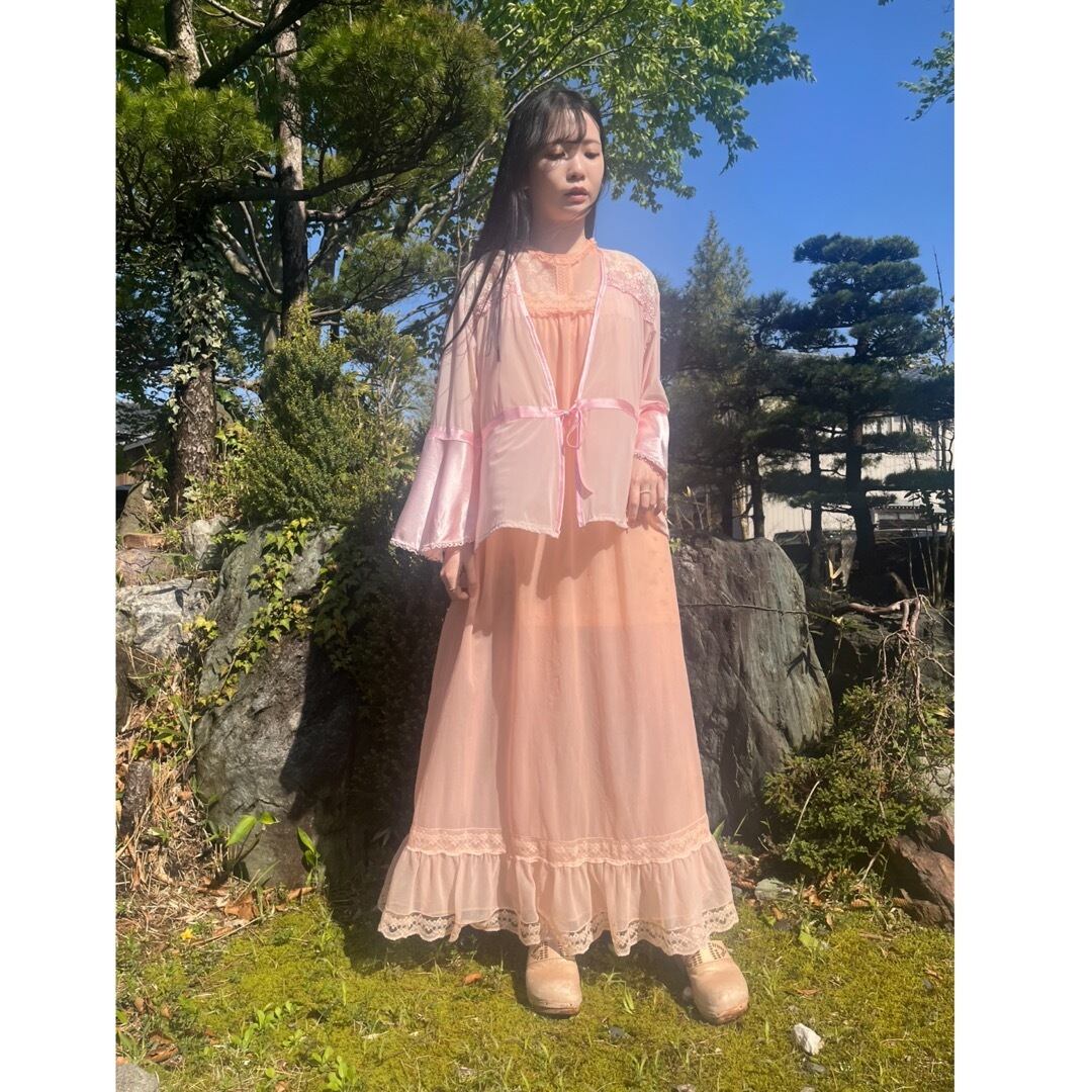 絶妙なピーチカラーのマキシ丈ランジェリードレス。同じ色のペチコートがついていて2枚仕立てになっています。