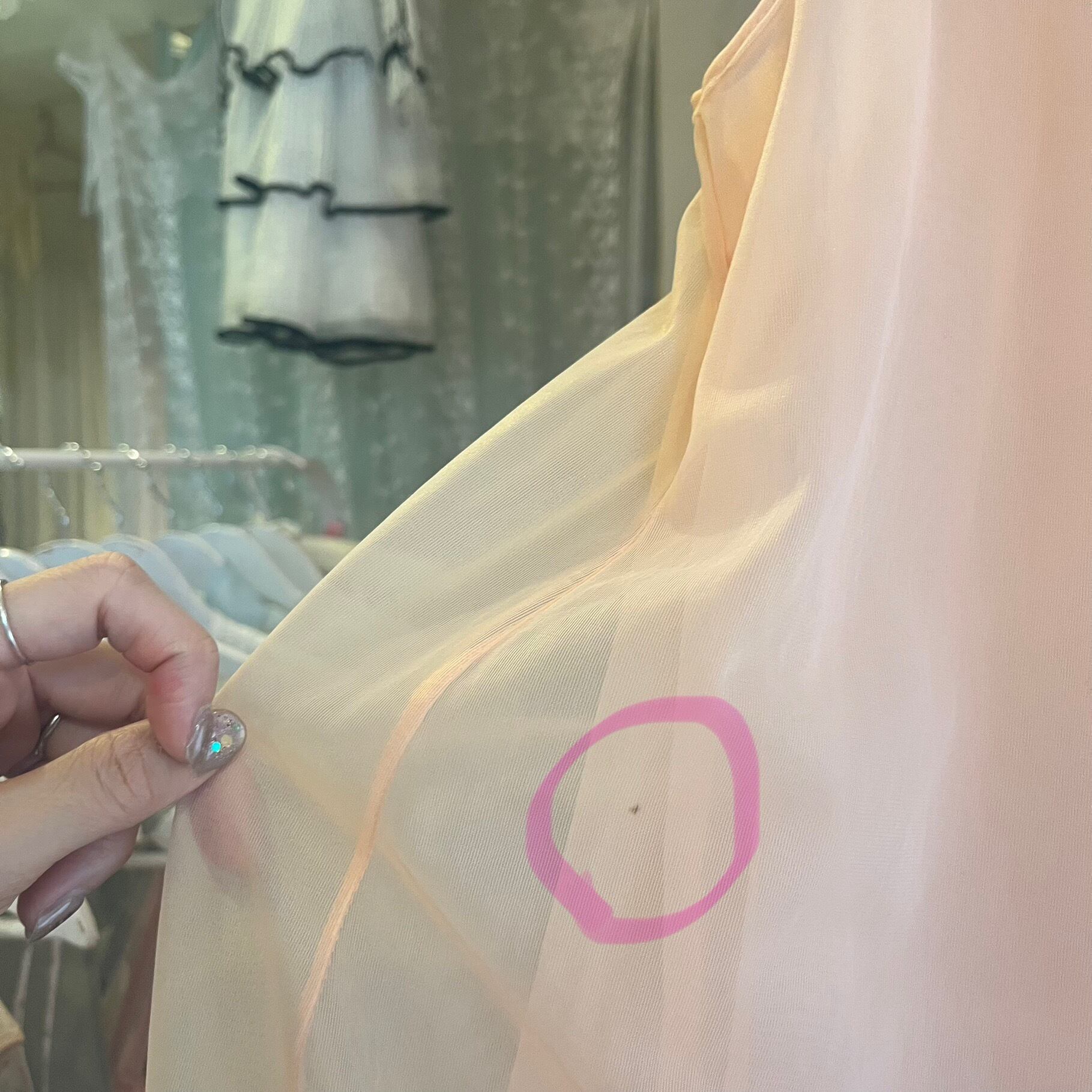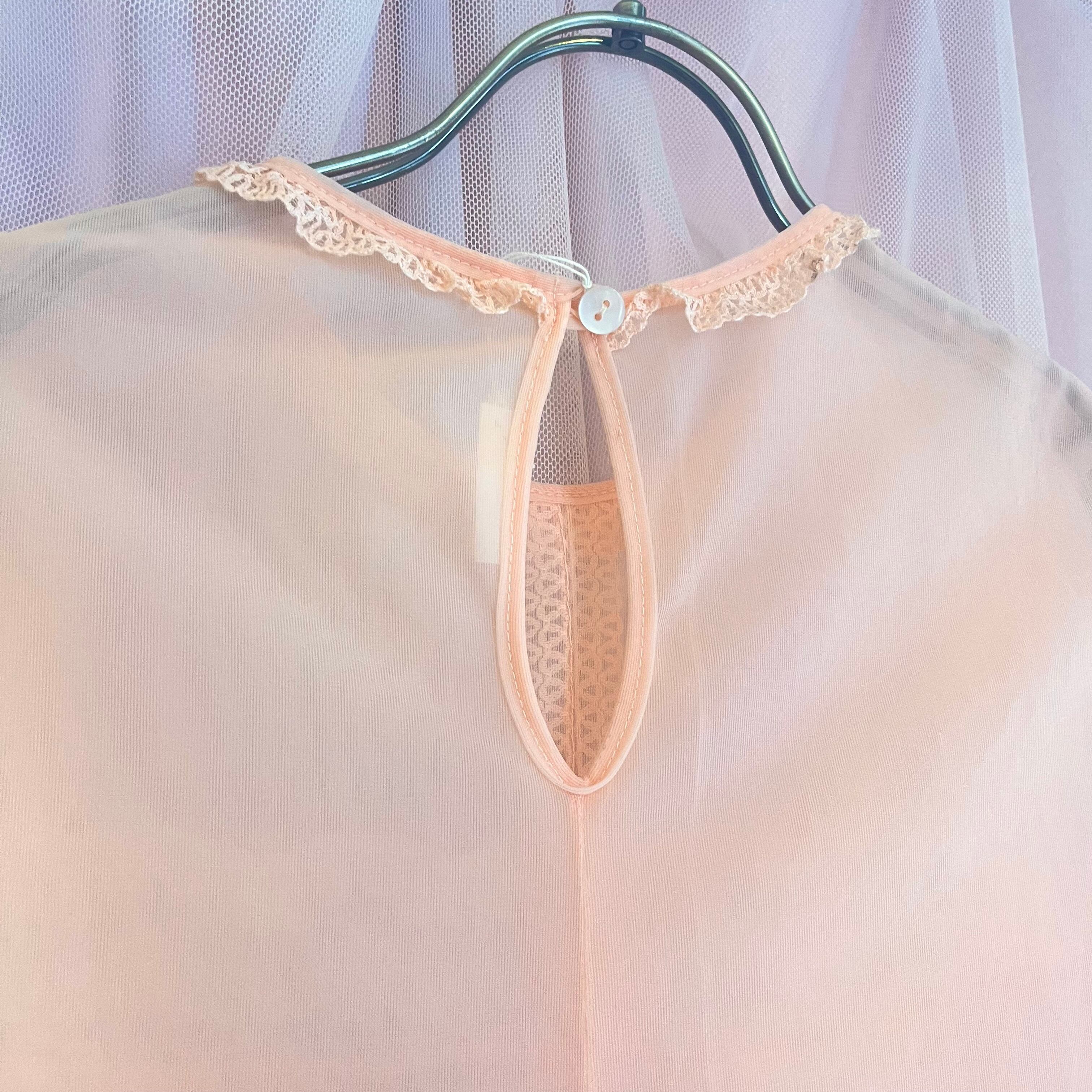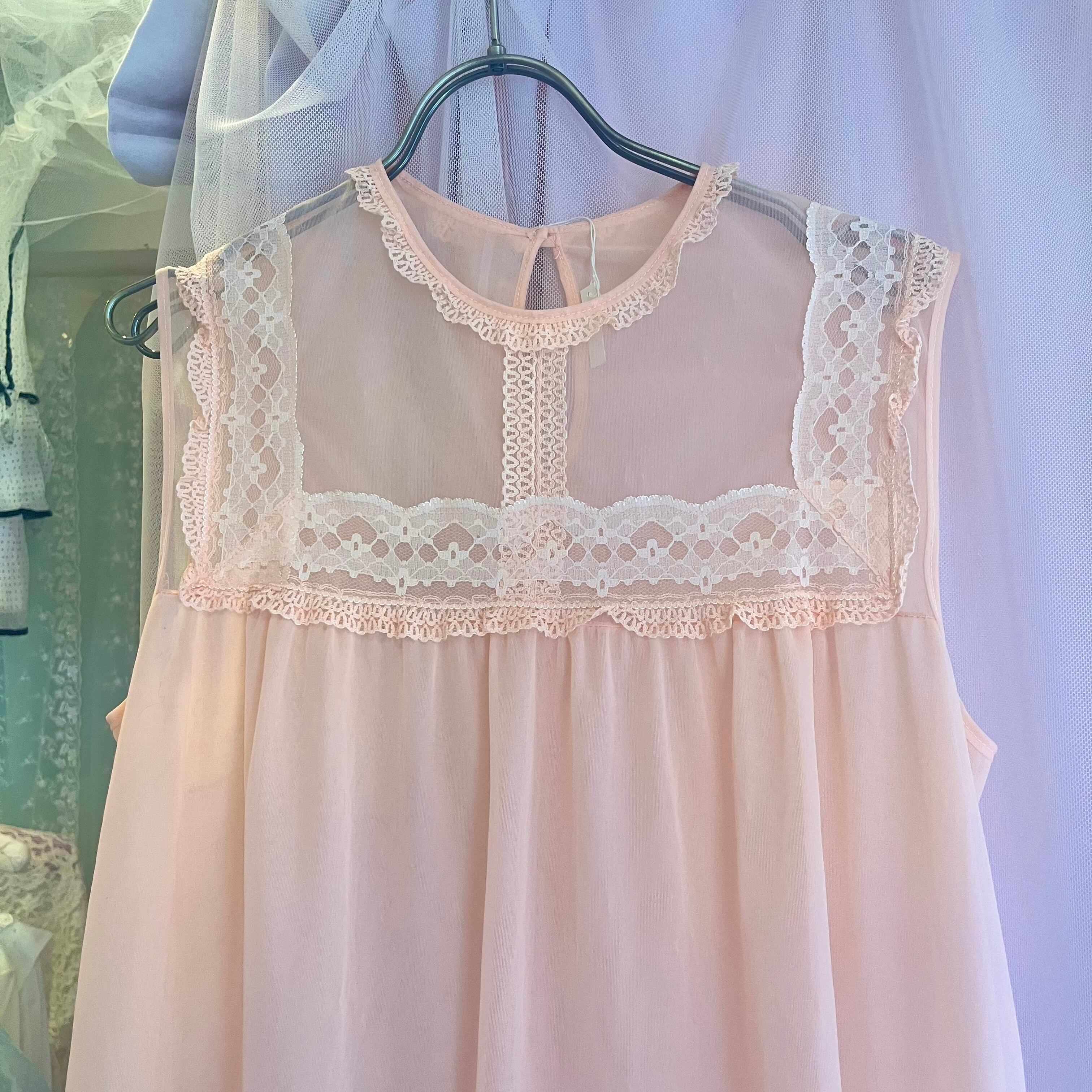 絶妙なピーチカラーのマキシ丈ランジェリードレス。同じ色のペチコートがついていて2枚仕立てになっています。