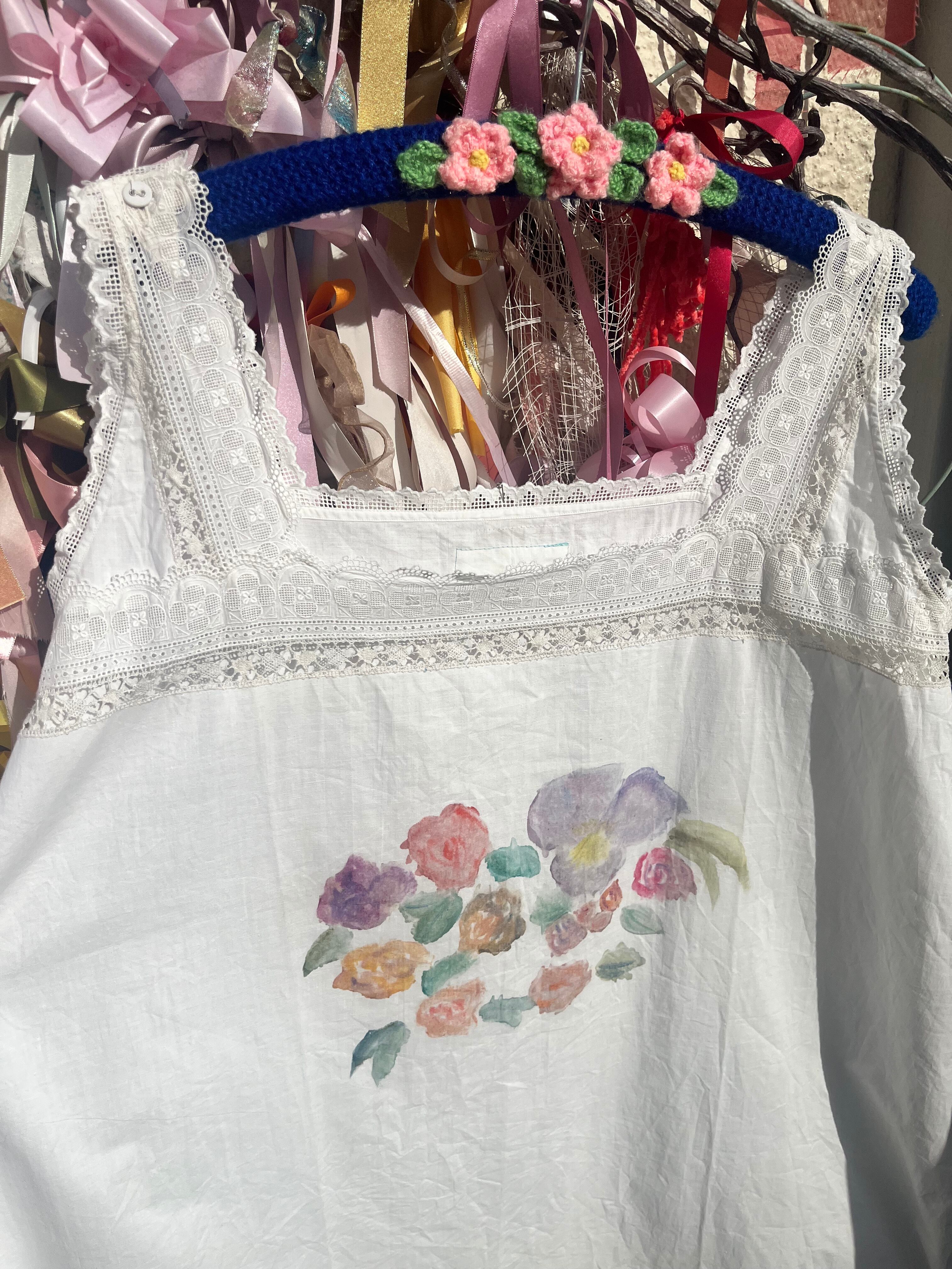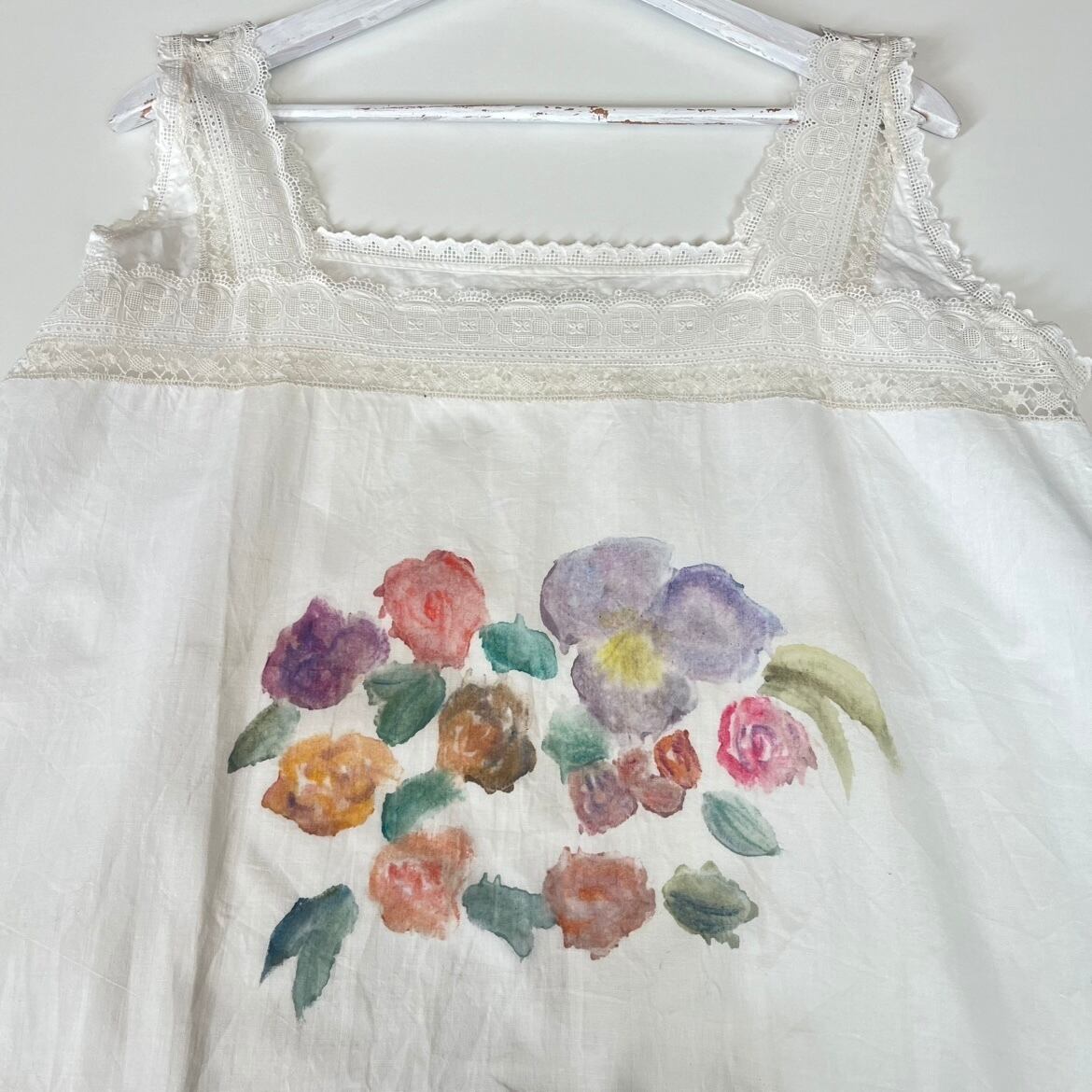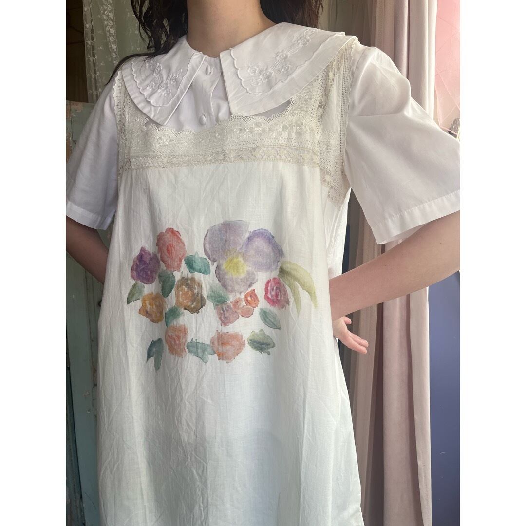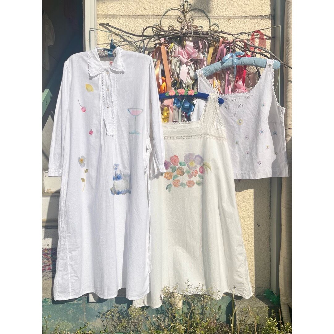 EGASIRA HANAKO さんにヴィンテージのコットンブラウスやワンピースにハンドペイントで自由に絵を描いていただいたお品です