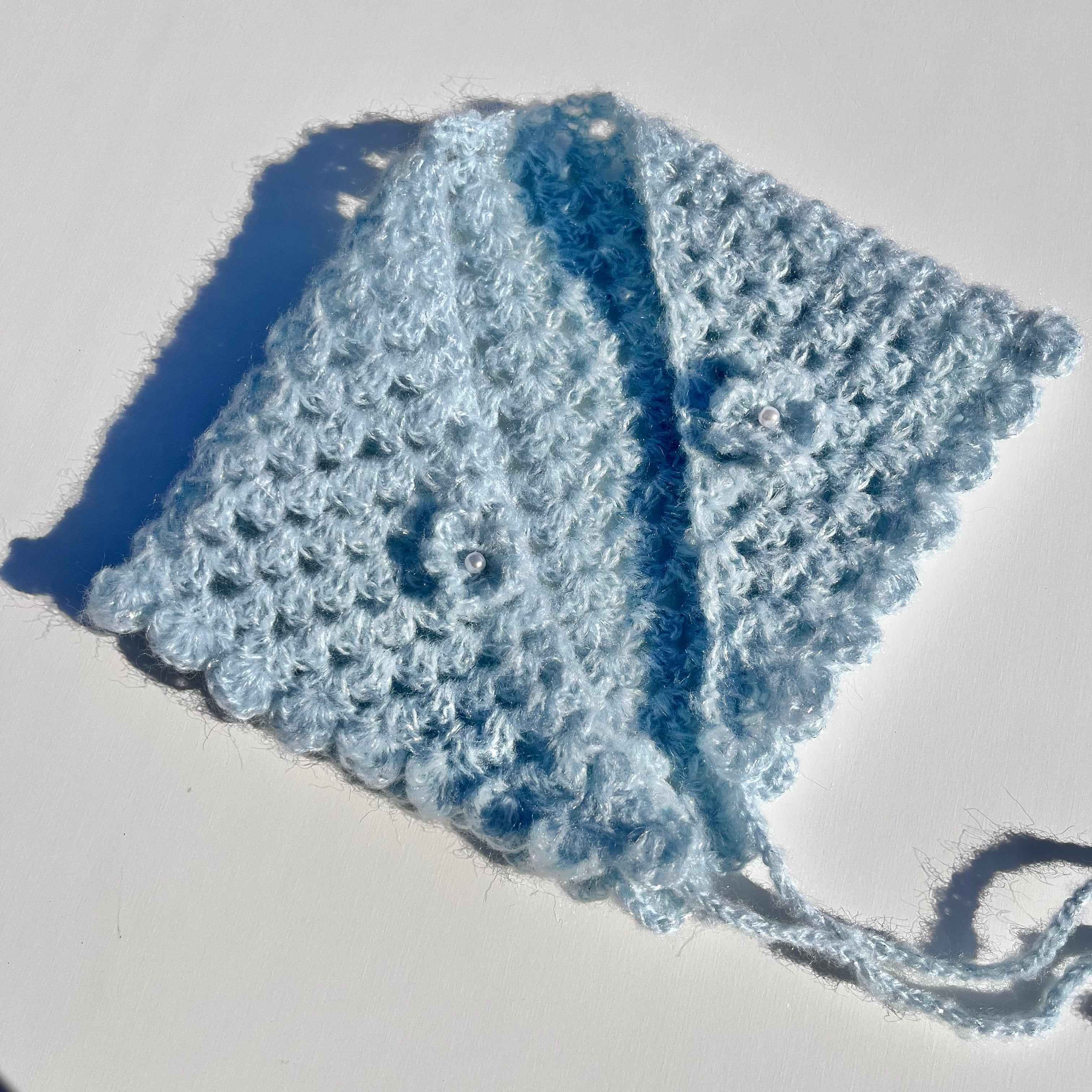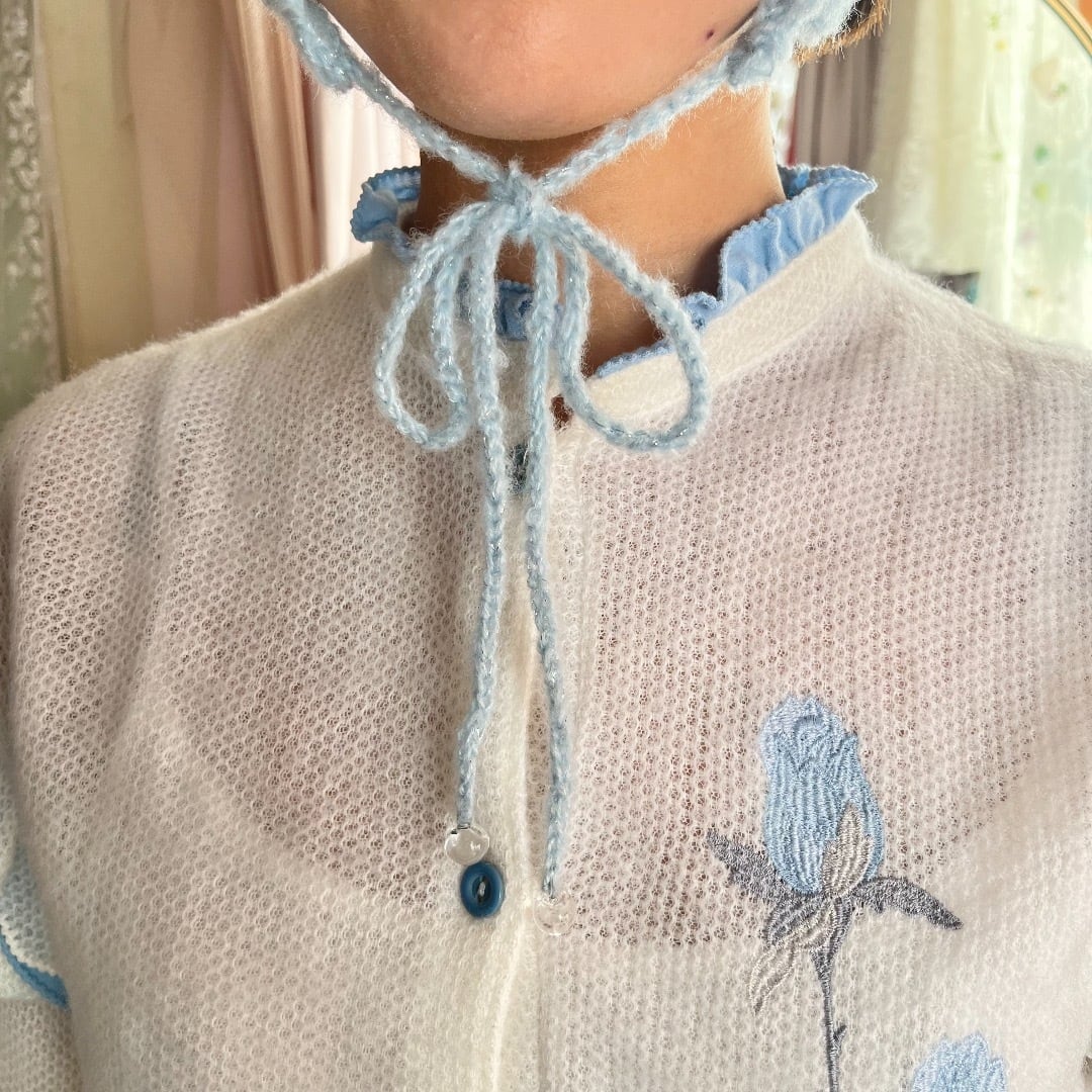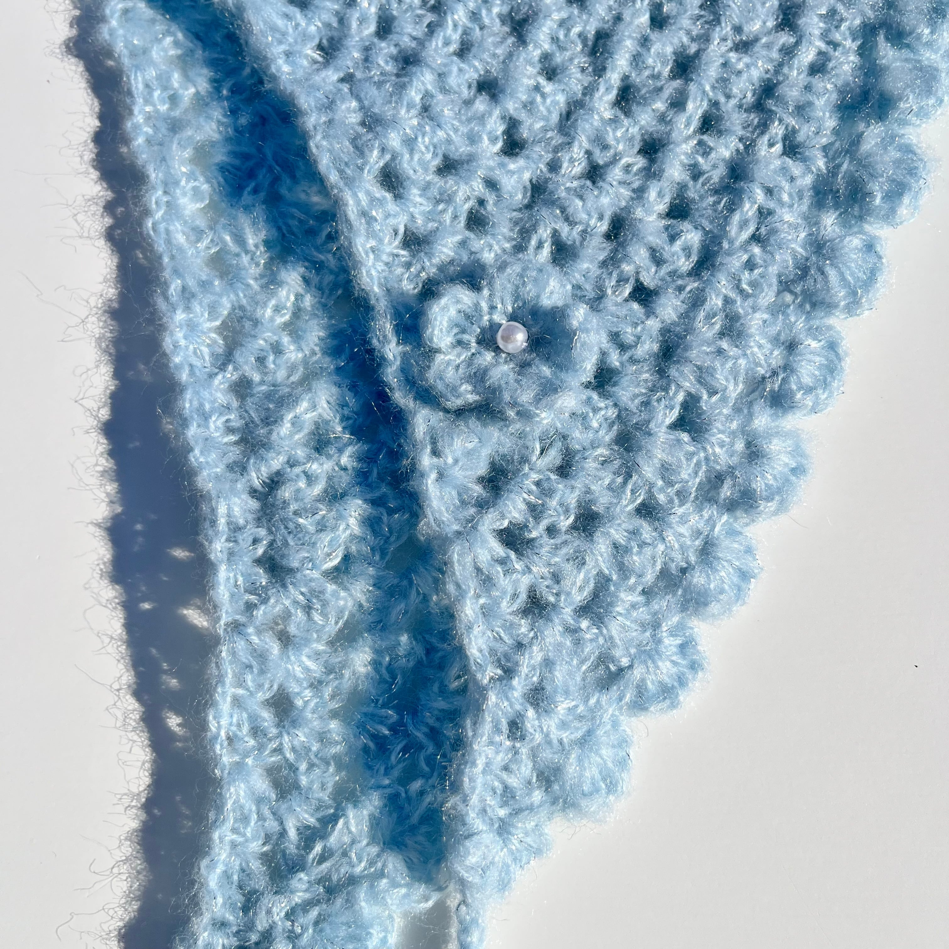 こちらは水色の毛糸にシルバーラメの細い糸を混ぜて編みました。