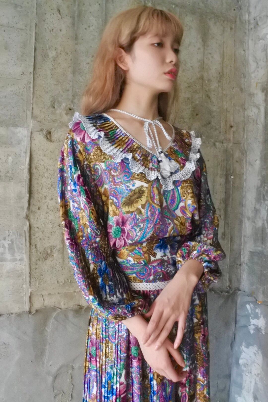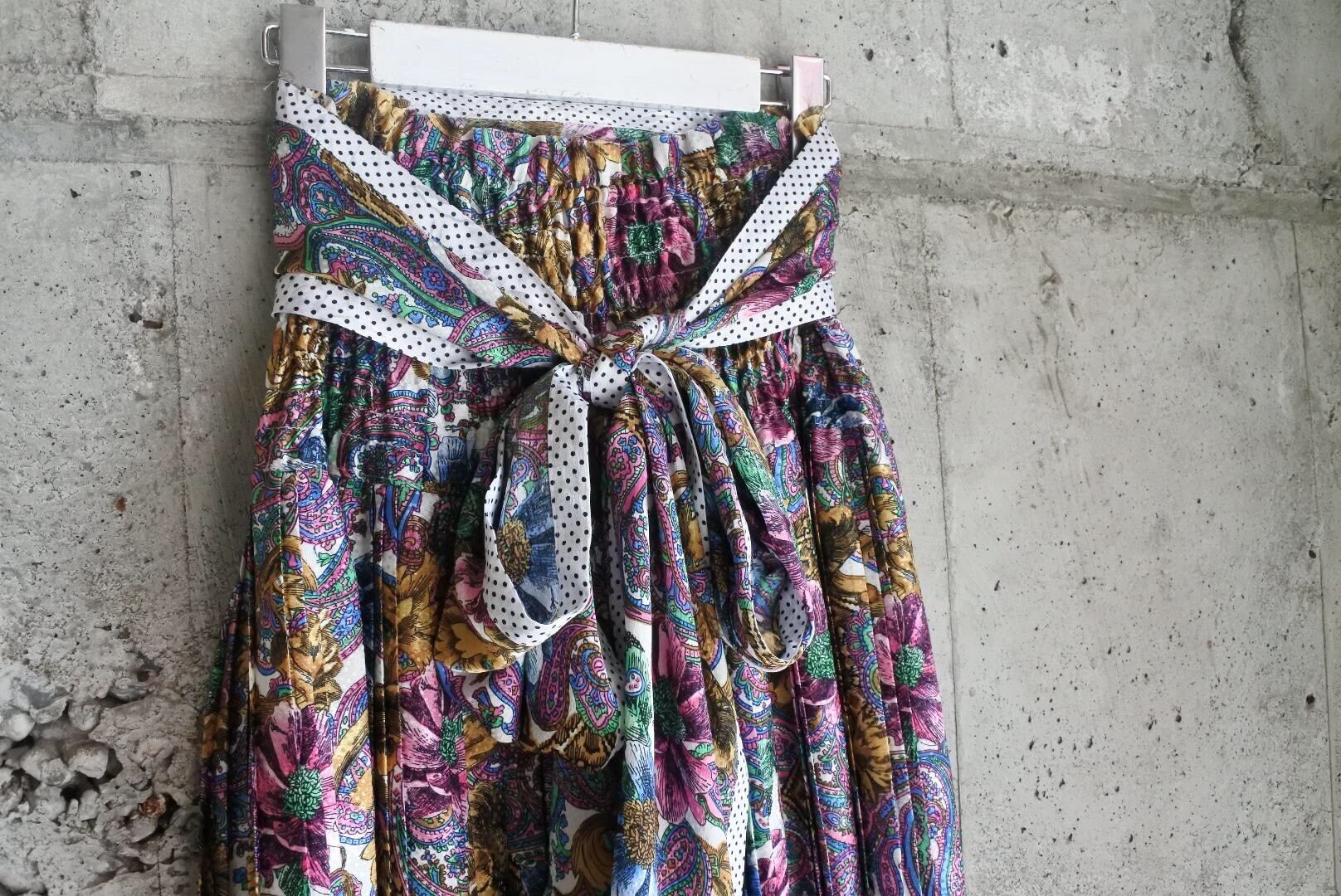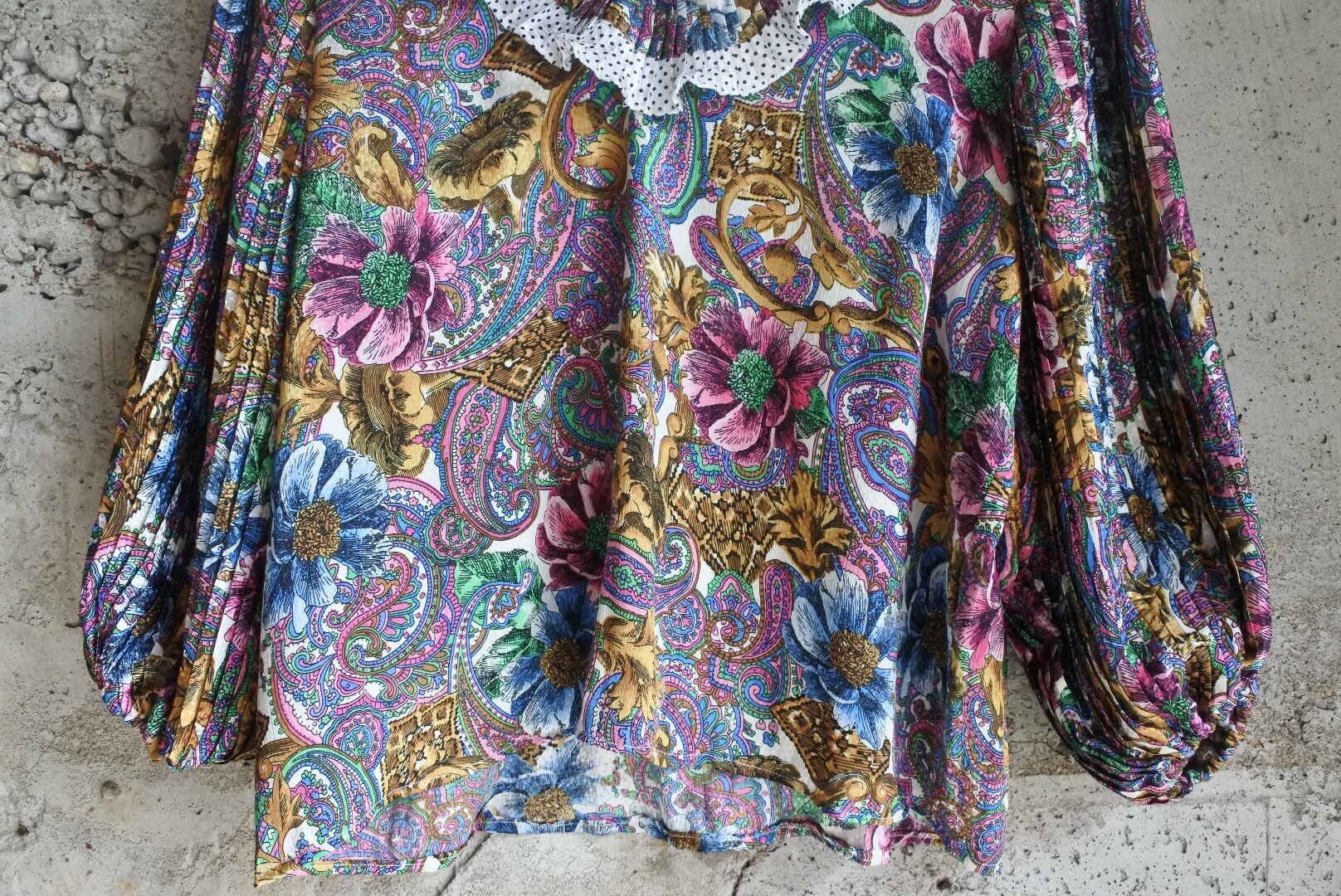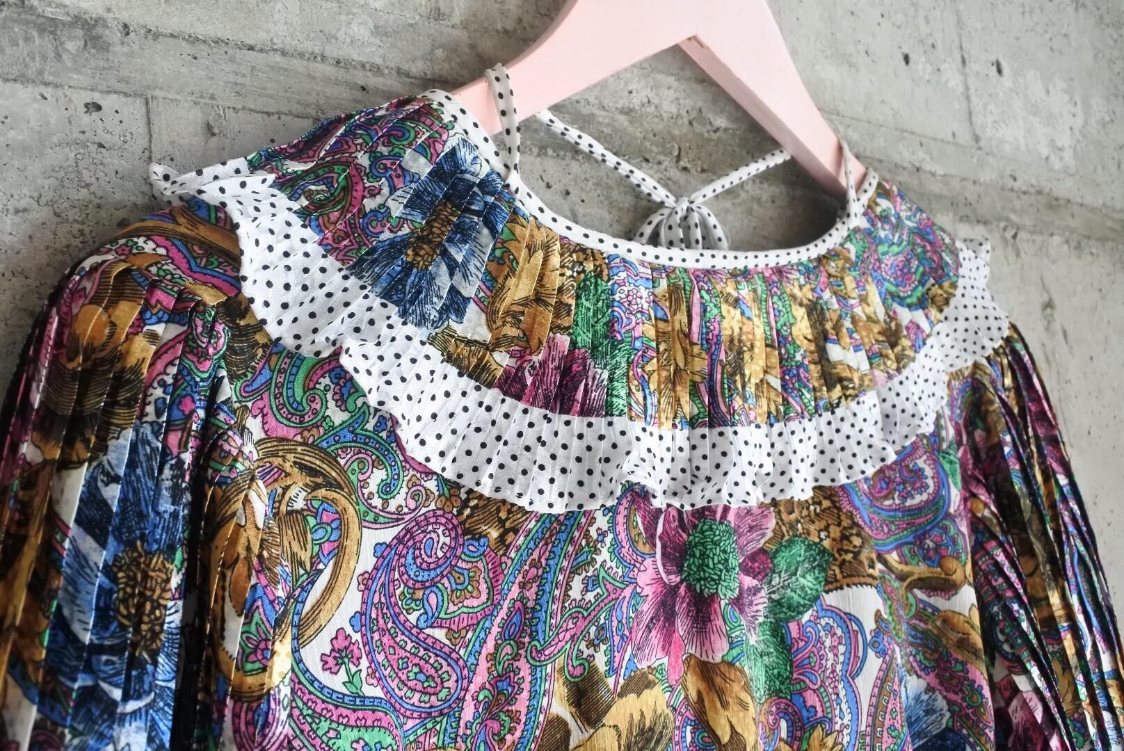 花柄やペイズリー柄に白いピンドットの組み合わせが効いていてセンスが感じられる一着。総柄ですがまとまりがあり、うっとりする美しさ。