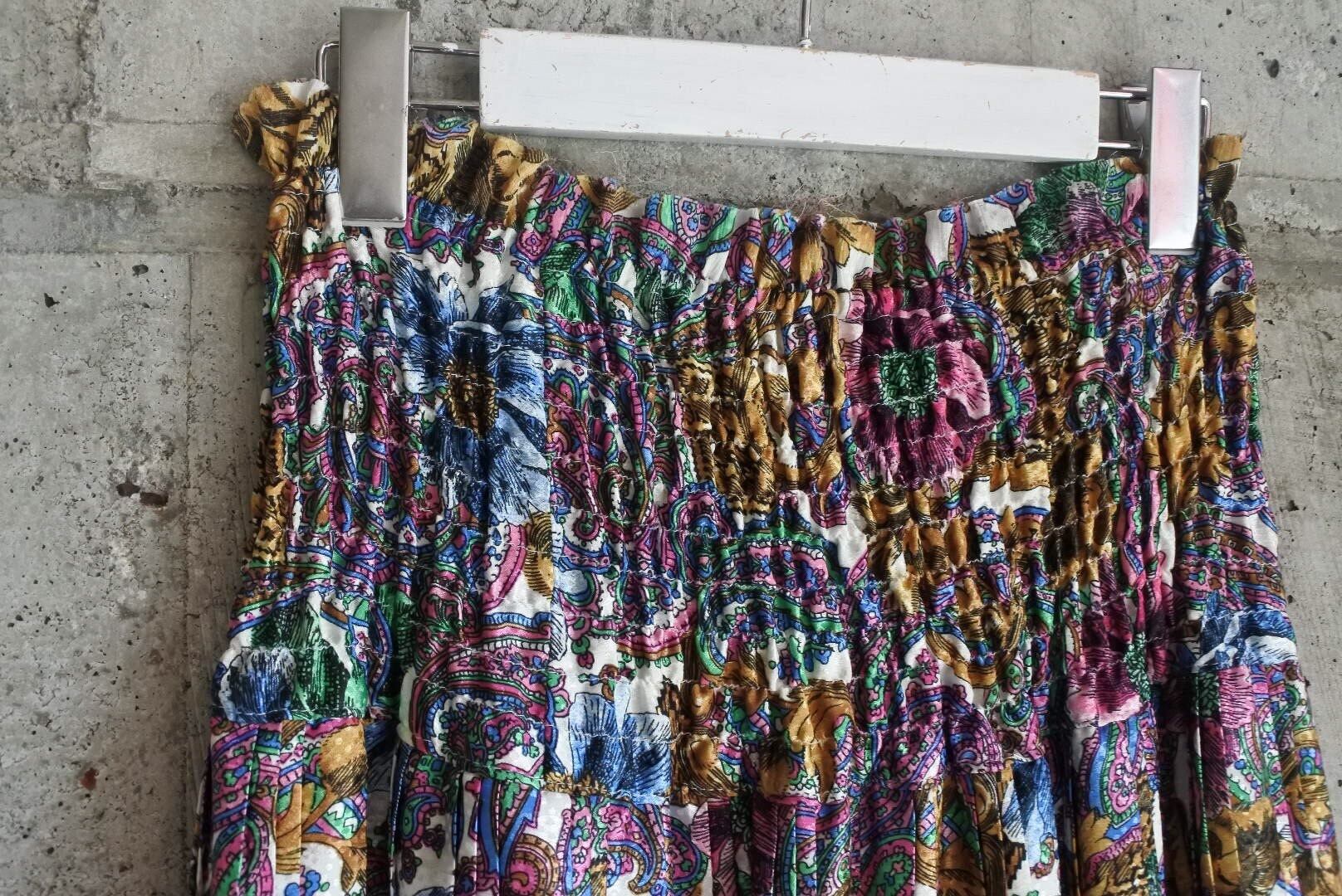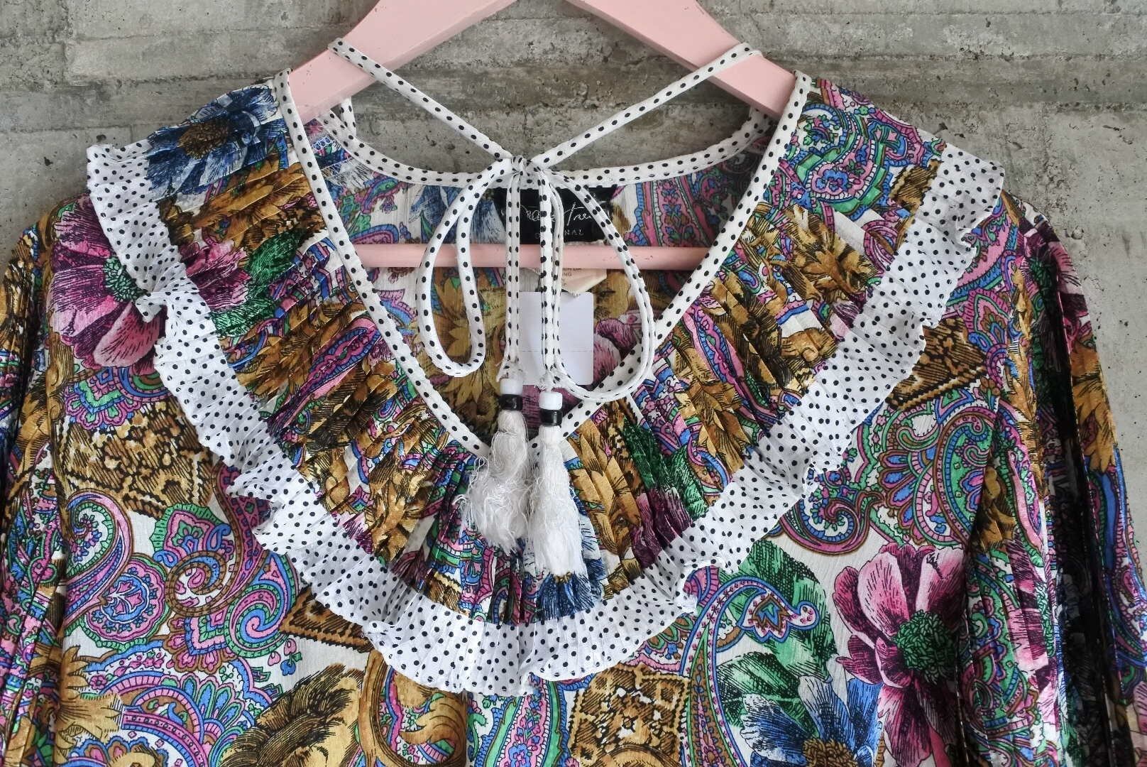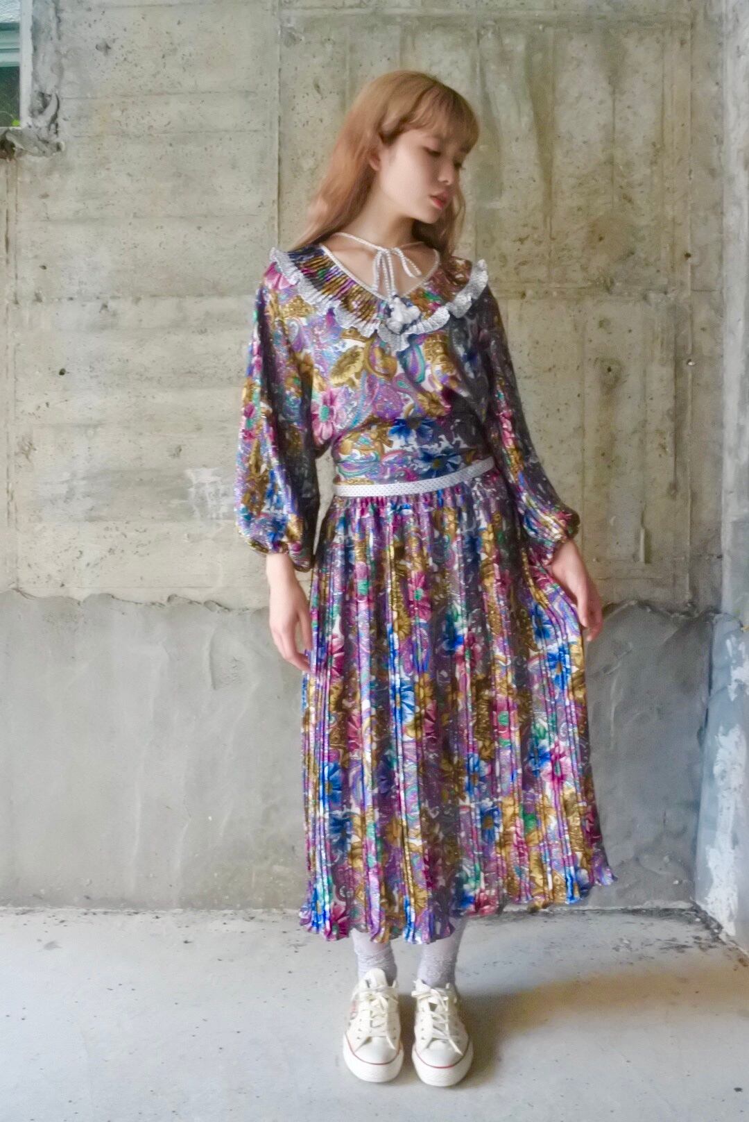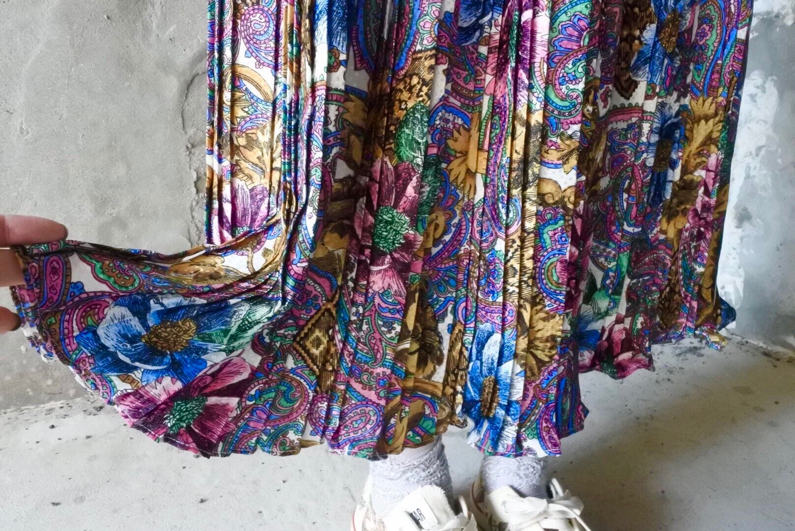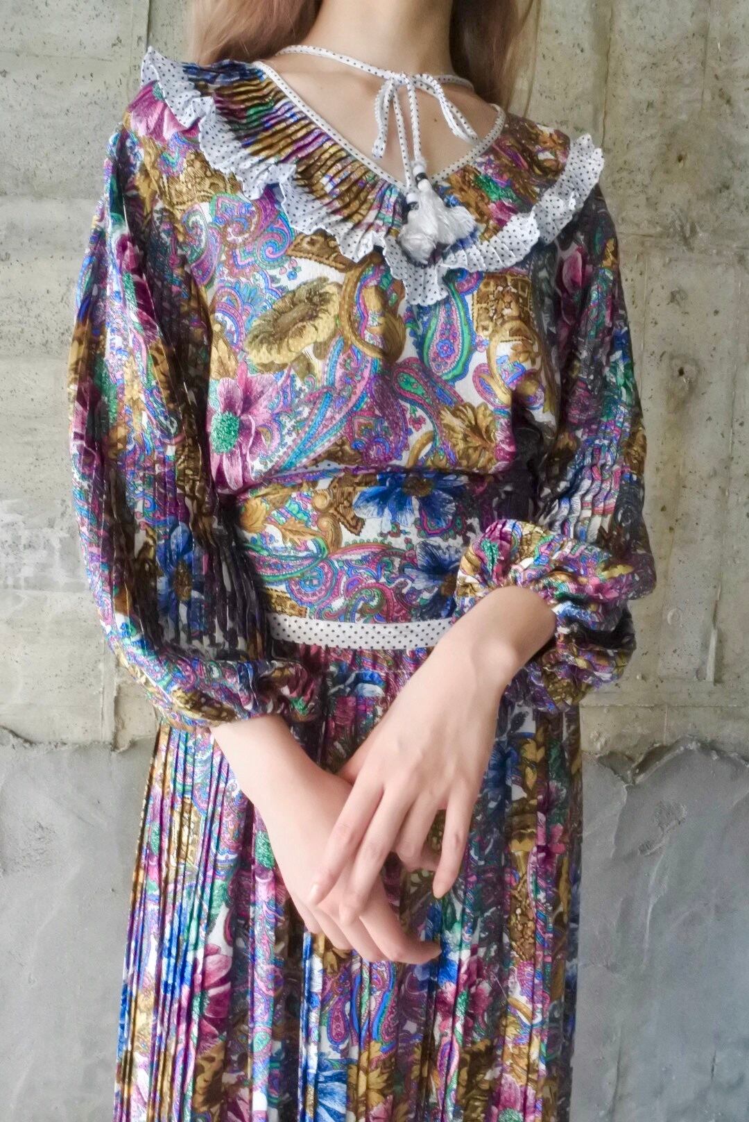 花柄やペイズリー柄に白いピンドットの組み合わせが効いていてセンスが感じられる一着。総柄ですがまとまりがあり、うっとりする美しさ。
