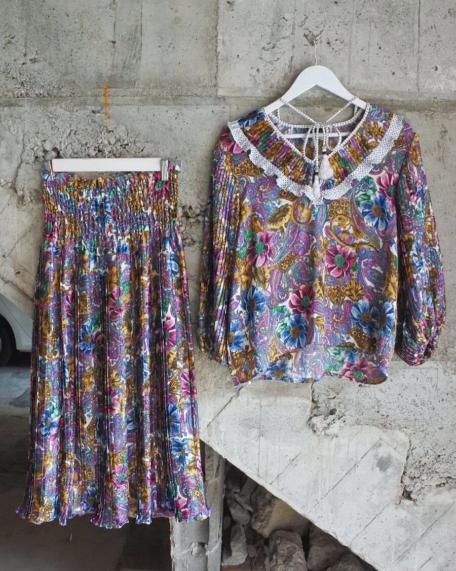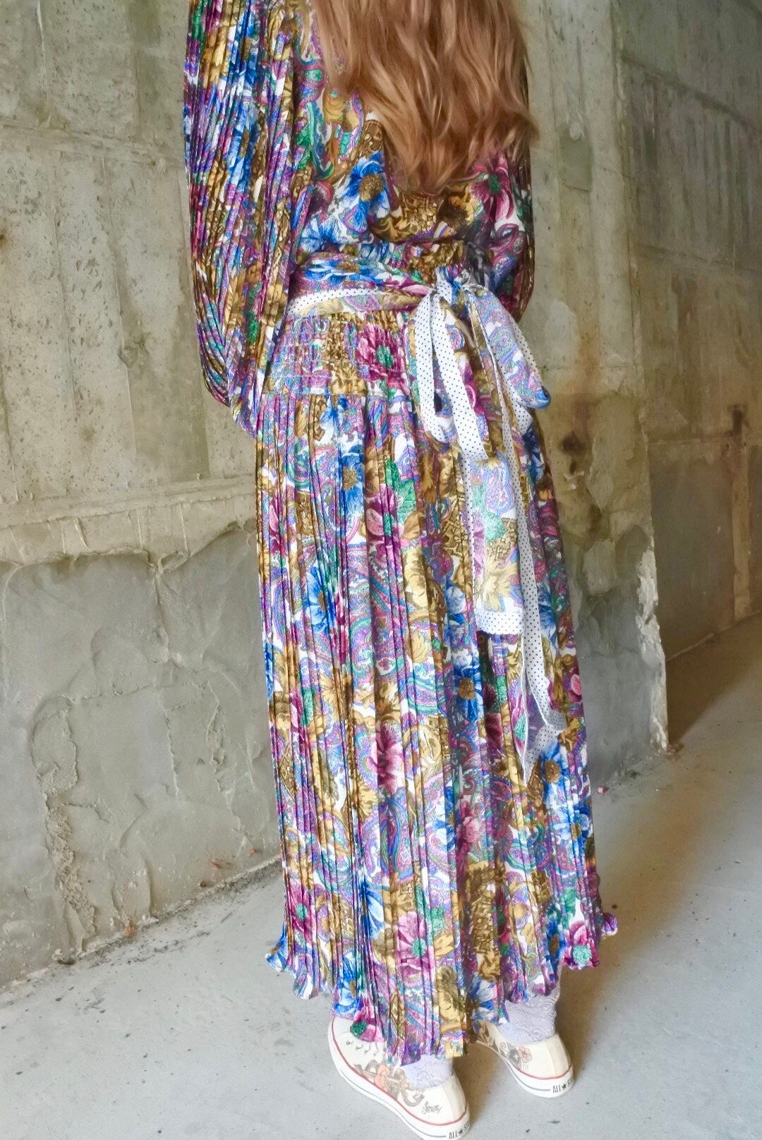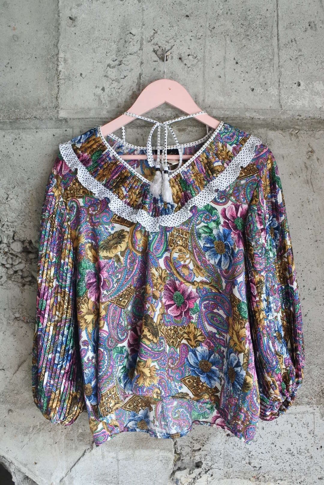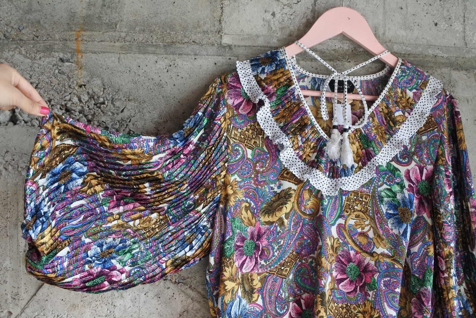 花柄やペイズリー柄に白いピンドットの組み合わせが効いていてセンスが感じられる一着。総柄ですがまとまりがあり、うっとりする美しさ。