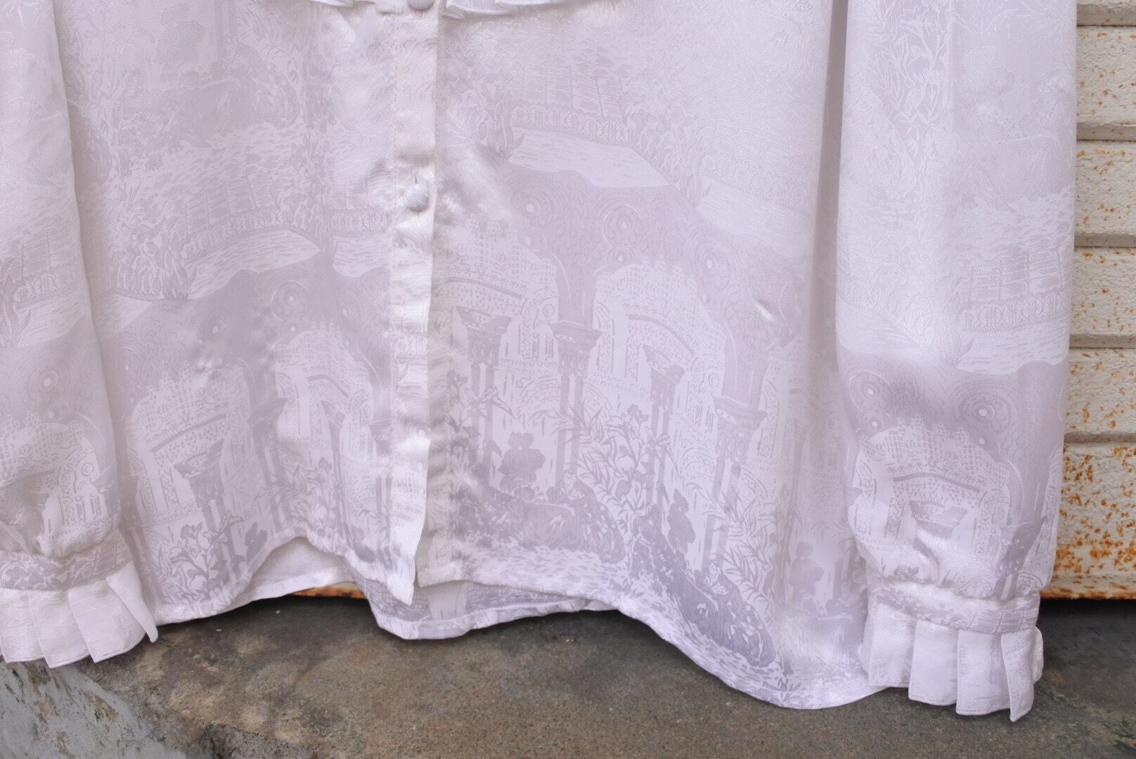 光沢のあるサテンには地模様が入っていて、東洋の宮殿のようなところに人々が集まっているような模様が。
