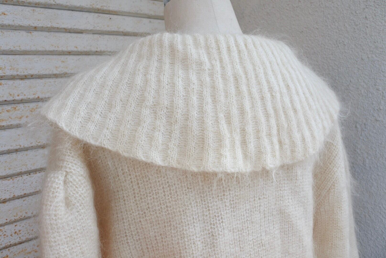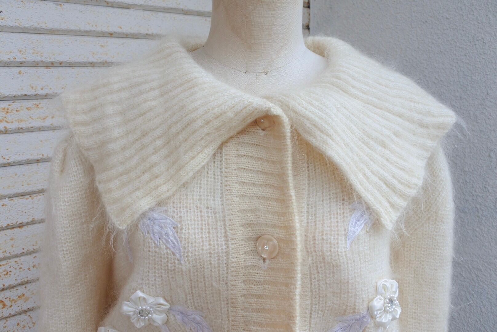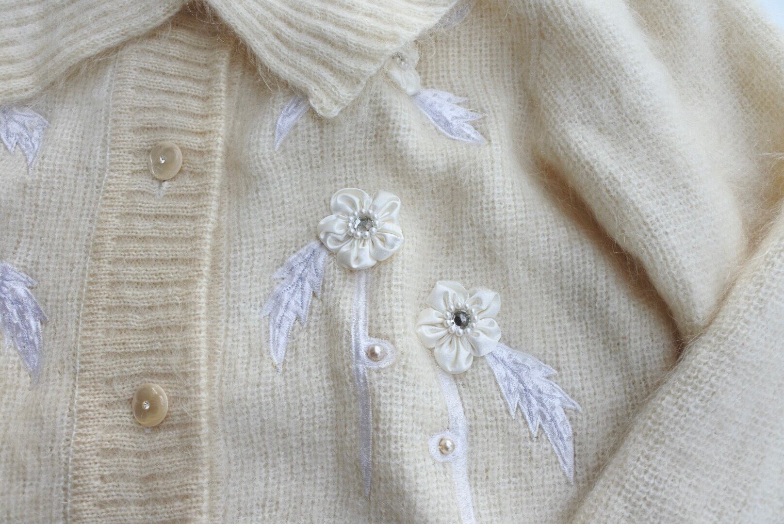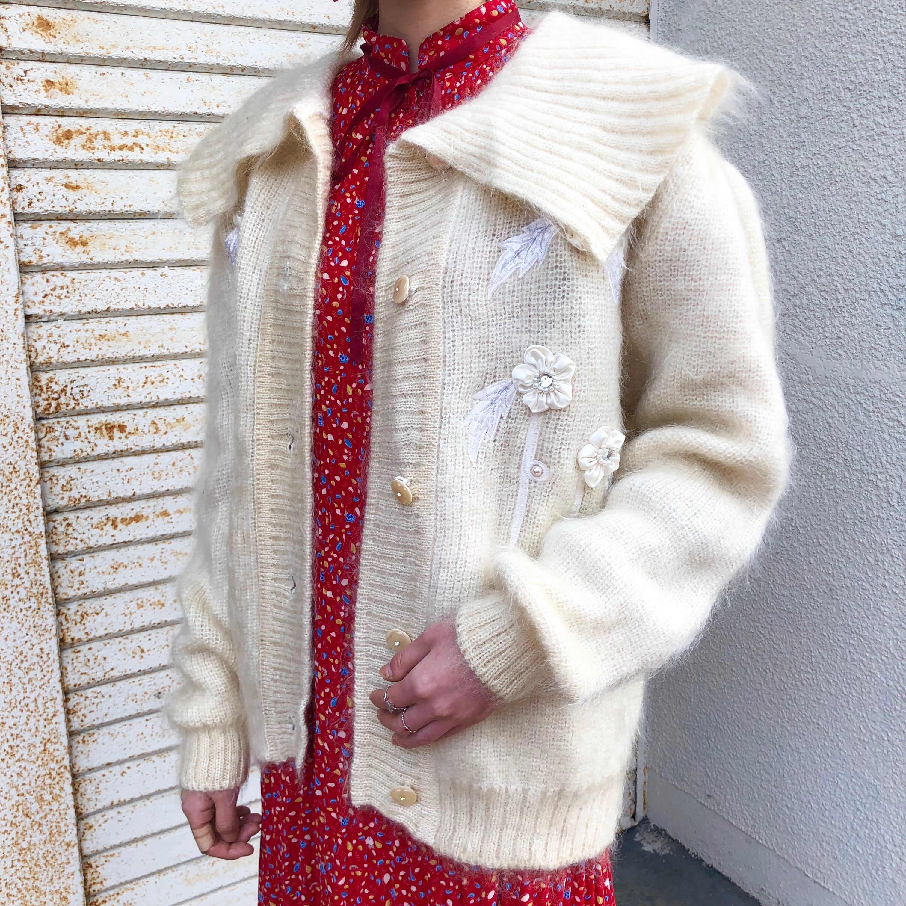 毛足が長くモフモフした触り心地に、大きな羽のような襟、お花のビジュー装飾。ときめきがたくさん詰め込まれたニットセーターです。