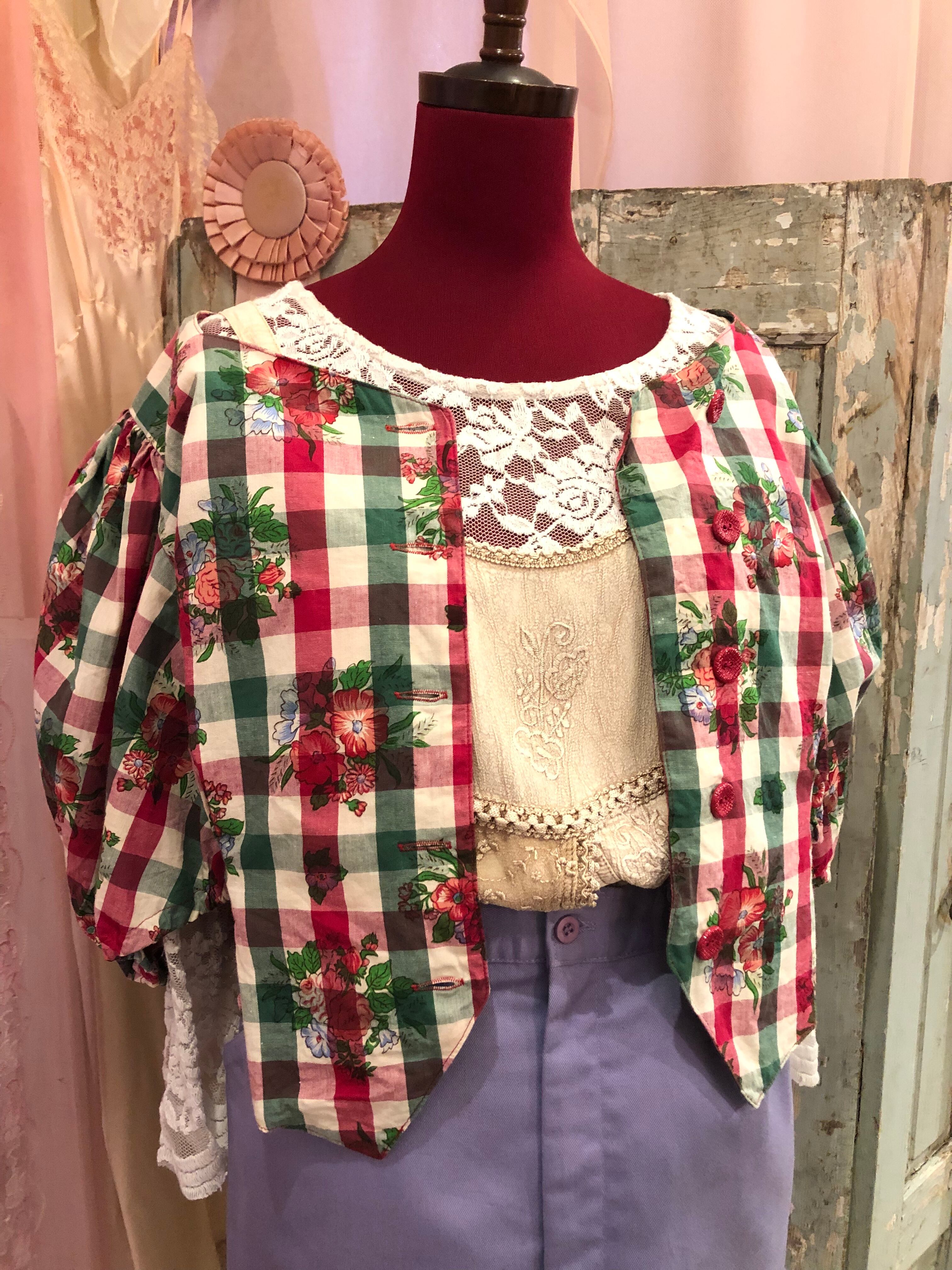 花柄とチェックのパフスリーブトップスです。