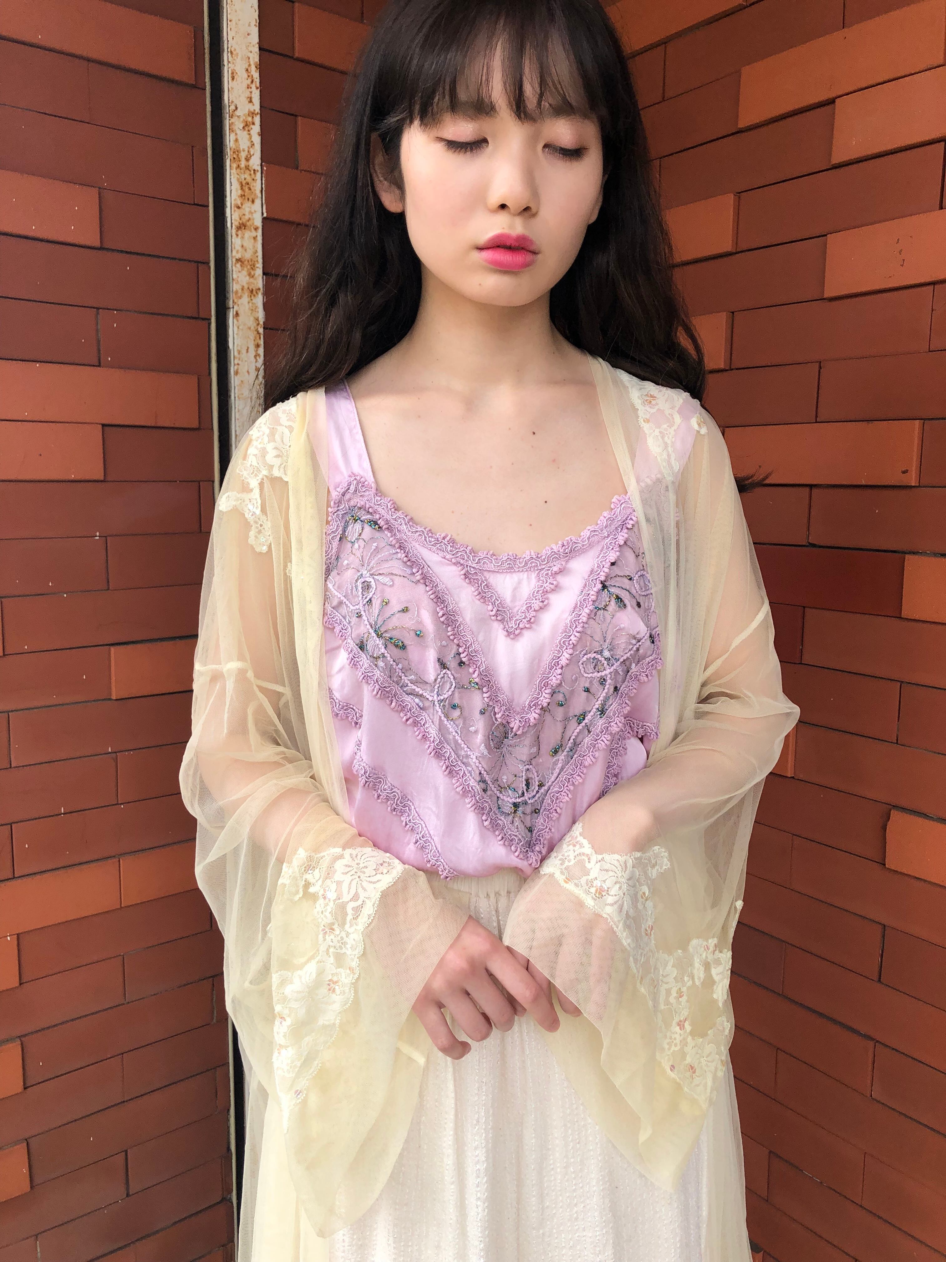 肩、お袖まわりにレース、スパンコールの装飾が施されています。