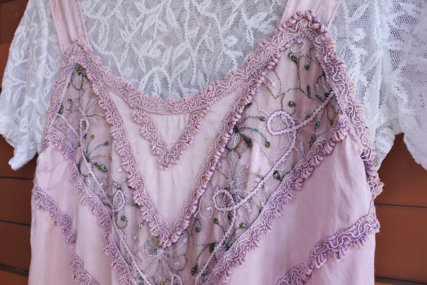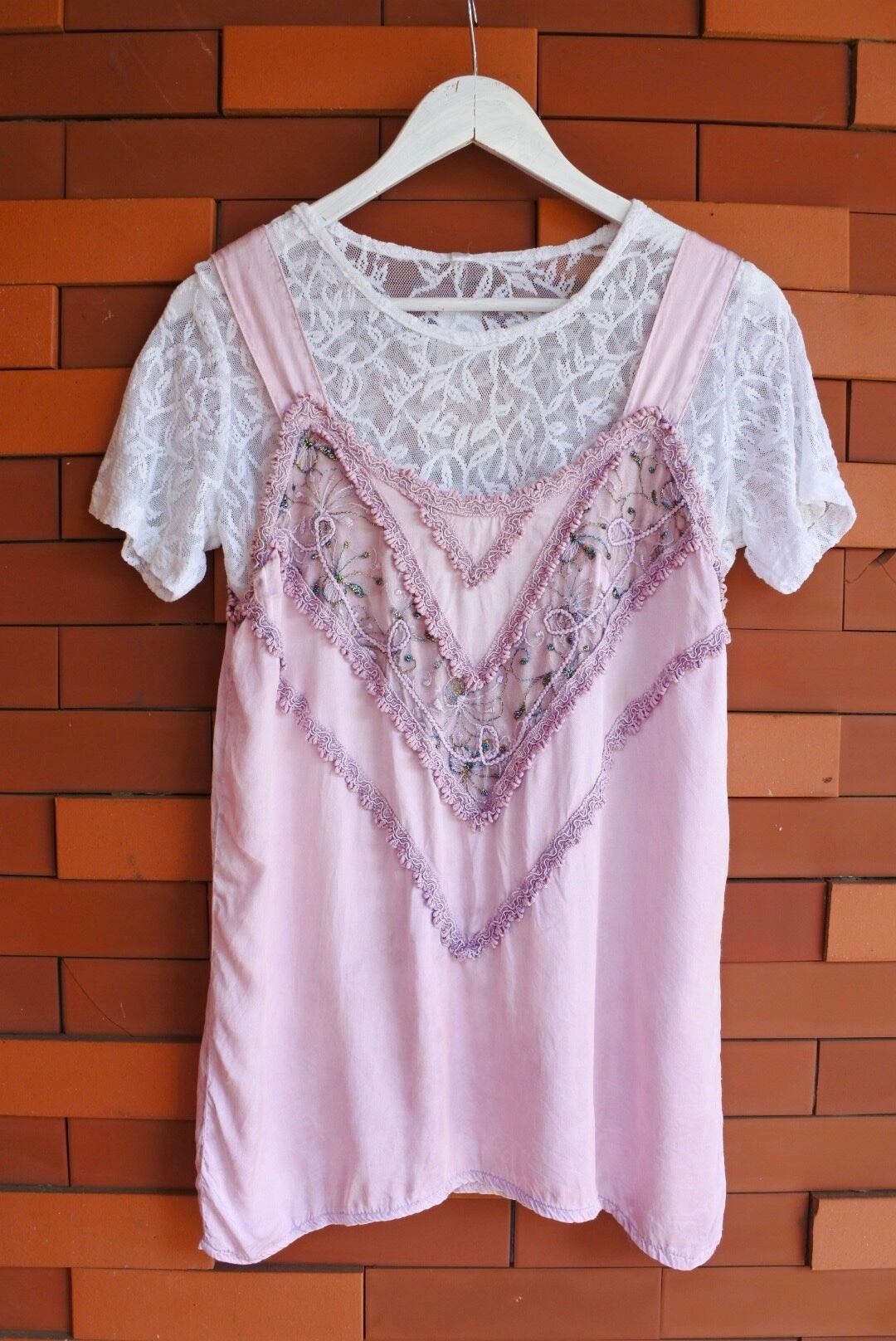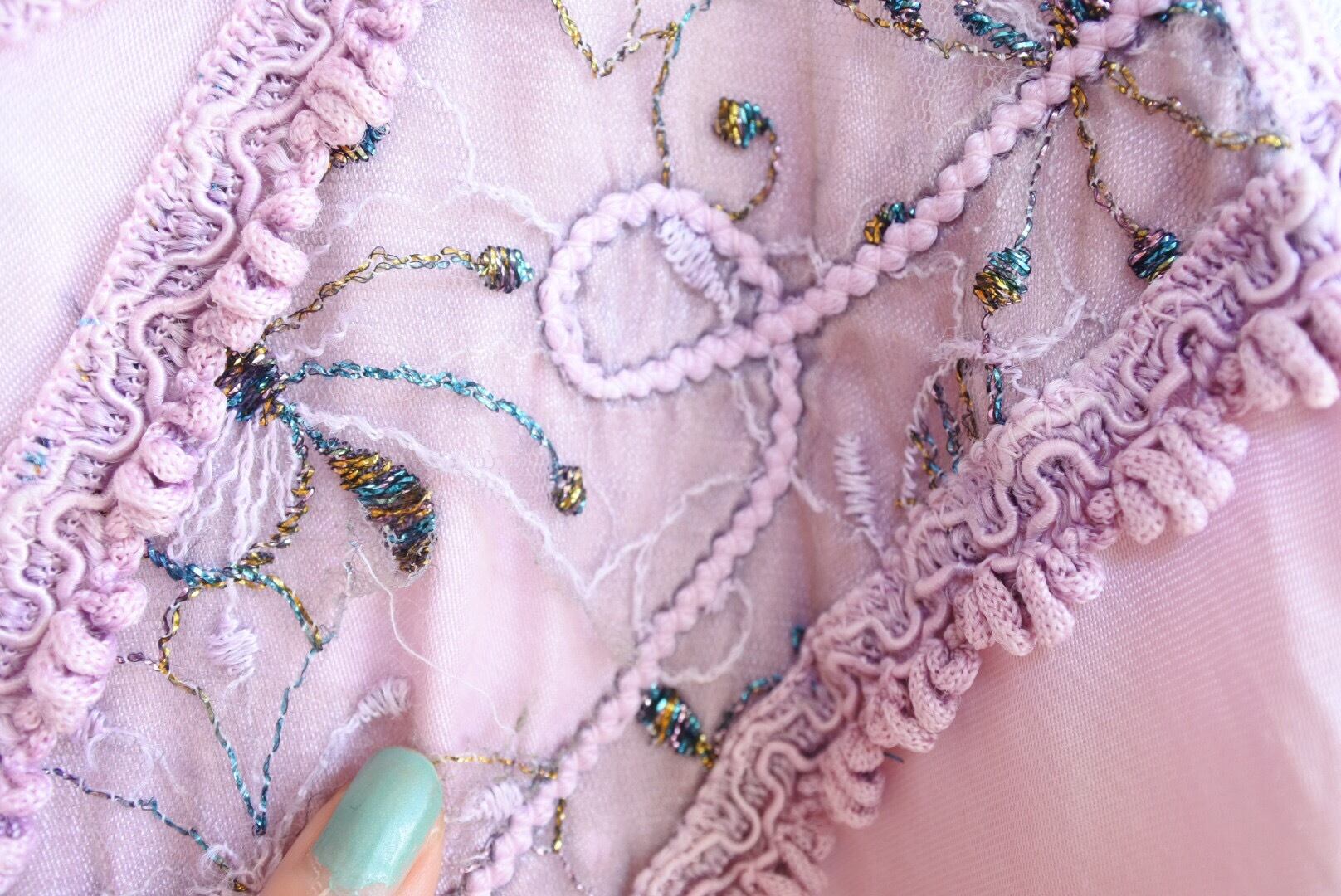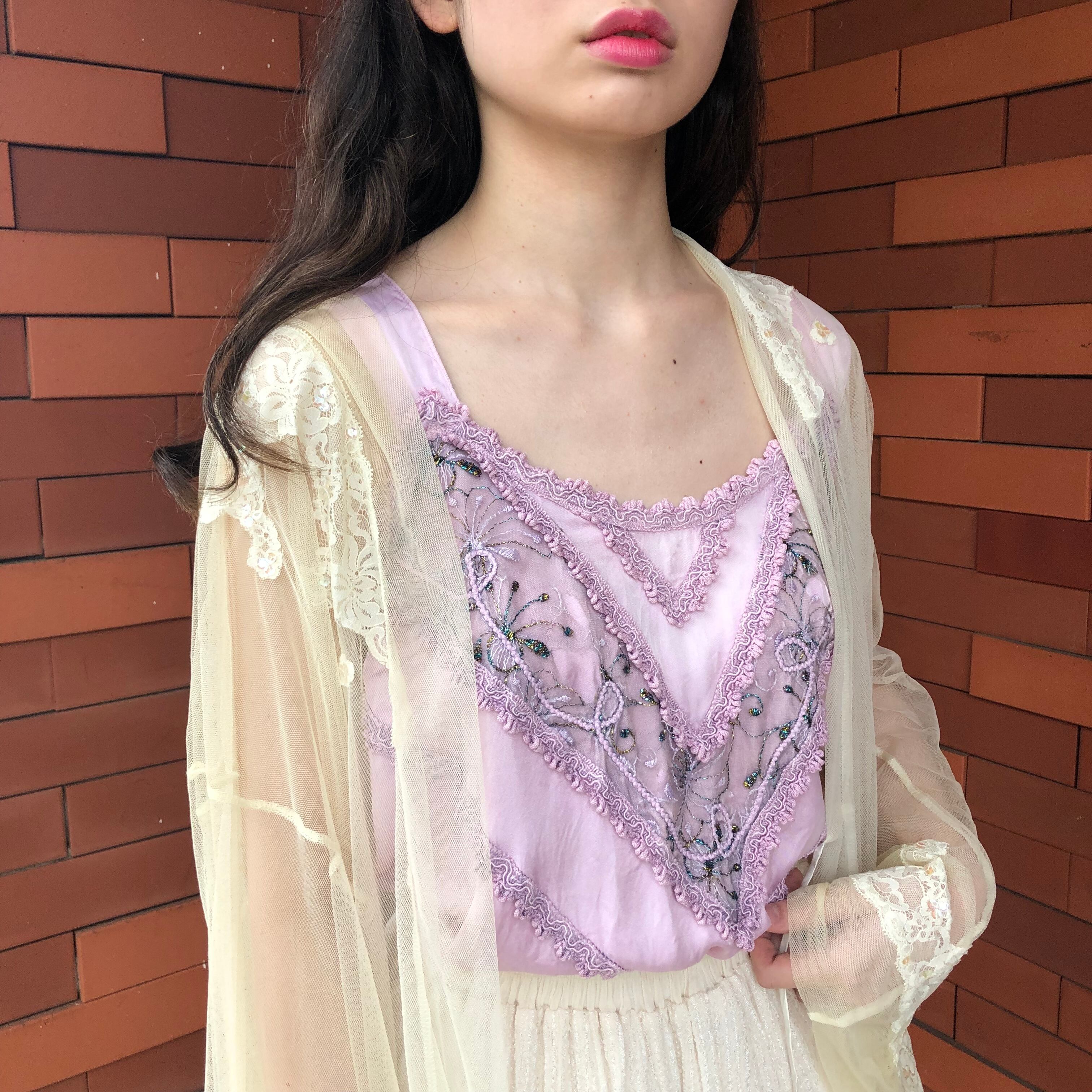 Vの字になった部分にレースが貼られており、水色やゴールドの糸で