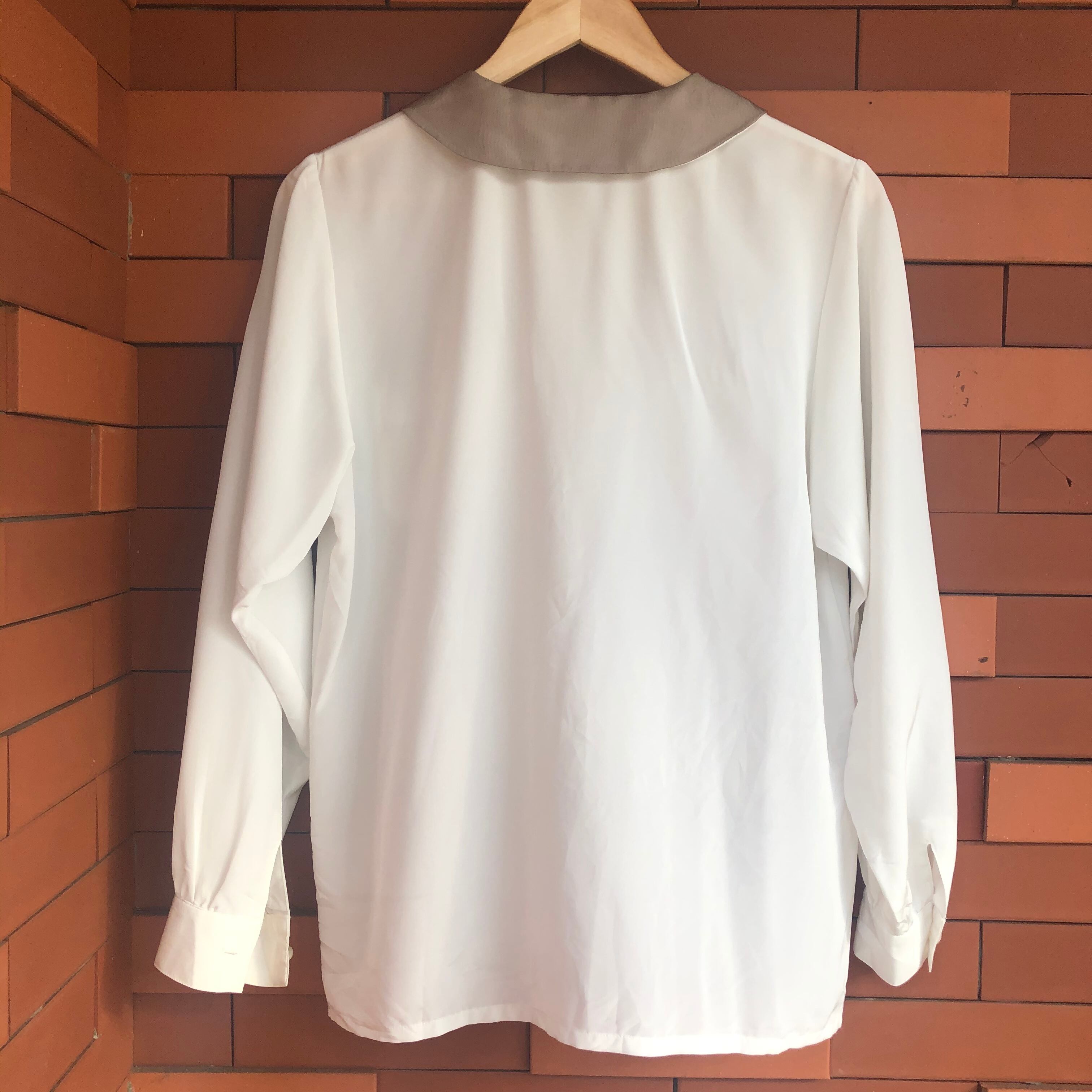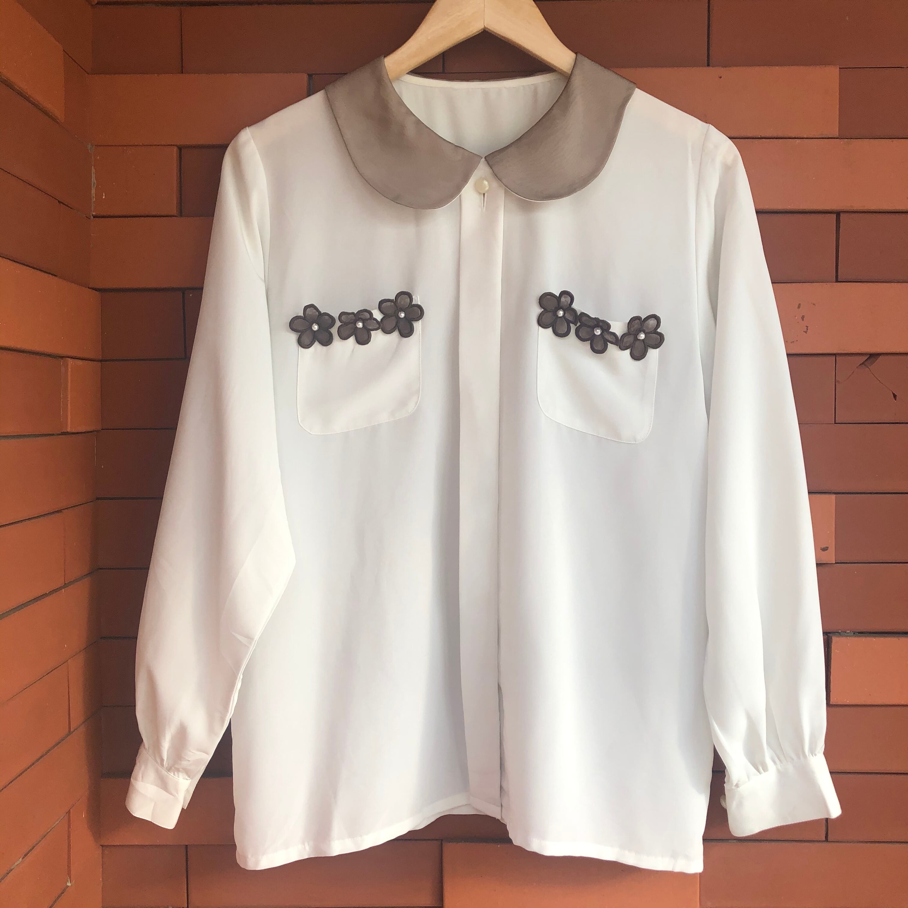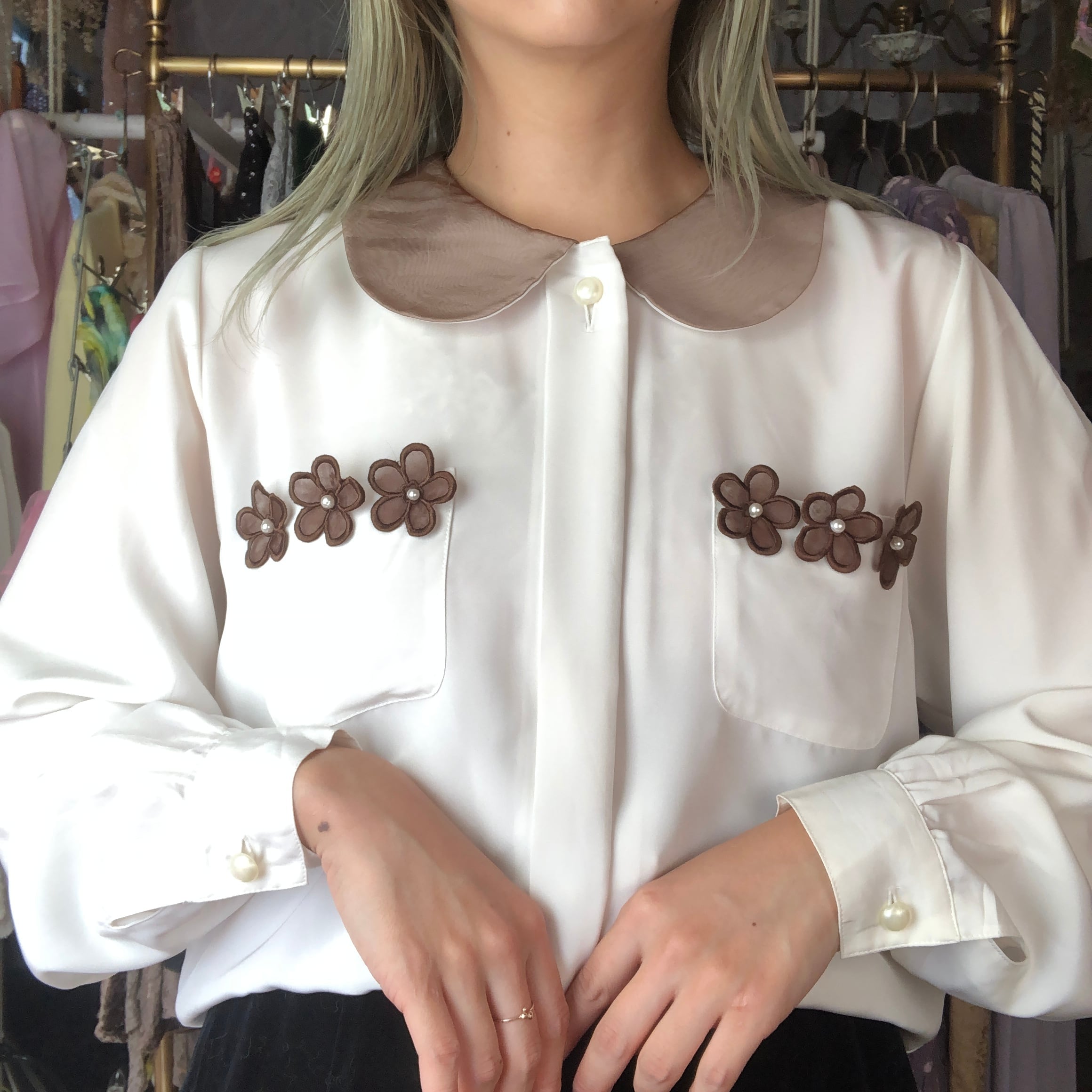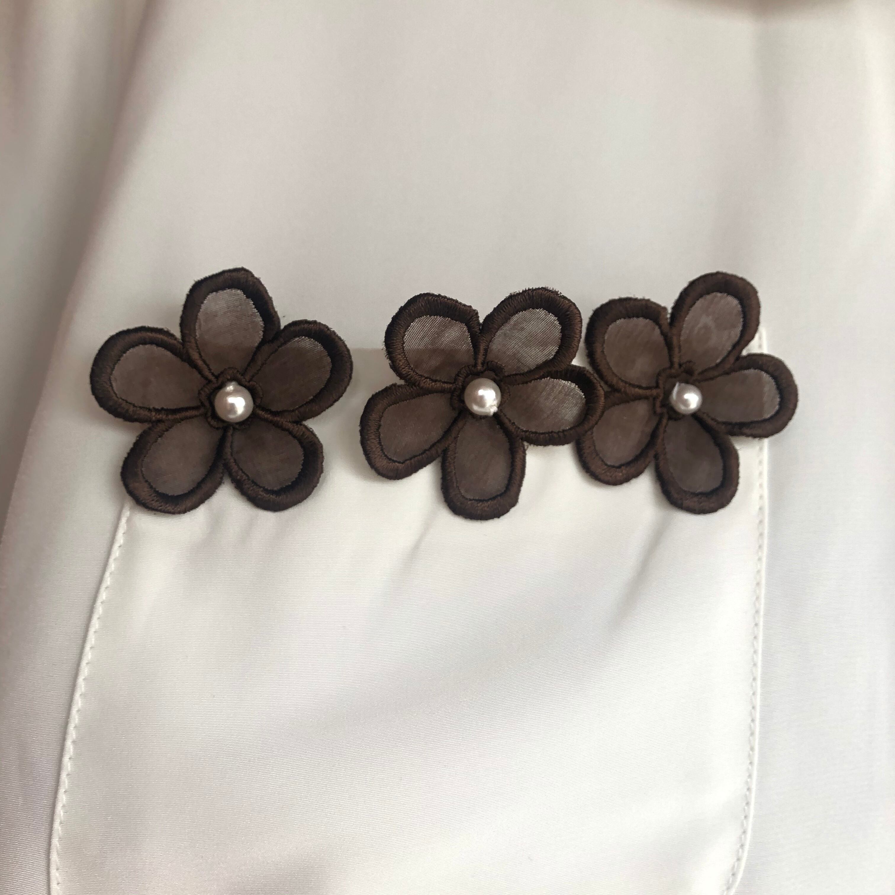 透けたオーガンジーの襟と三つずつ連なるポケットのお花が愛らしいブラウスです。