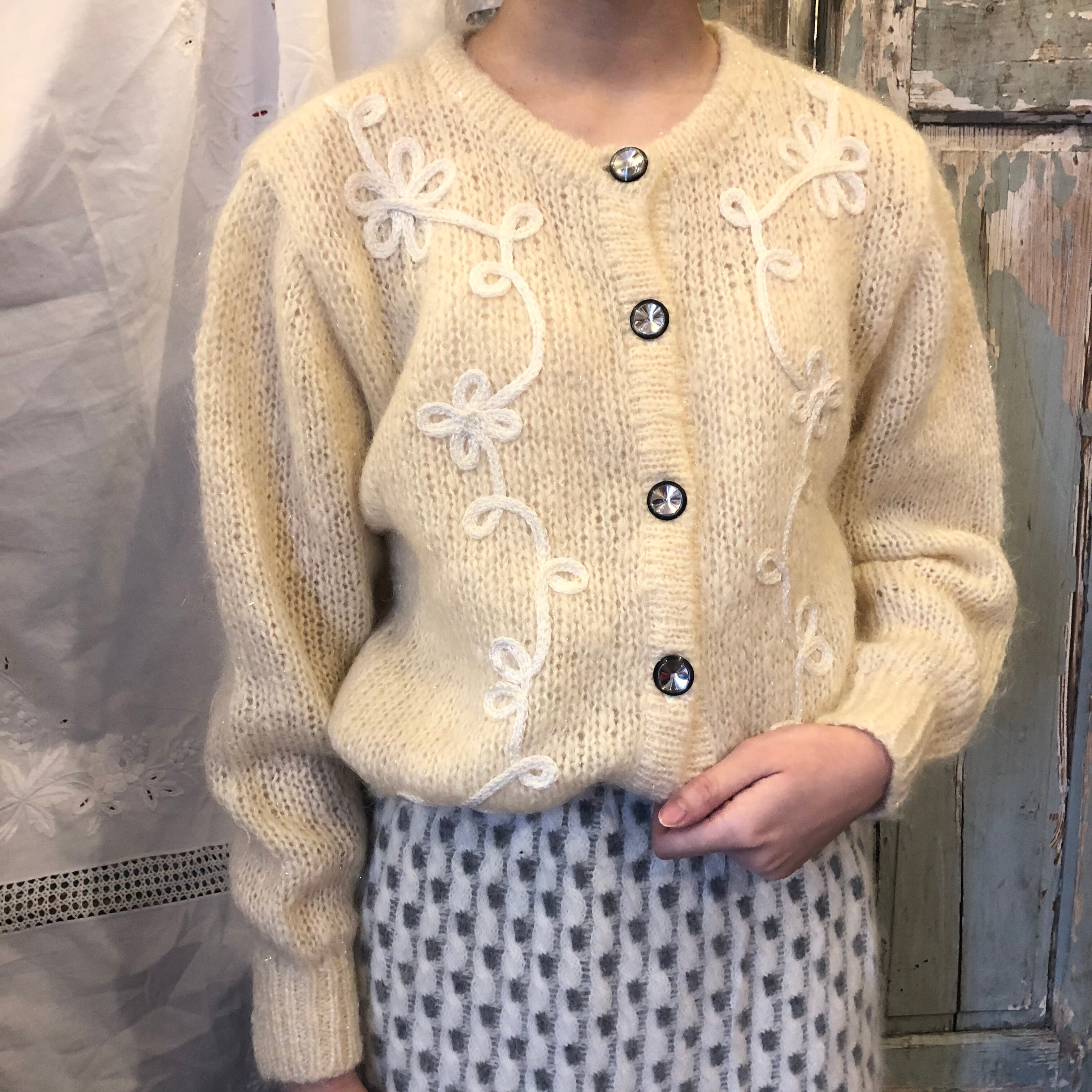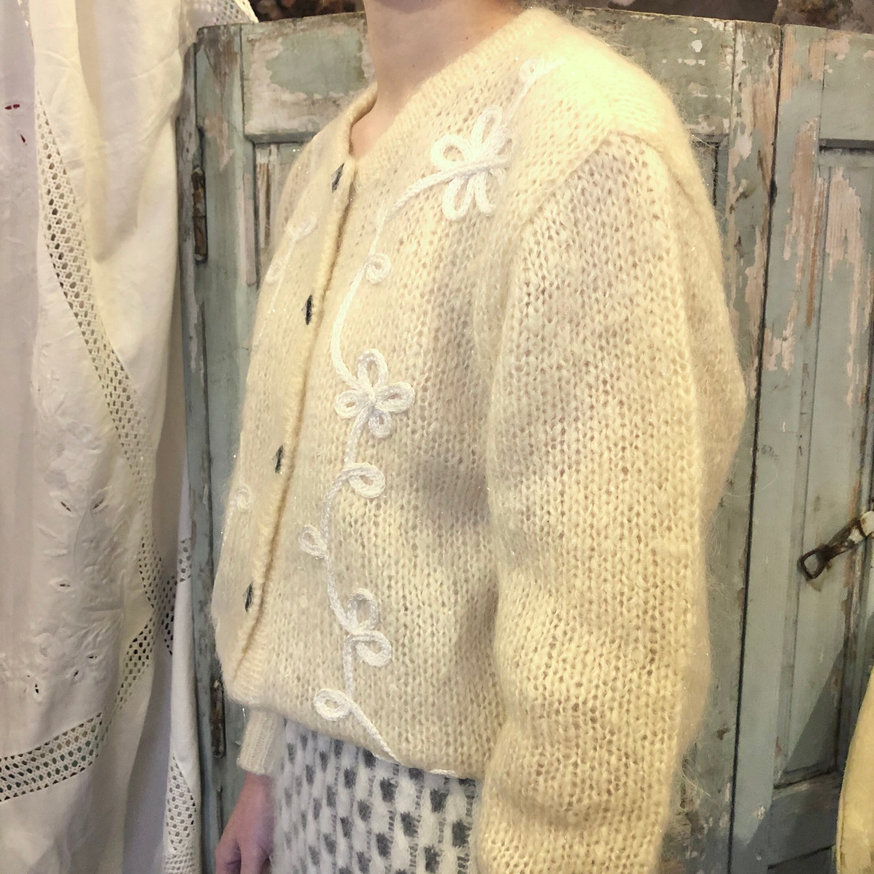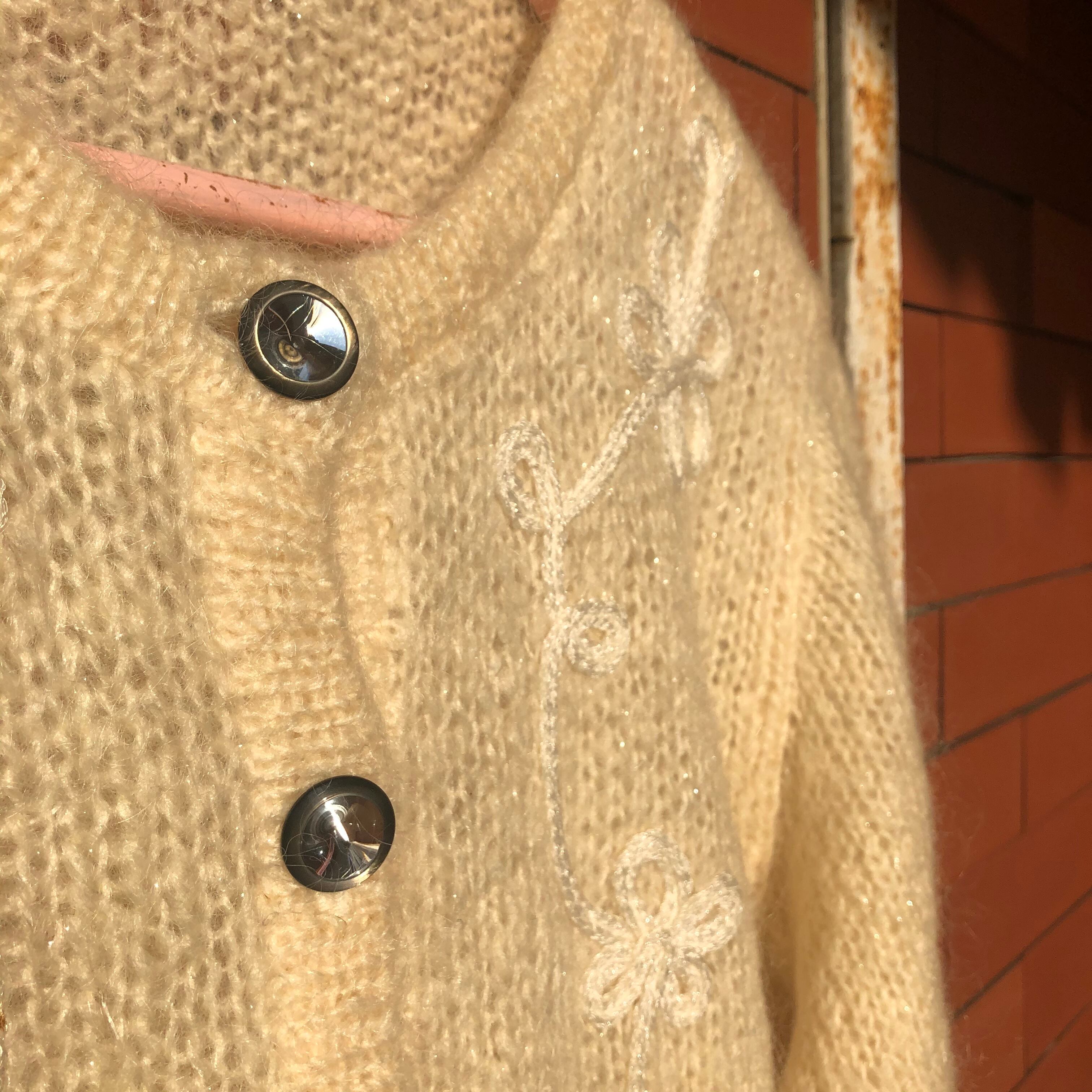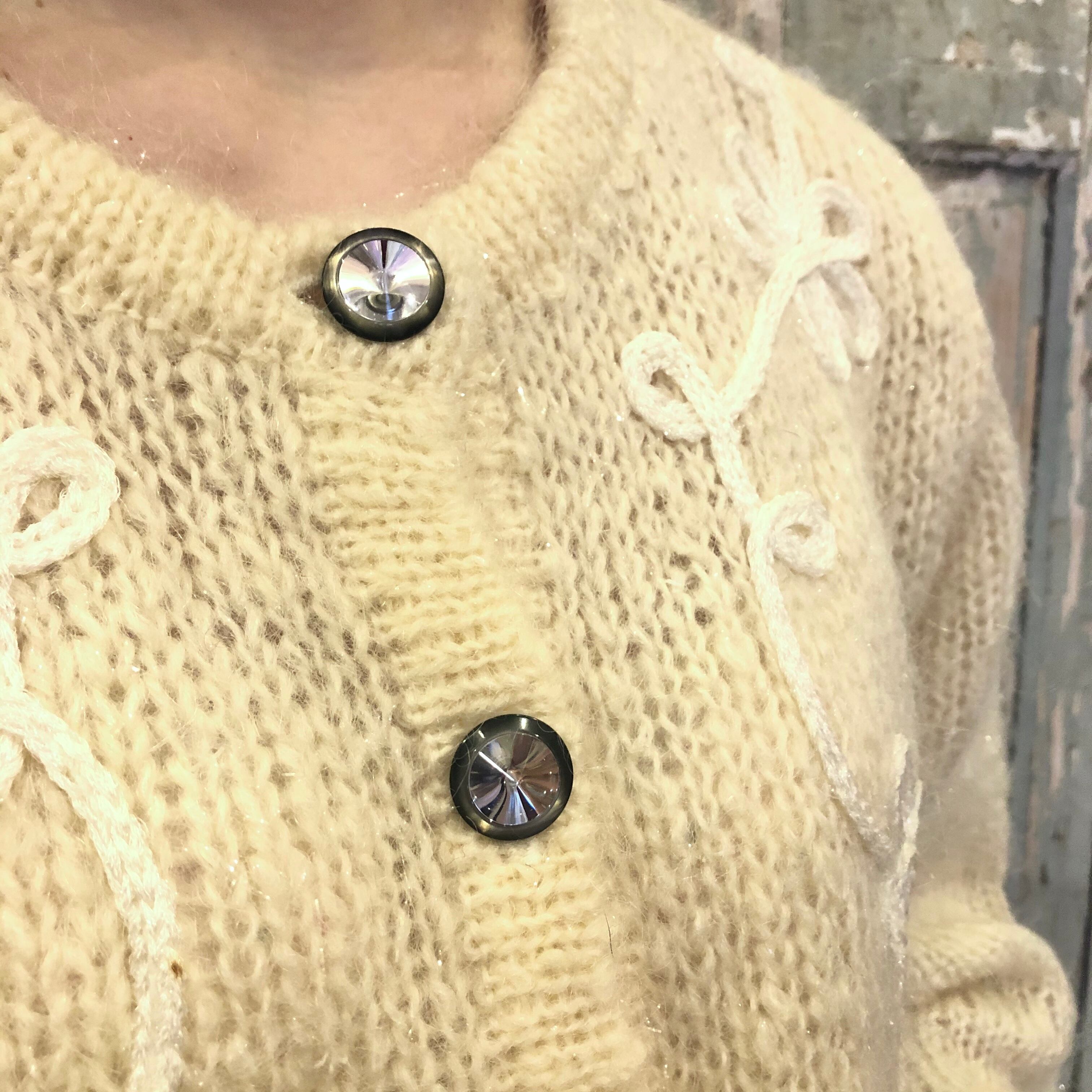 ニット素材と相反するクリアなボタンも魅力的で自然光の元でより一層きらめきます。(画像10)