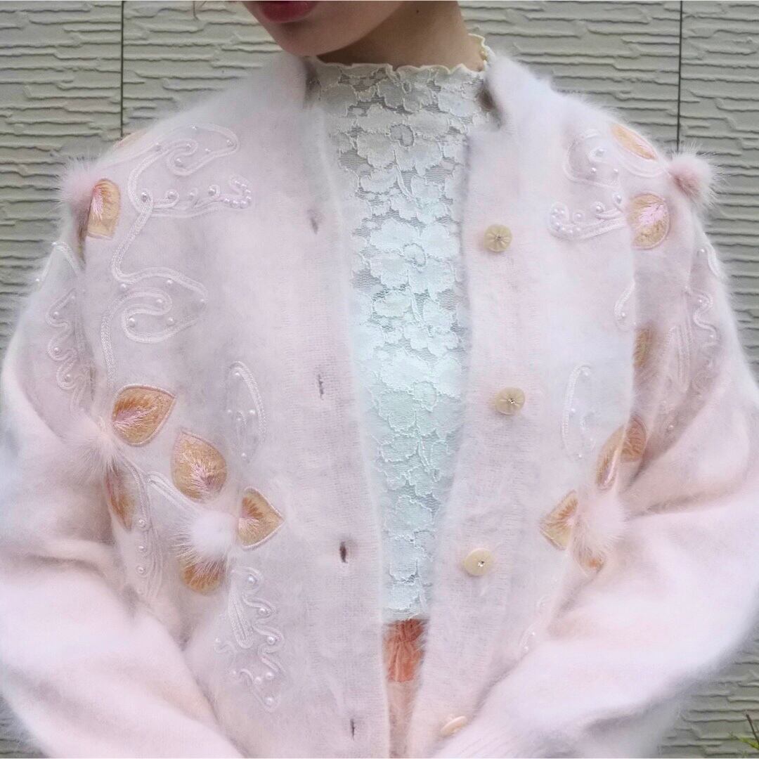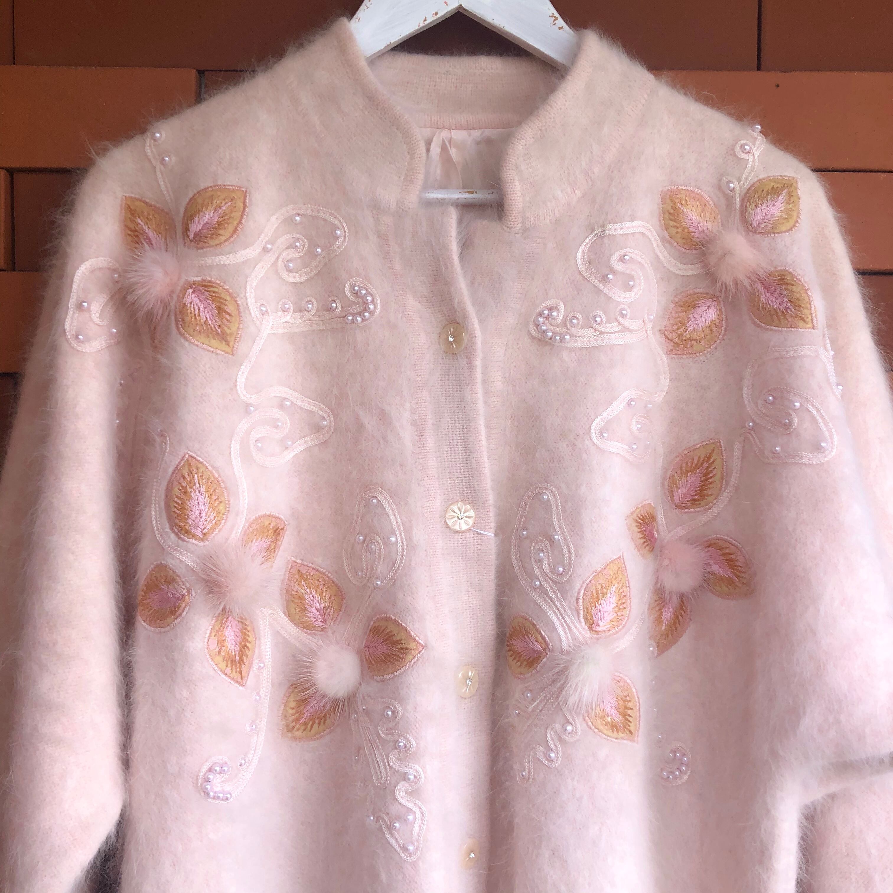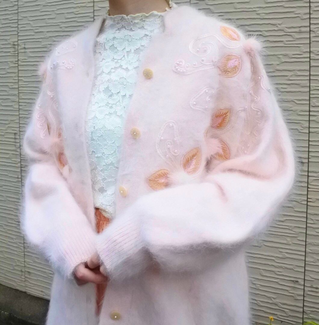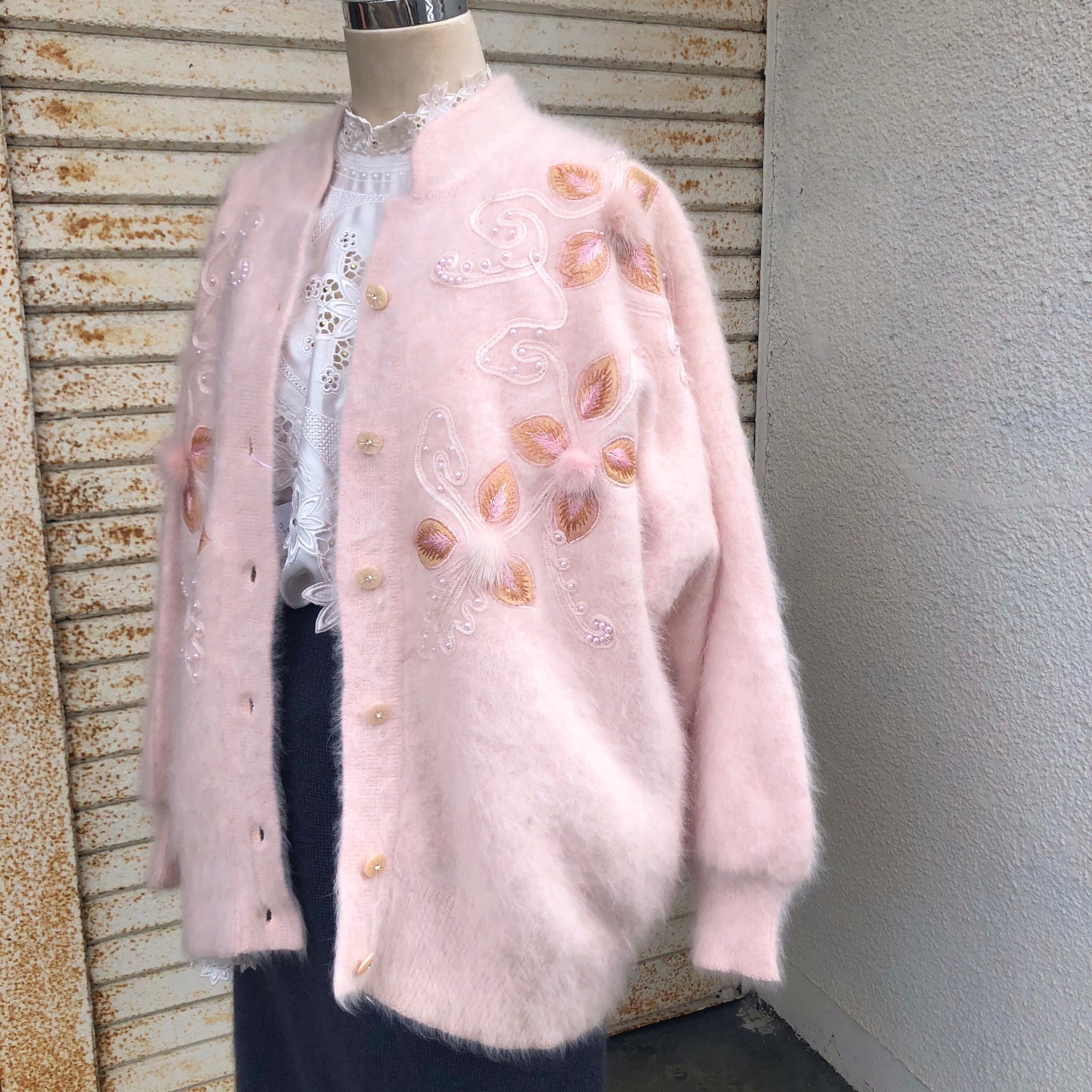 優しいピンクのアンゴラニットにファーのポンポンやピンクのイミテーションパールが装飾されたカーディガンです。