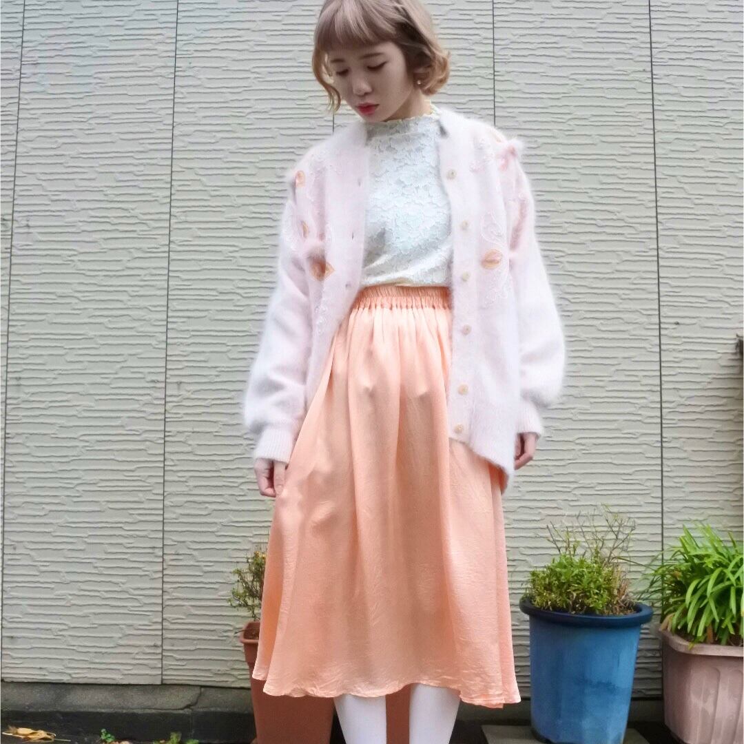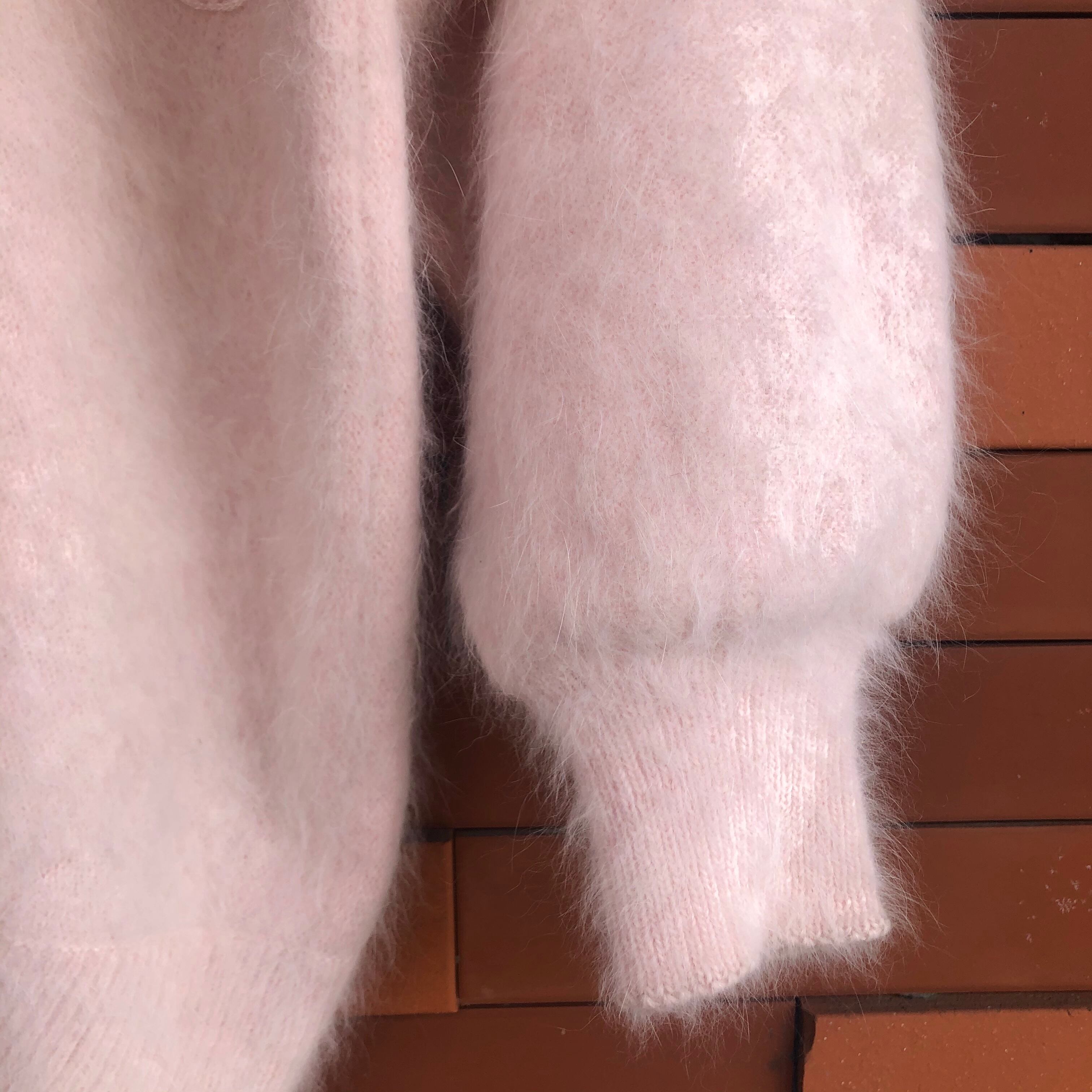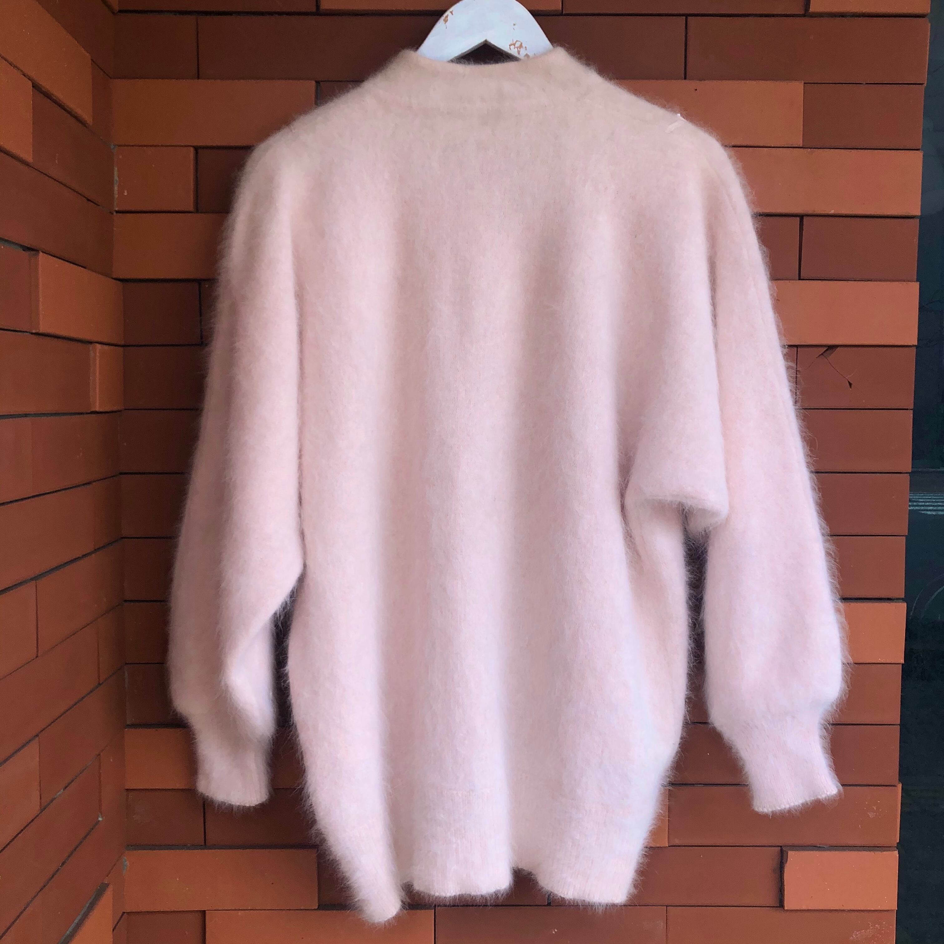 優しいピンクのアンゴラニットにファーのポンポンやピンクのイミテーションパールが装飾されたカーディガンです。
