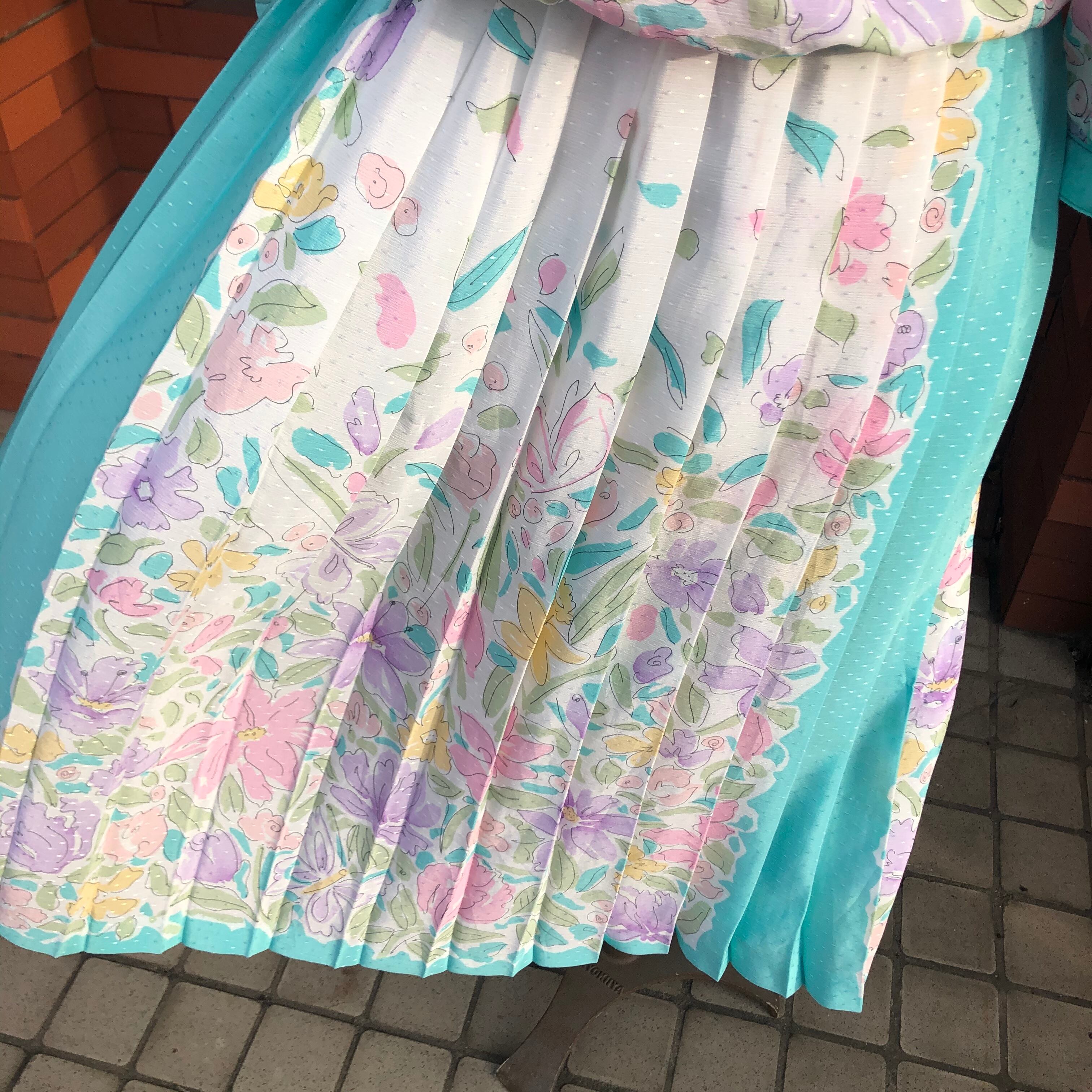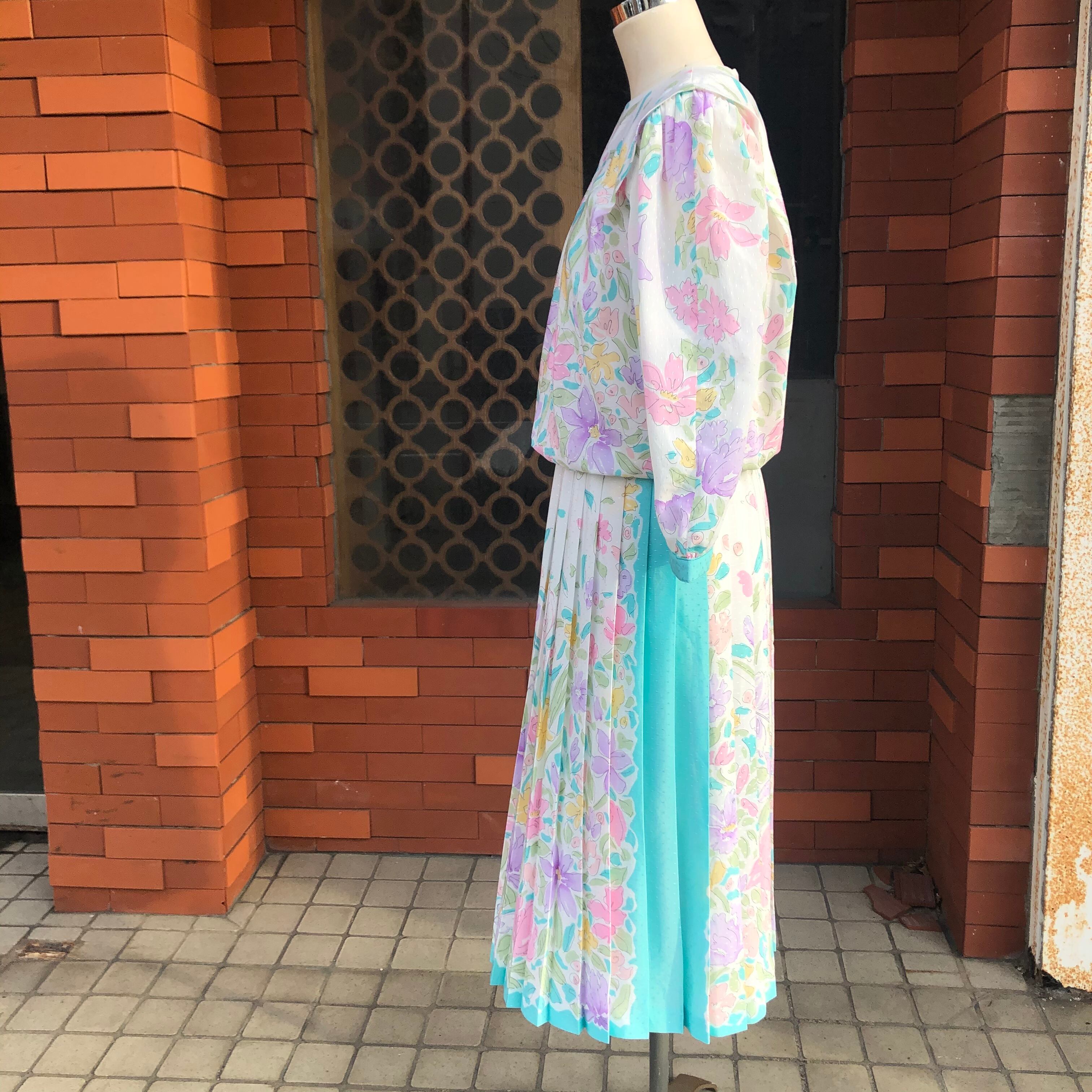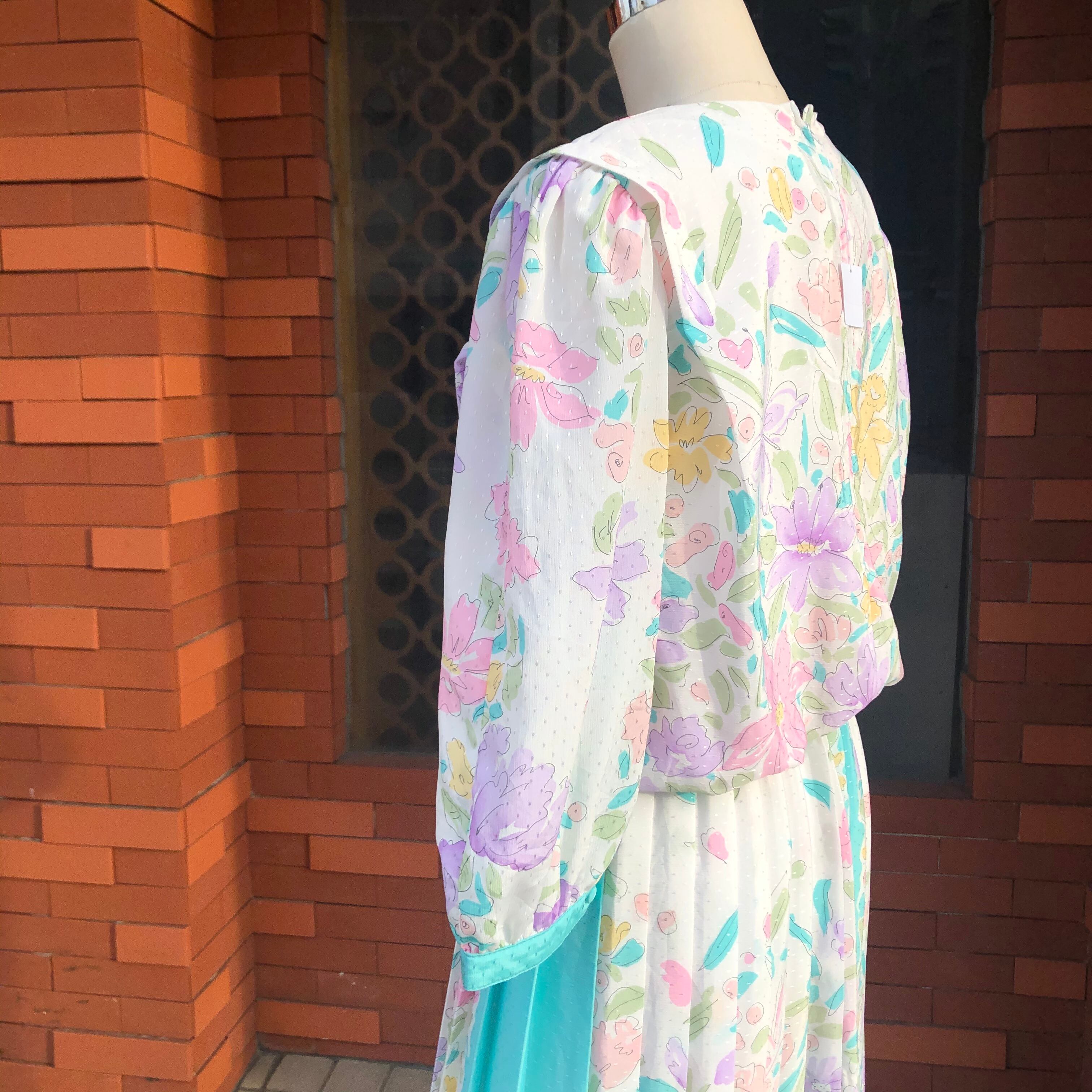 袖口とスカートのプリーツ部分に走るミントグリーンが額縁のような役割でホワイトベースを膨張せずすっきりまとめてくれるような計算されたデザイン。