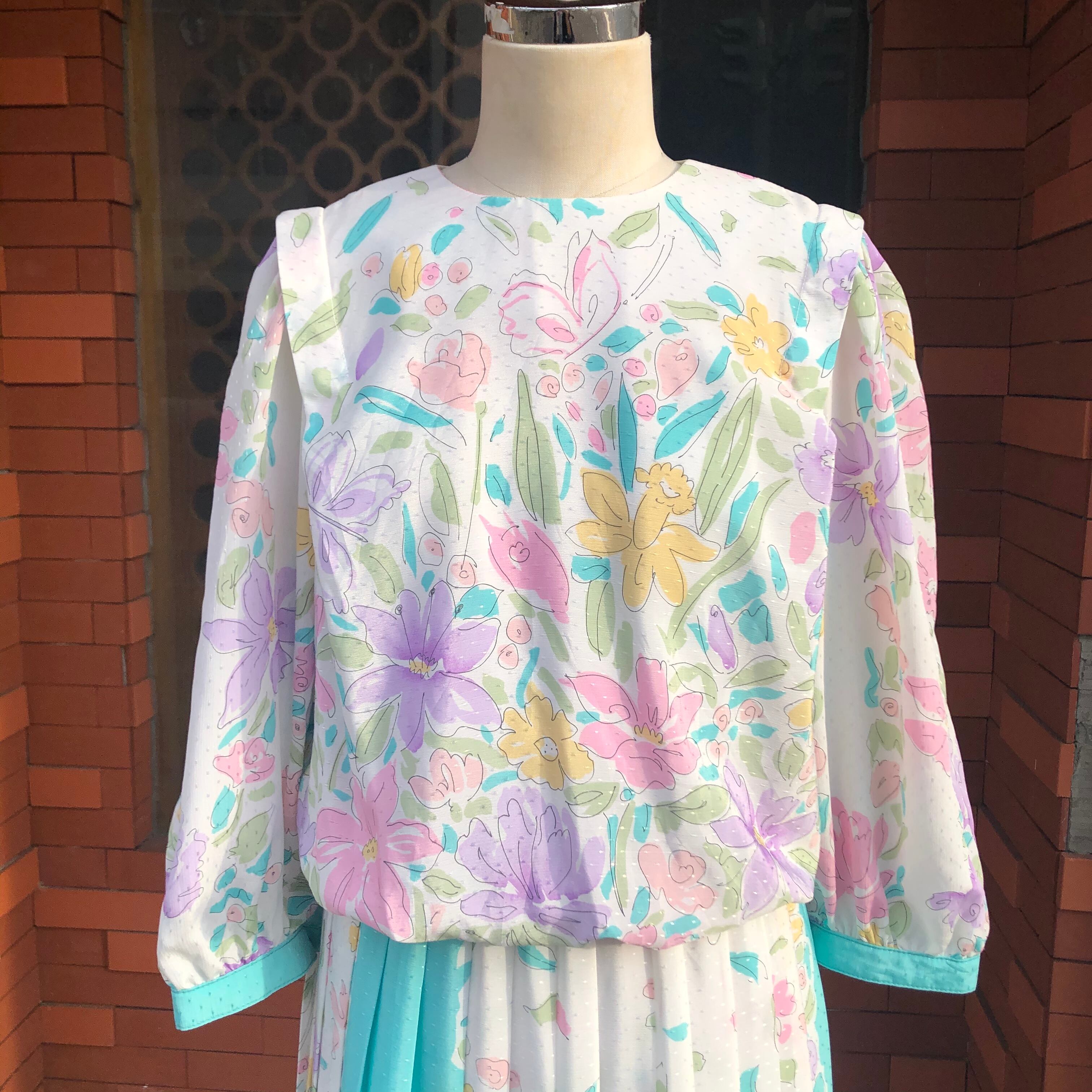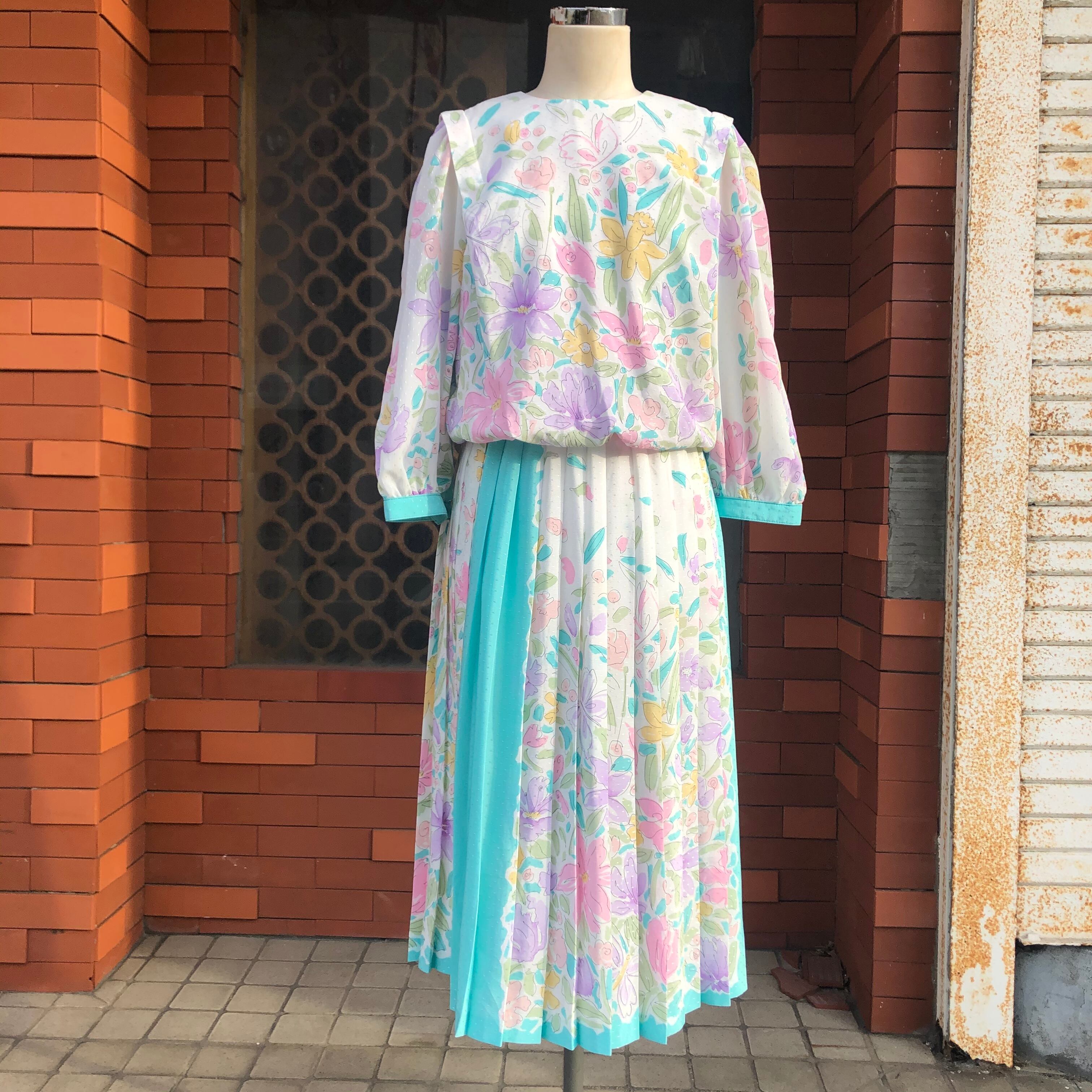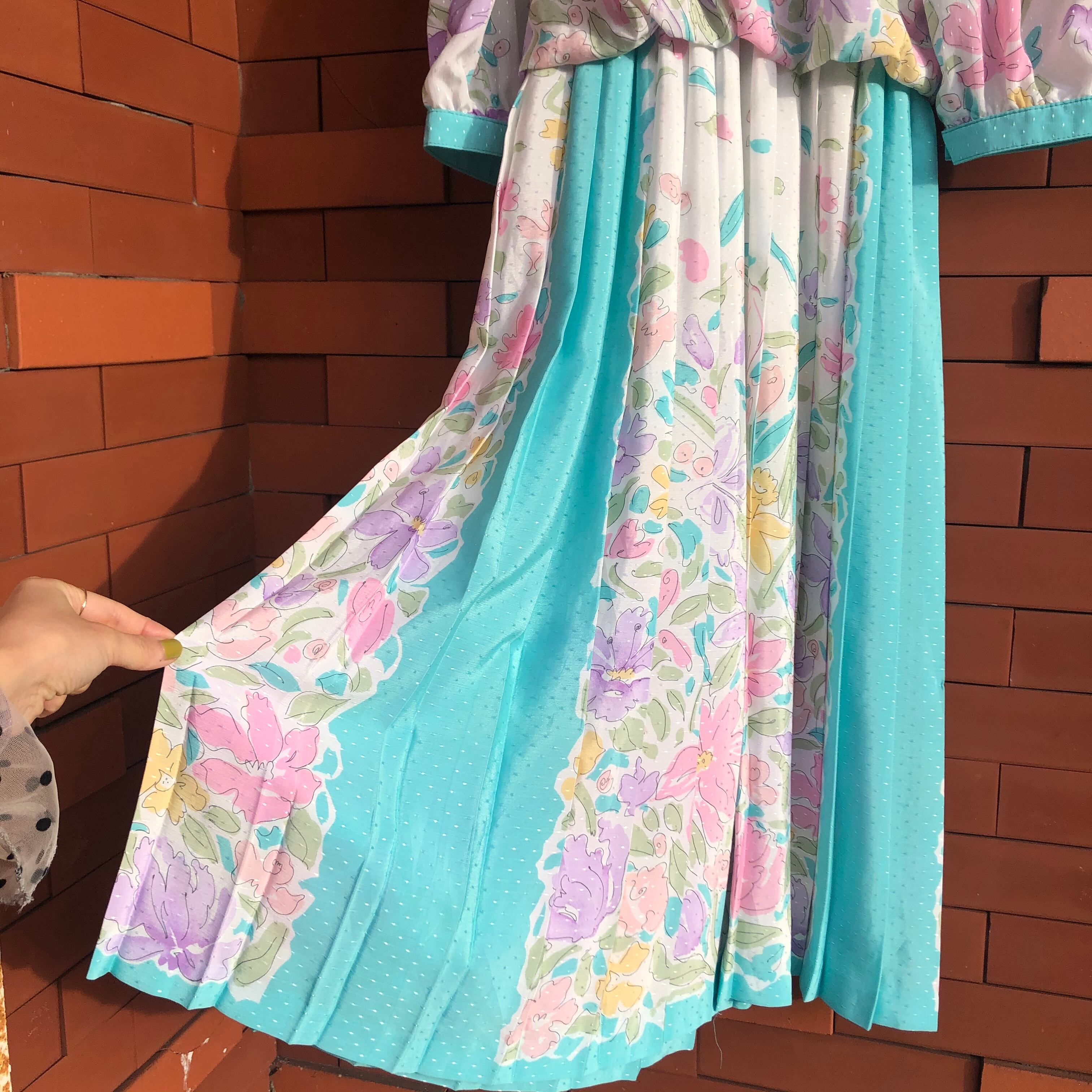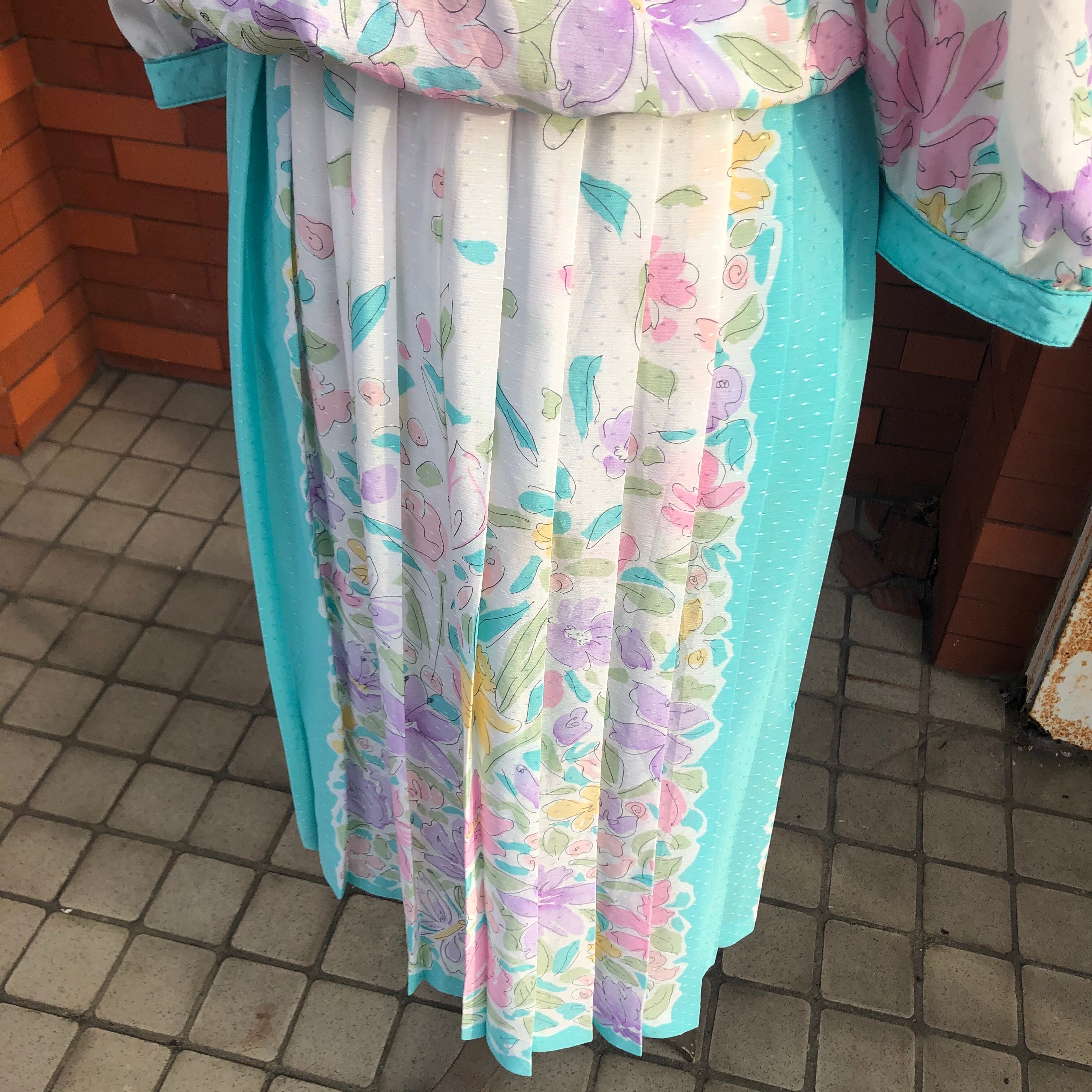 袖口とスカートのプリーツ部分に走るミントグリーンが額縁のような役割でホワイトベースを膨張せずすっきりまとめてくれるような計算されたデザイン。