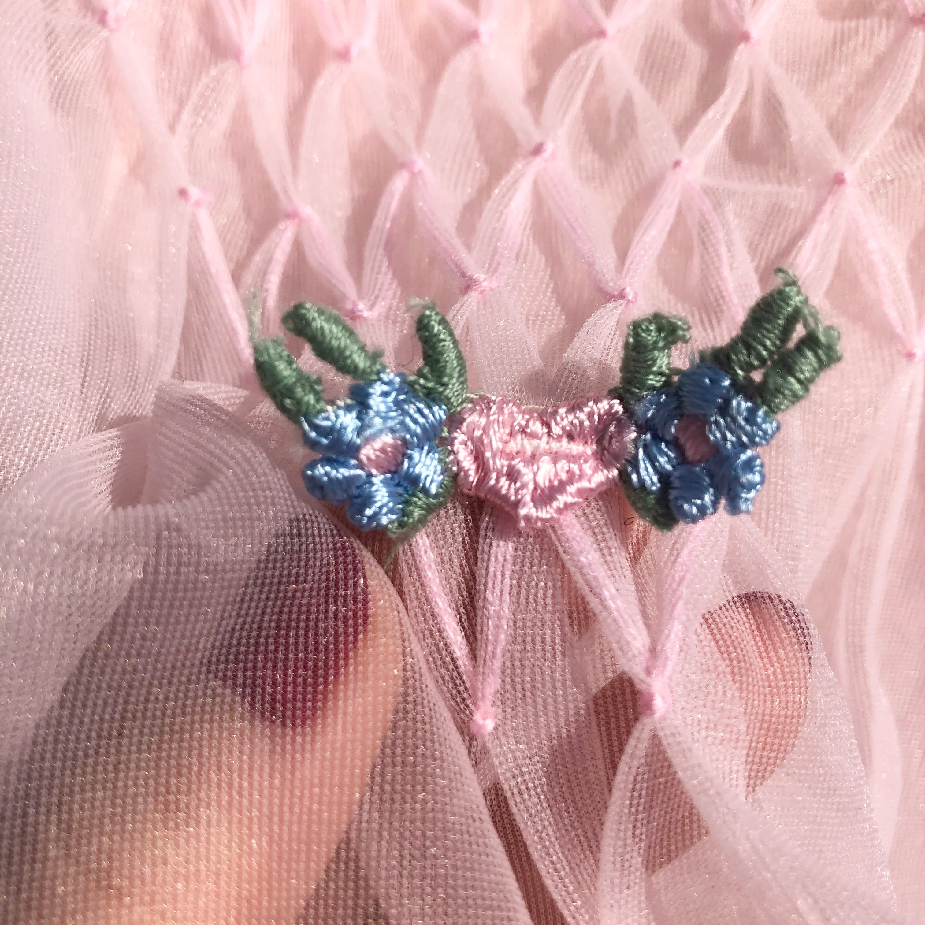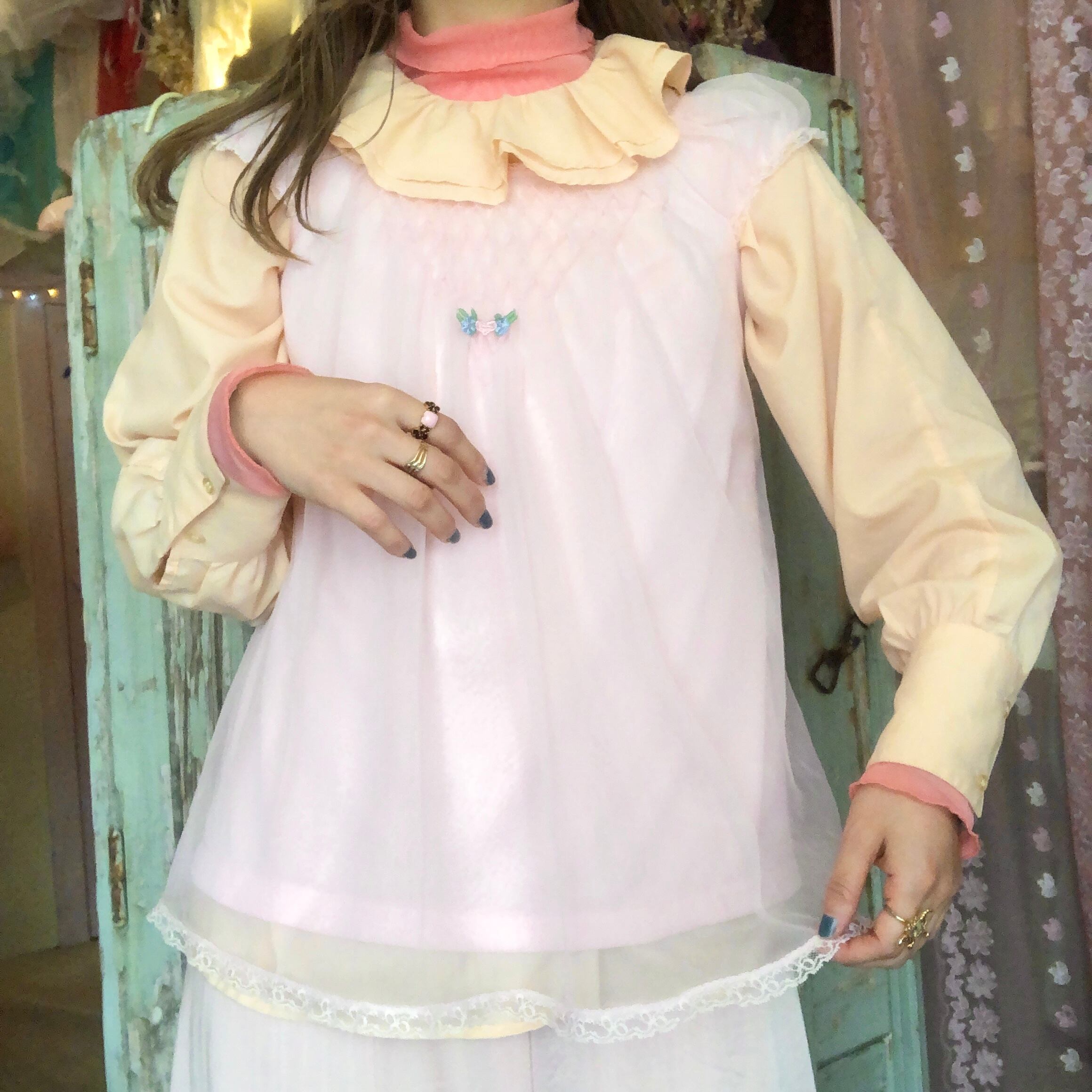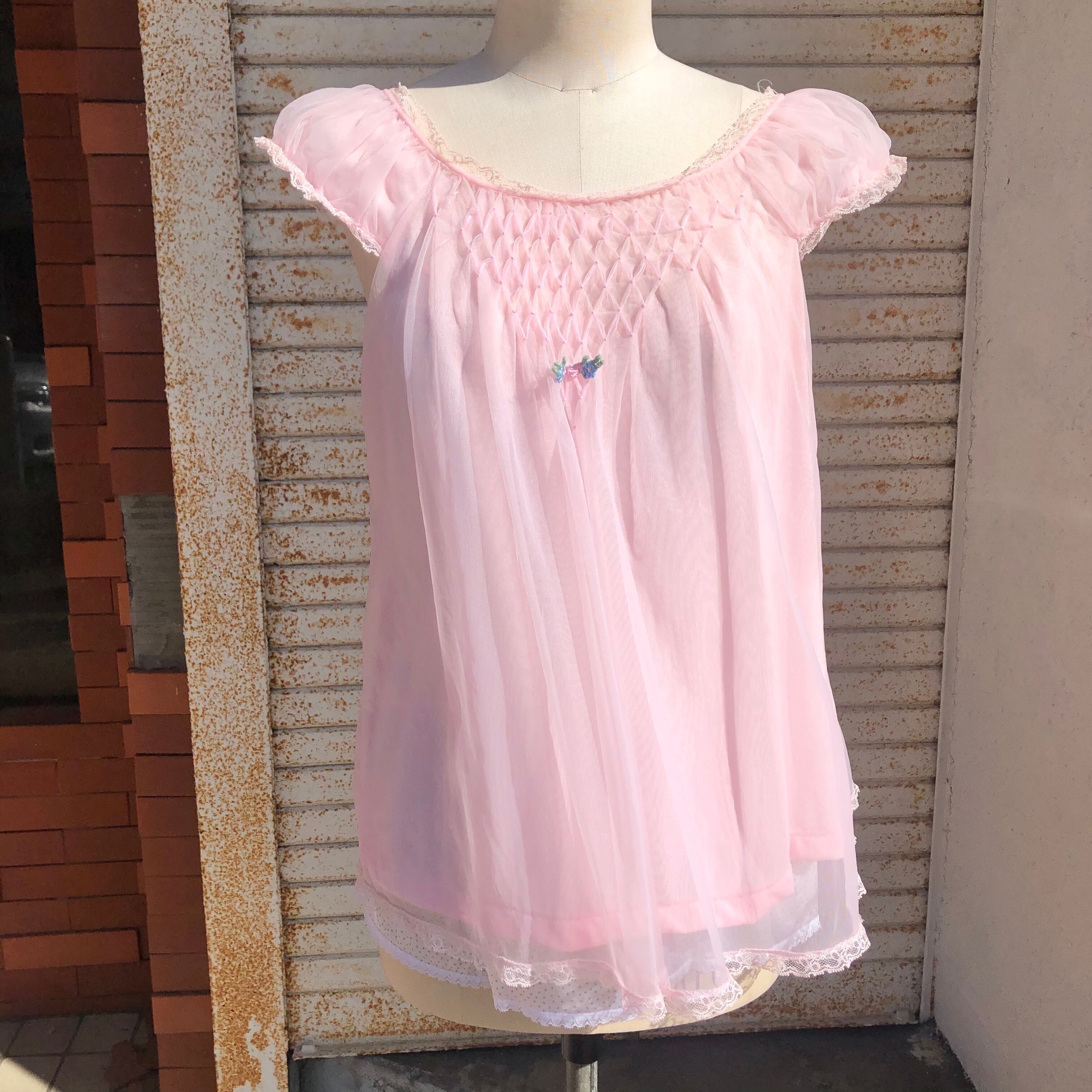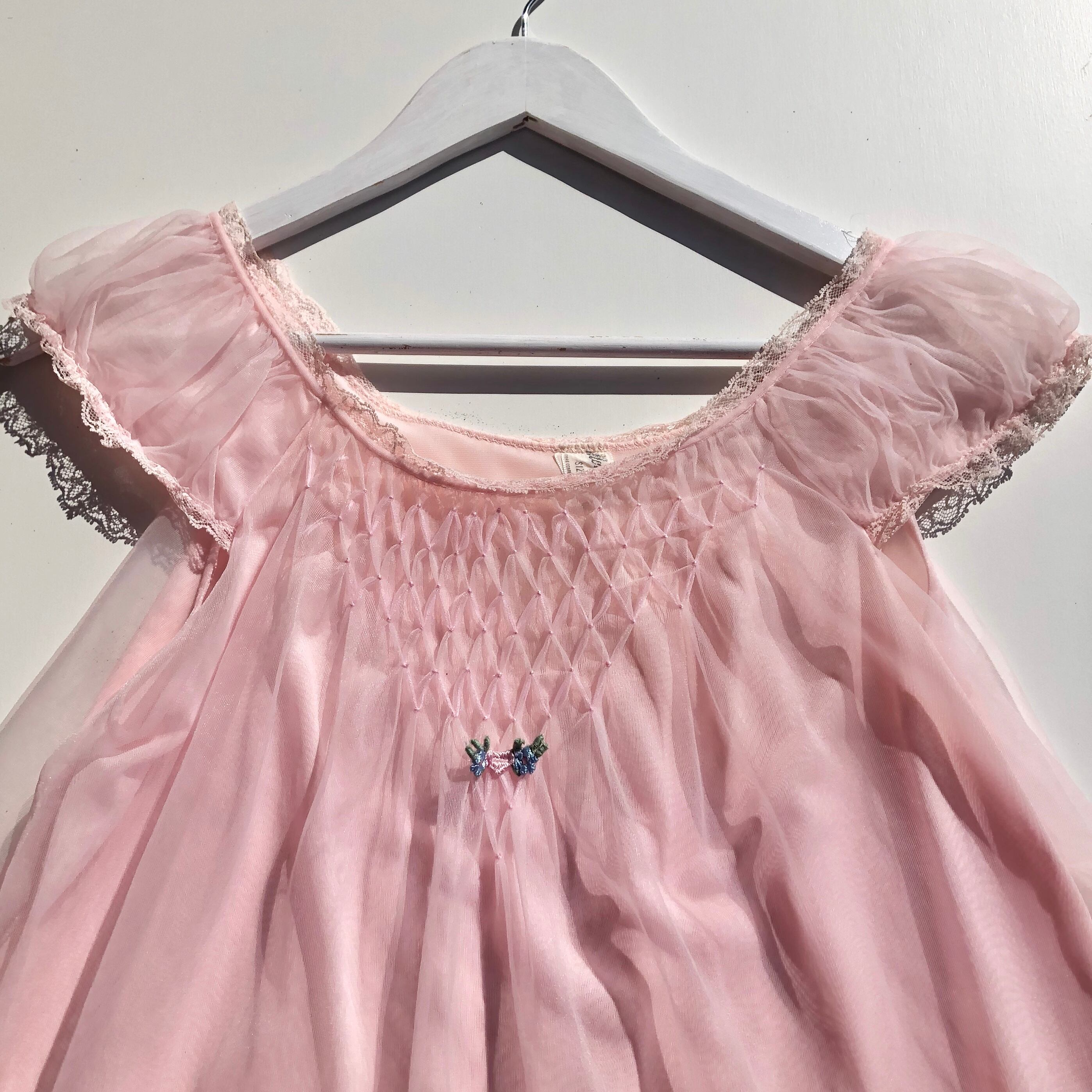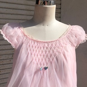 優しいピンクカラーに胸元スモッキング、花とハートのアップリケがベビーライクで愛しげな一着です。