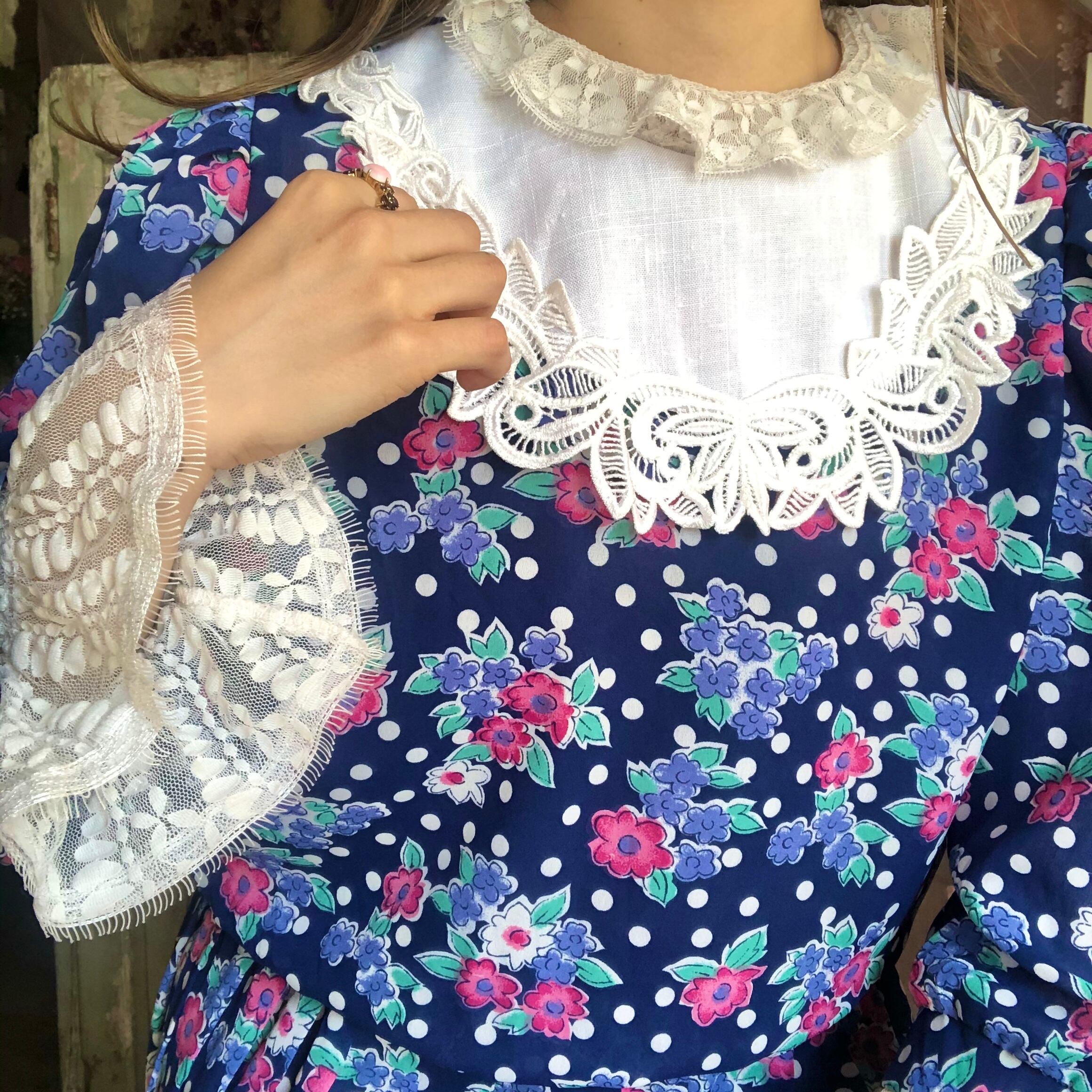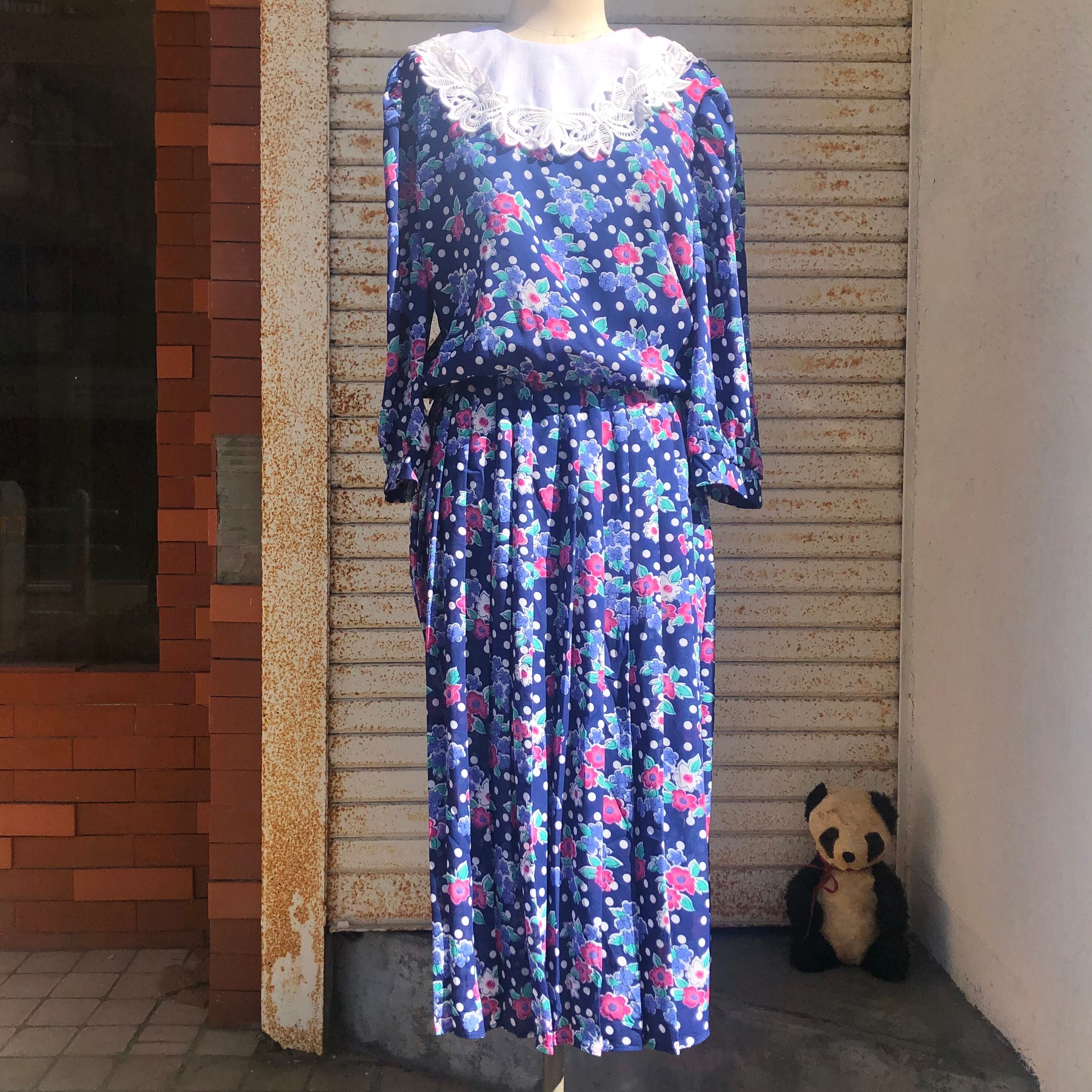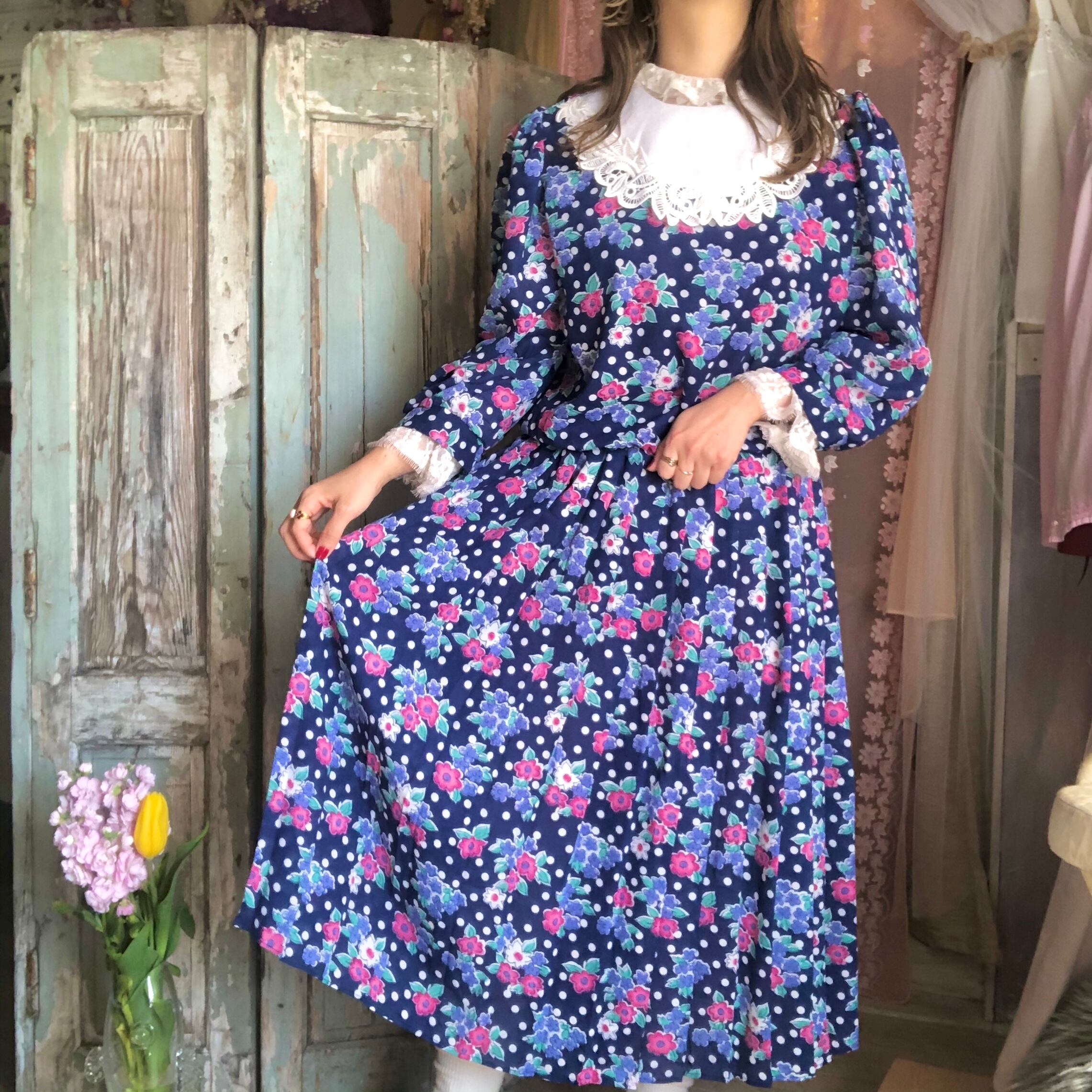ドッド柄と花柄がミックスされた花柄ワンピースです。
