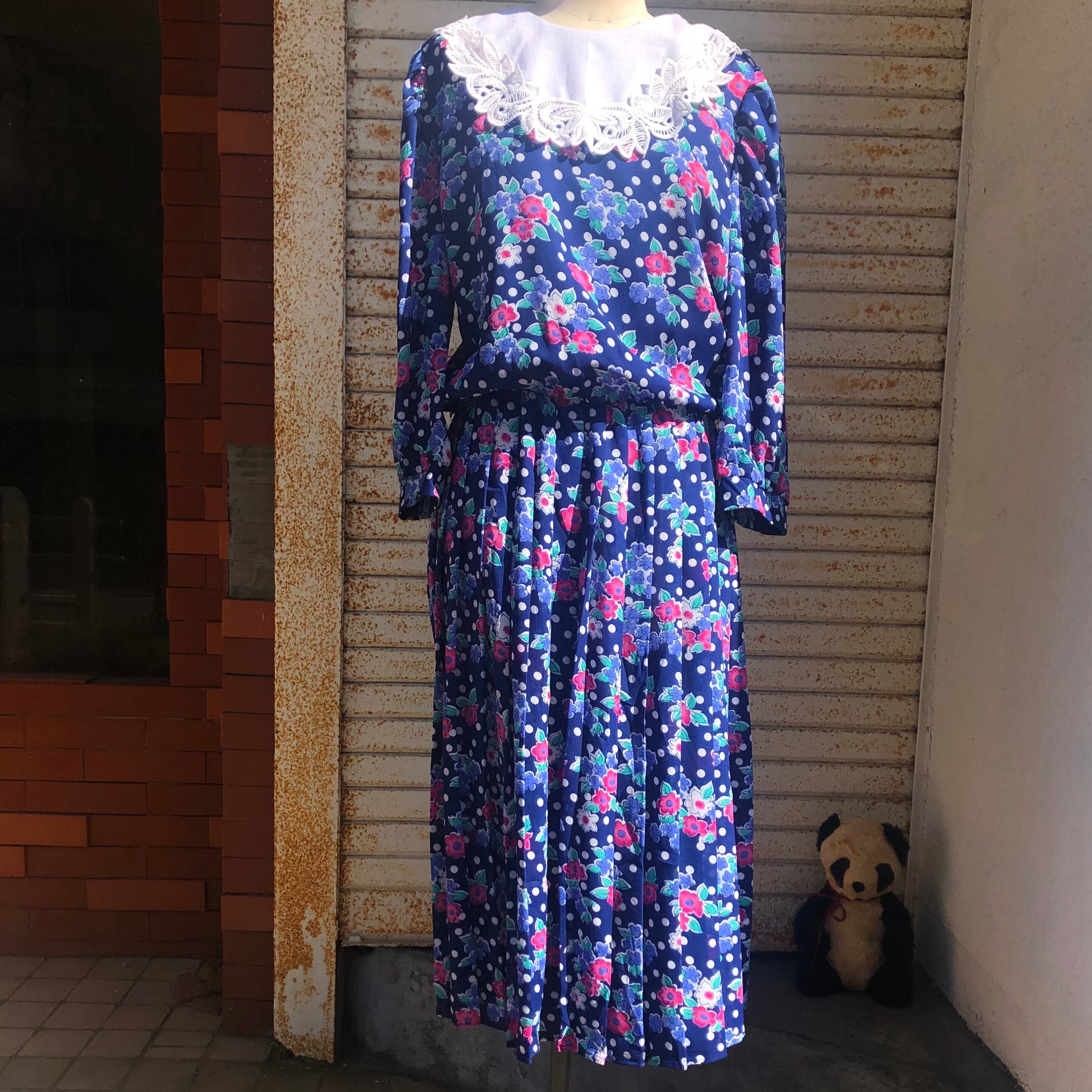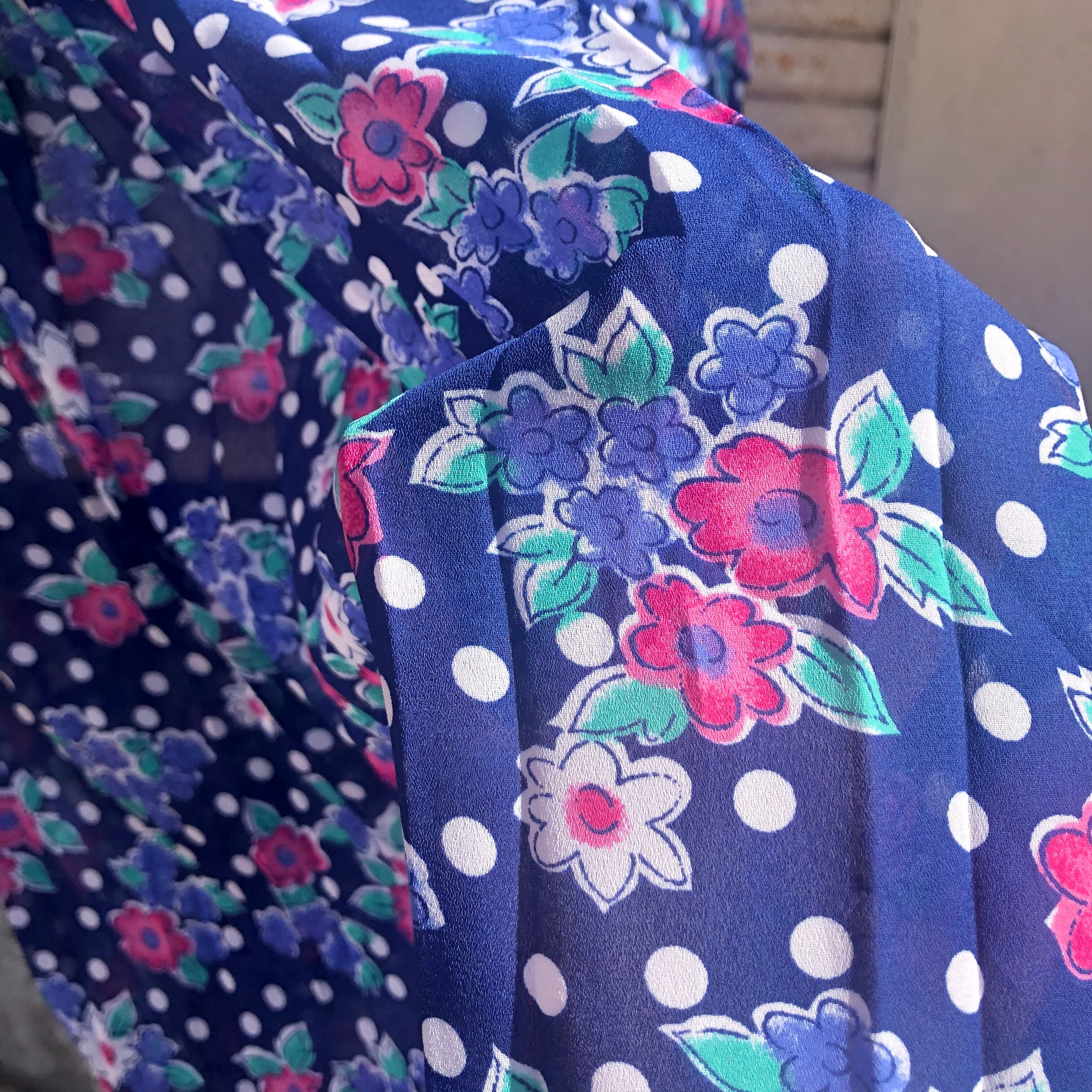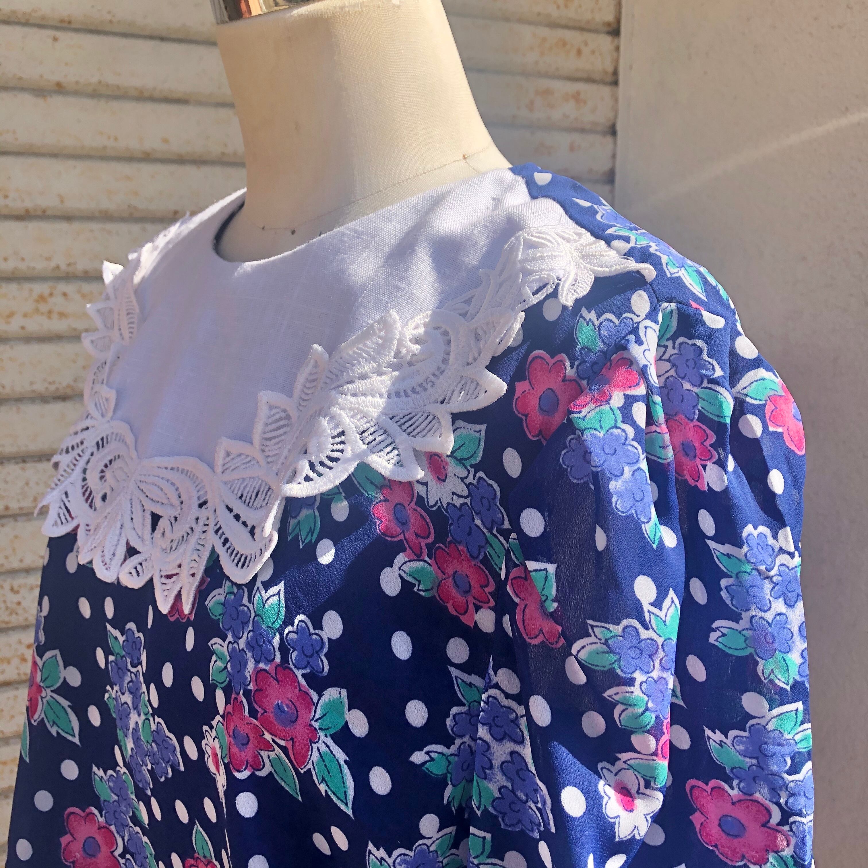 ドッド柄と花柄がミックスされた花柄ワンピースです。