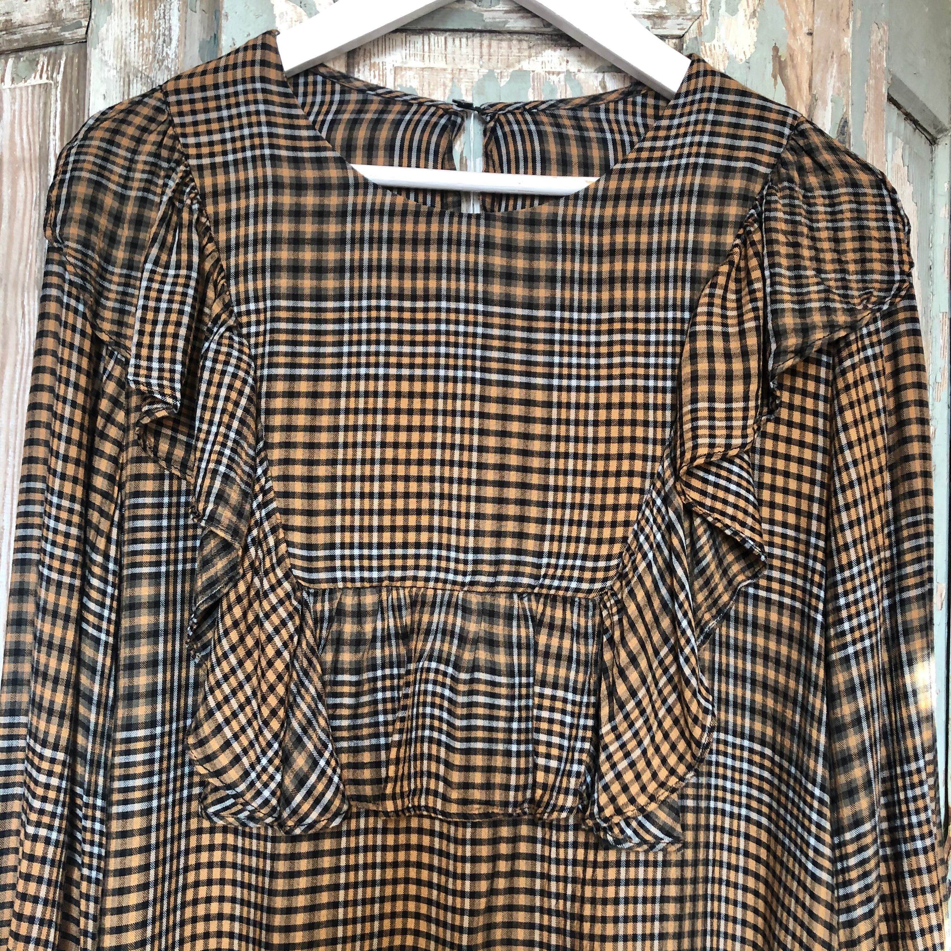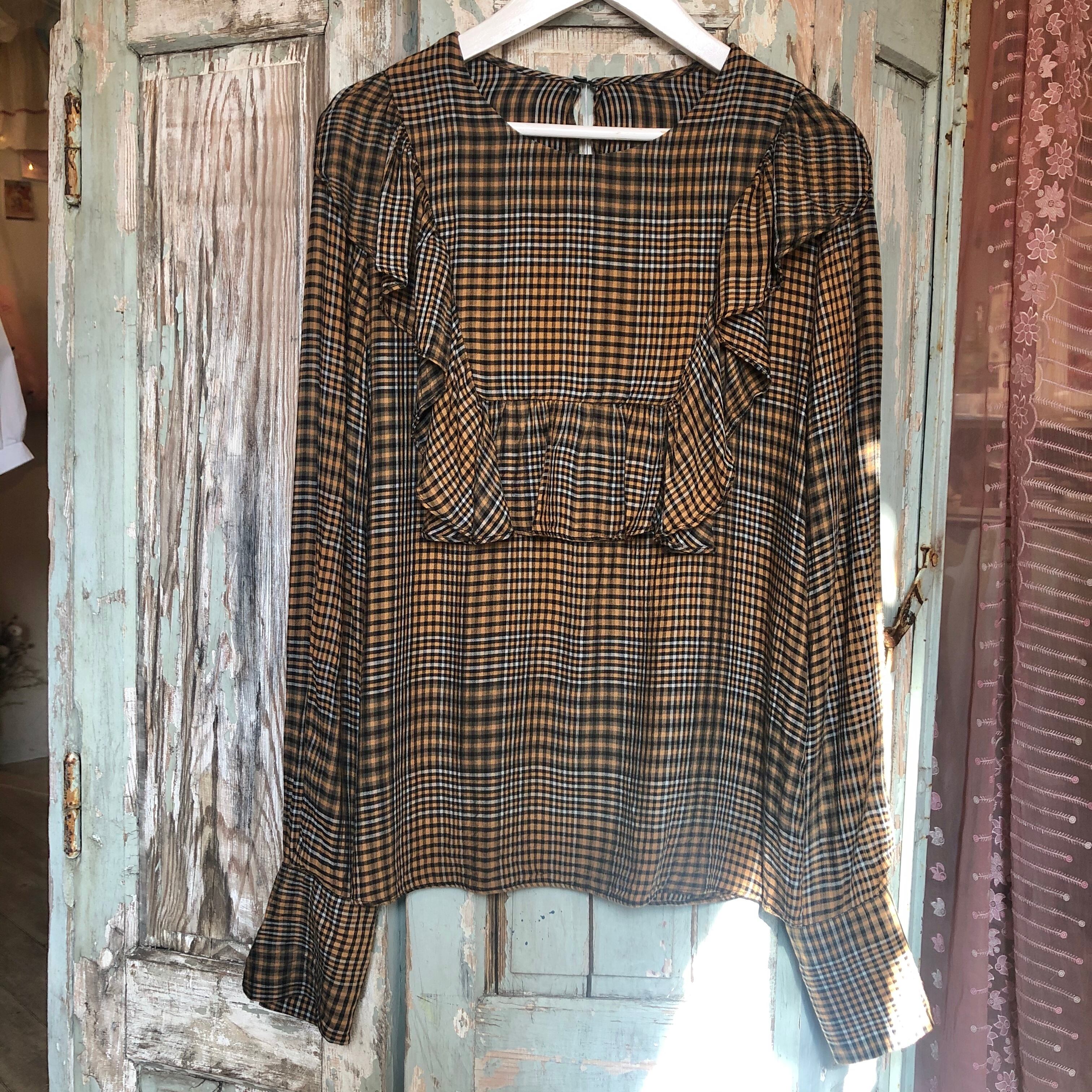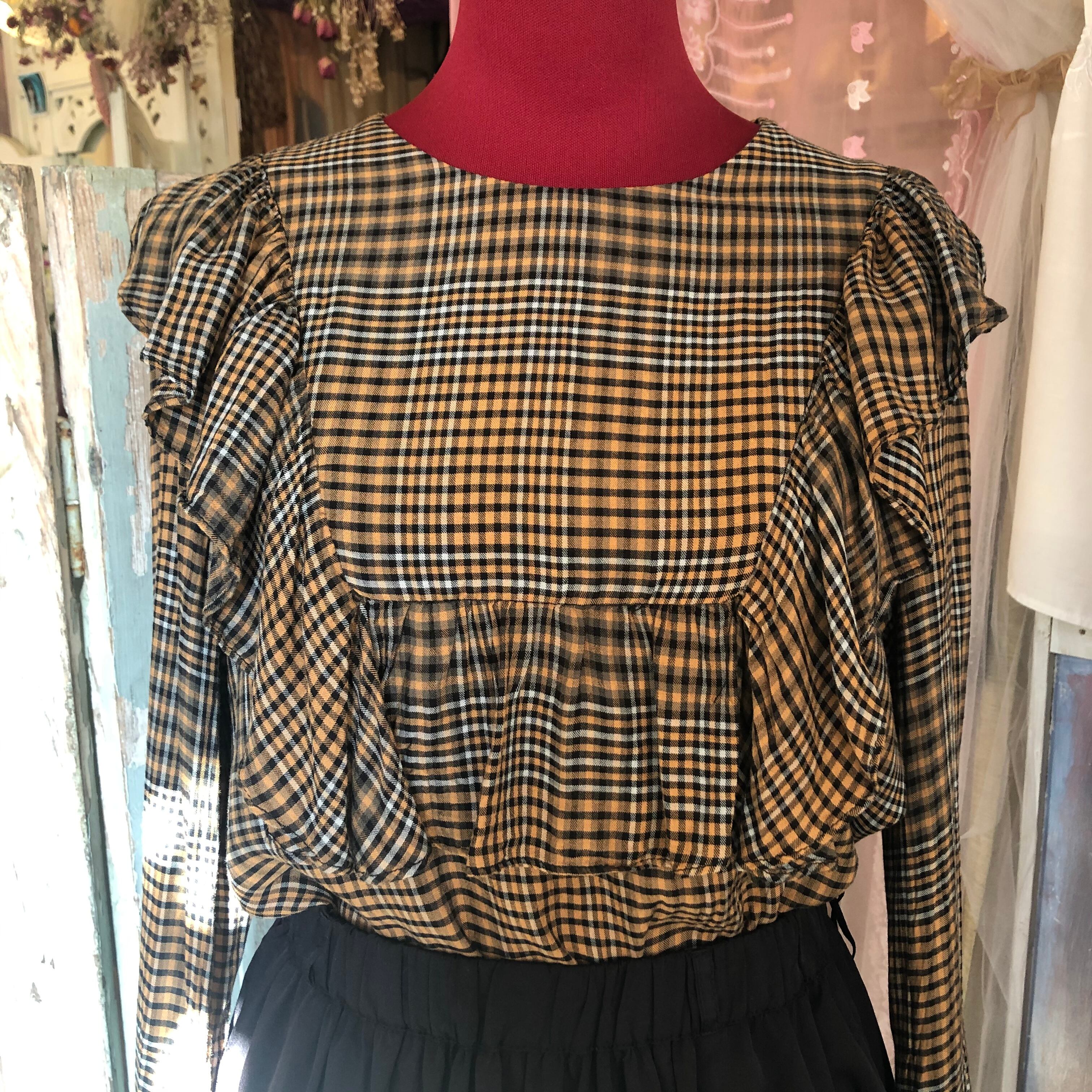 肩フリルが可愛いブラウンベースのチェックブラウスです。