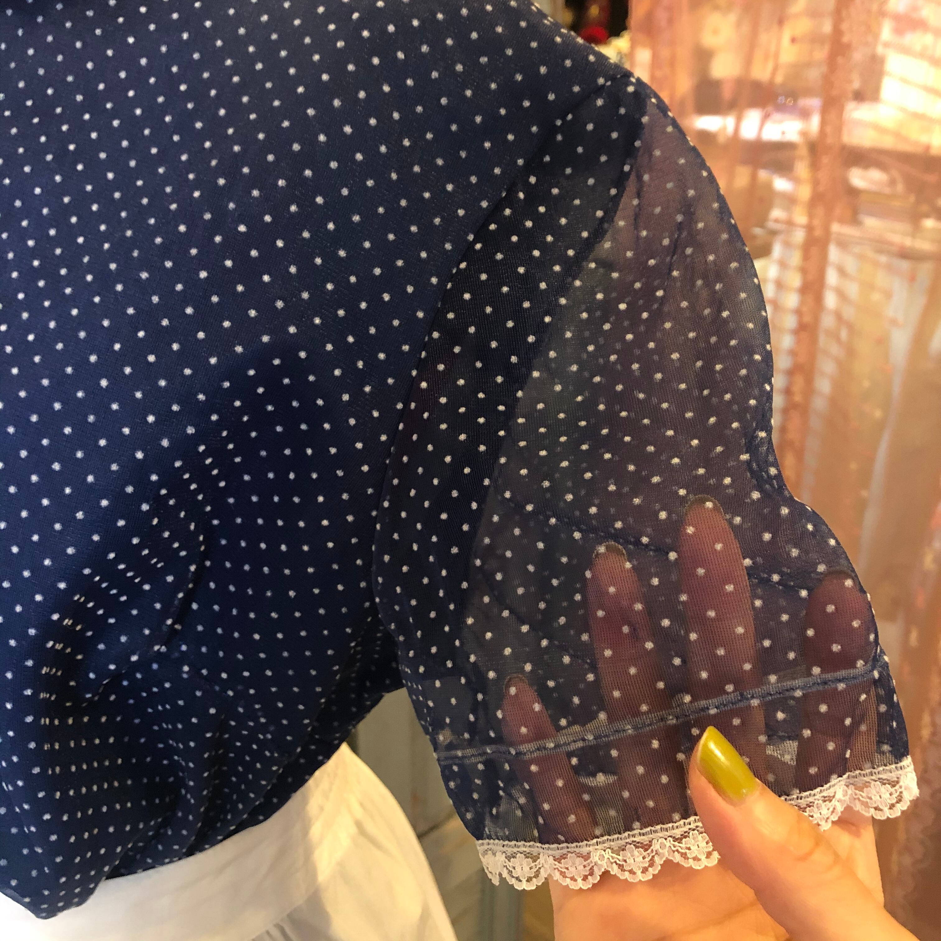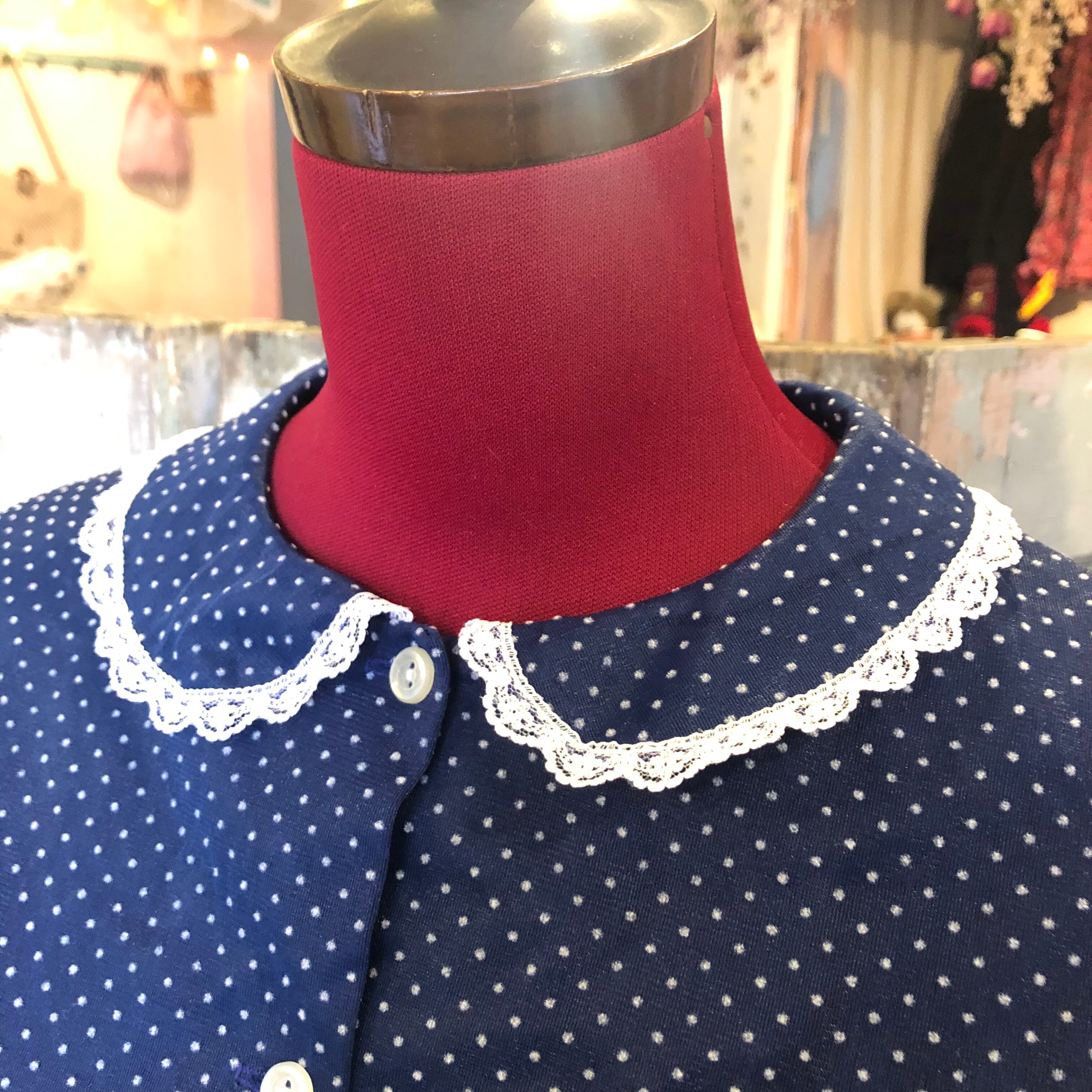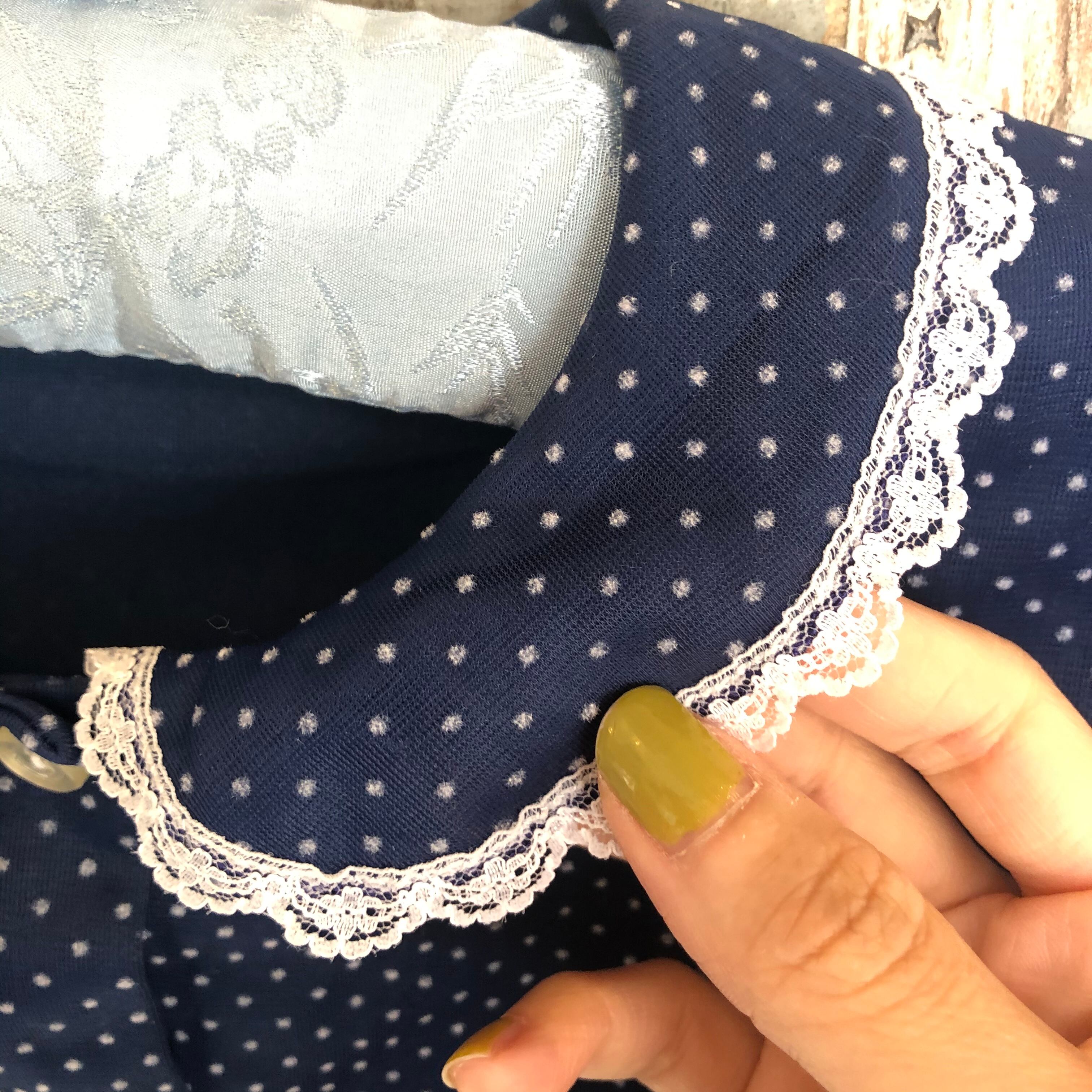 お色はネイビーでフロッキープリントのピンドットや小さな襟のフリルがどこか懐かしく愛らしいお品 。
