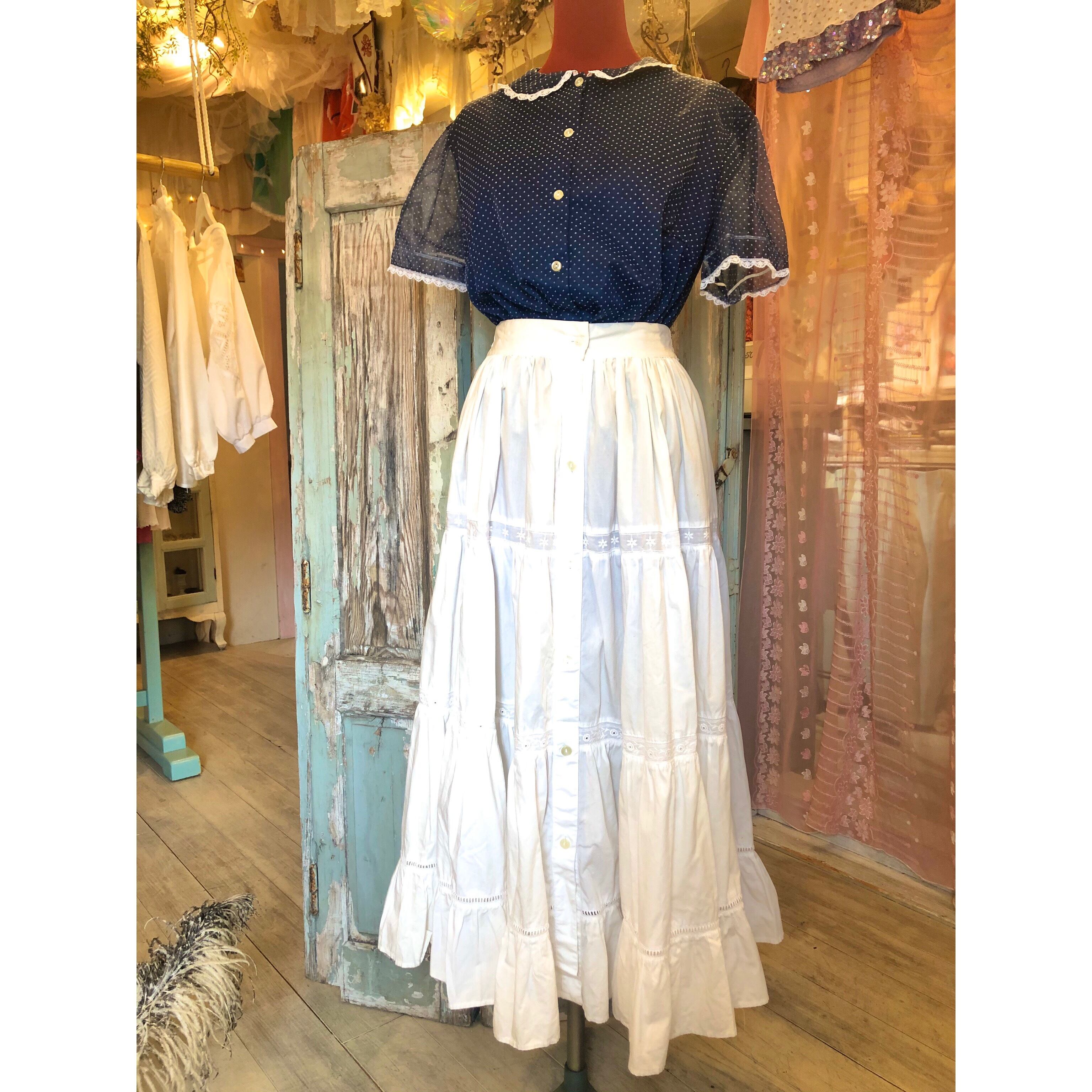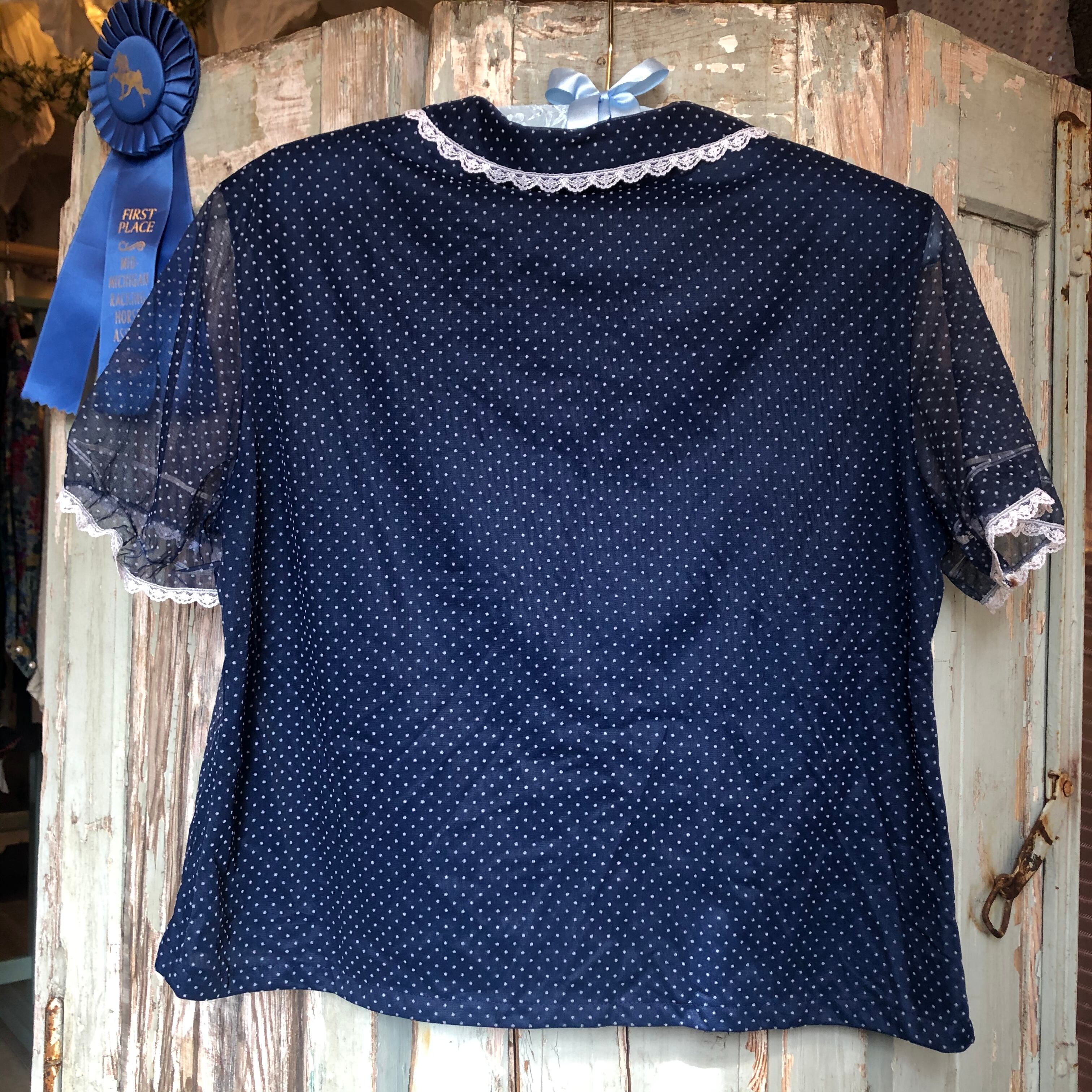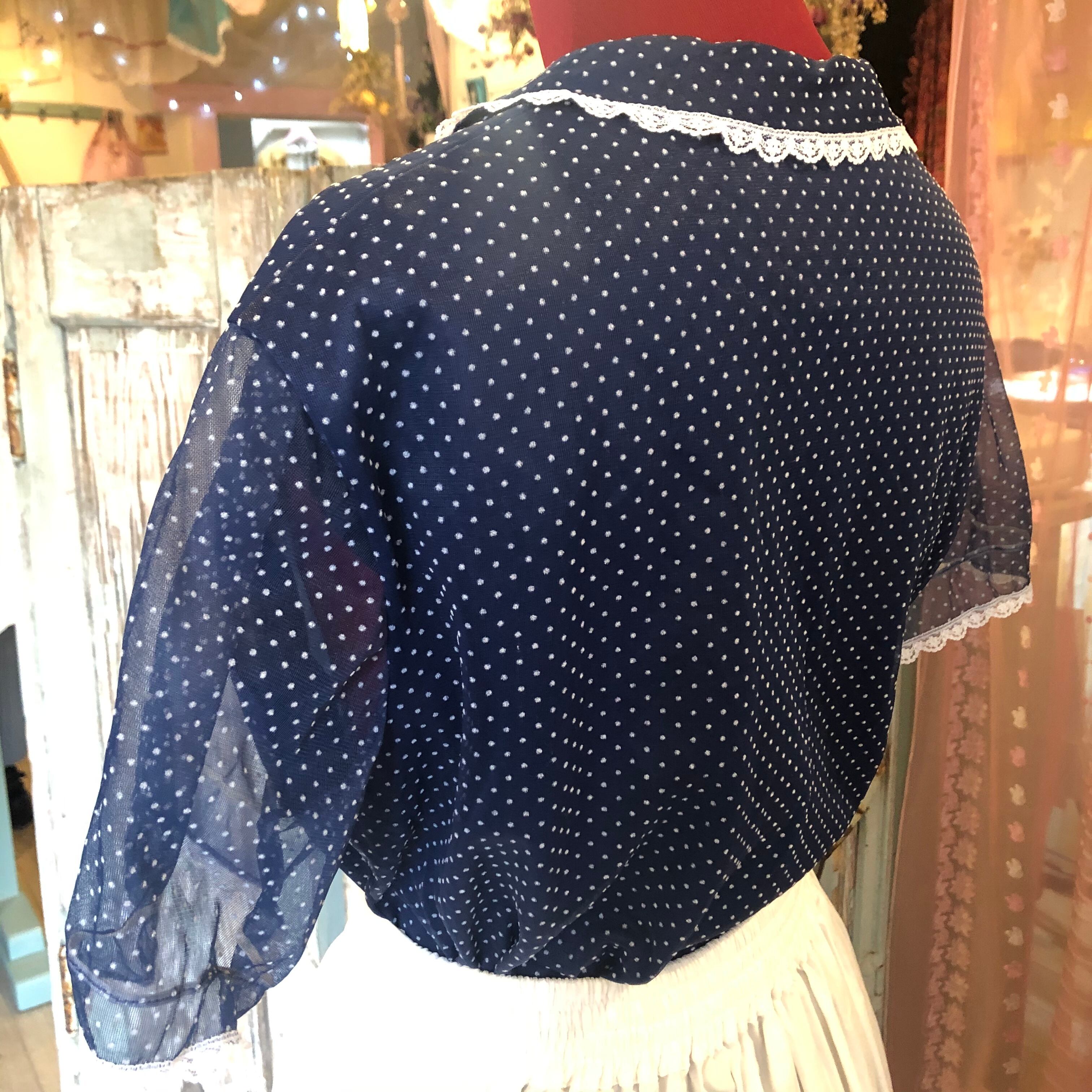 お色はネイビーでフロッキープリントのピンドットや小さな襟のフリルがどこか懐かしく愛らしいお品 。