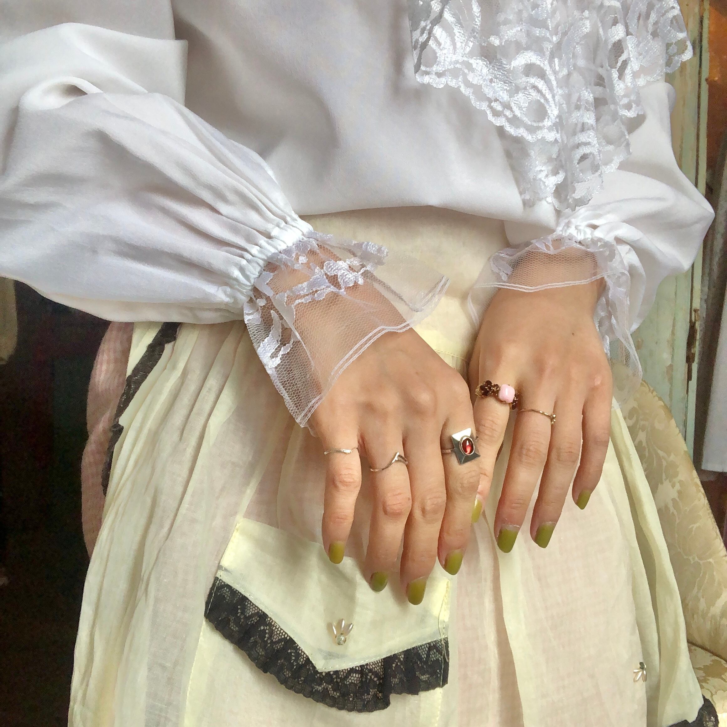 手の甲にまでかかるソフトチュールの袖口にうっとりします。