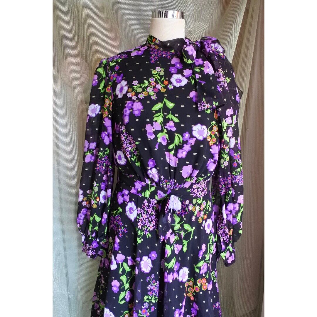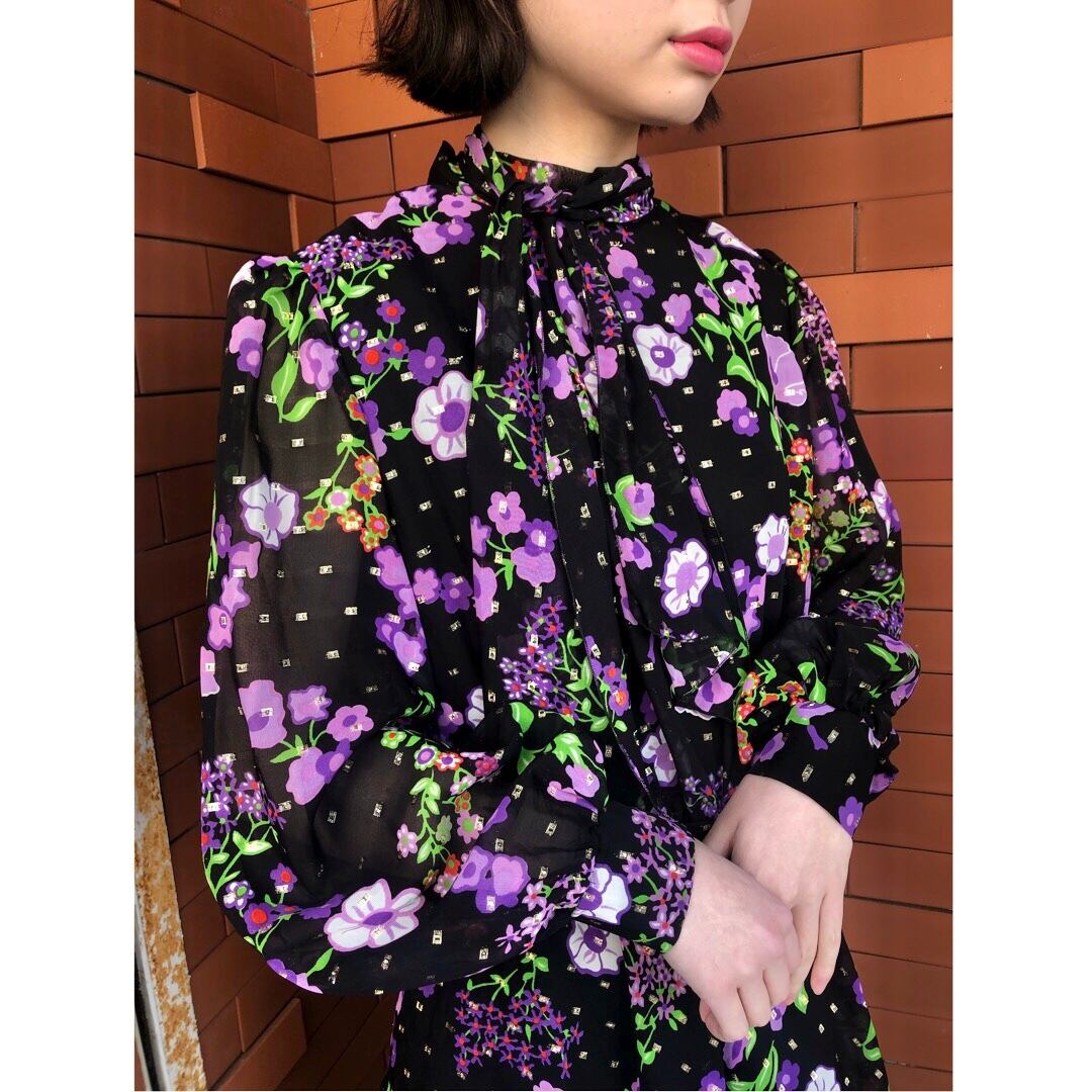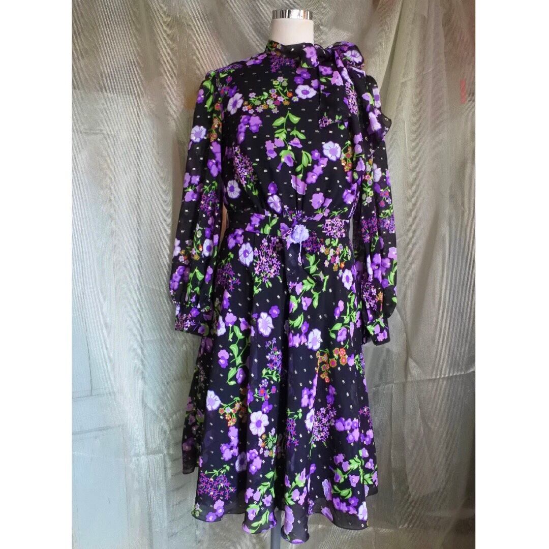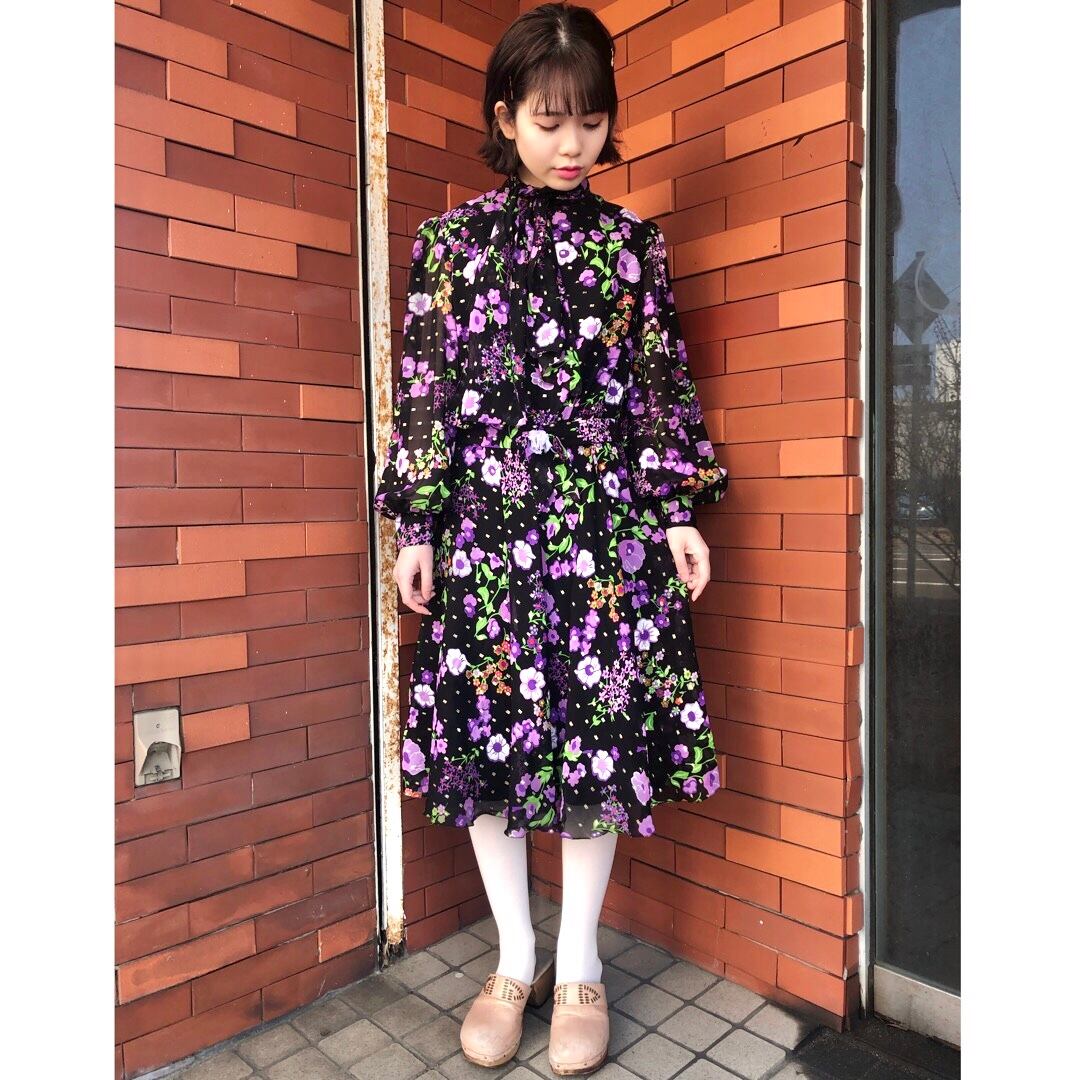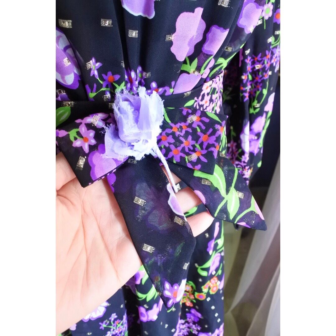 ブラックベースに紫のお花柄が目を惹くワンピースドレスです。