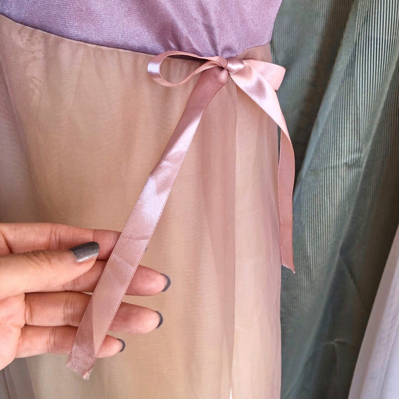 大胆で潔いスリットと、スリットの始まる位置についたかわいらしいリボンとのコントラストがお気に入りです。