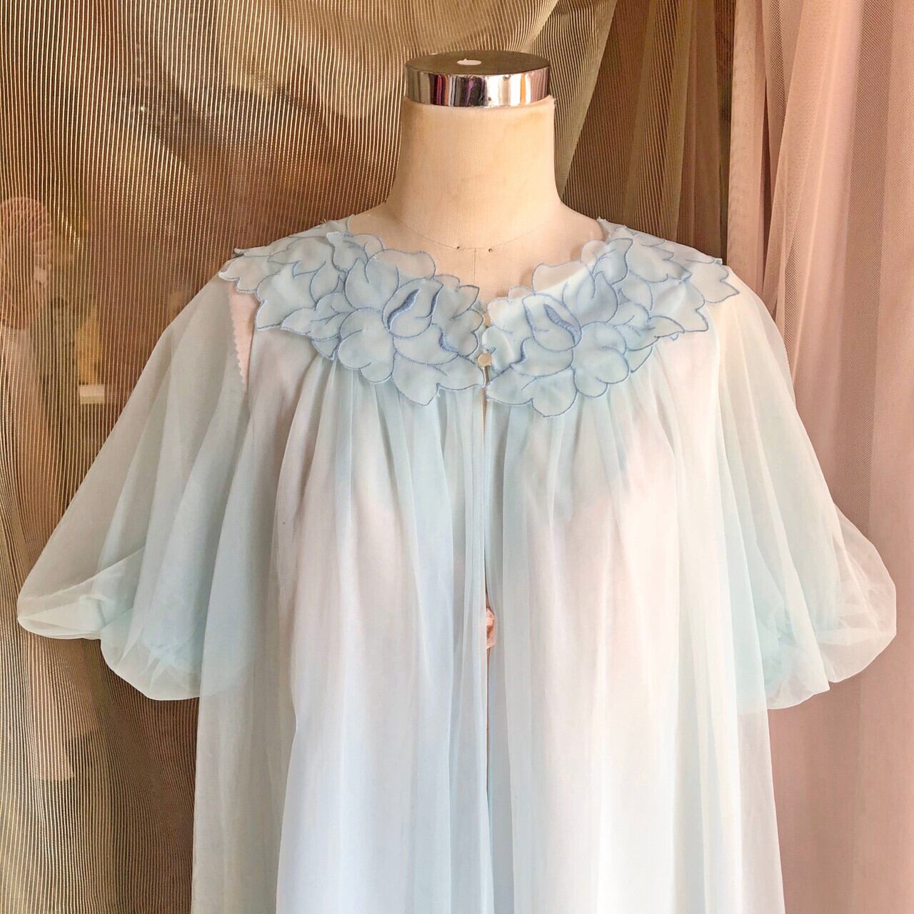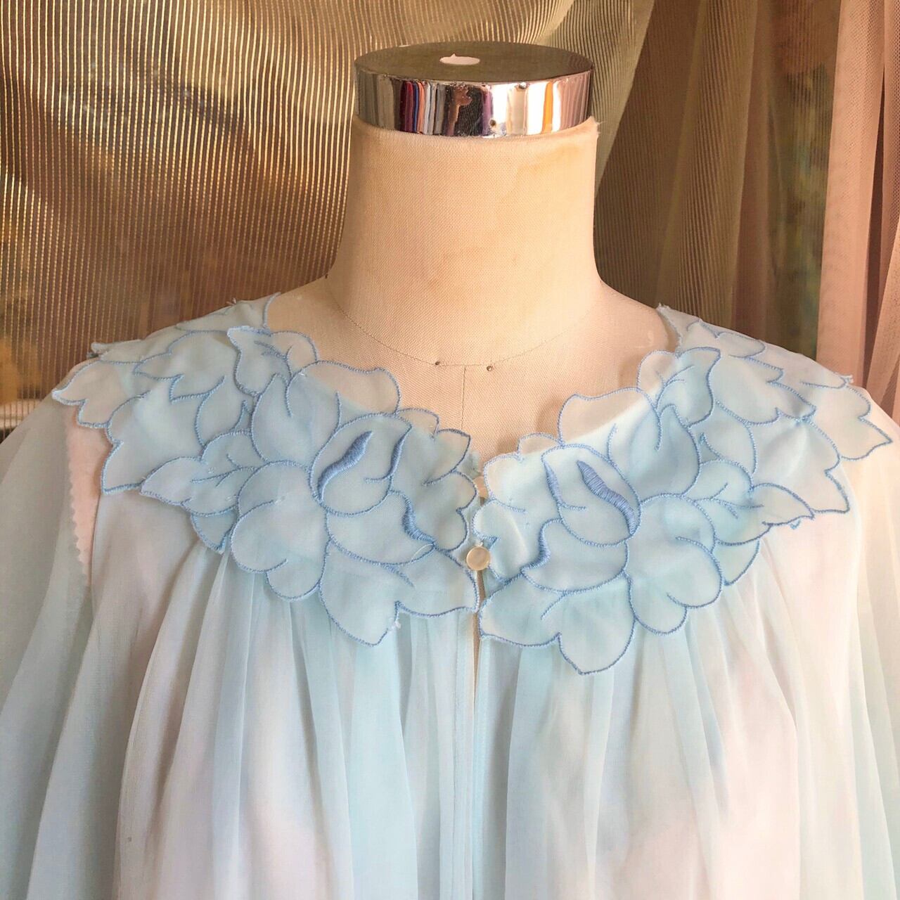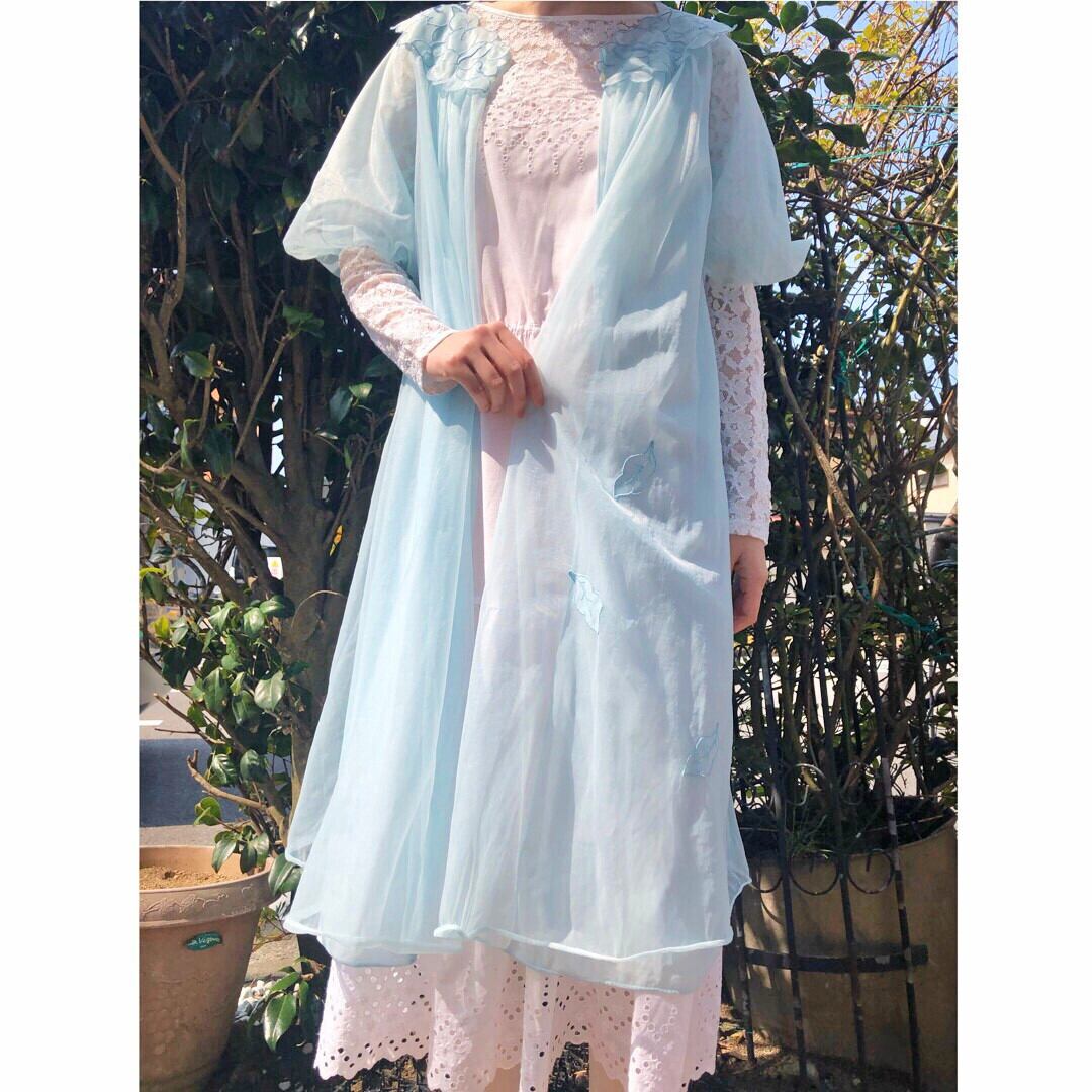 首回りに花びらがたくさんついたようなデザインの水色ガウン。