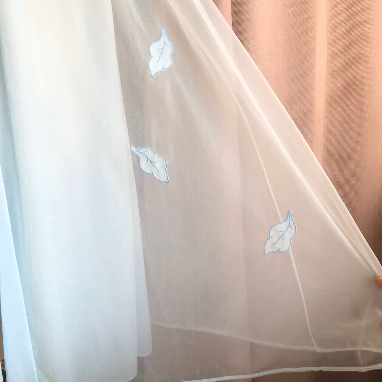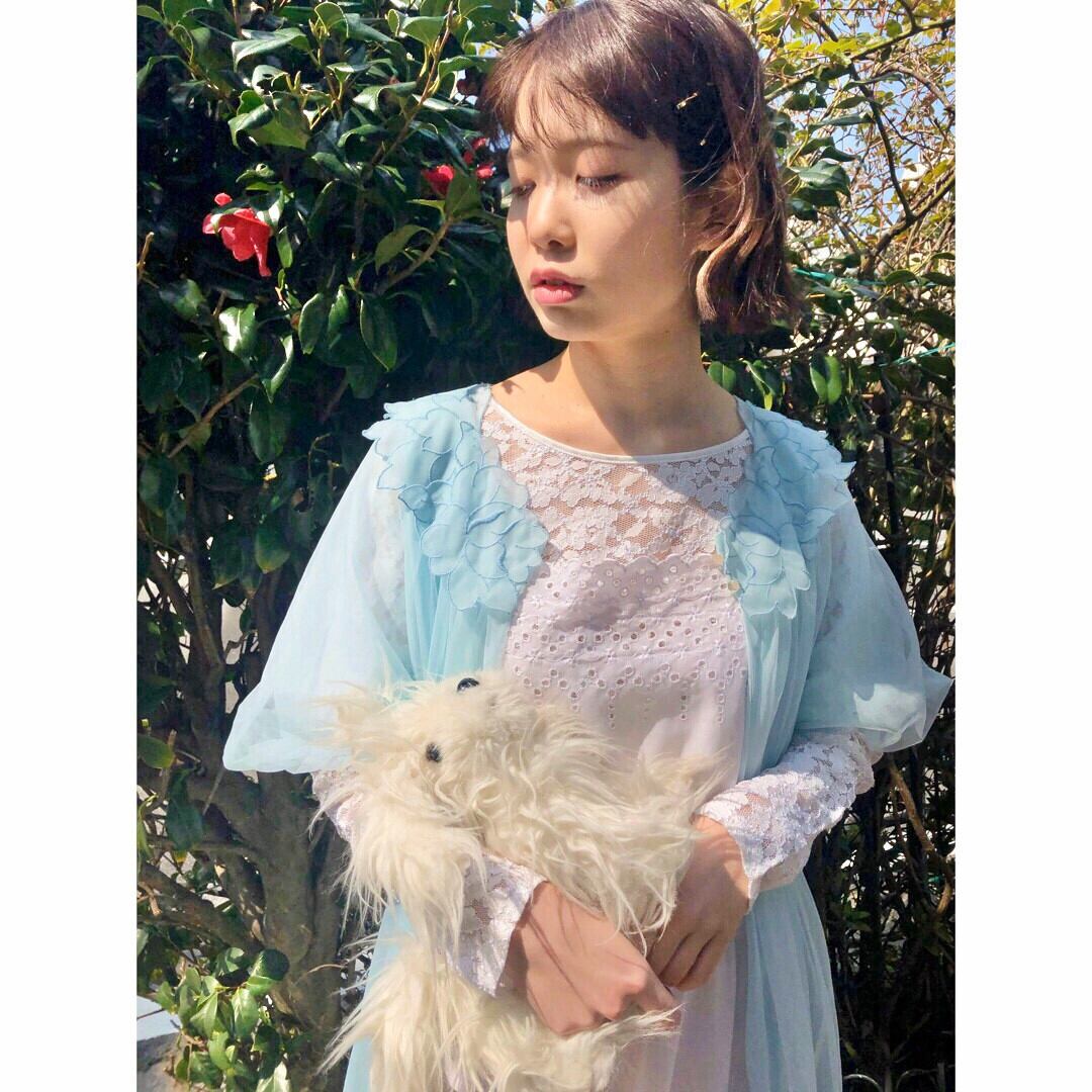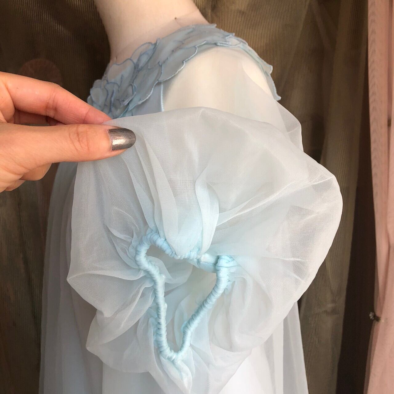 首回りに花びらがたくさんついたようなデザインの水色ガウン。
