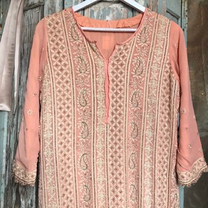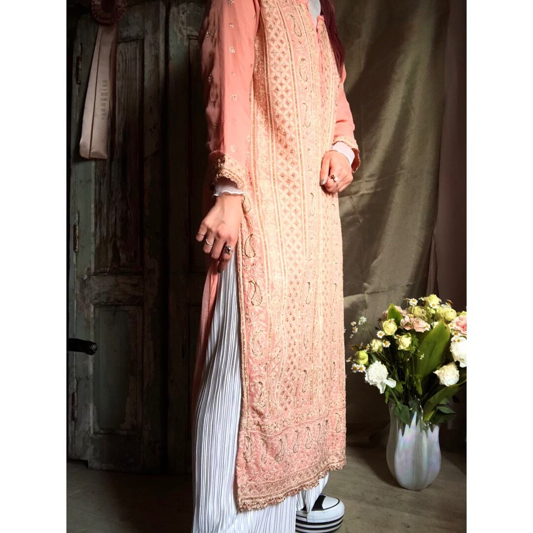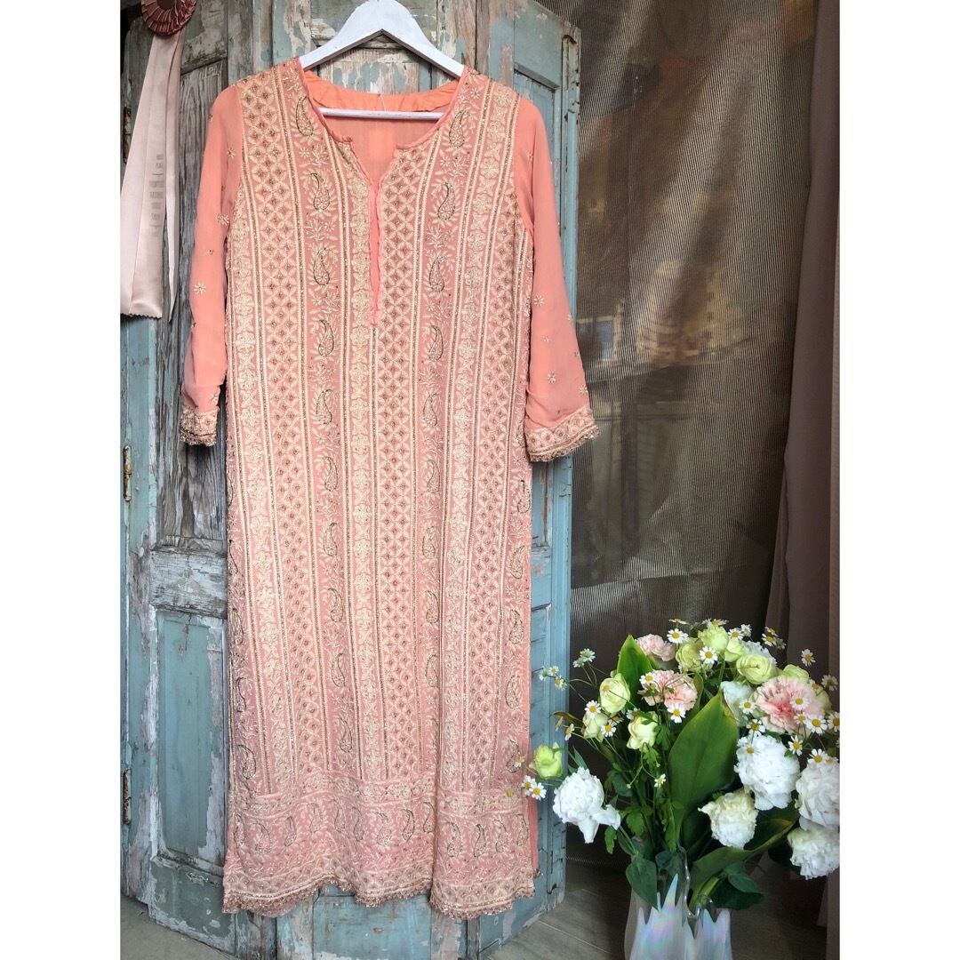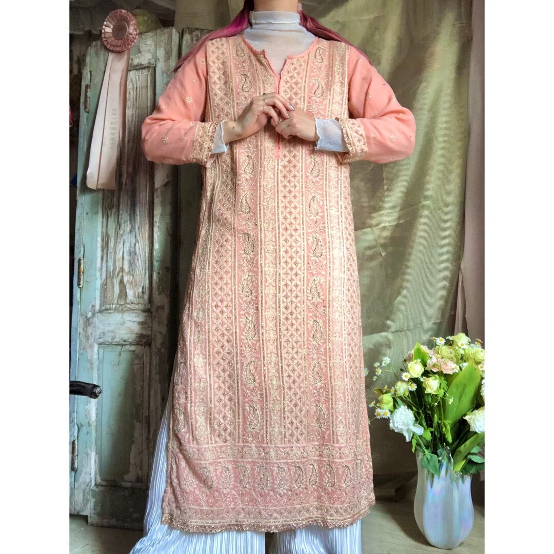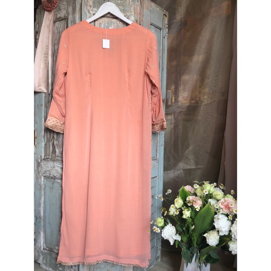 サーモンオレンジのエスニックワンピースです。