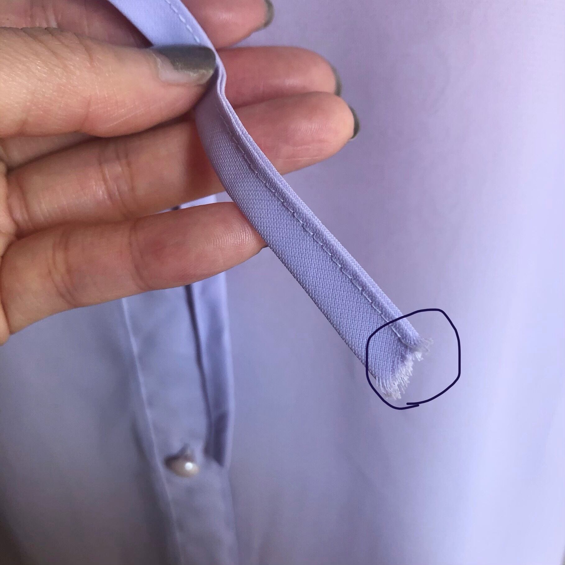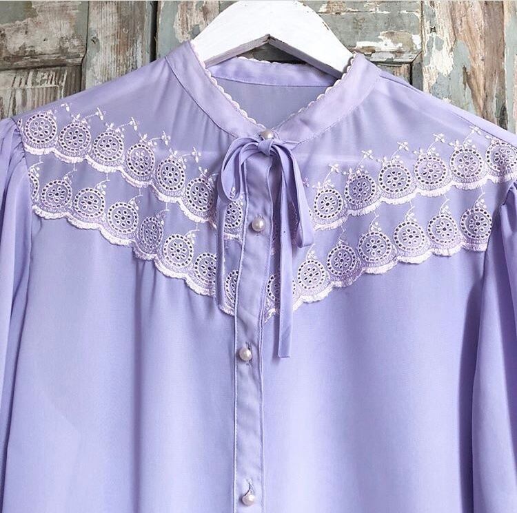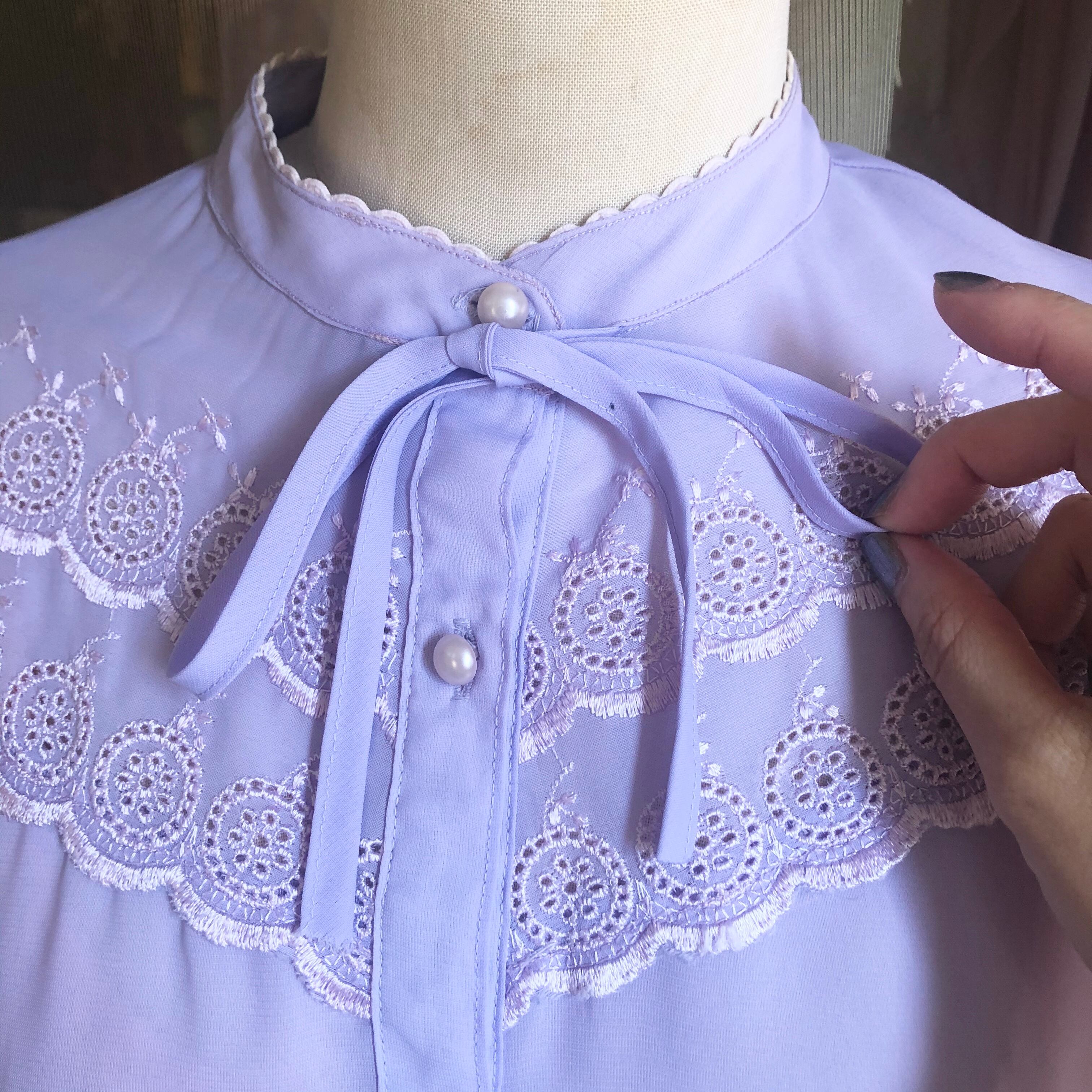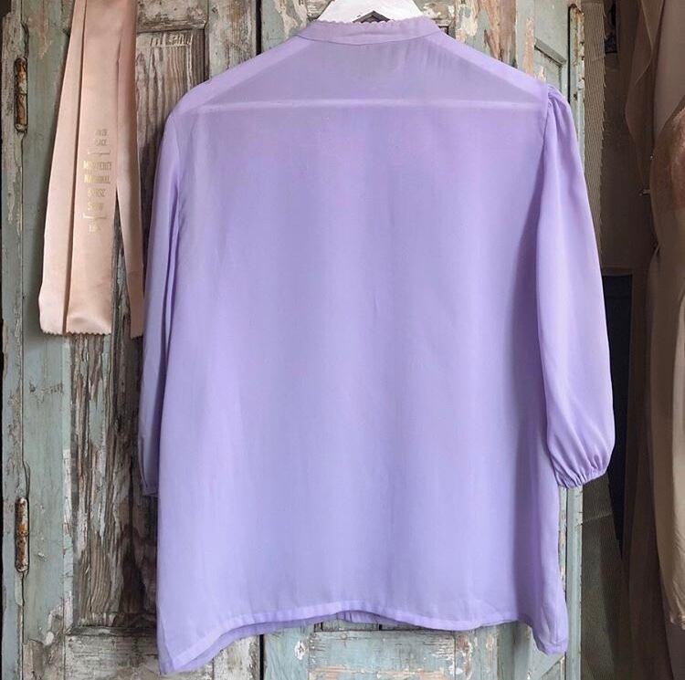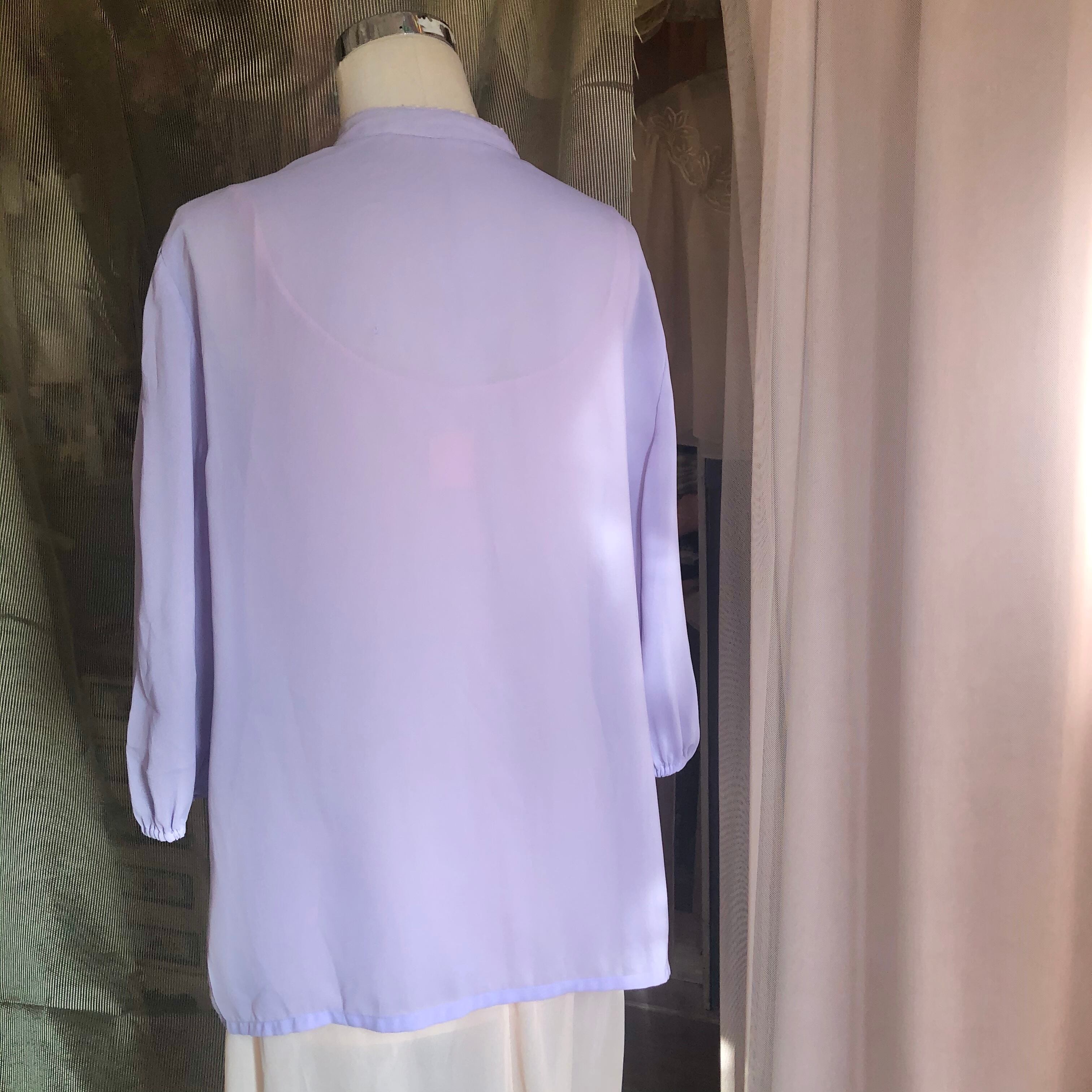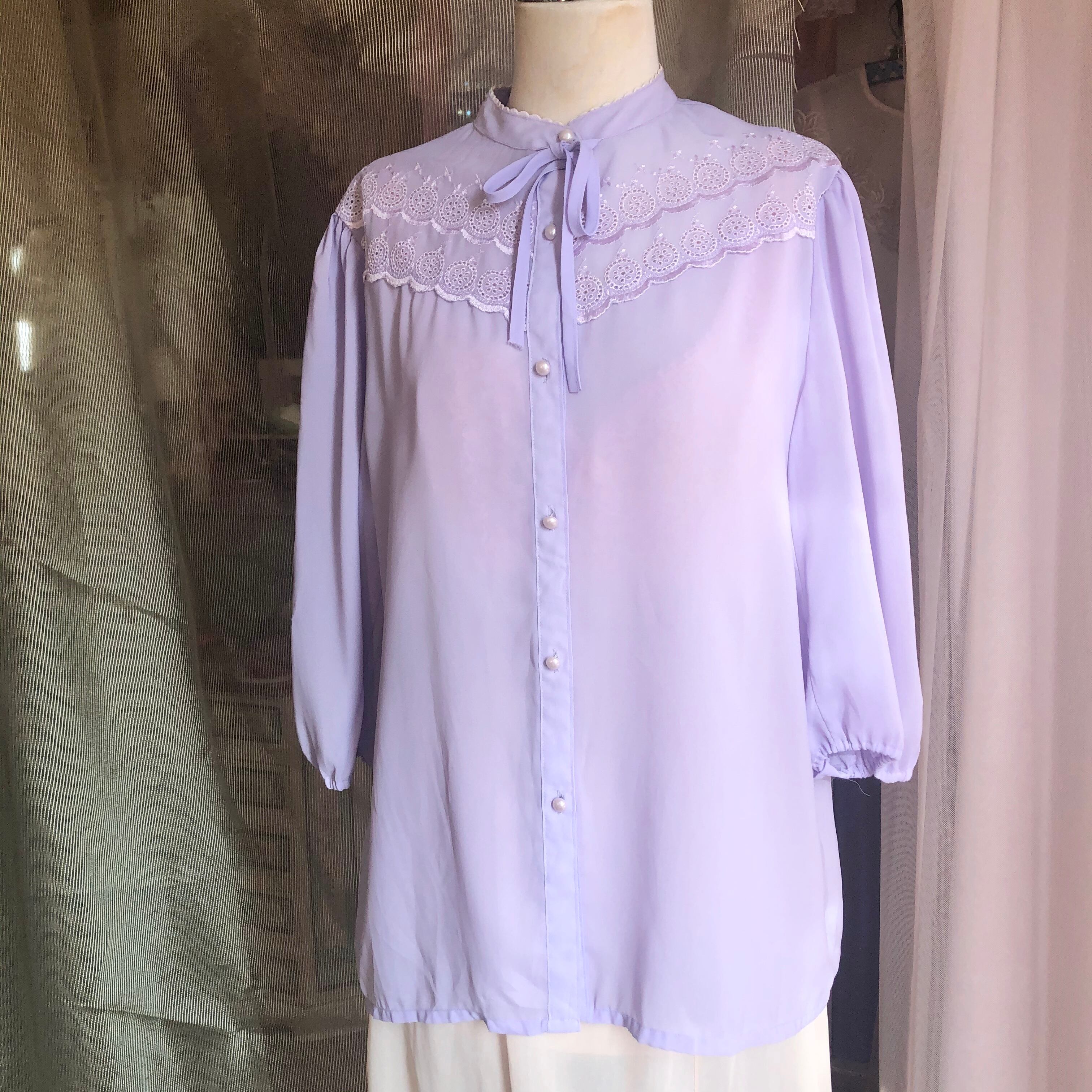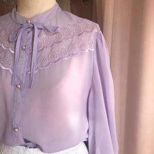 透け感があるラベンダーのリボンタイブラウス。