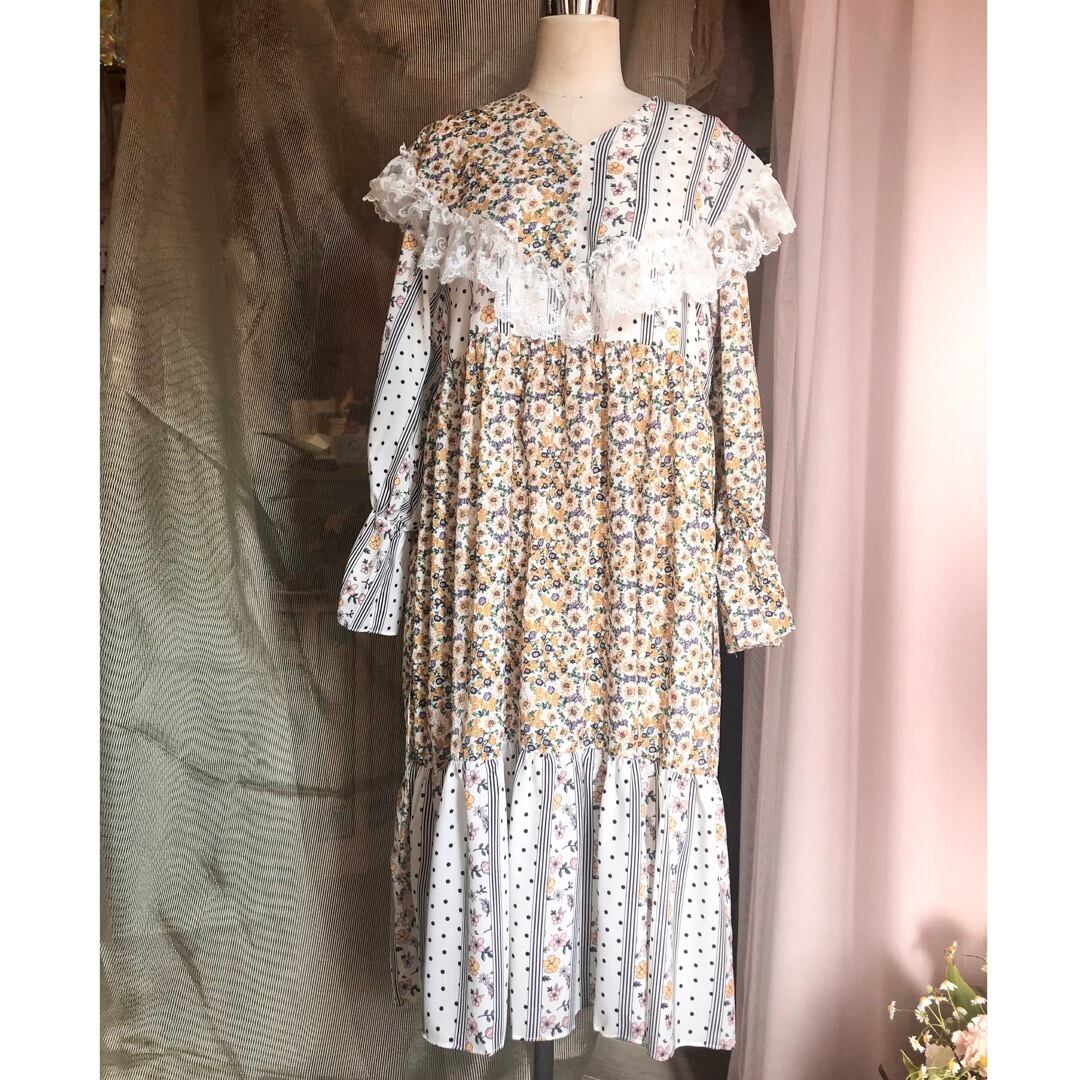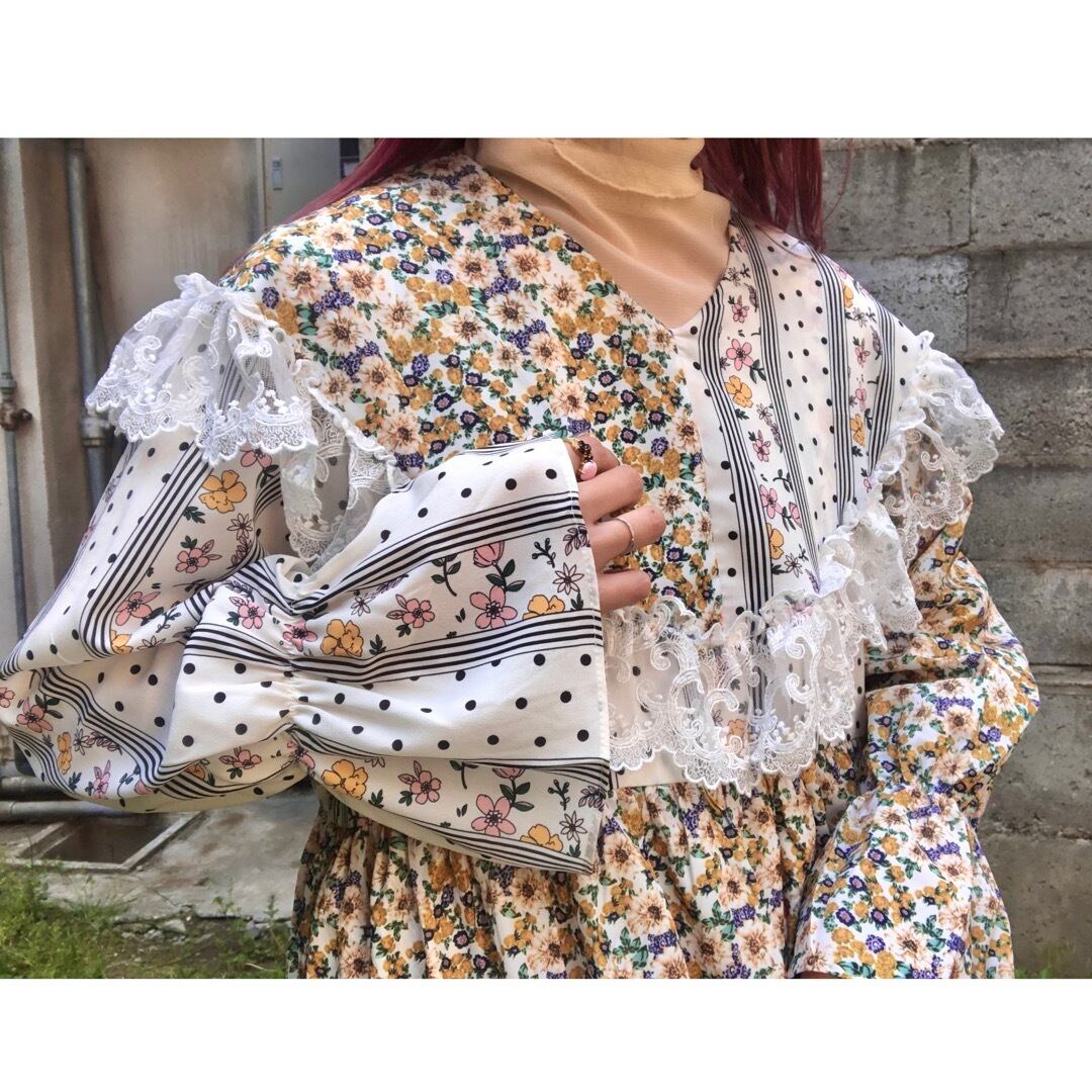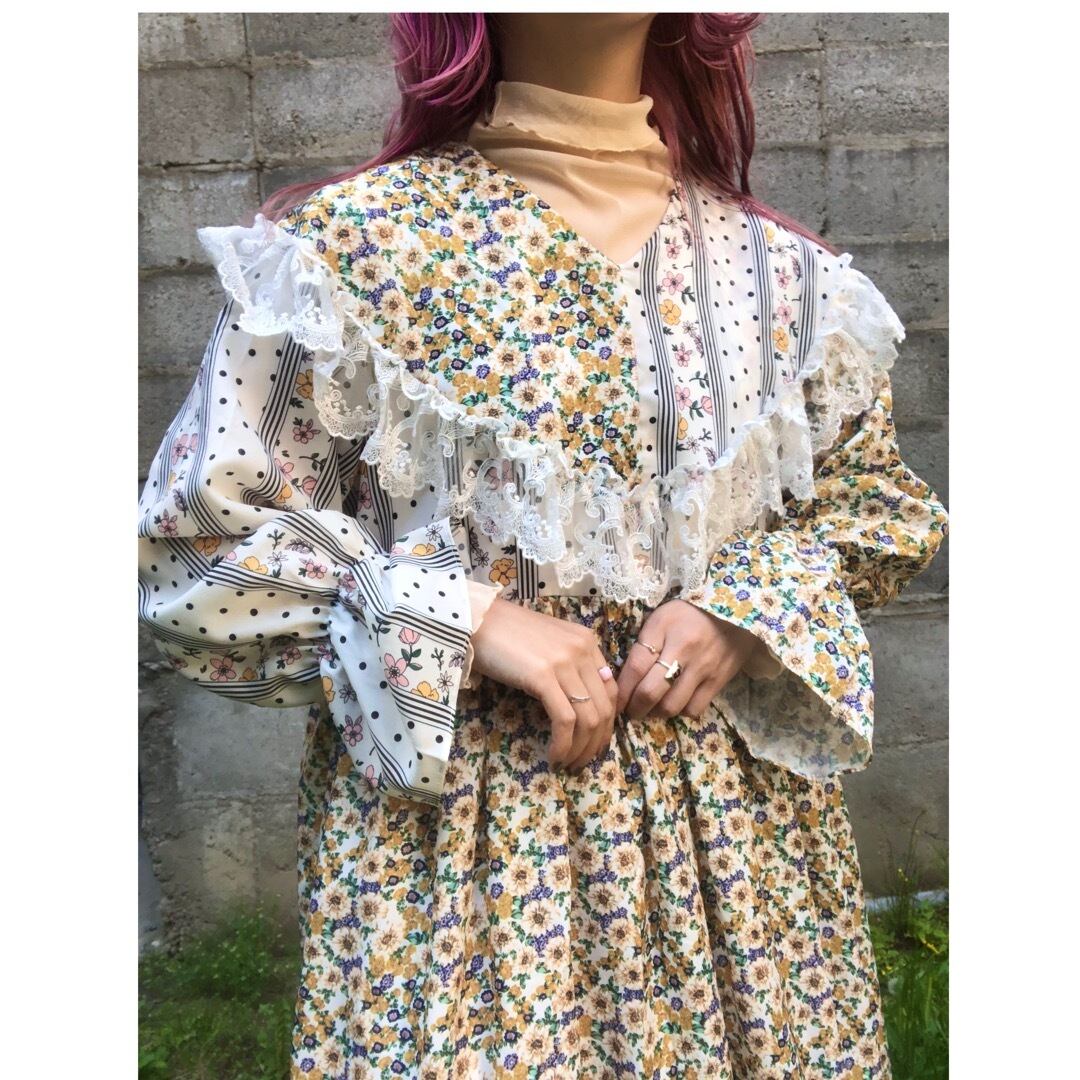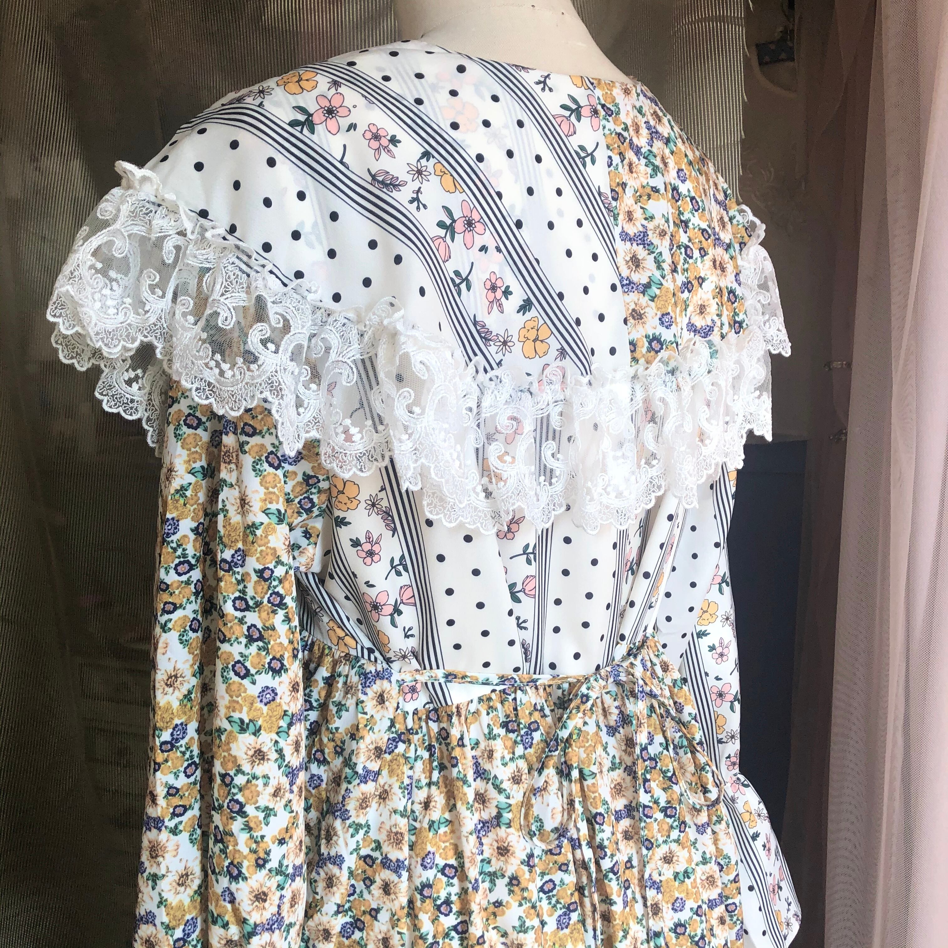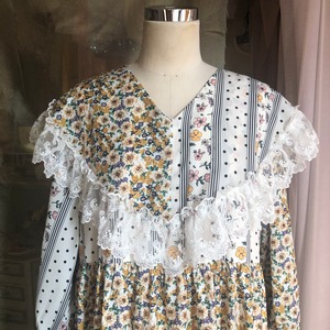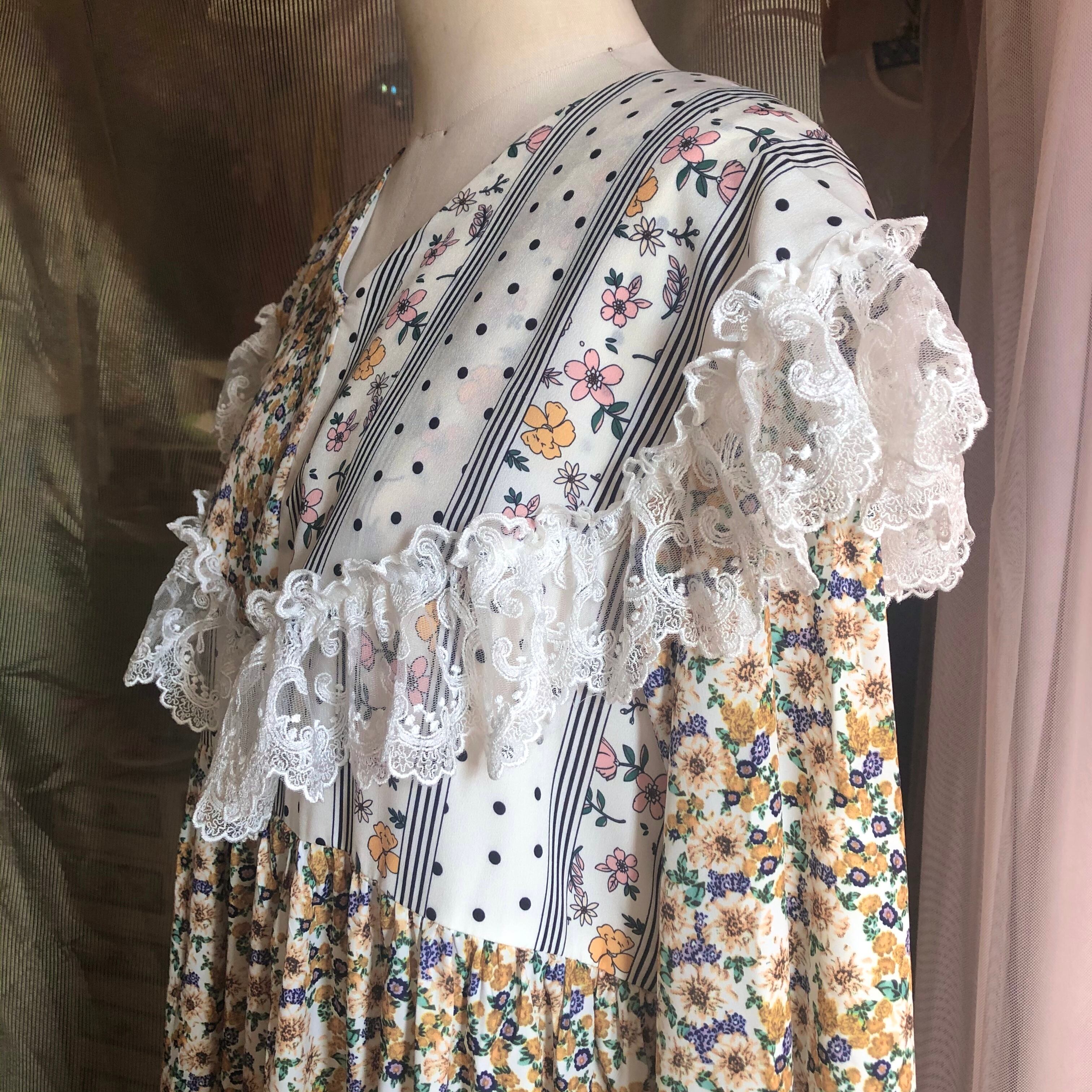ケープのようにぐるりと肩を覆う大きな襟と、異なる2つのテキスタイルが使用された花柄ワンピース .