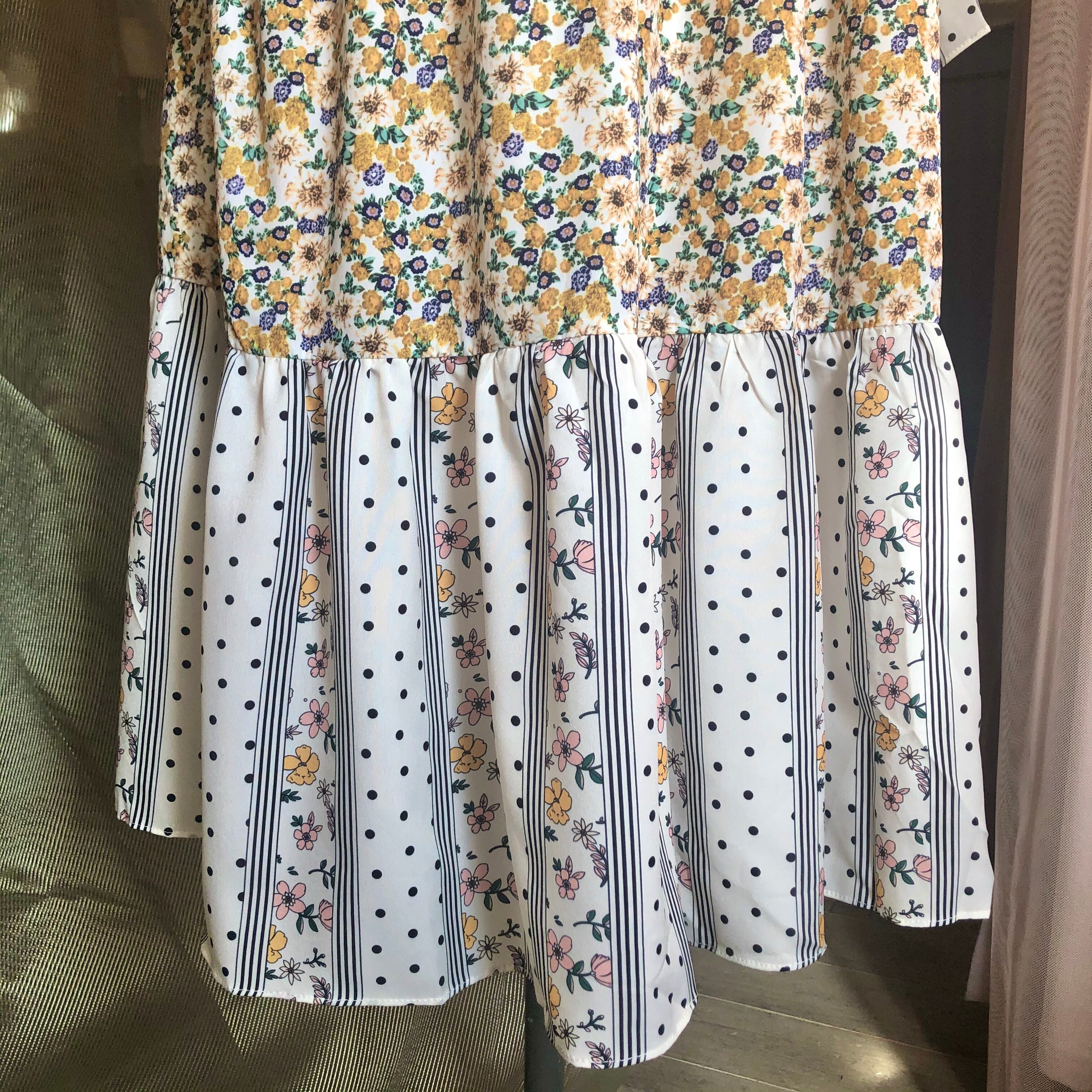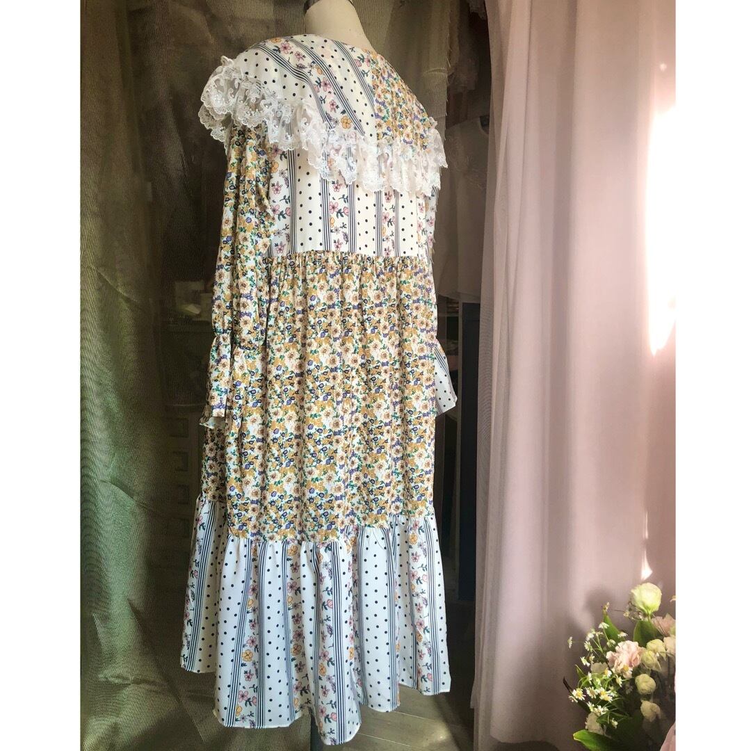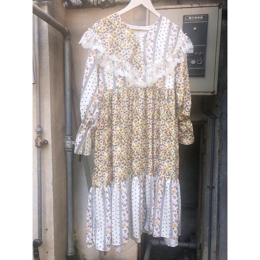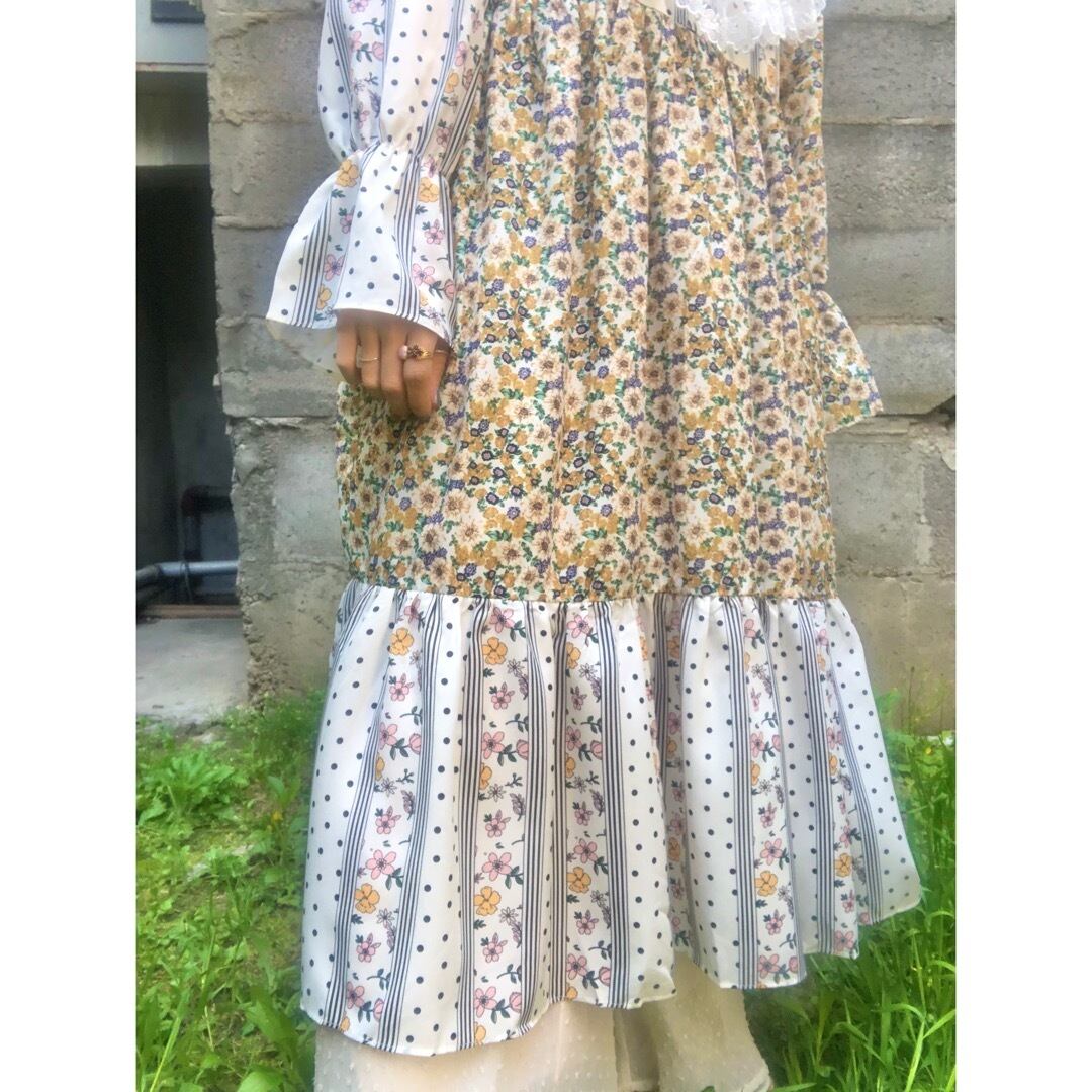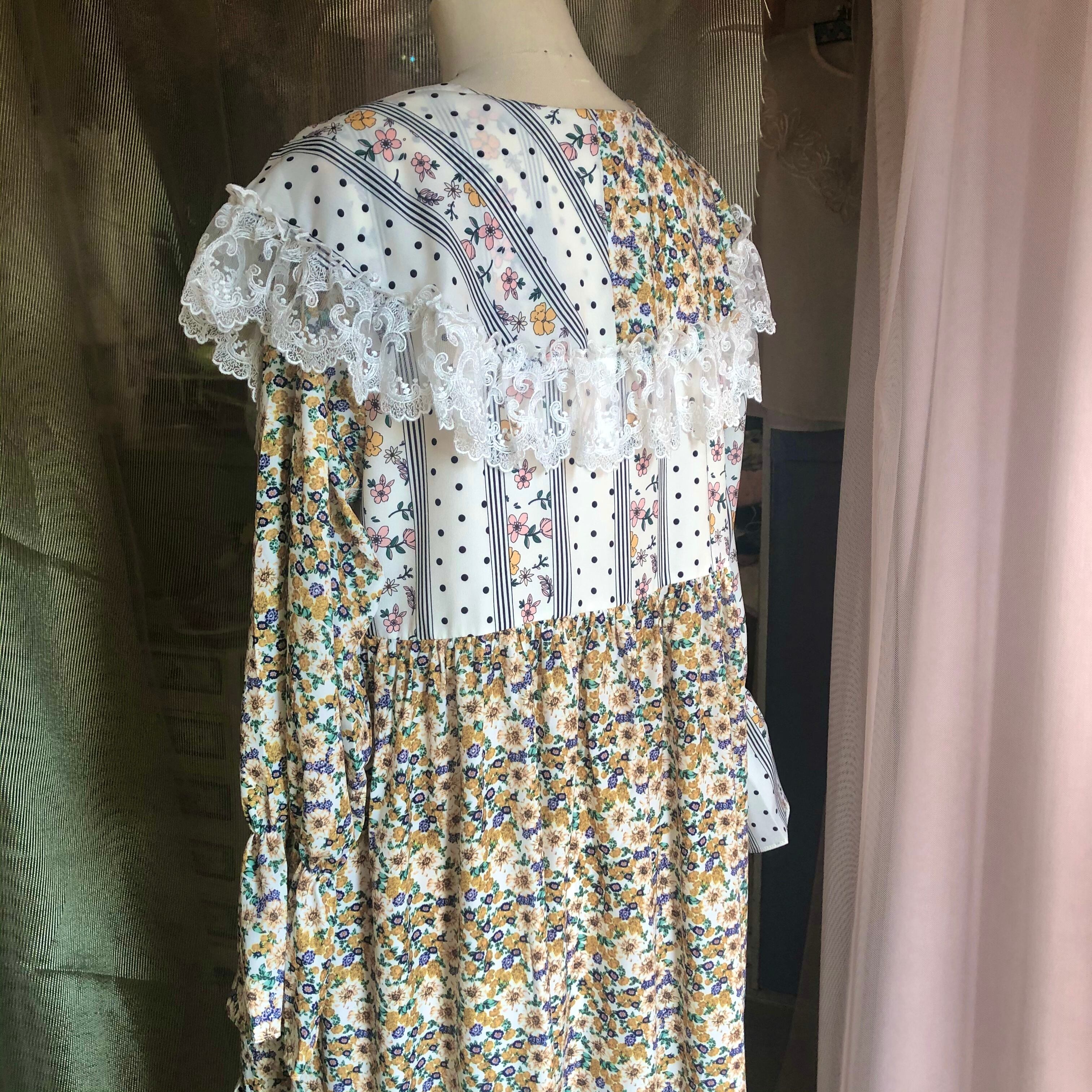 ケープのようにぐるりと肩を覆う大きな襟と、異なる2つのテキスタイルが使用された花柄ワンピース .