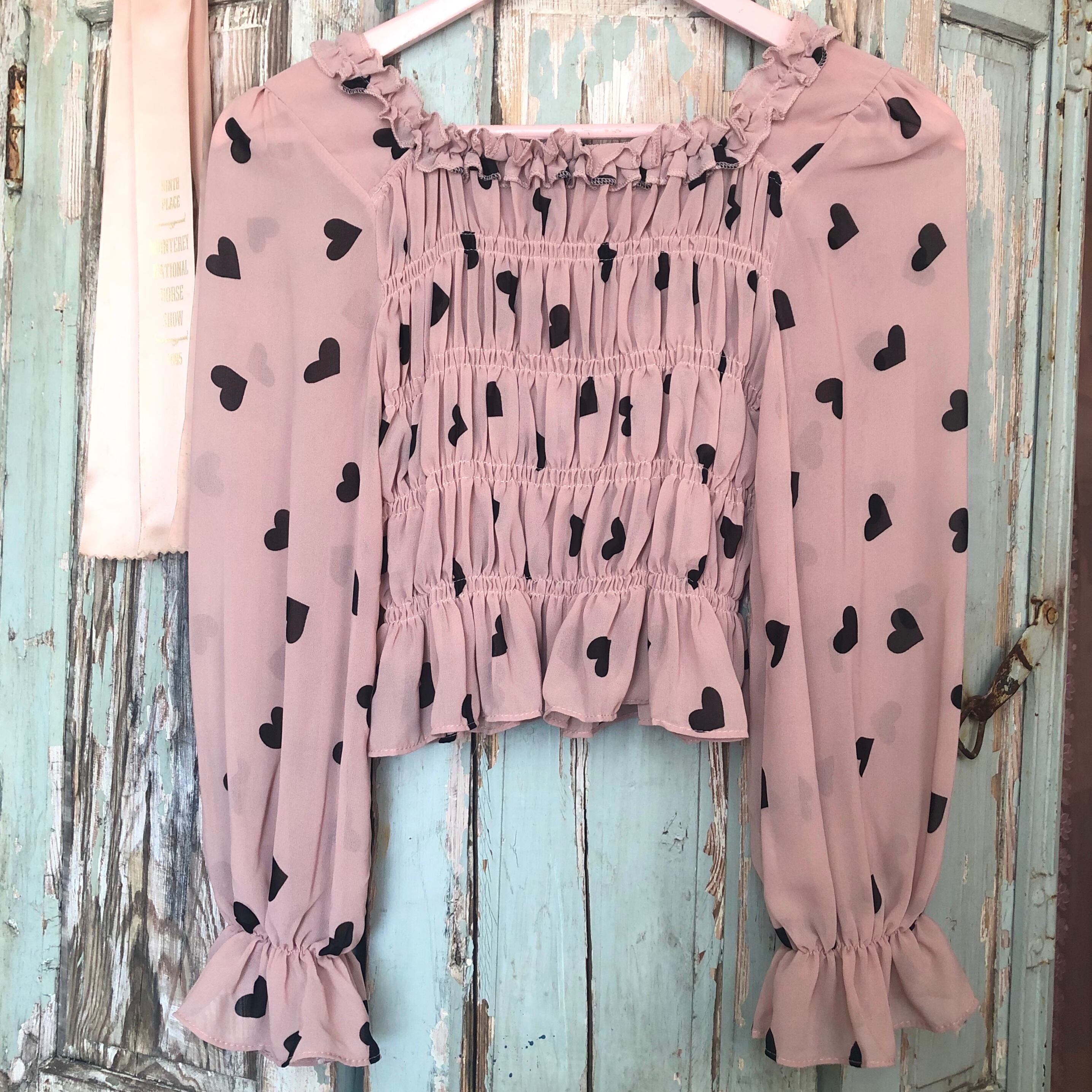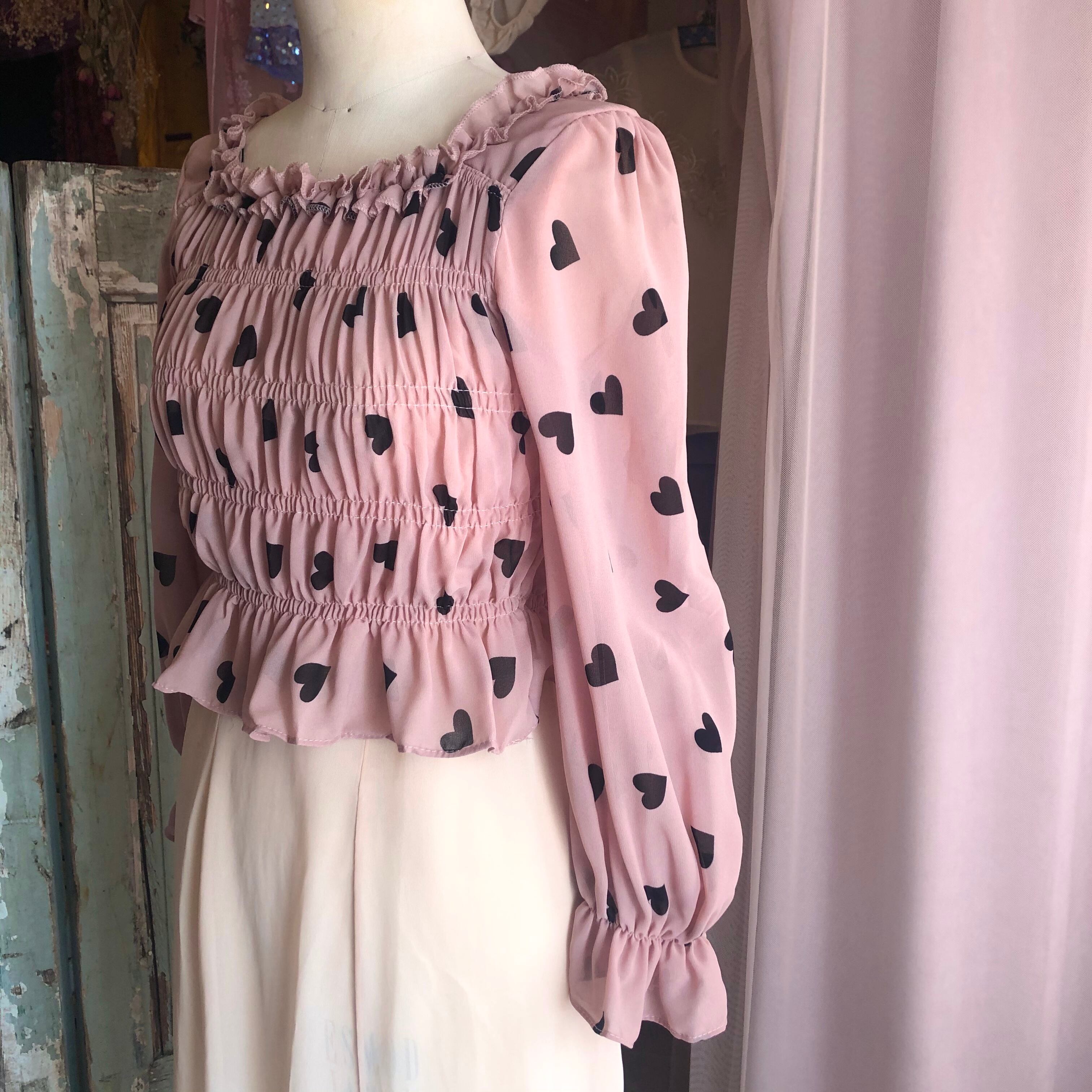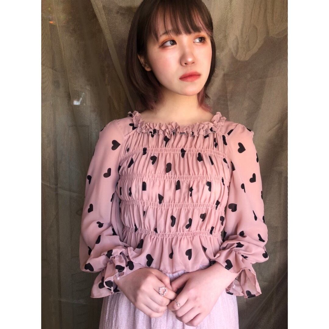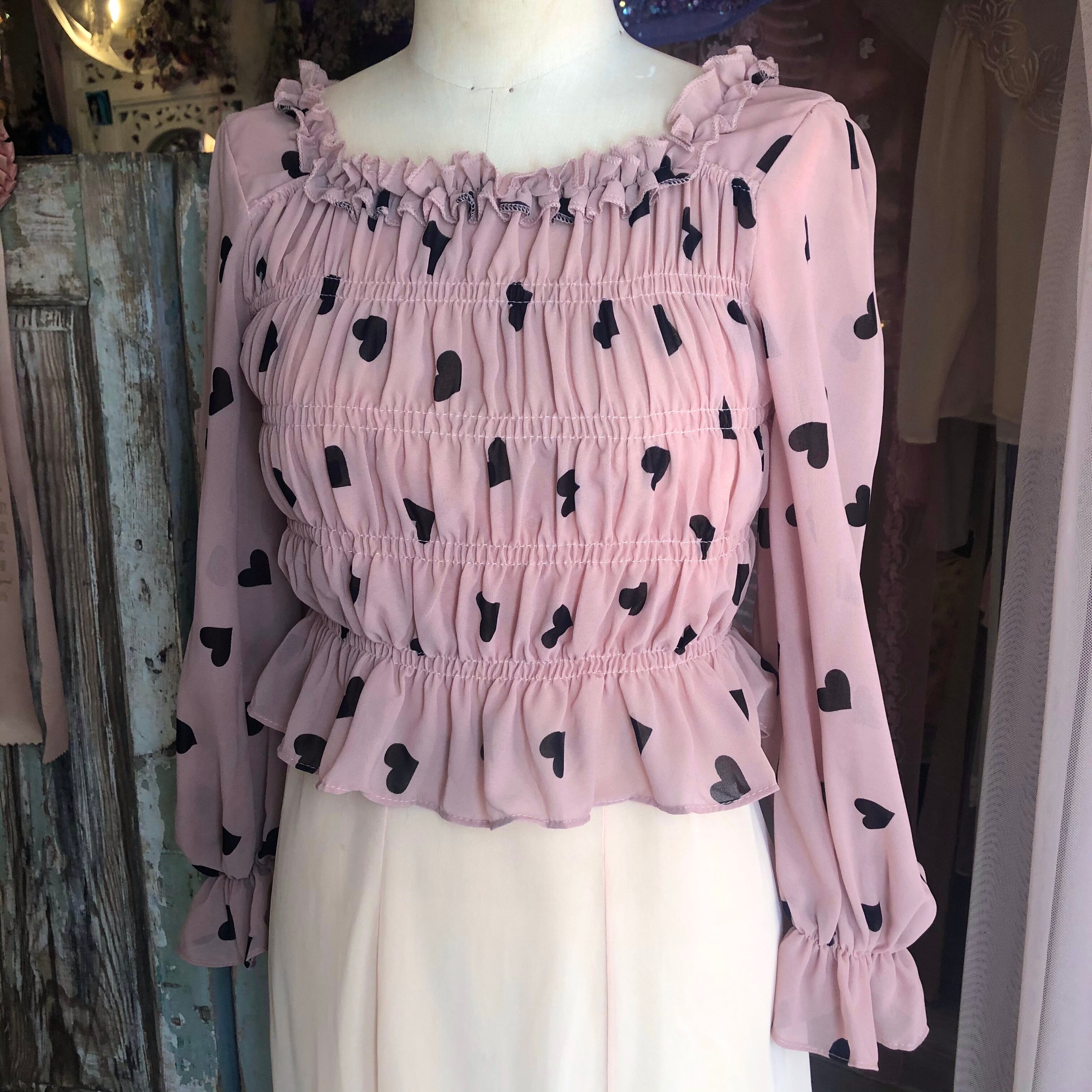 シフォンのような若干透け感のある素材のシャーリングトップスです。