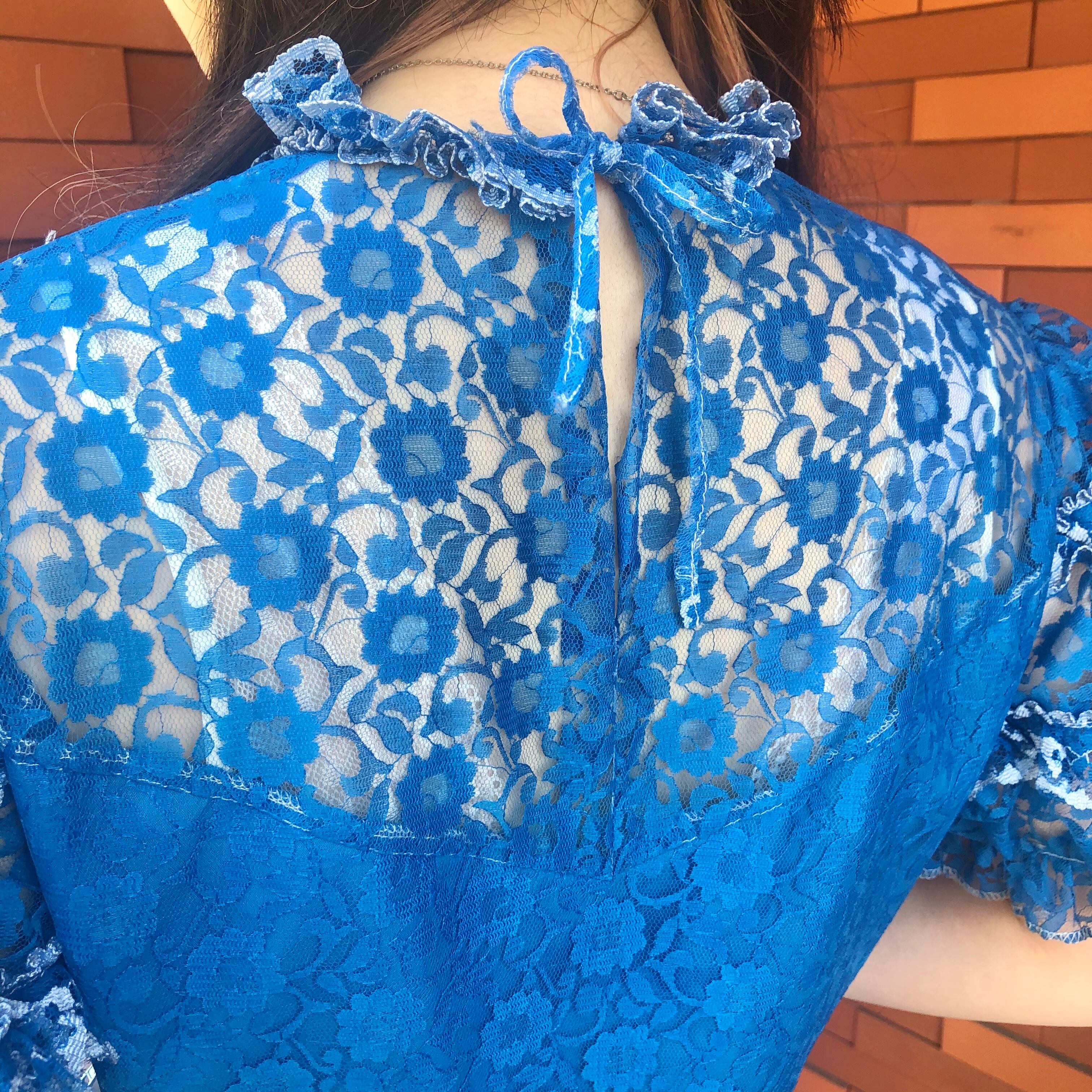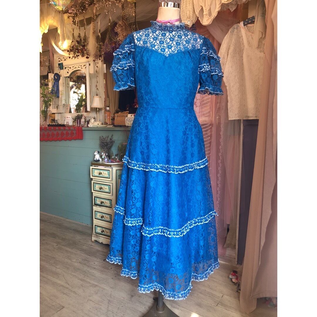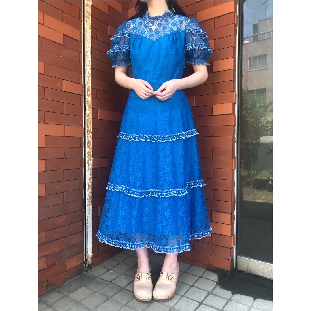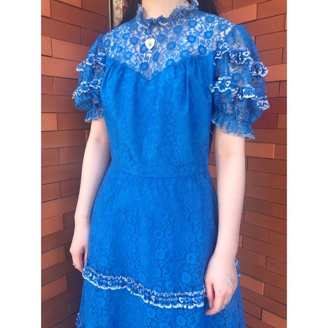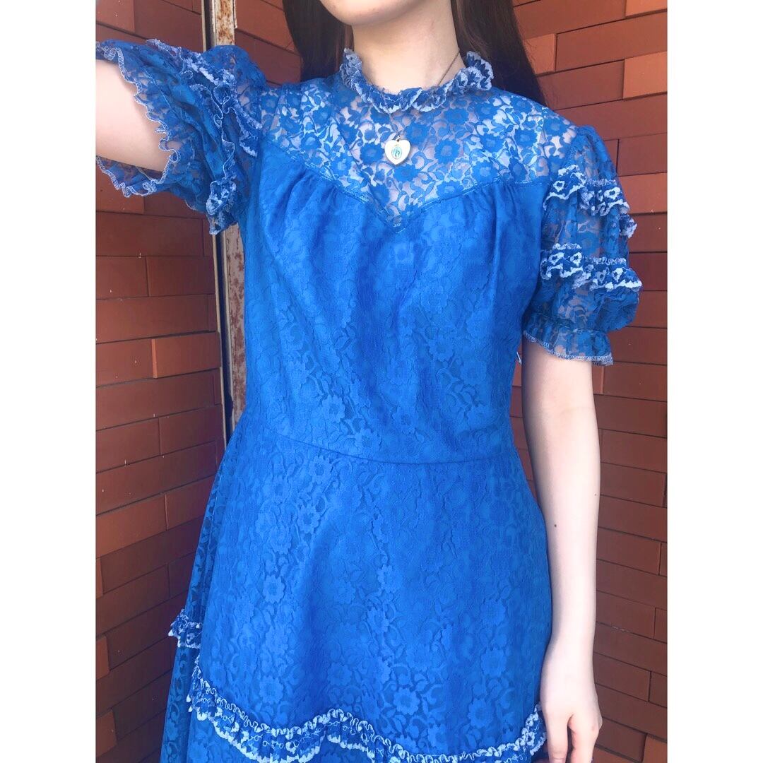 目が覚めるようなブルーが魅力的なレースワンピースです。