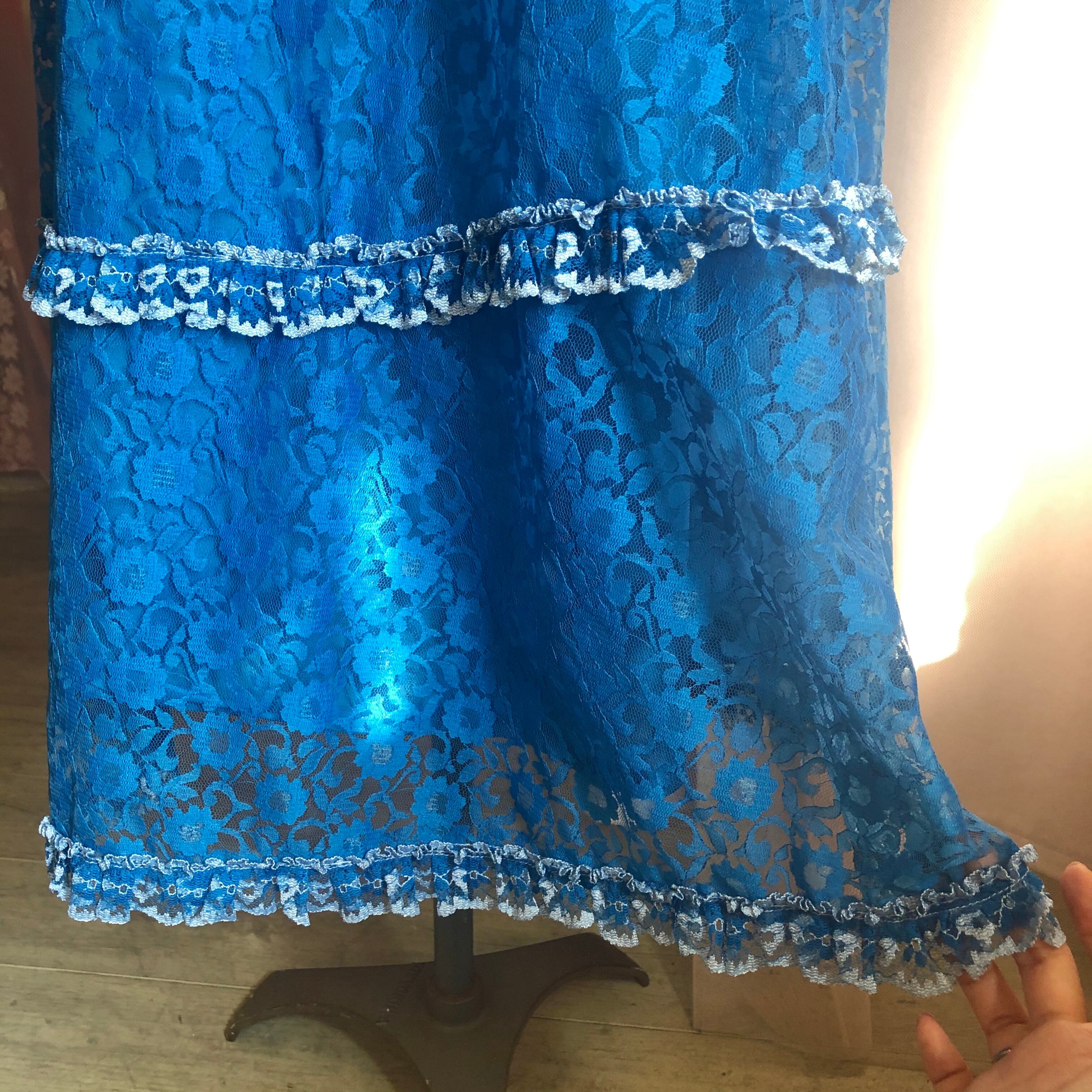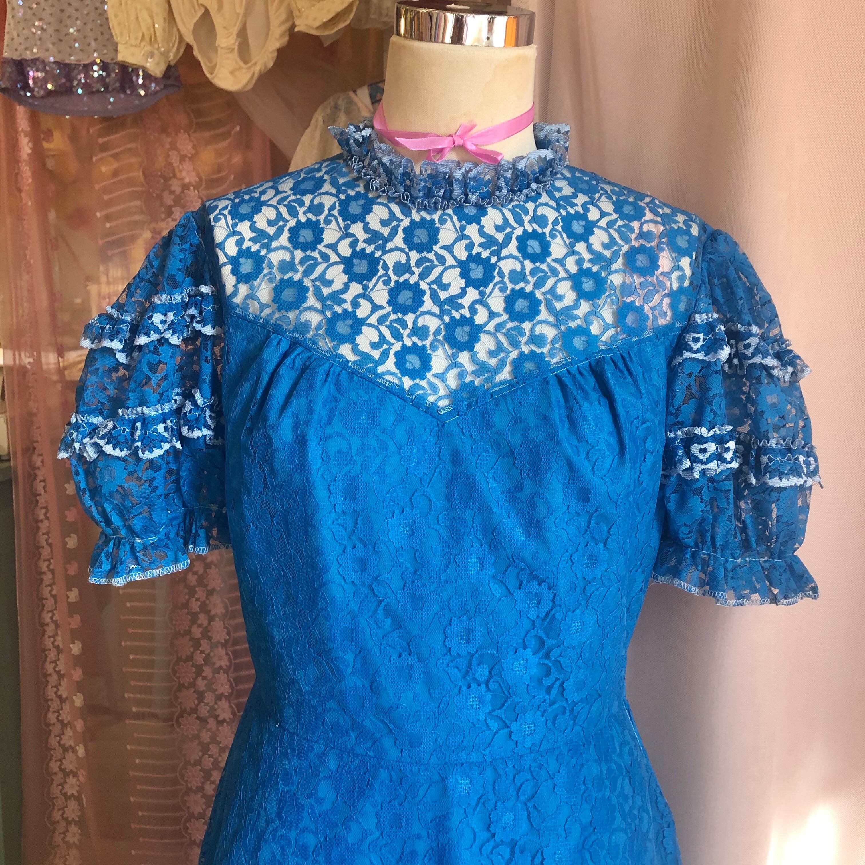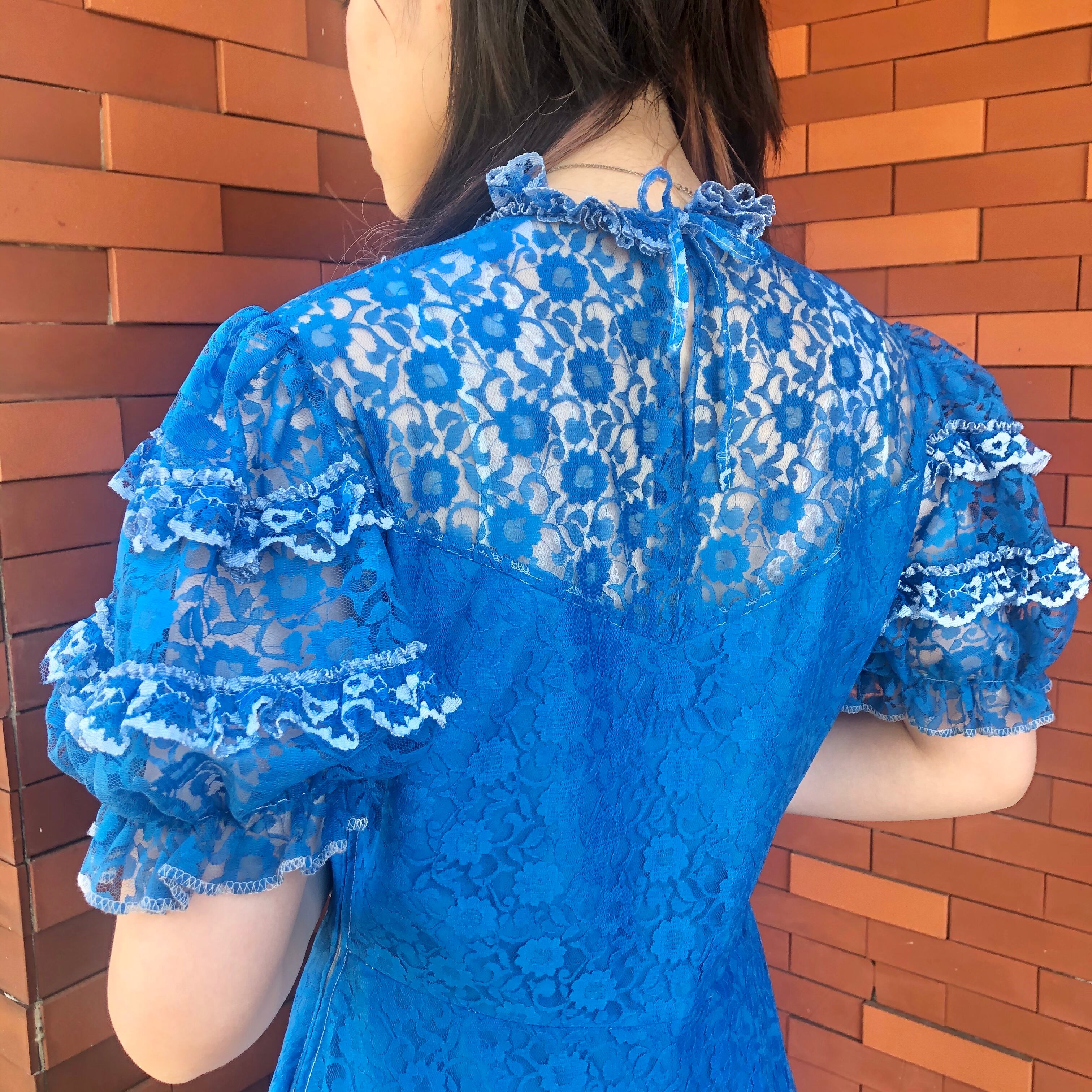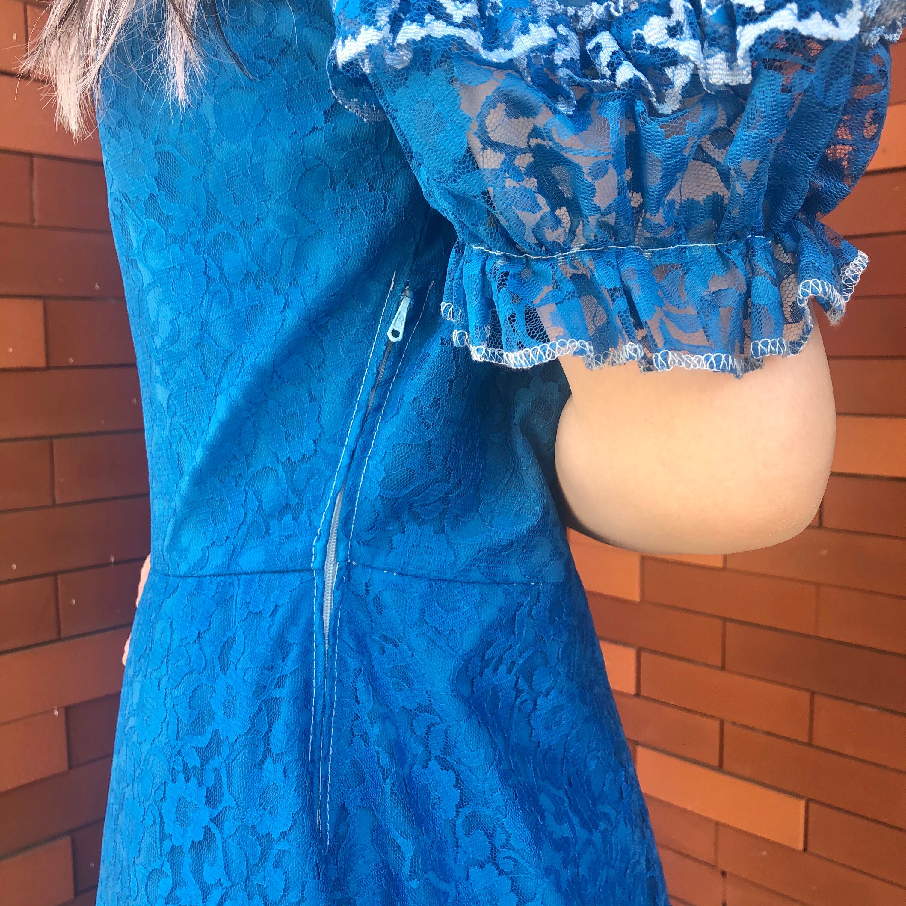 目が覚めるようなブルーが魅力的なレースワンピースです。