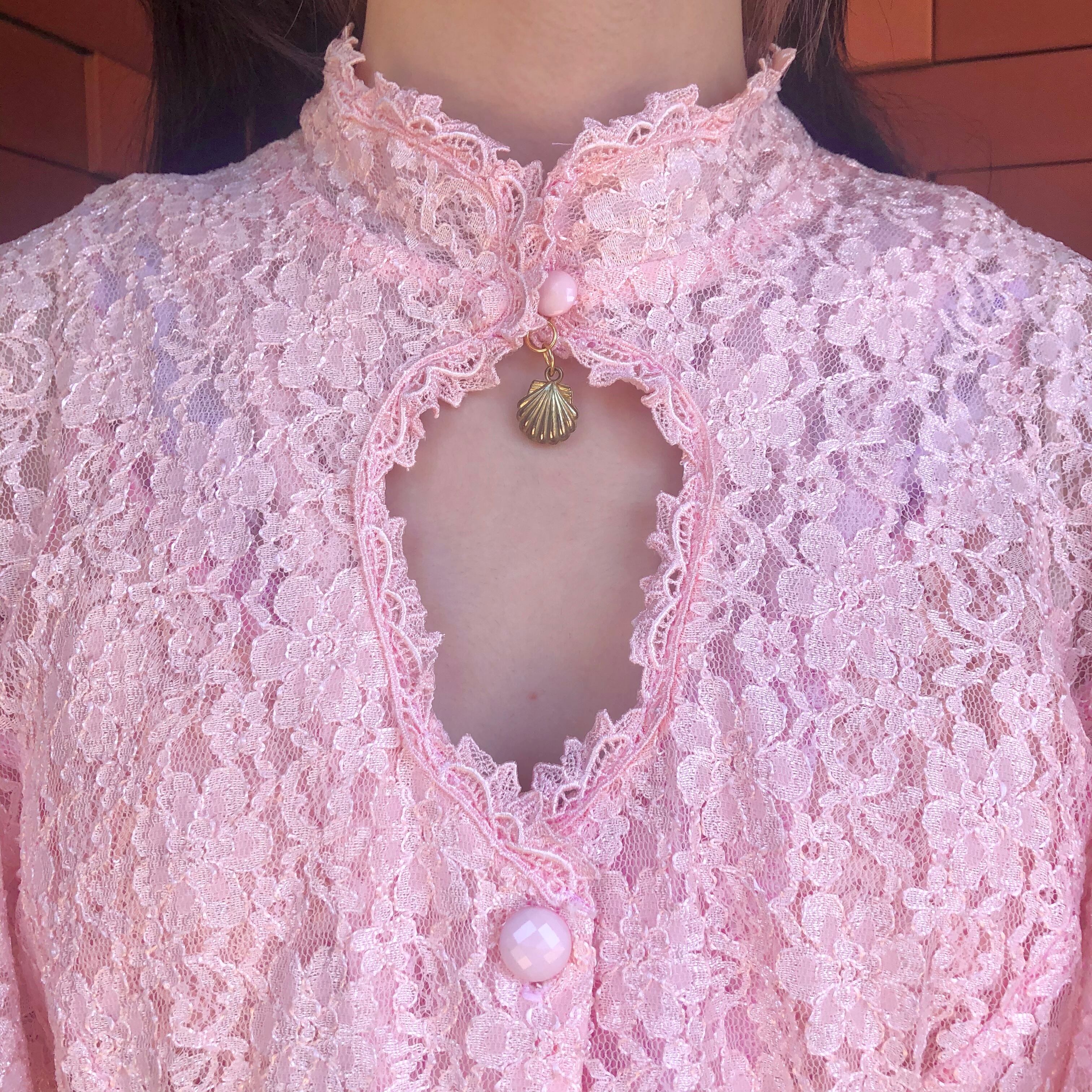 丸くくりぬかれたデコルテ部分からちらりと見える肌。そのうえのボタンに付いたシェルモチーフのパーツがこれからの季節にぴったり。