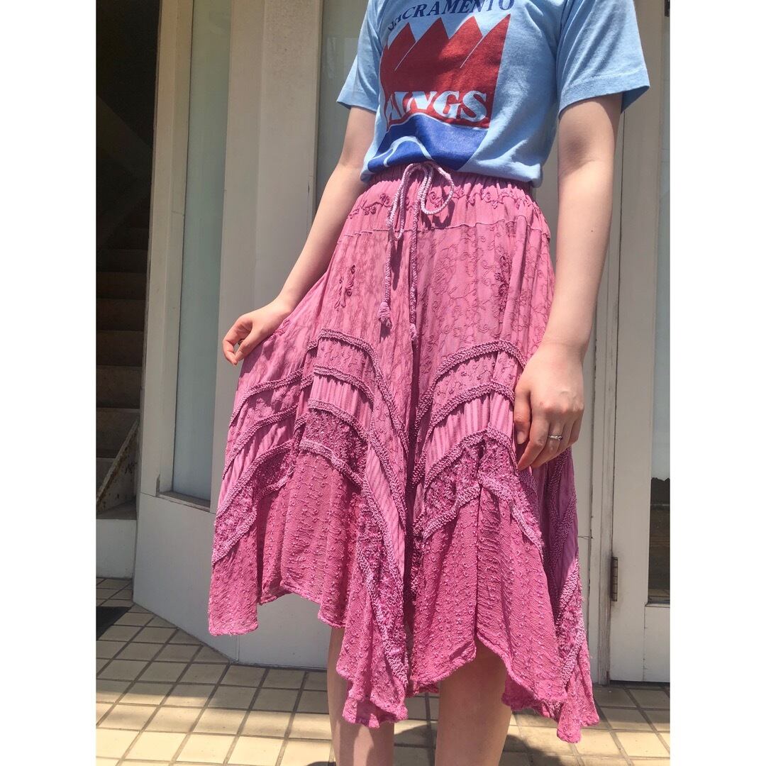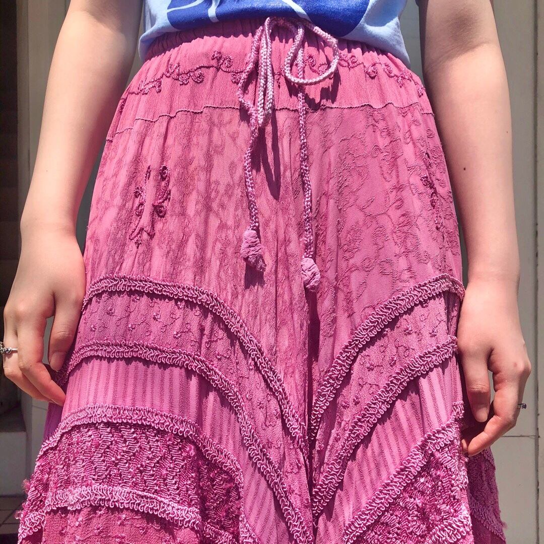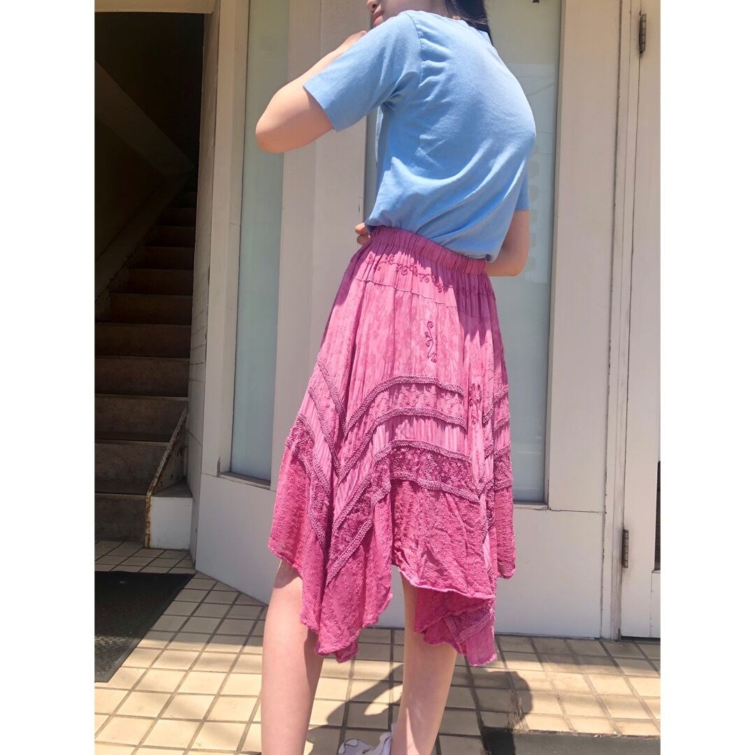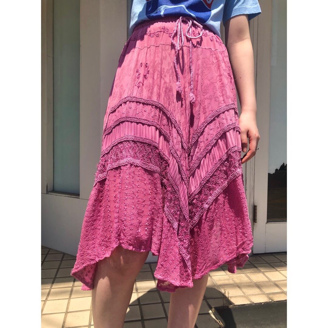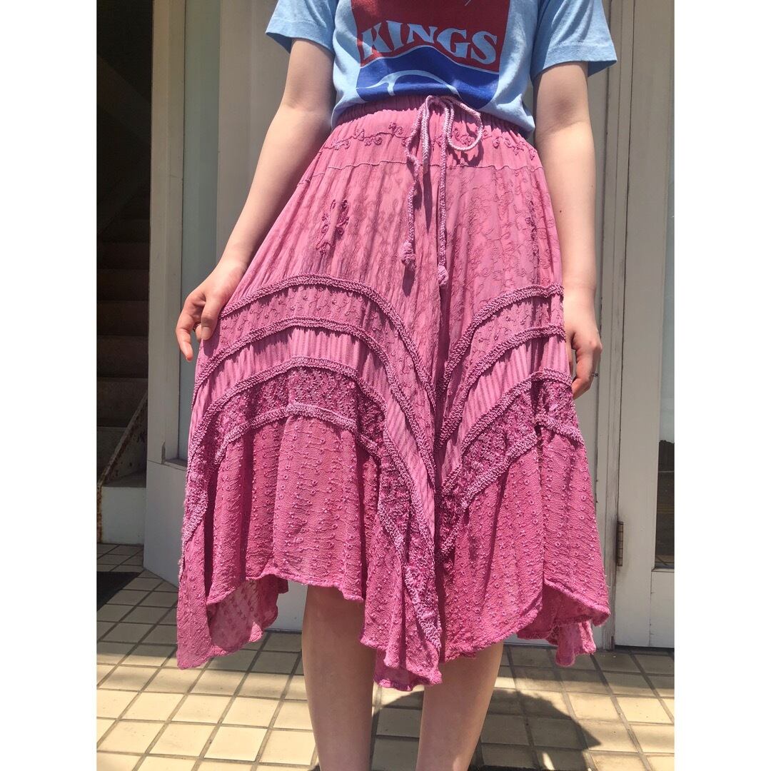 丈の感じや濃いめピンクだったりが珍しいインディアンレーヨンスカートです。
