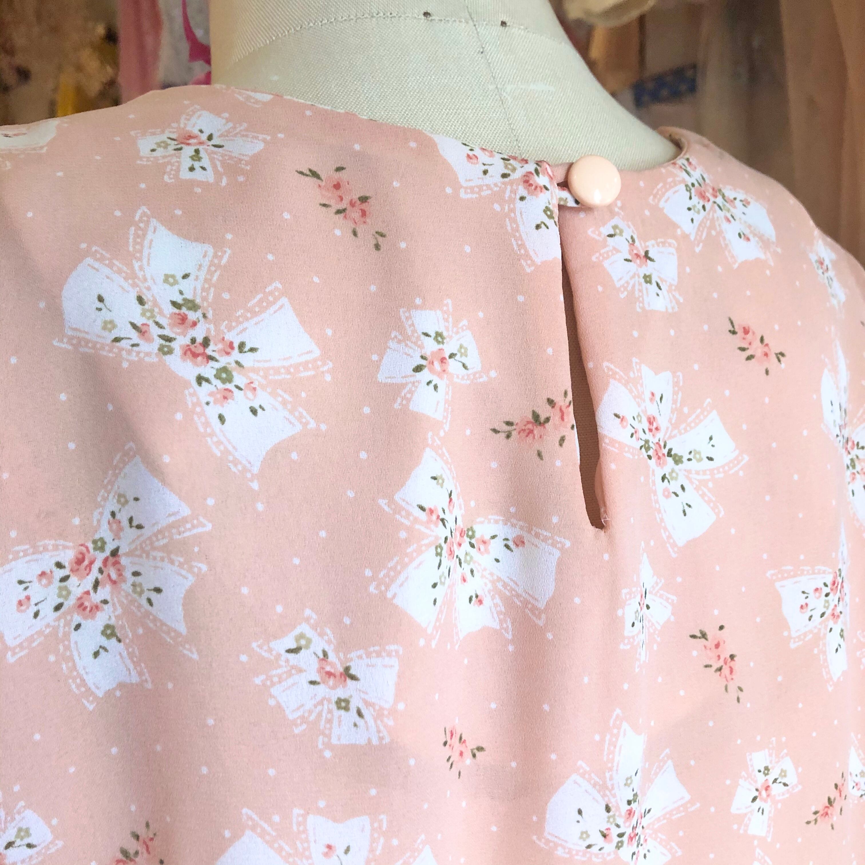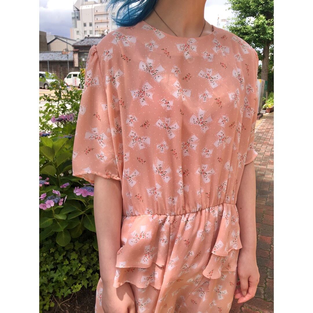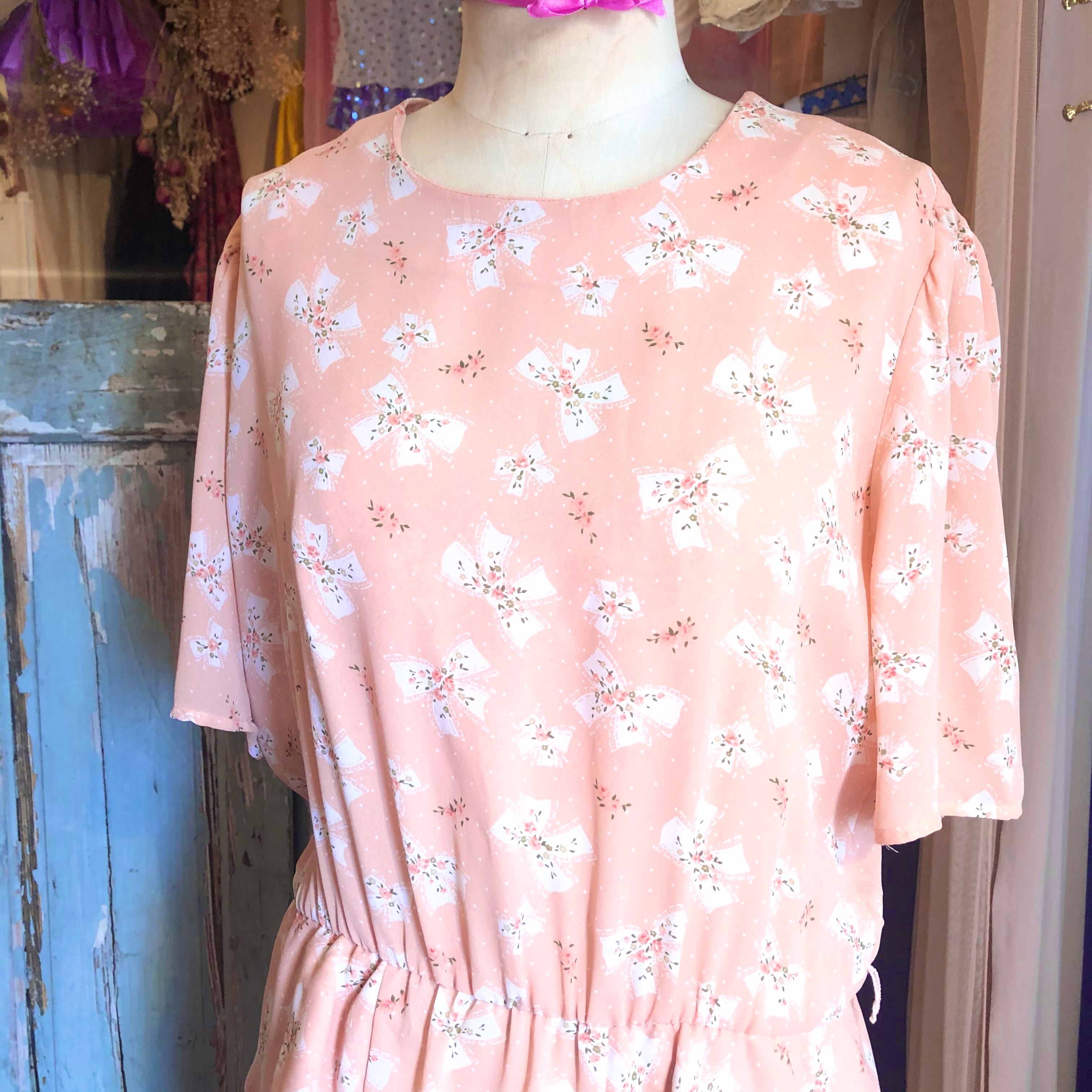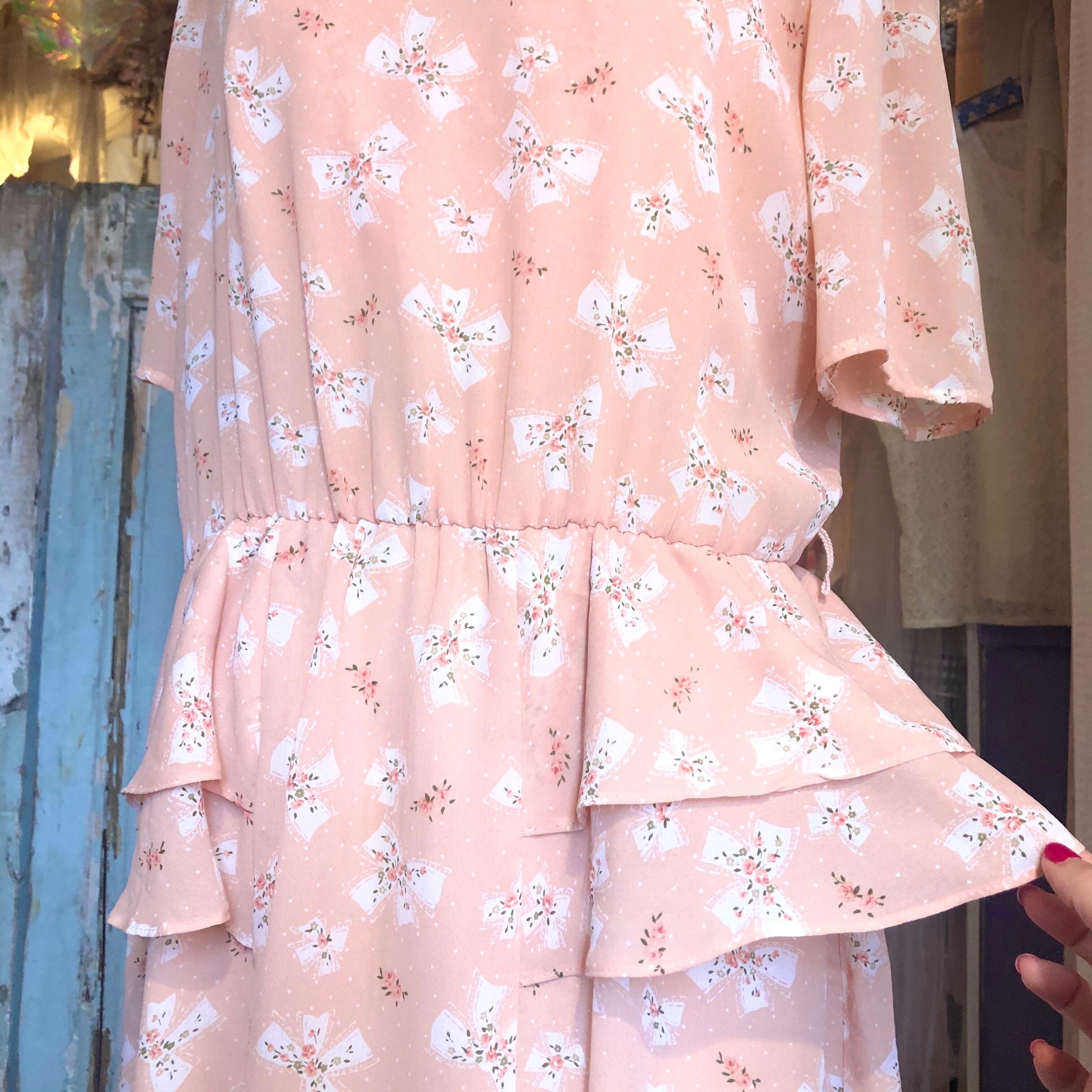 優しいサーモンピンク色にリボンと花が合わさりブーケのようになった柄が愛らしい一着。