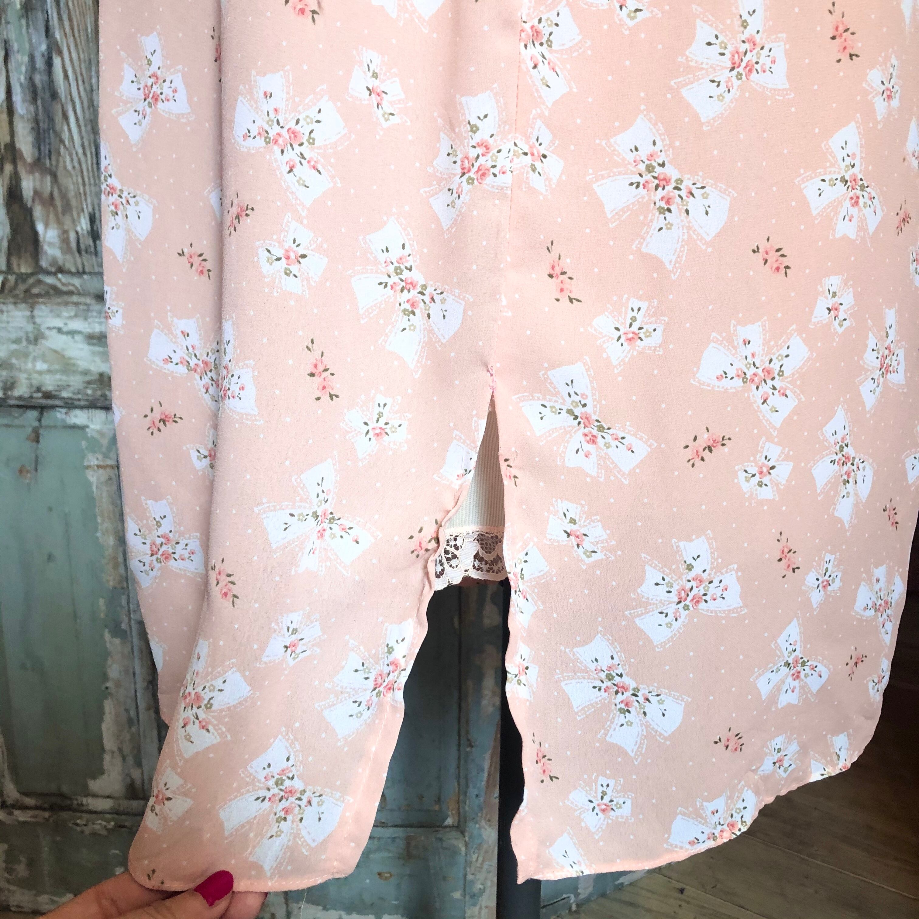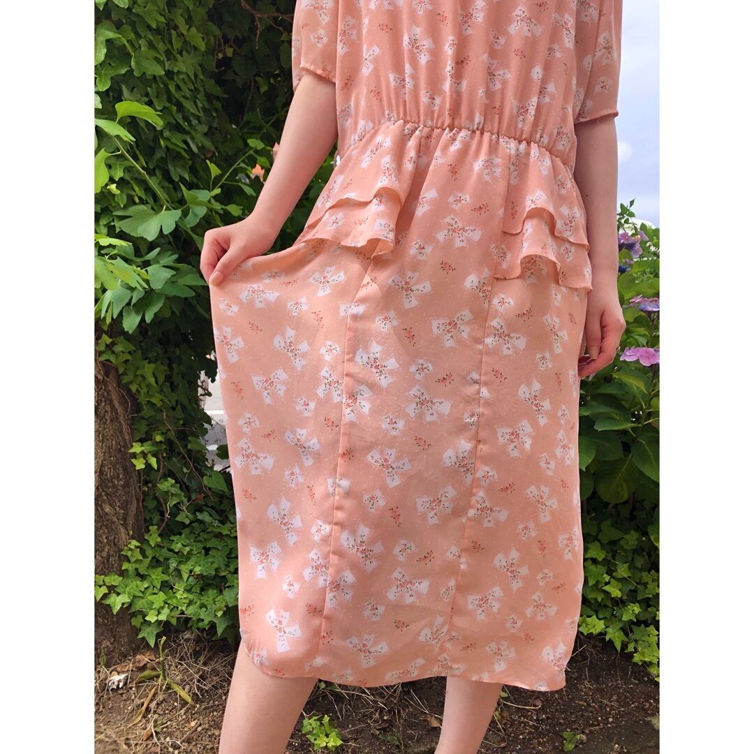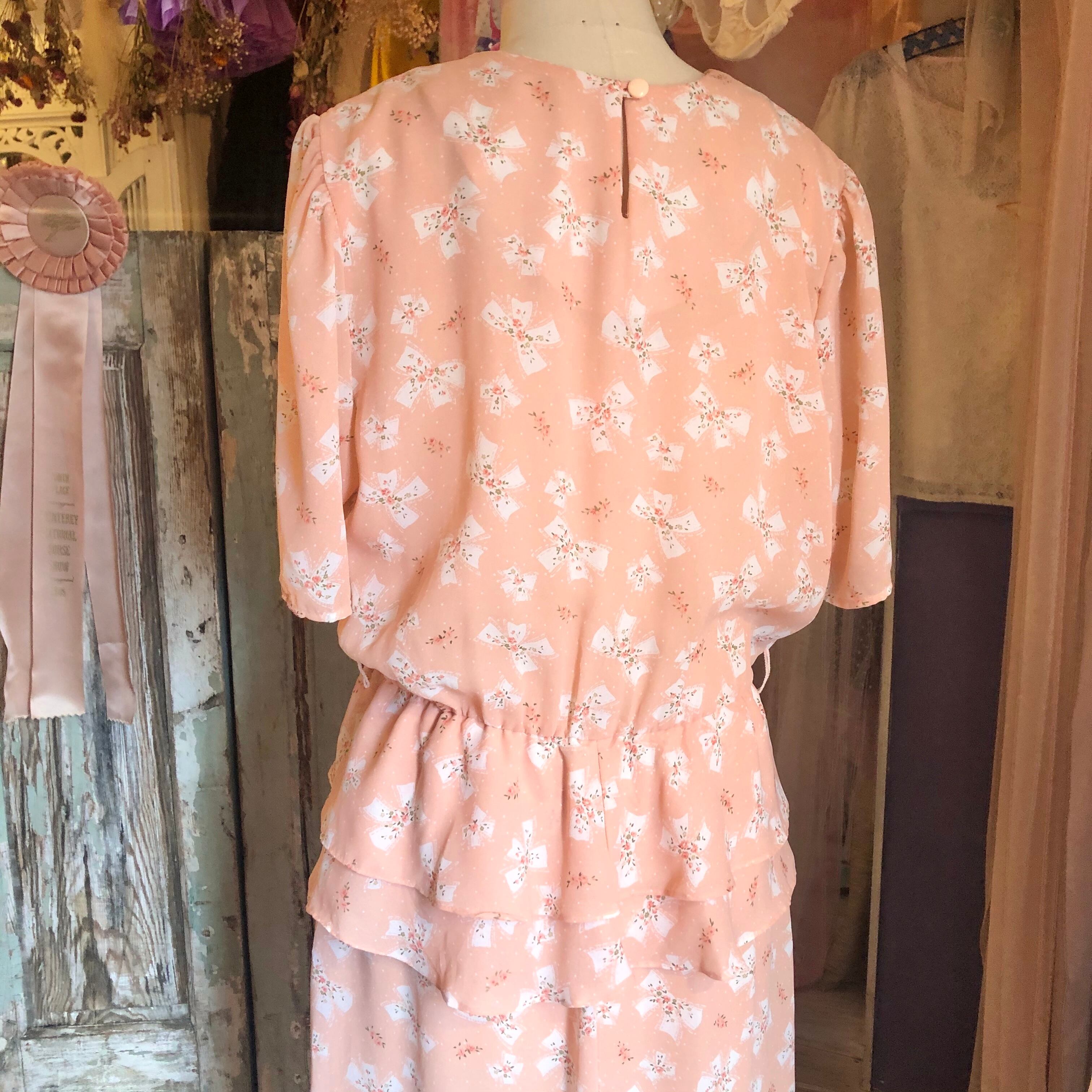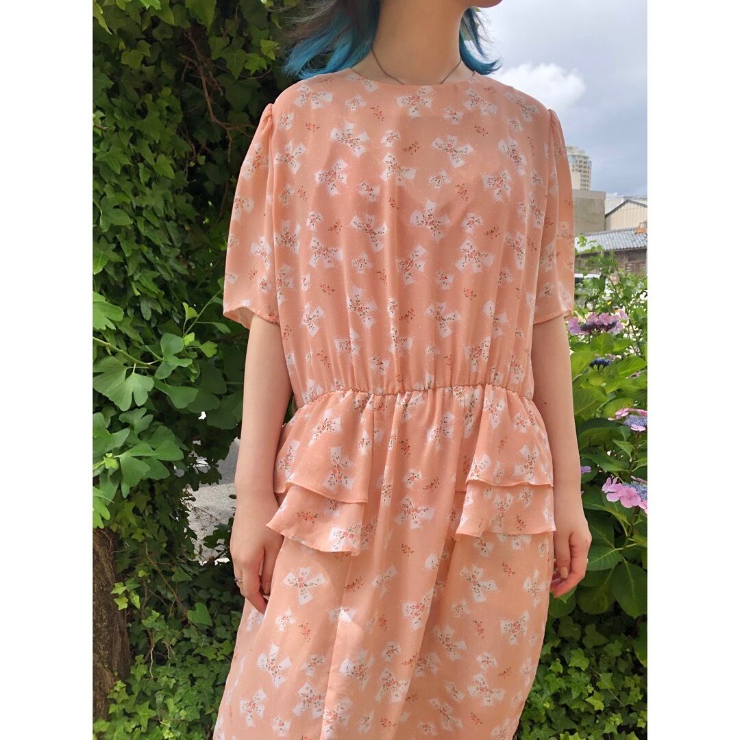 優しいサーモンピンク色にリボンと花が合わさりブーケのようになった柄が愛らしい一着。