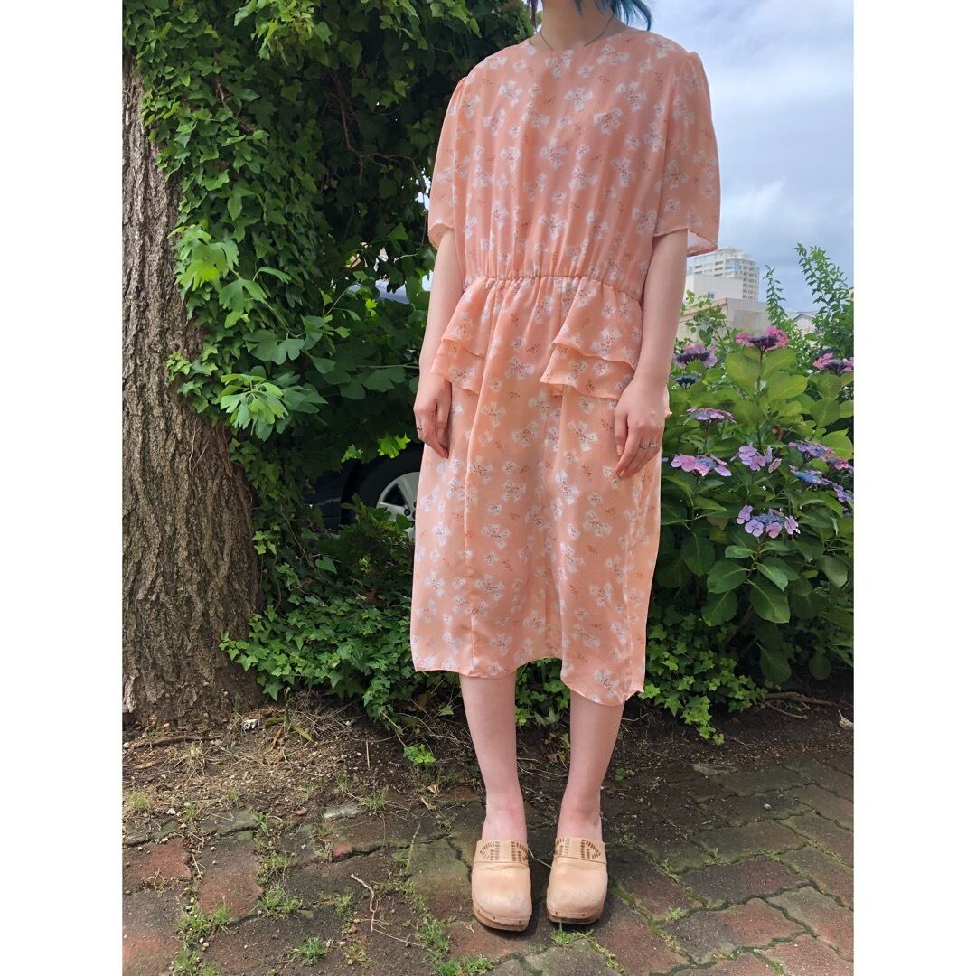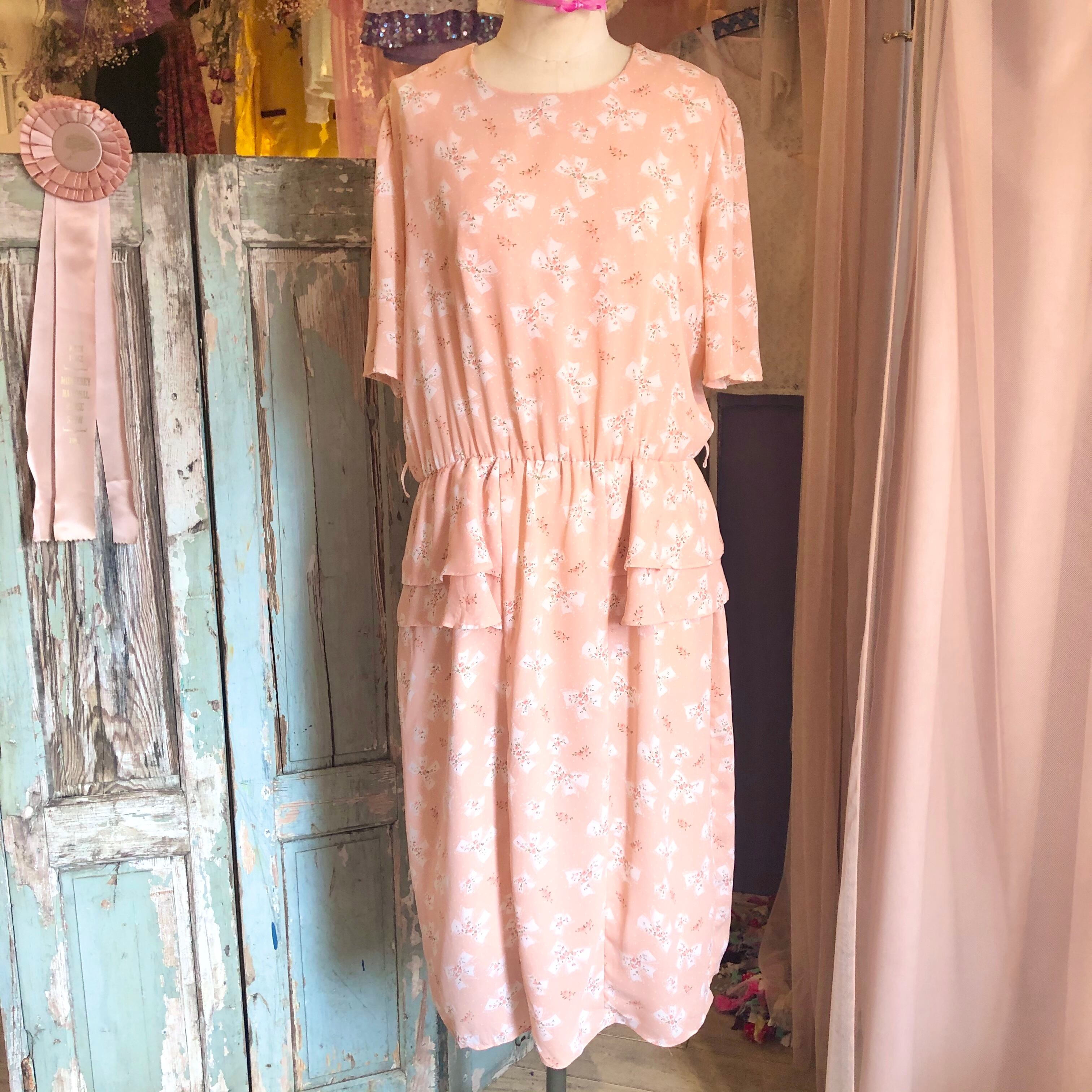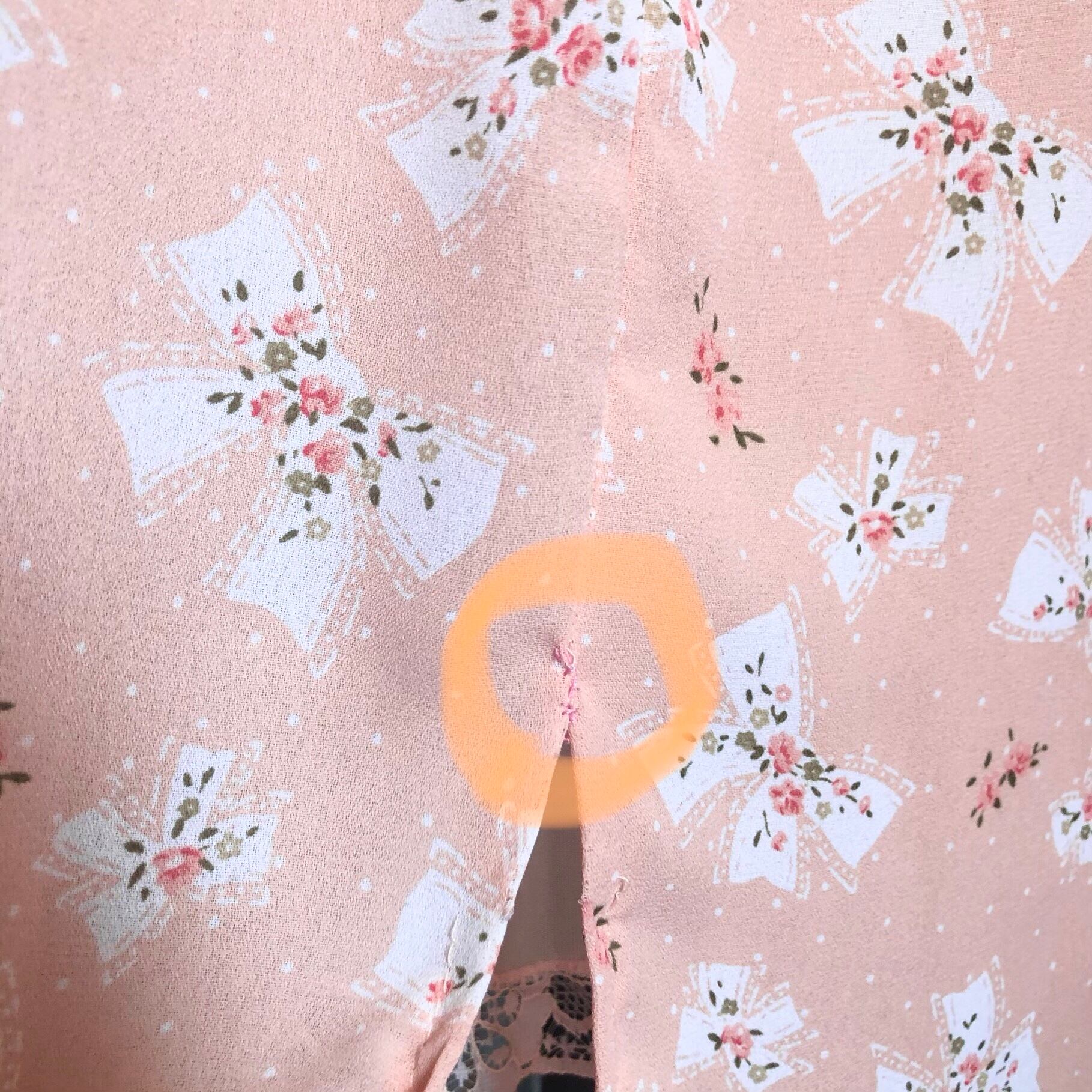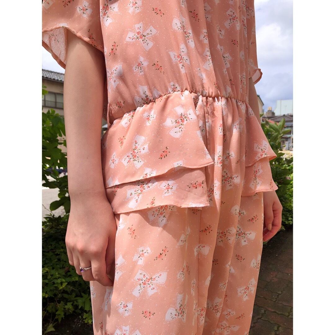 優しいサーモンピンク色にリボンと花が合わさりブーケのようになった柄が愛らしい一着。