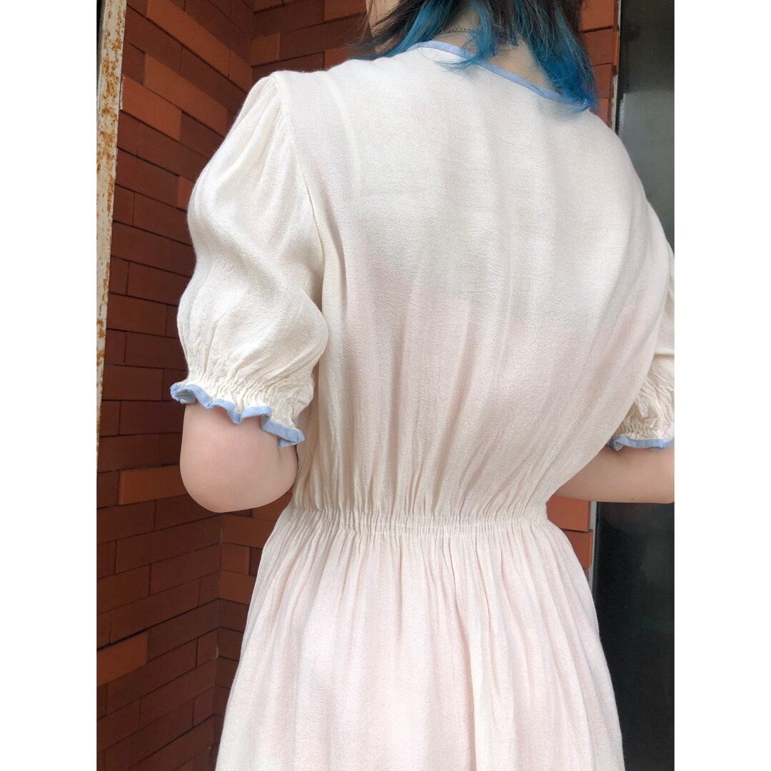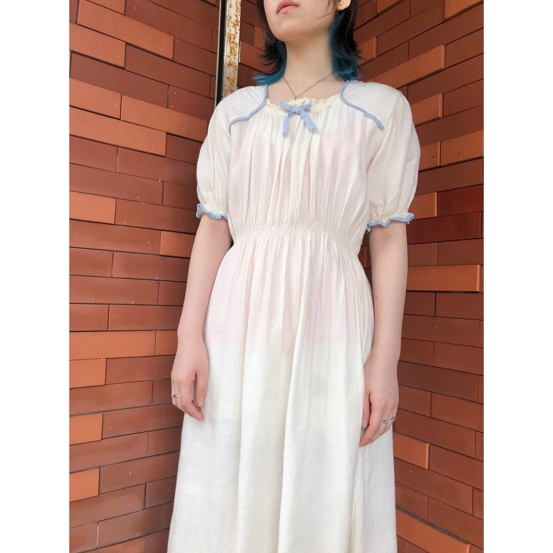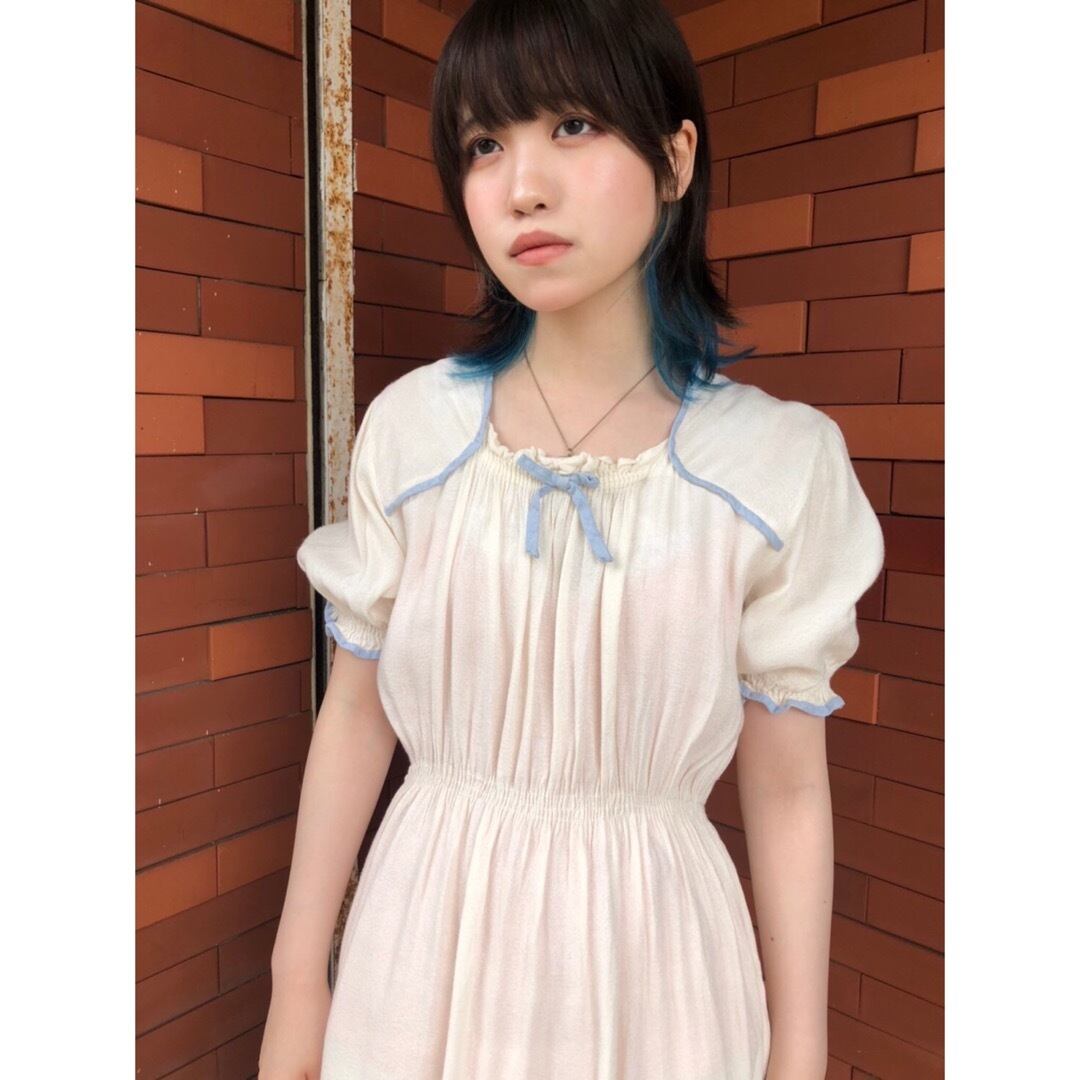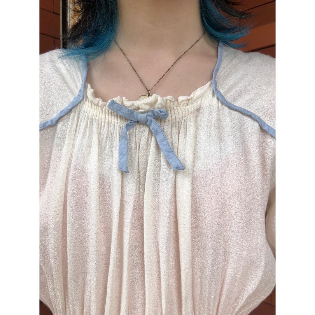 豪華な装飾こそないですが、シンプルゆえにくすんだ水色パイピングや胸元リボンの魅力が際立ちます。