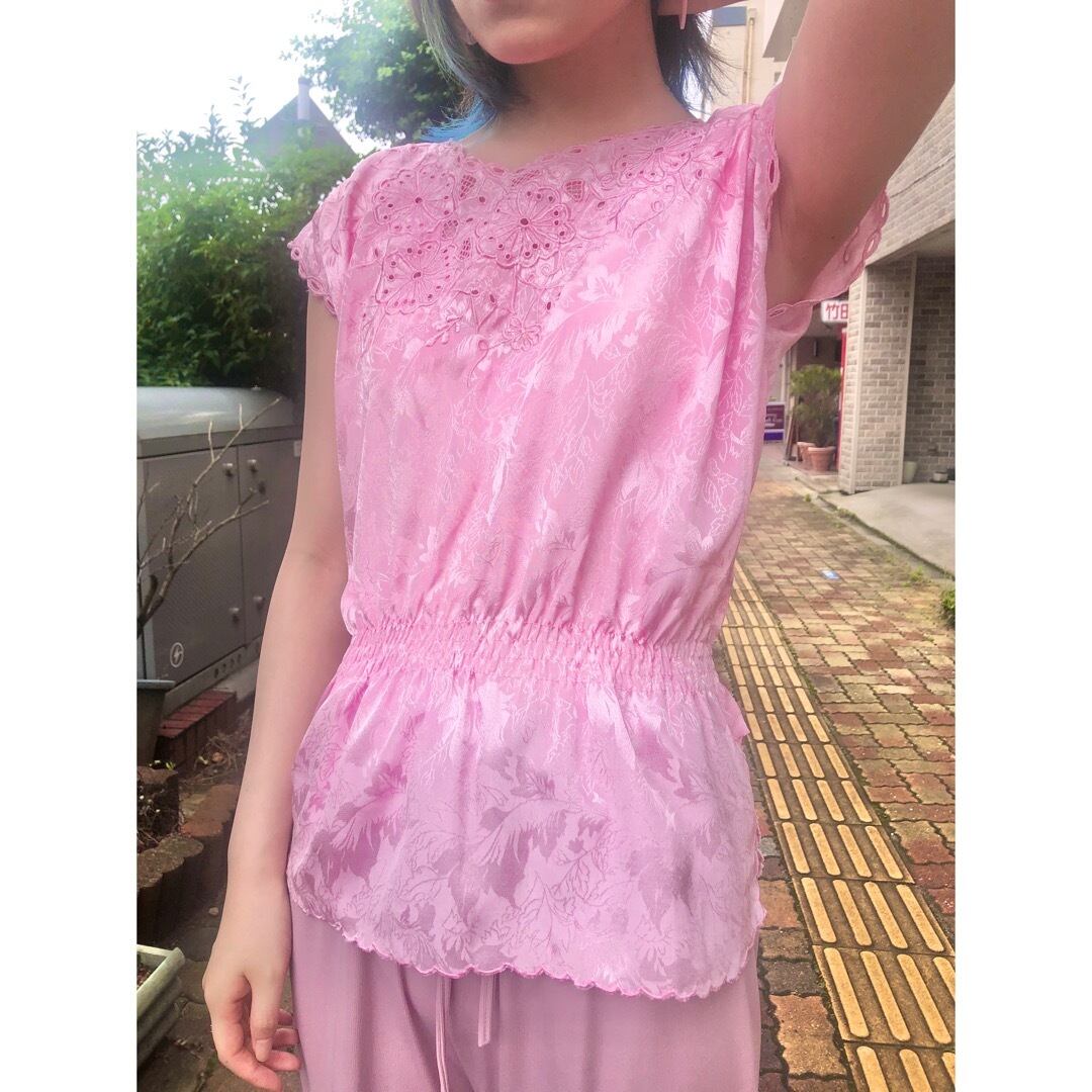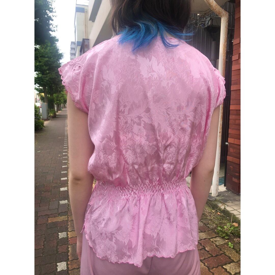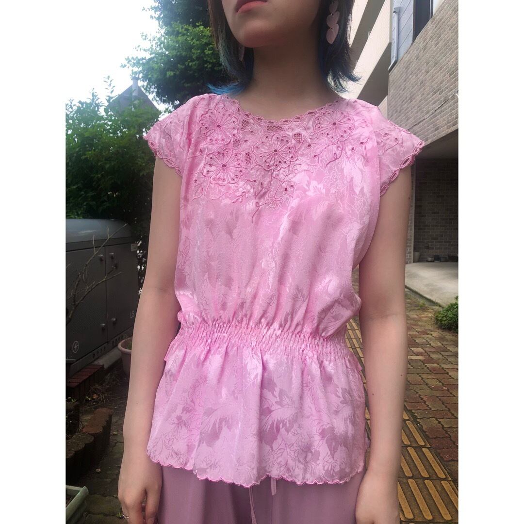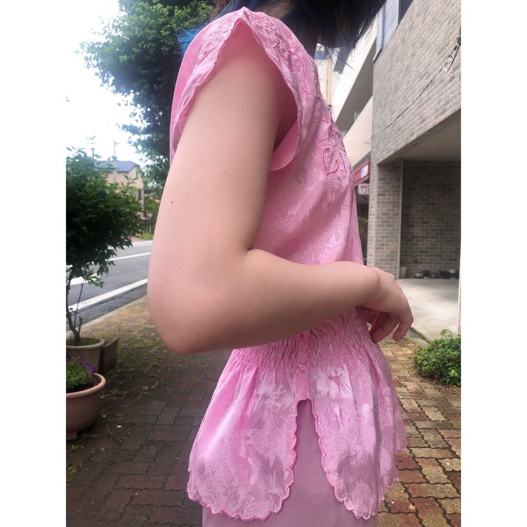 地模様にも草花の柄がはいったピンクのチャイナテイストなトップス.