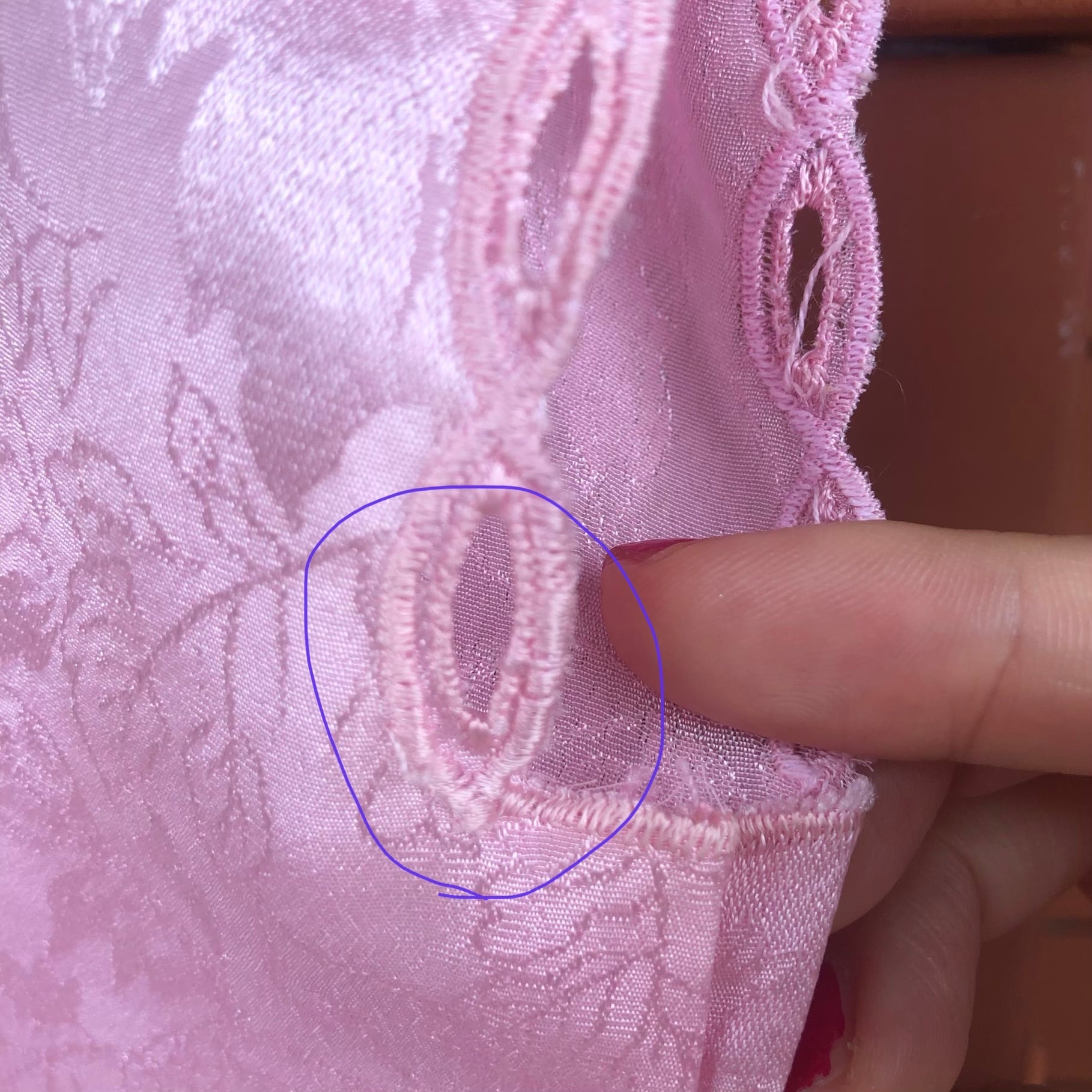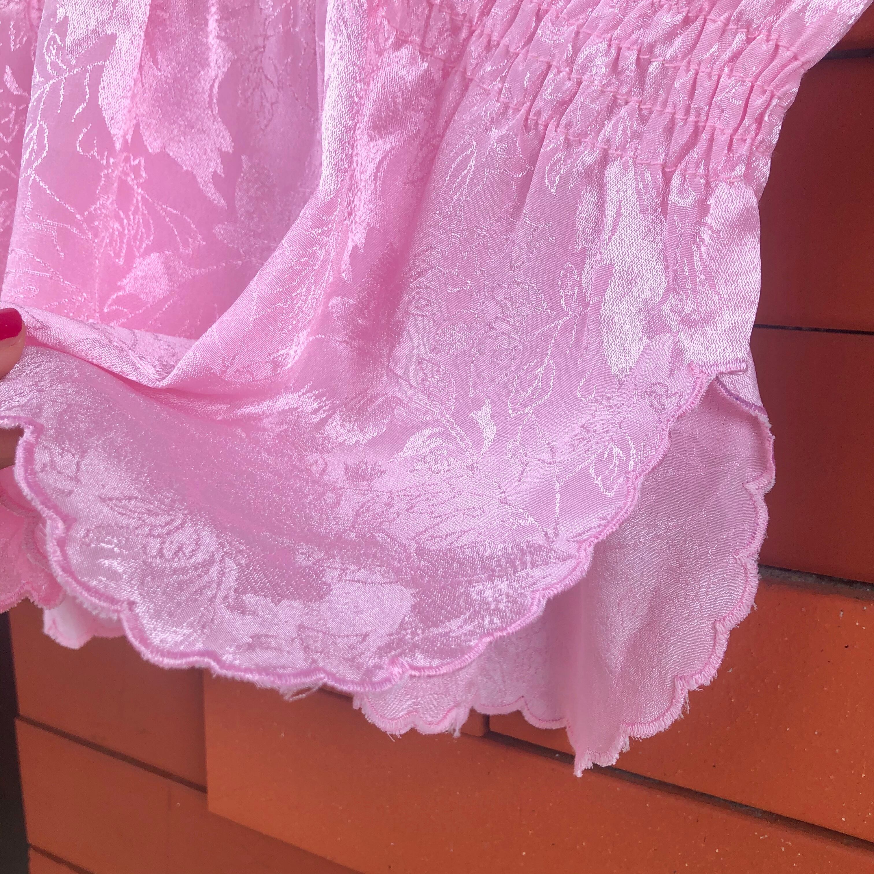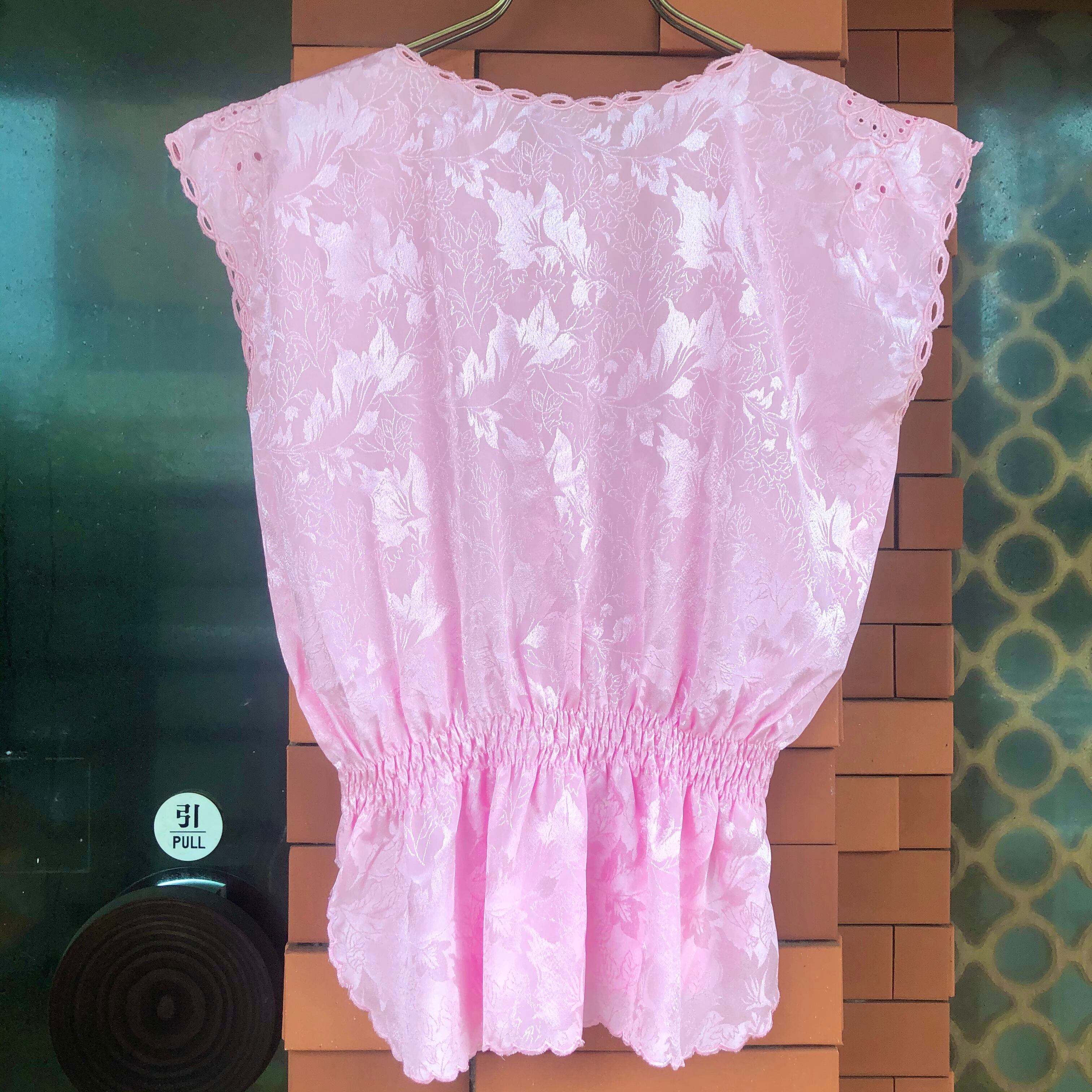 地模様にも草花の柄がはいったピンクのチャイナテイストなトップス.