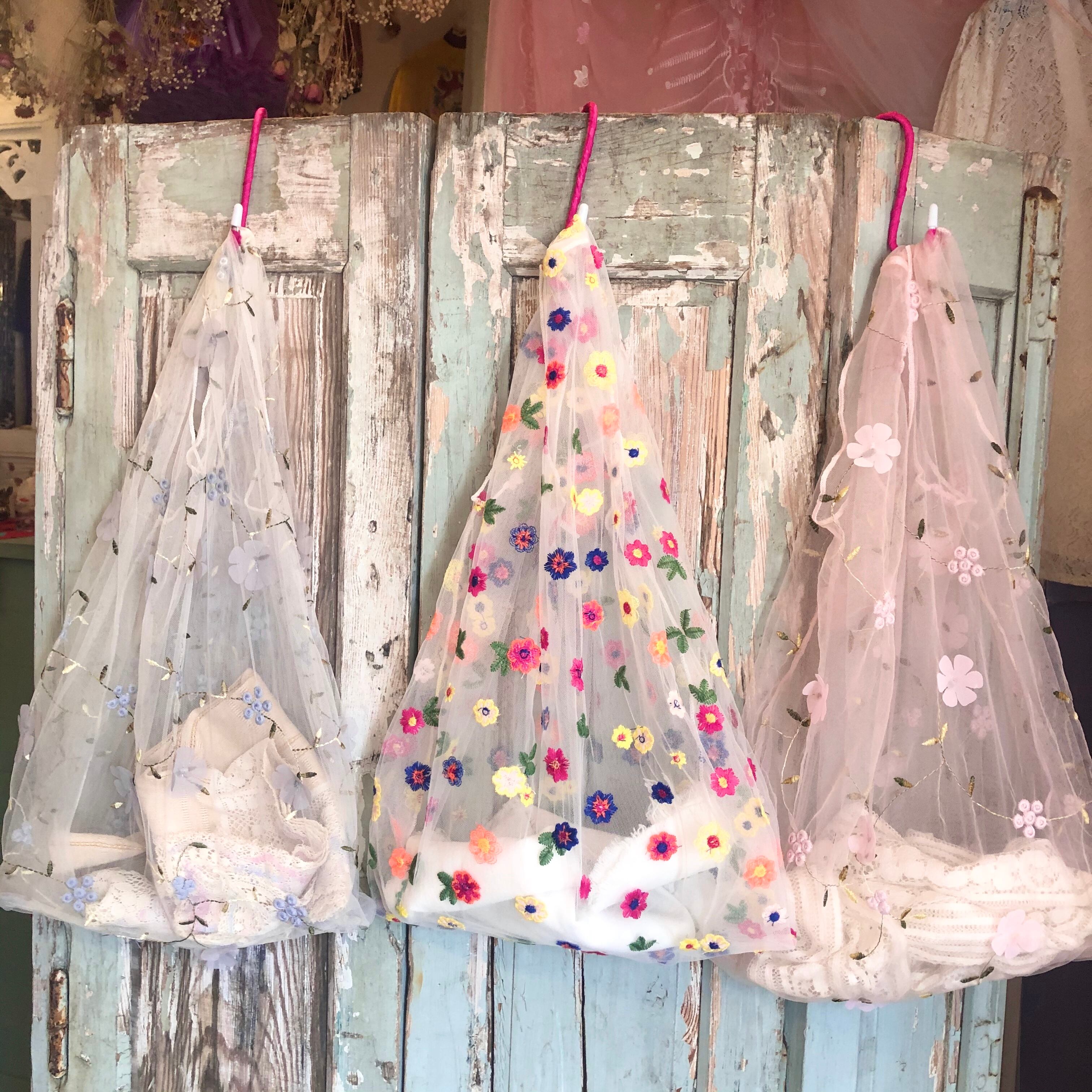 現在¥6000(税抜)以上お買い物してくださったお客様には、お花のチュール バッグを差し上げています。