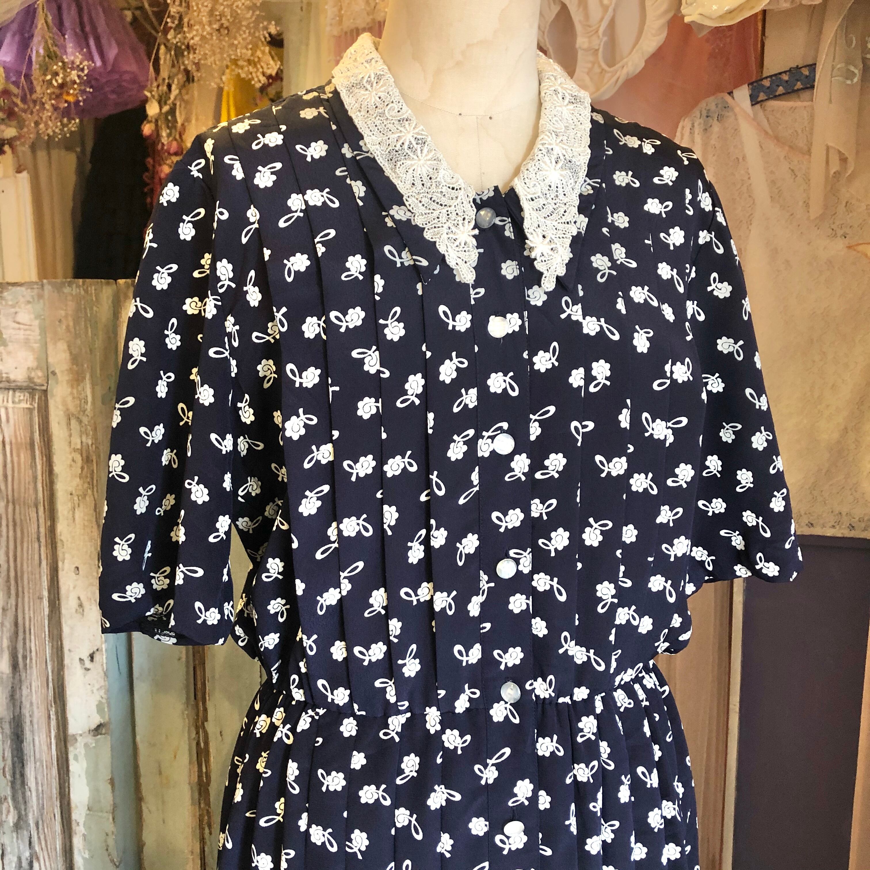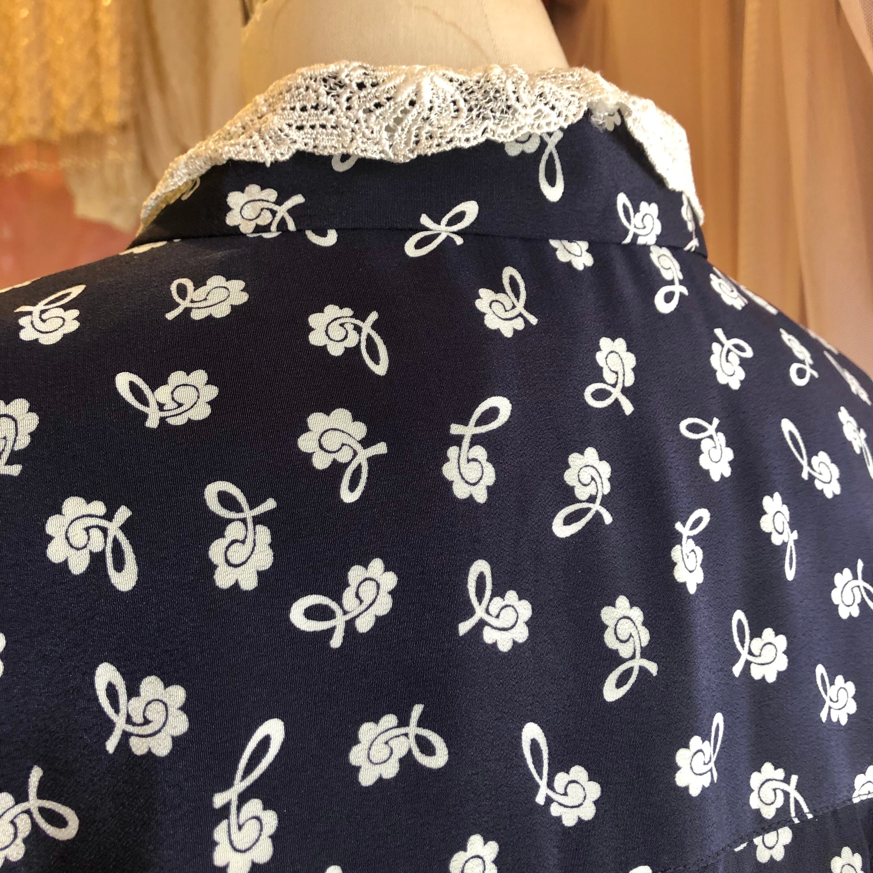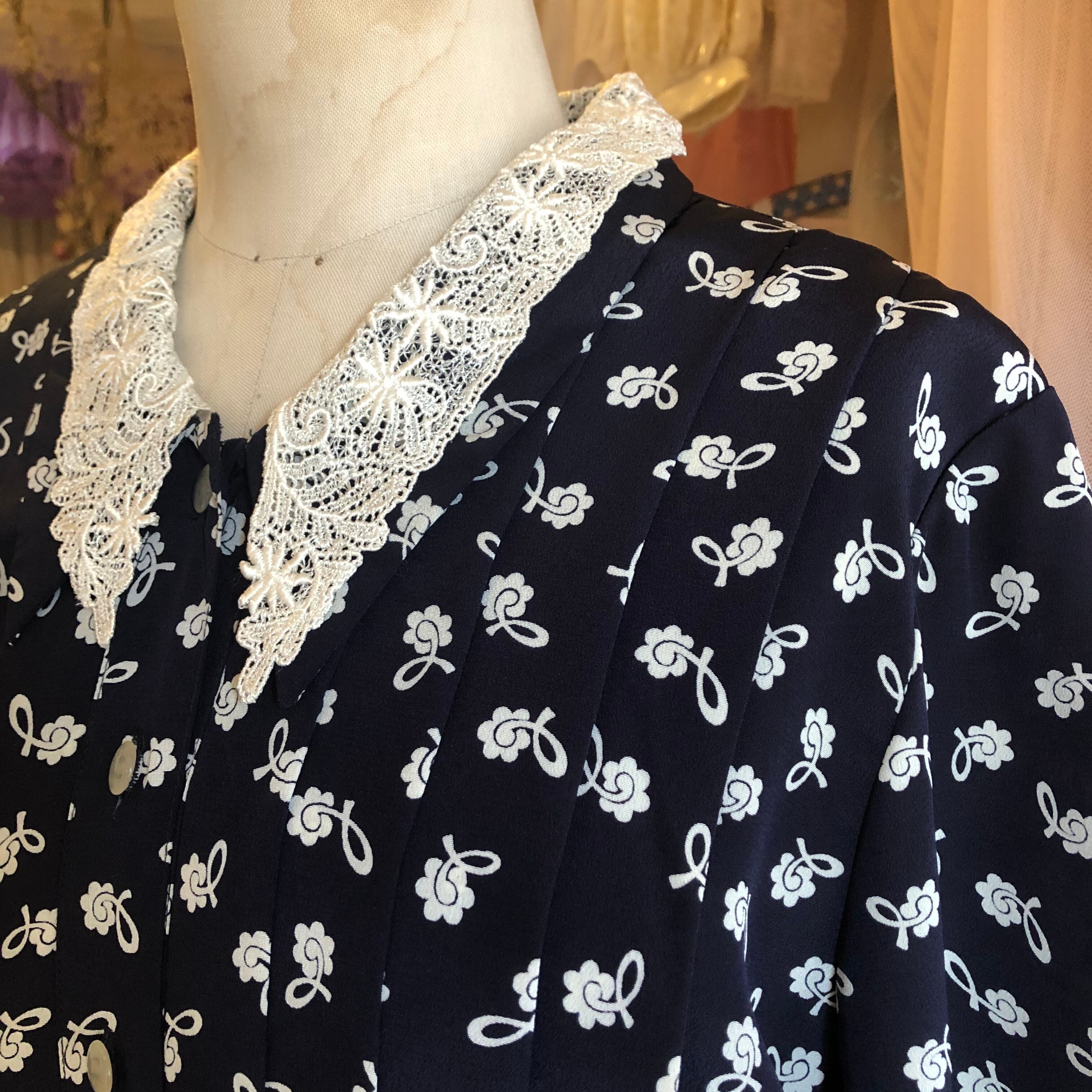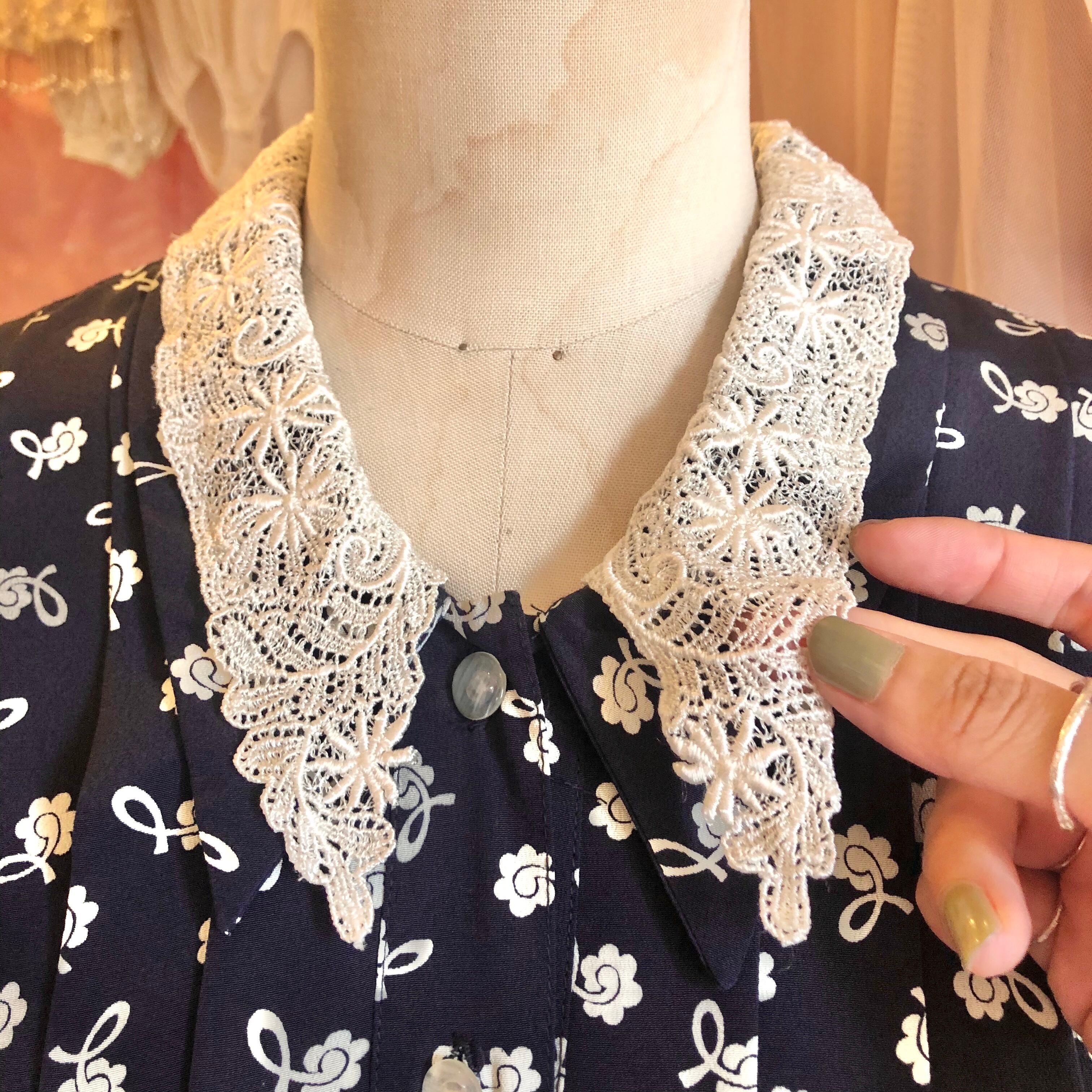 シンプルで一見クラシックですが、よく見ると花まるのような花模様で遊び心があり、かわいらしいです。全体と共布の襟のうえに重なるように、二重で襟がついています。