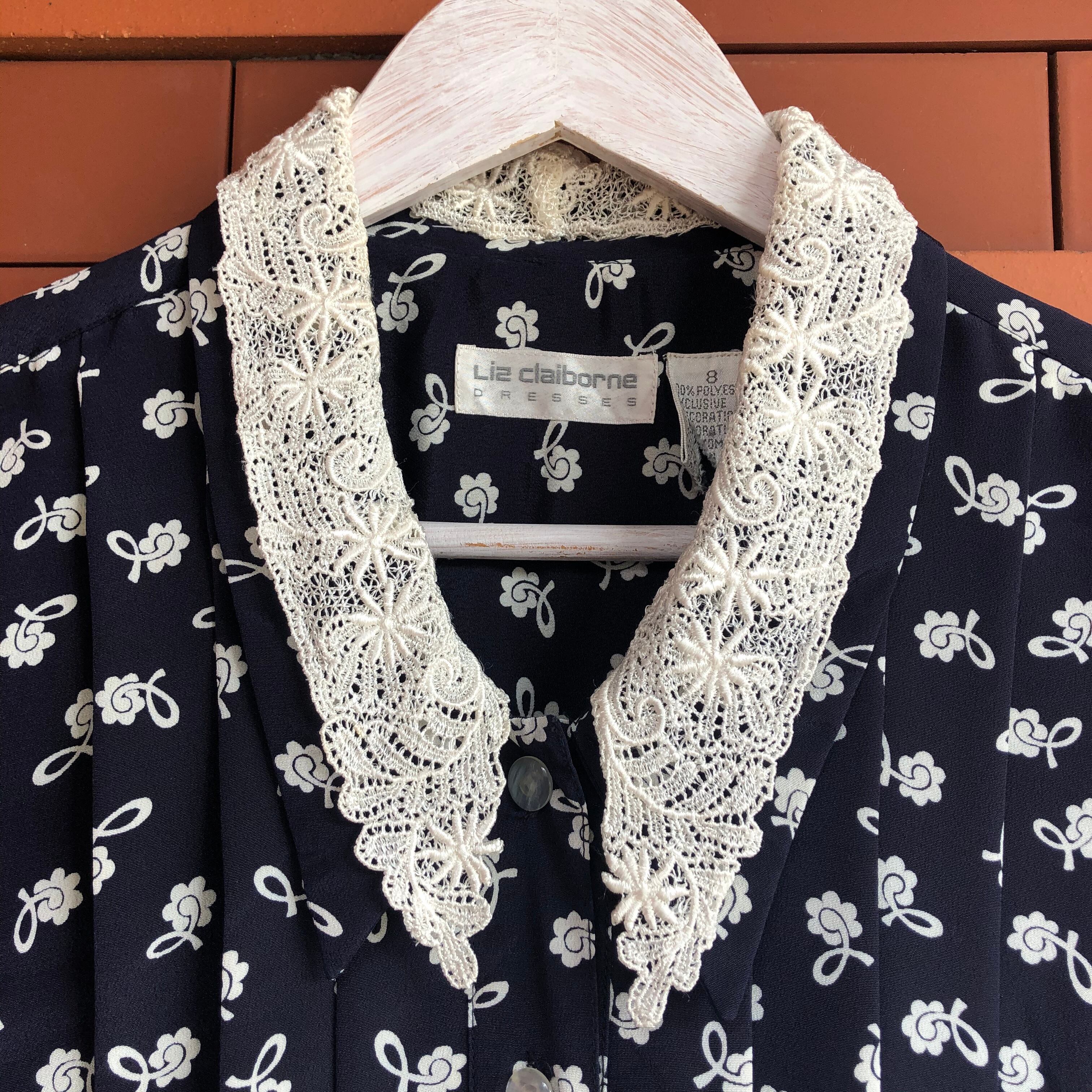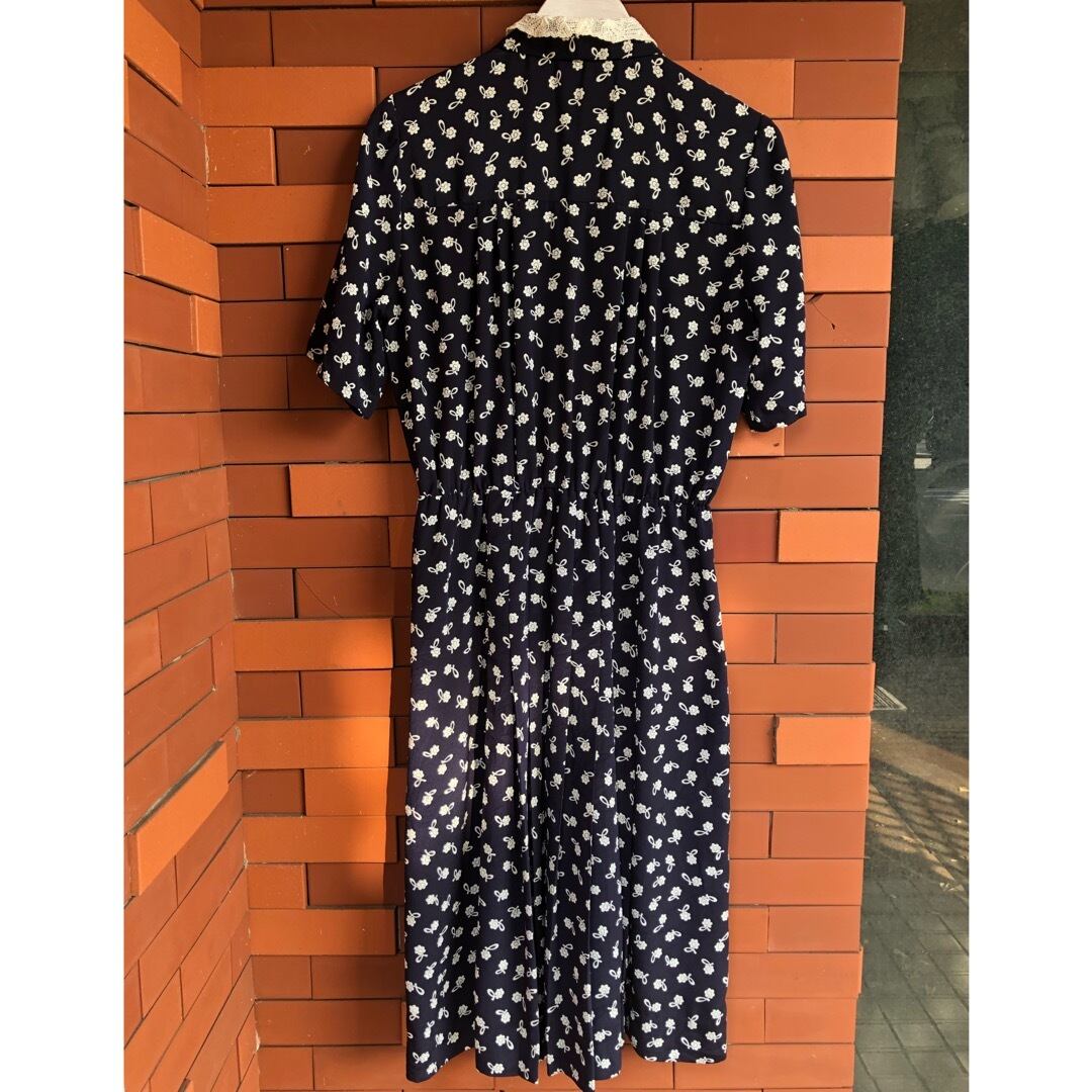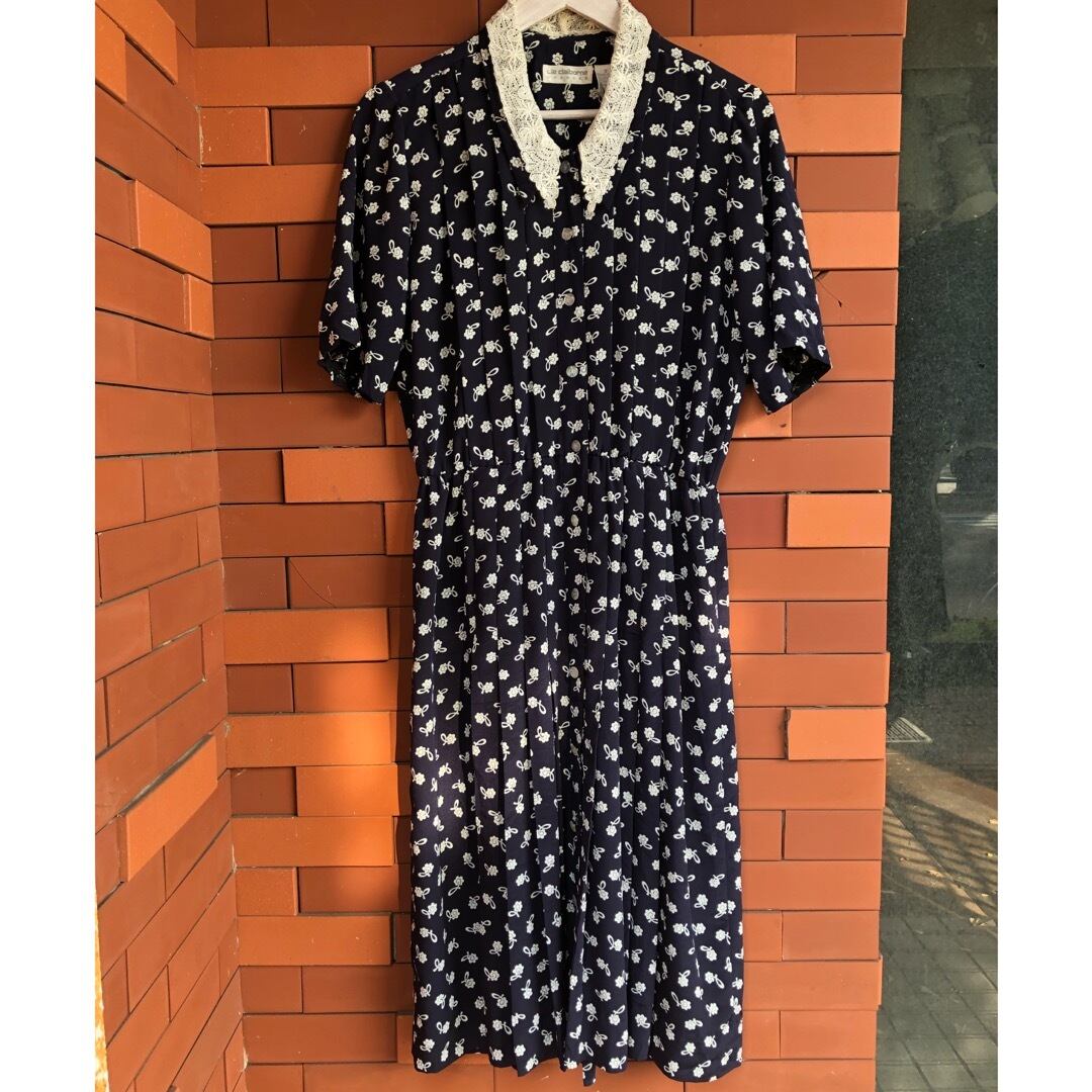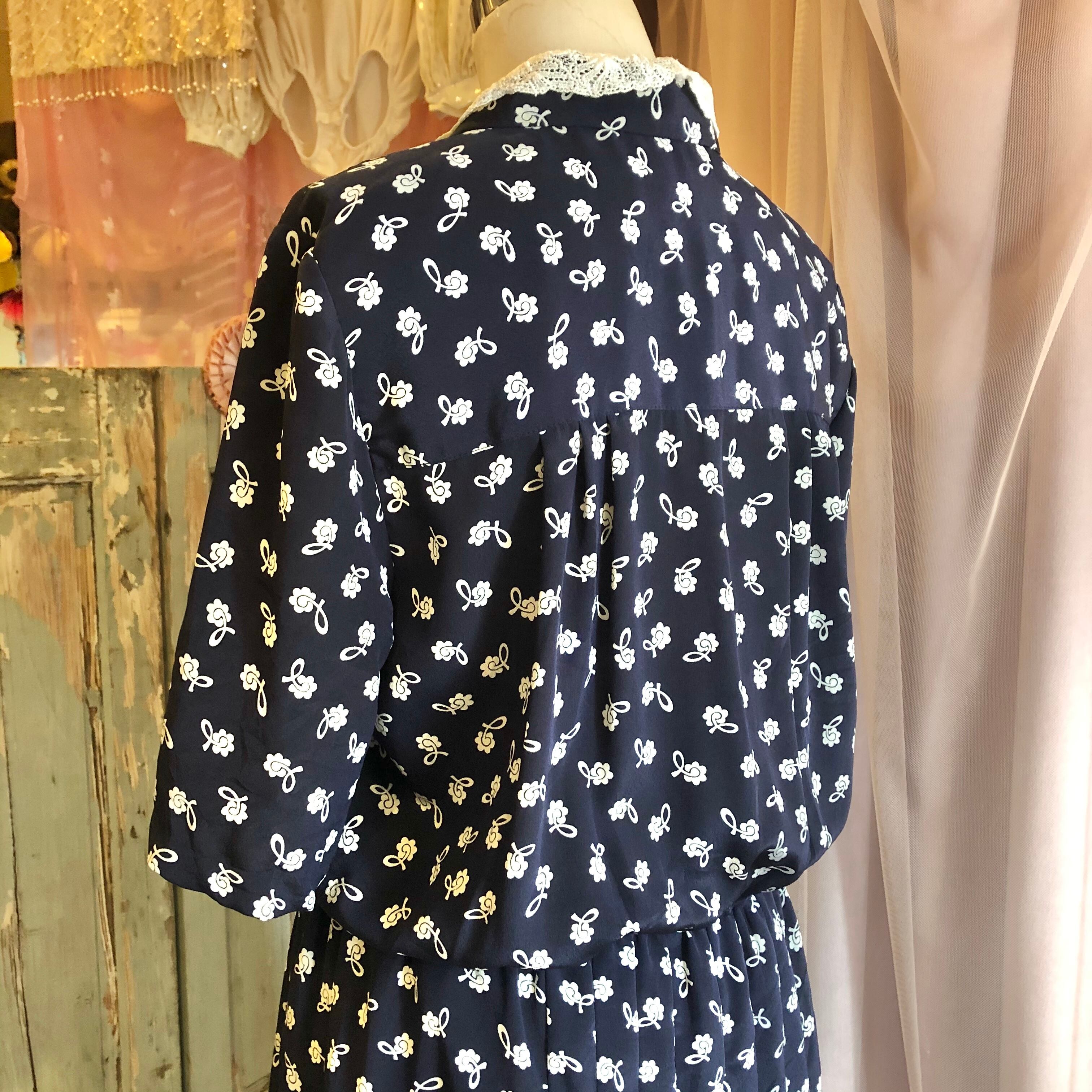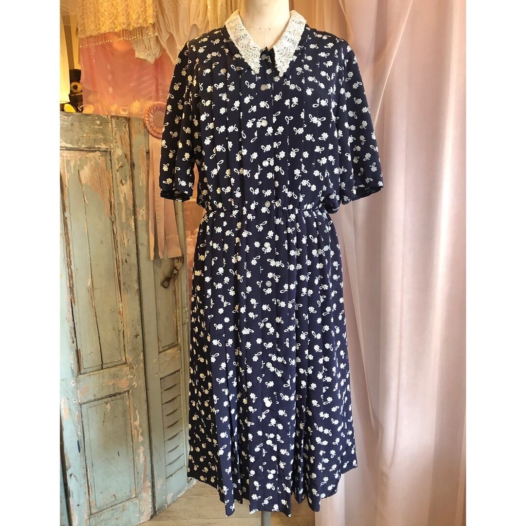 シンプルで一見クラシックですが、よく見ると花まるのような花模様で遊び心があり、かわいらしいです。全体と共布の襟のうえに重なるように、二重で襟がついています。