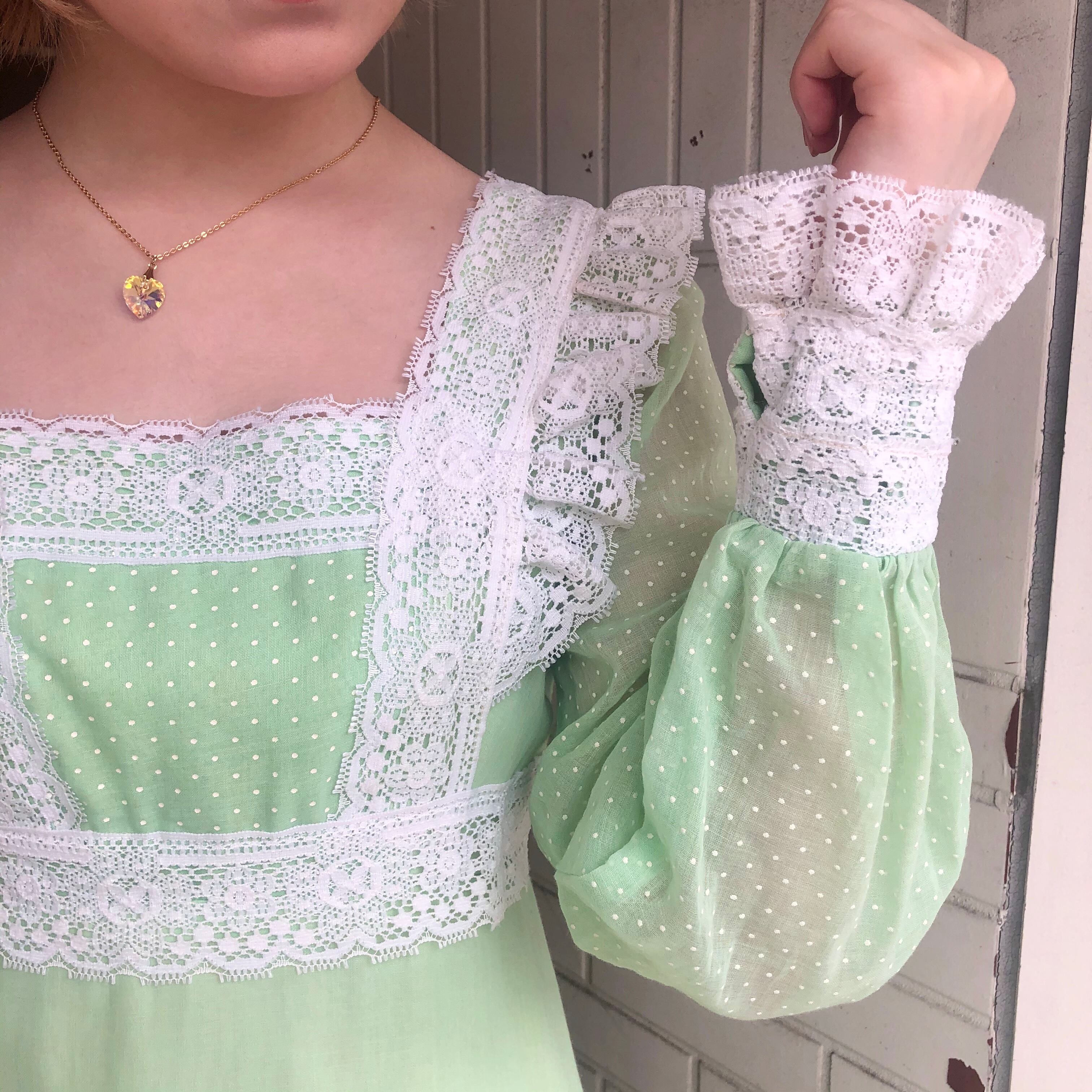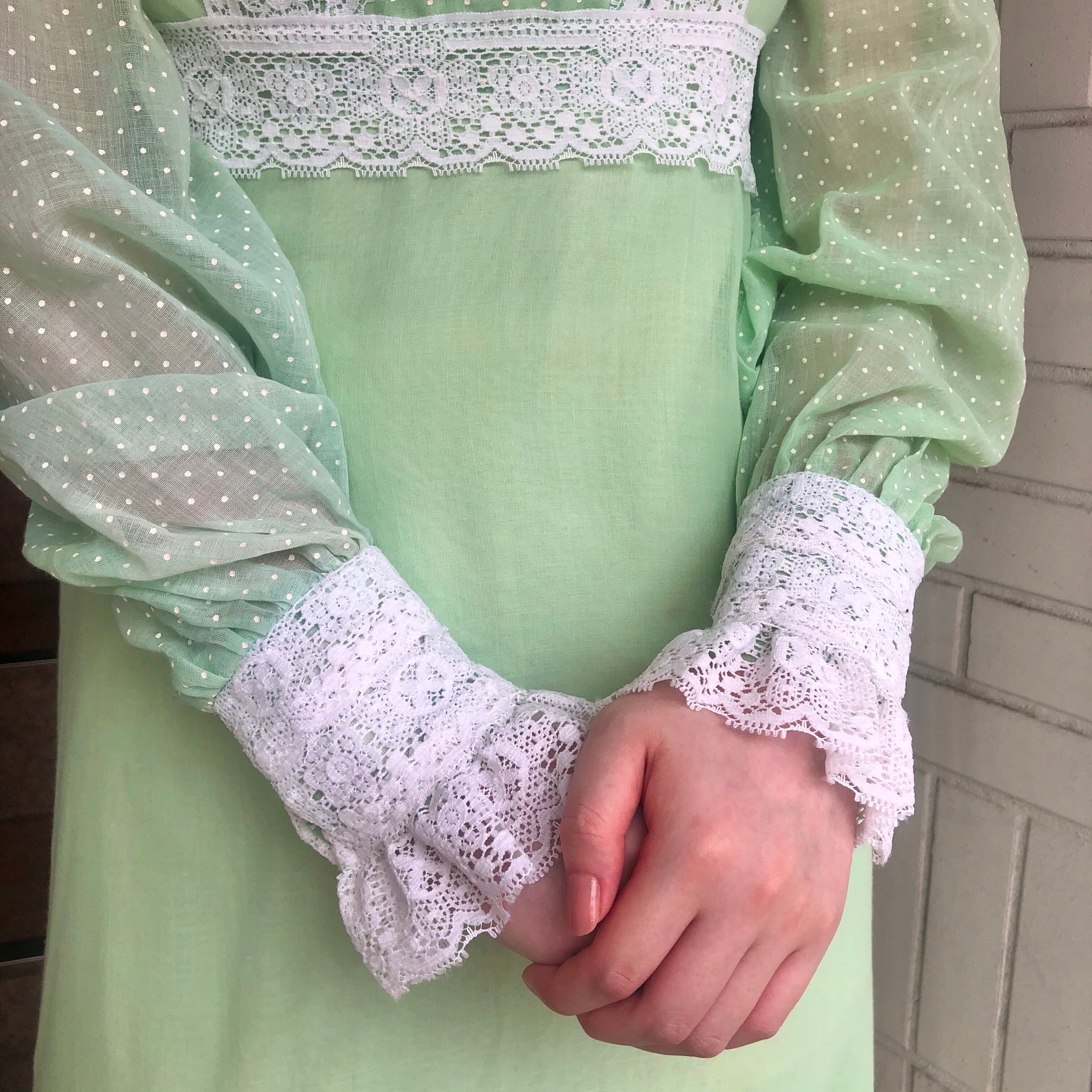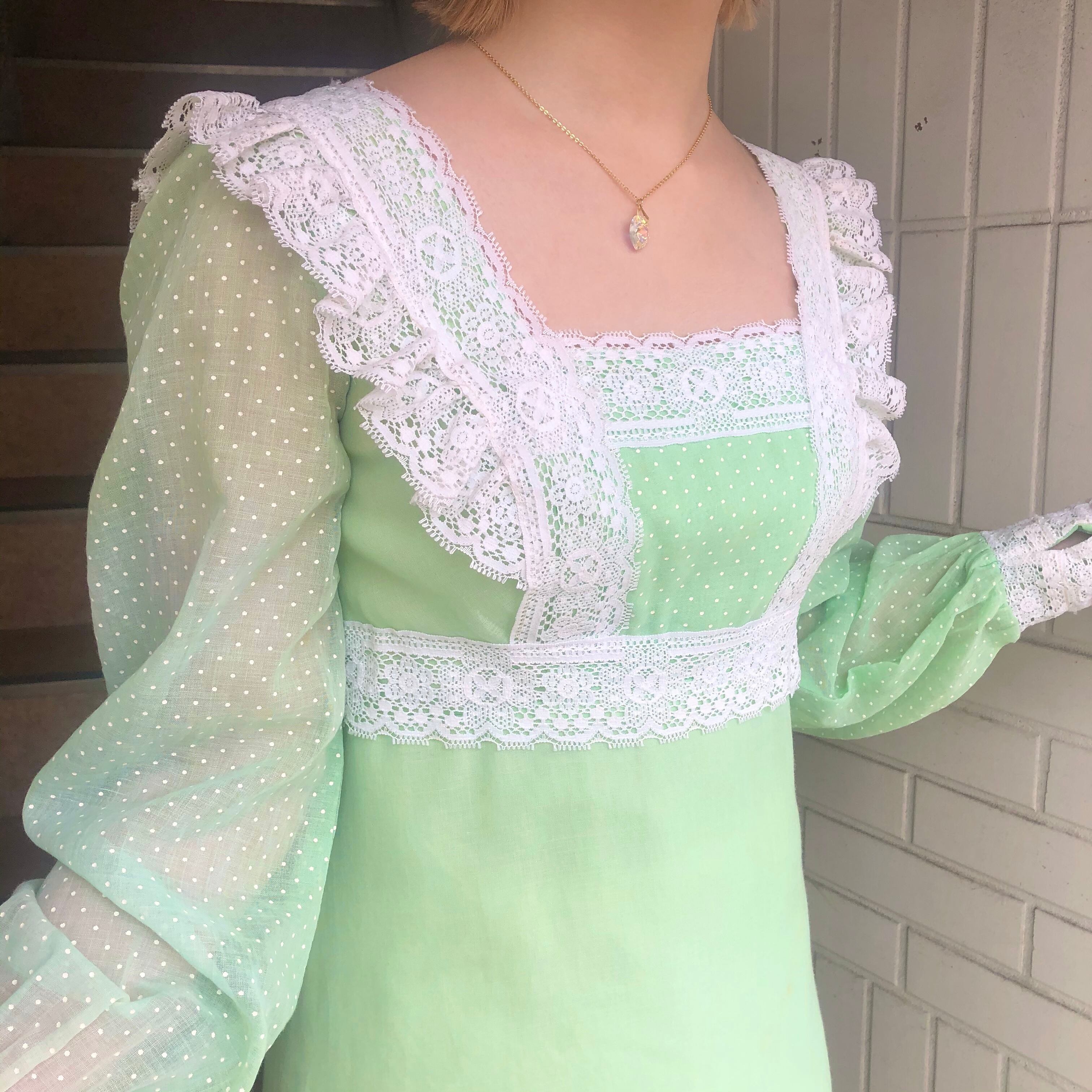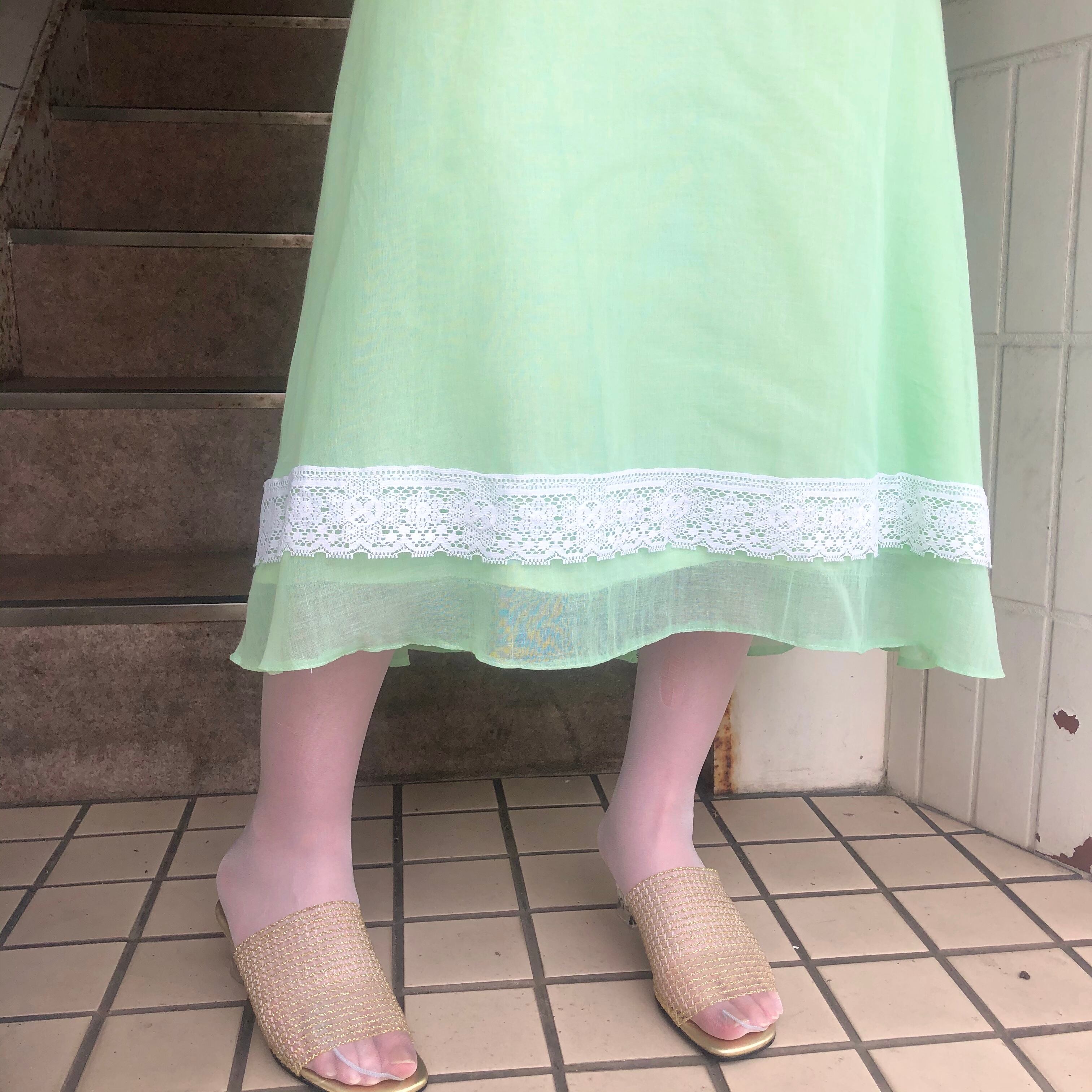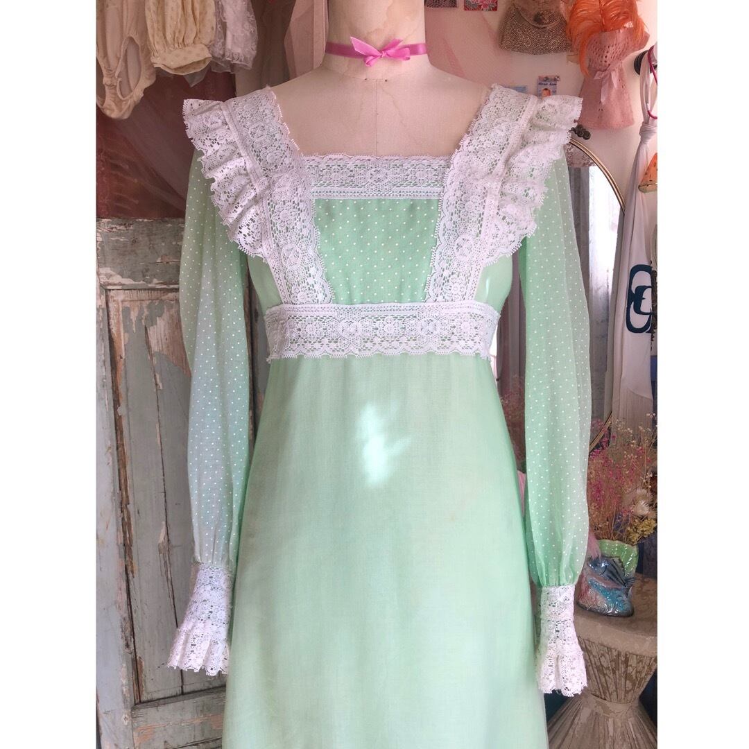 爽やかなメロンソーダのようなドットとレースのロマンチックなドレスです。