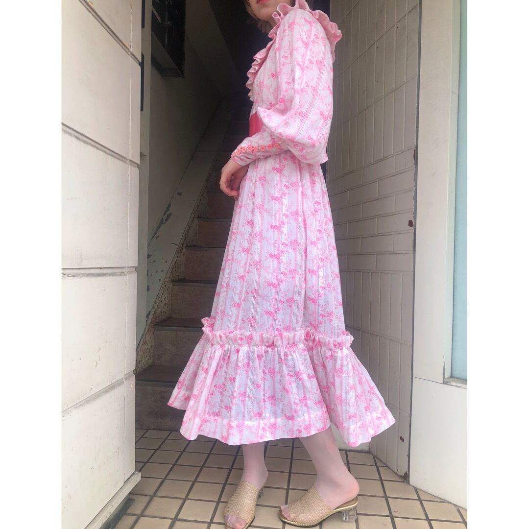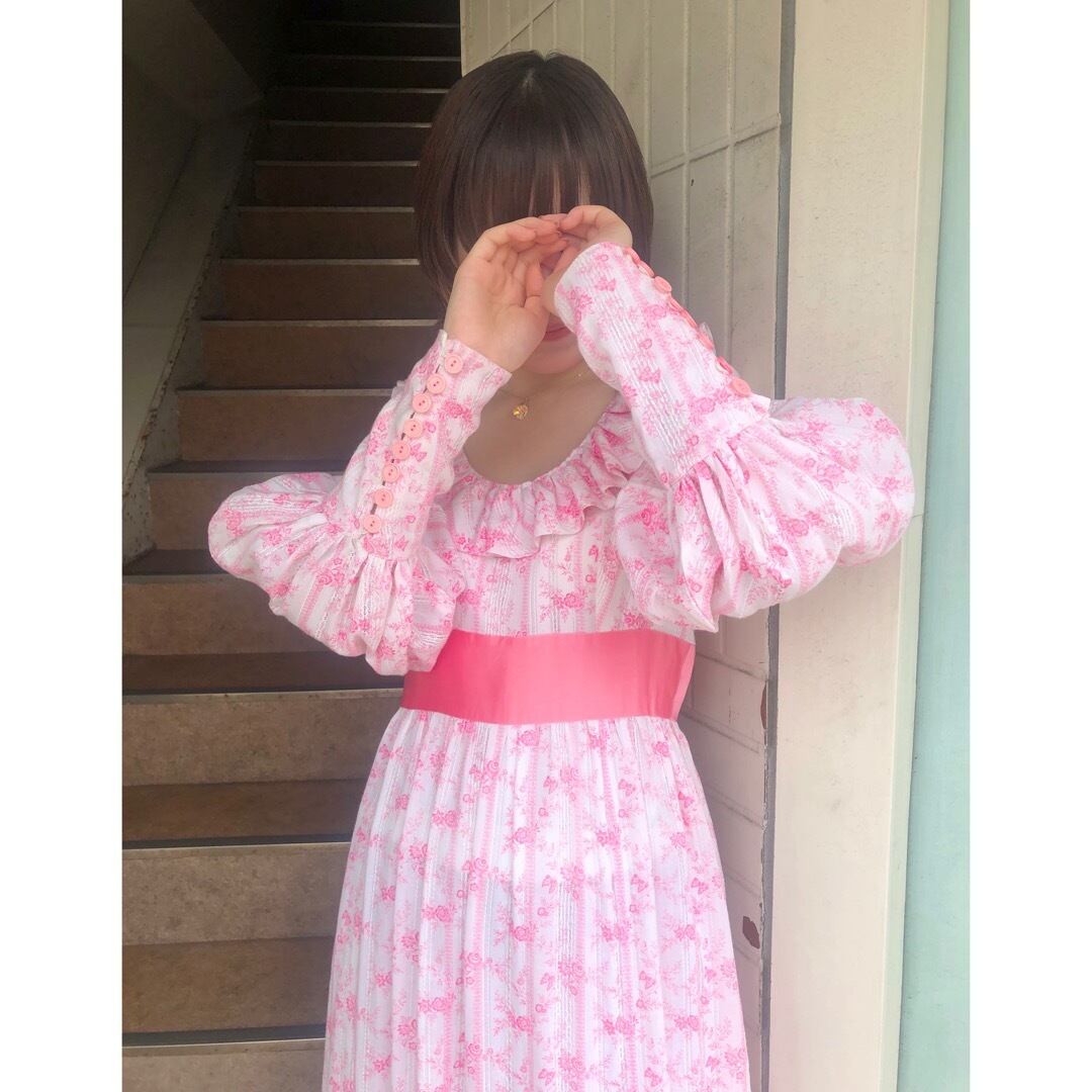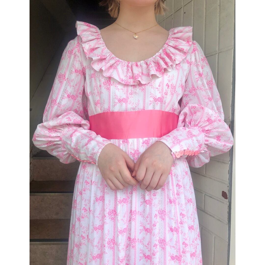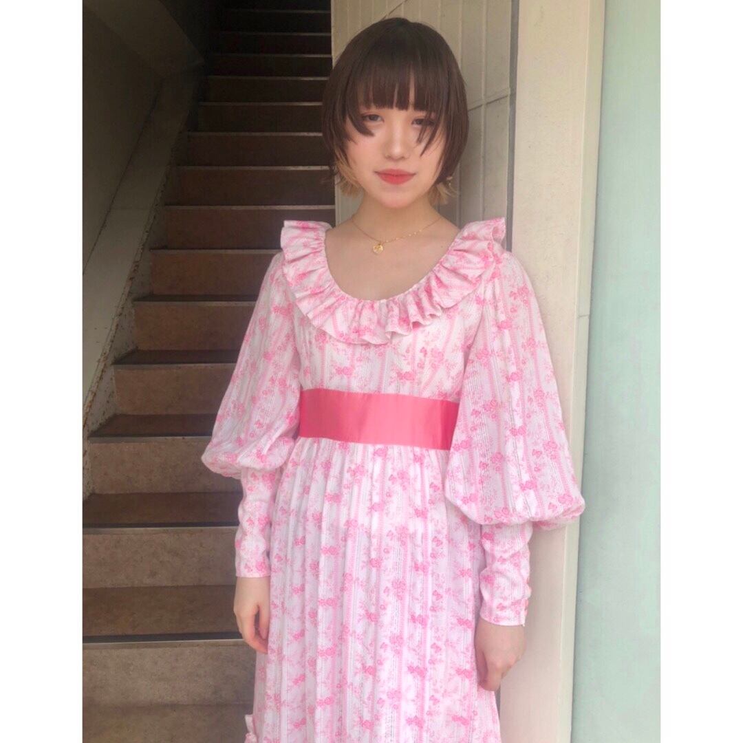 ウエストマークした幅広なサテンリボンとピエロカラーのような襟がポイントのワンピースです。