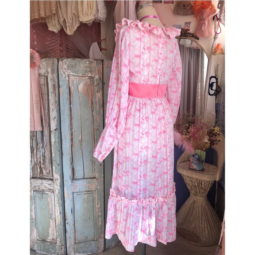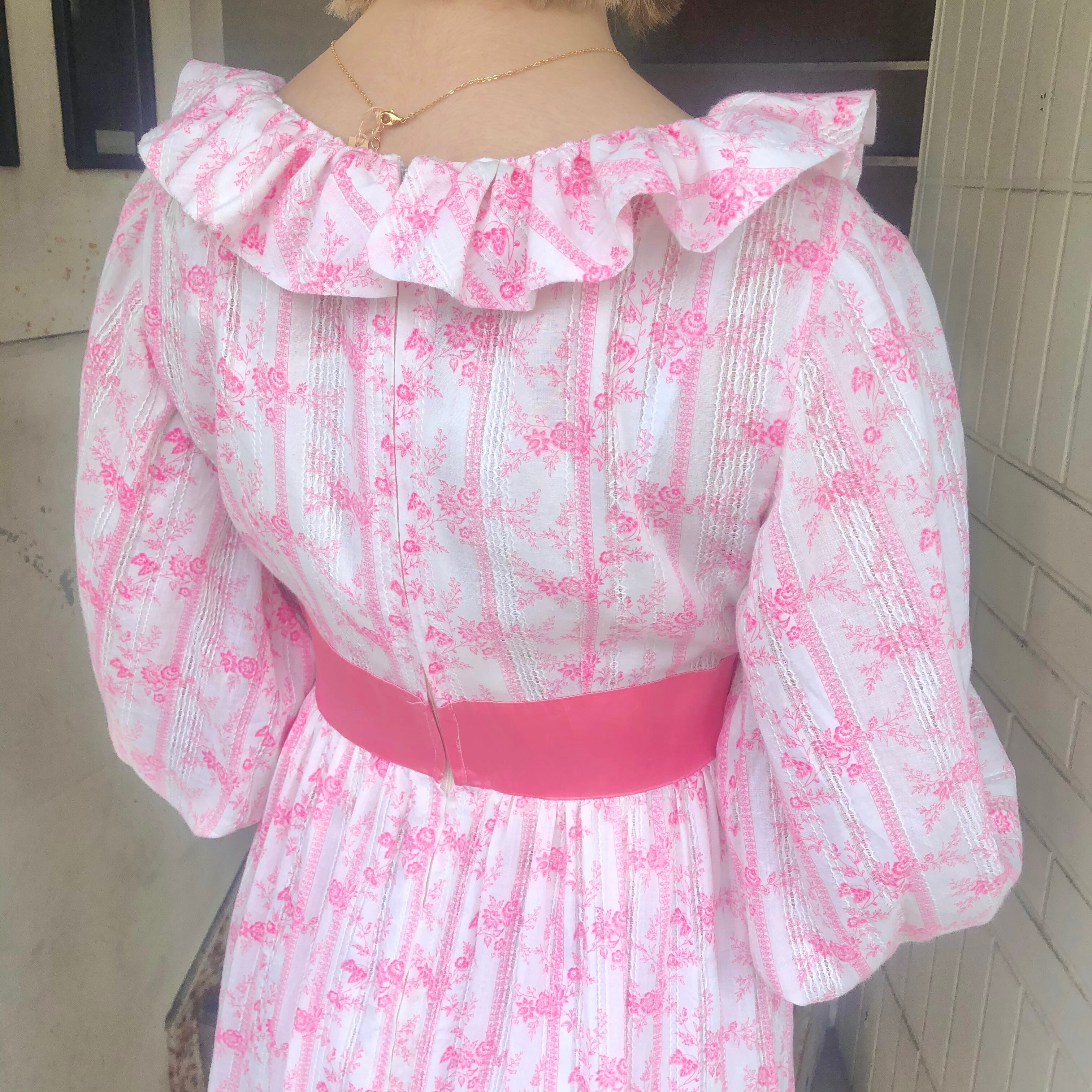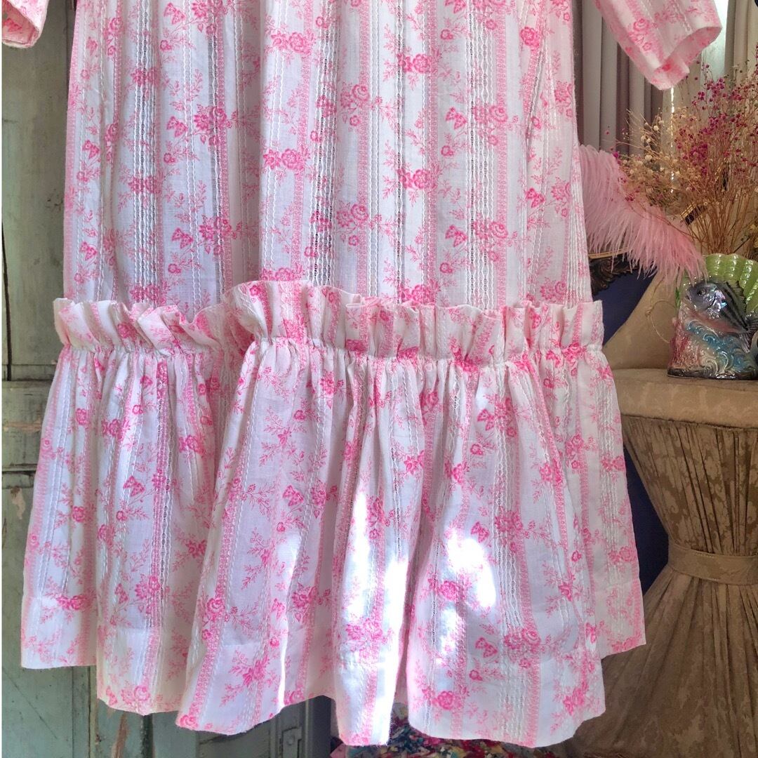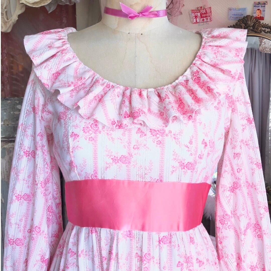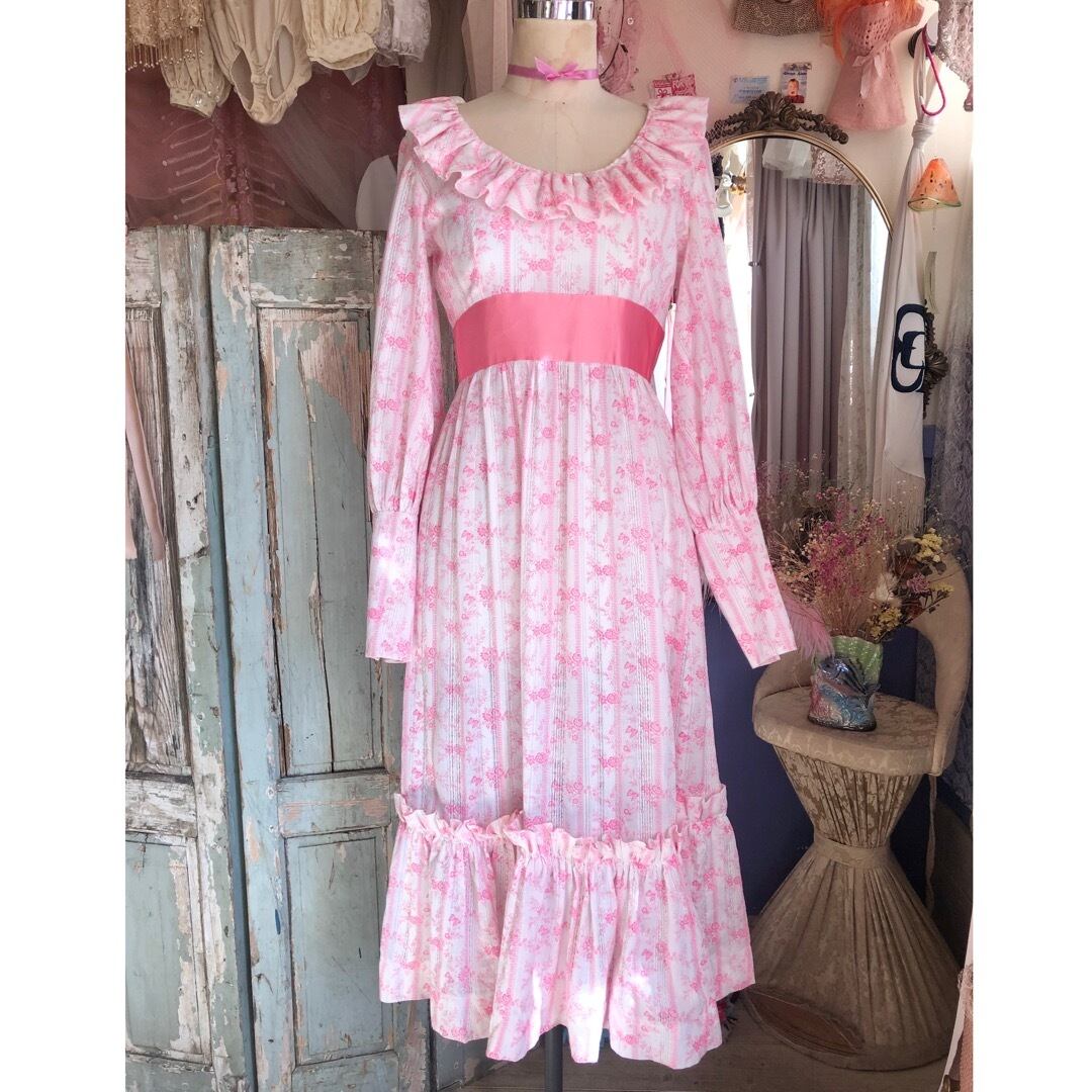 ウエストマークした幅広なサテンリボンとピエロカラーのような襟がポイントのワンピースです。